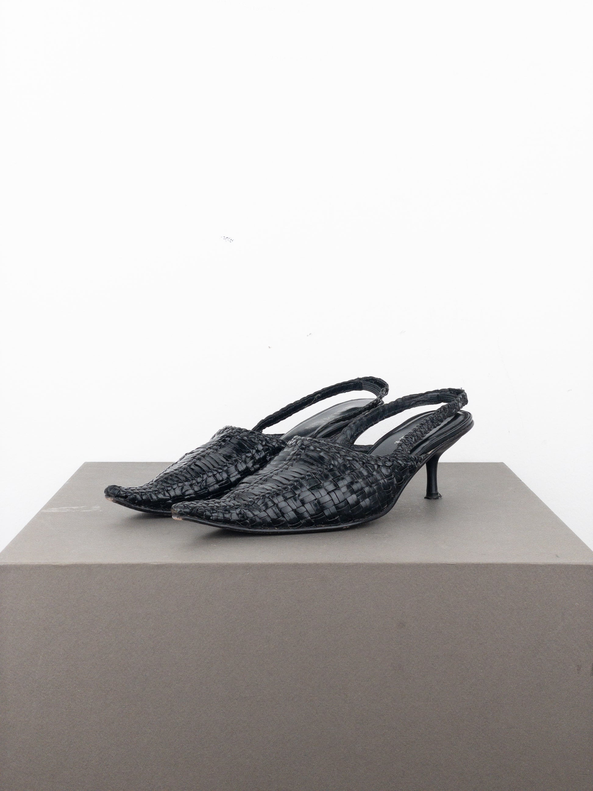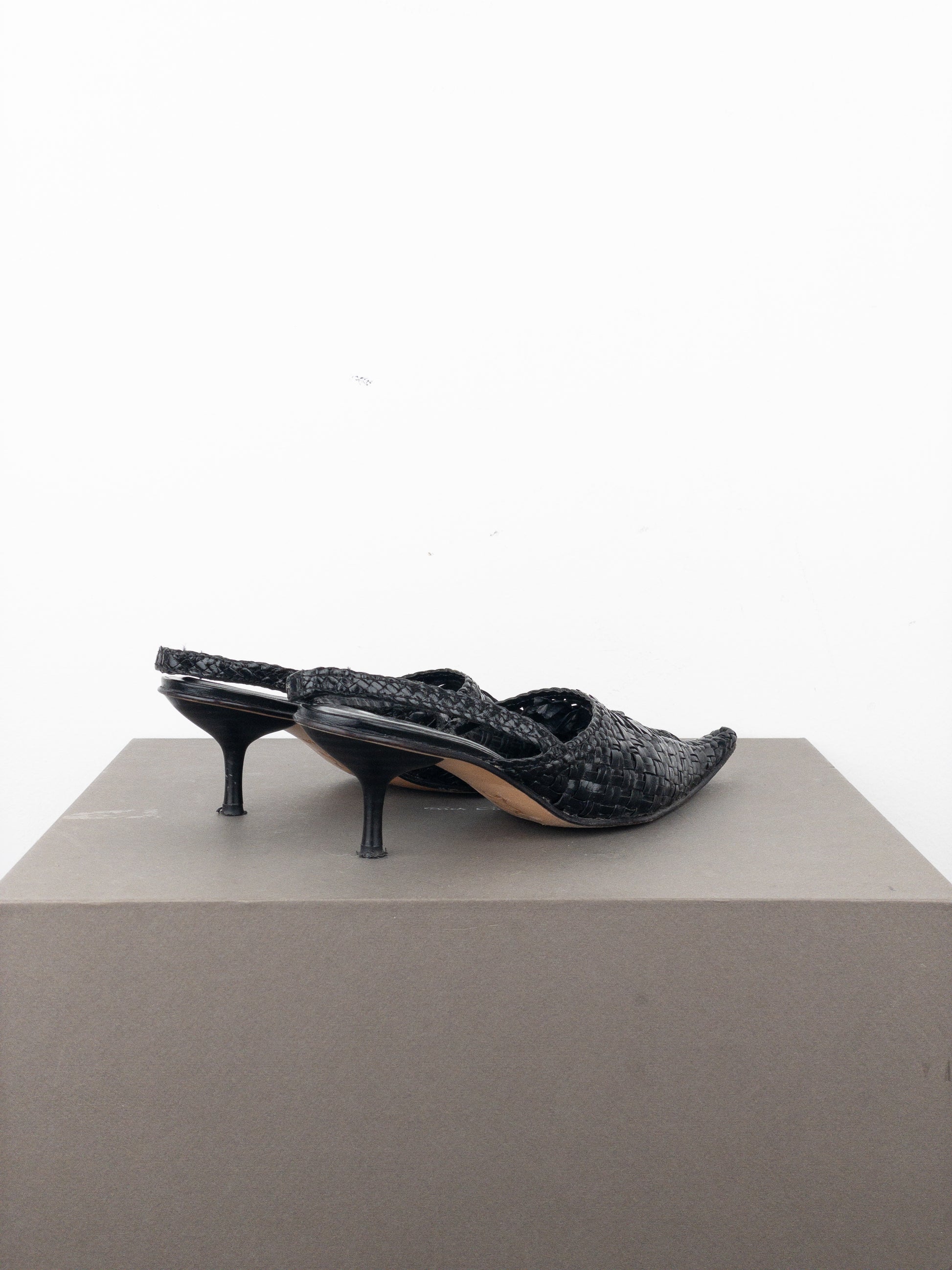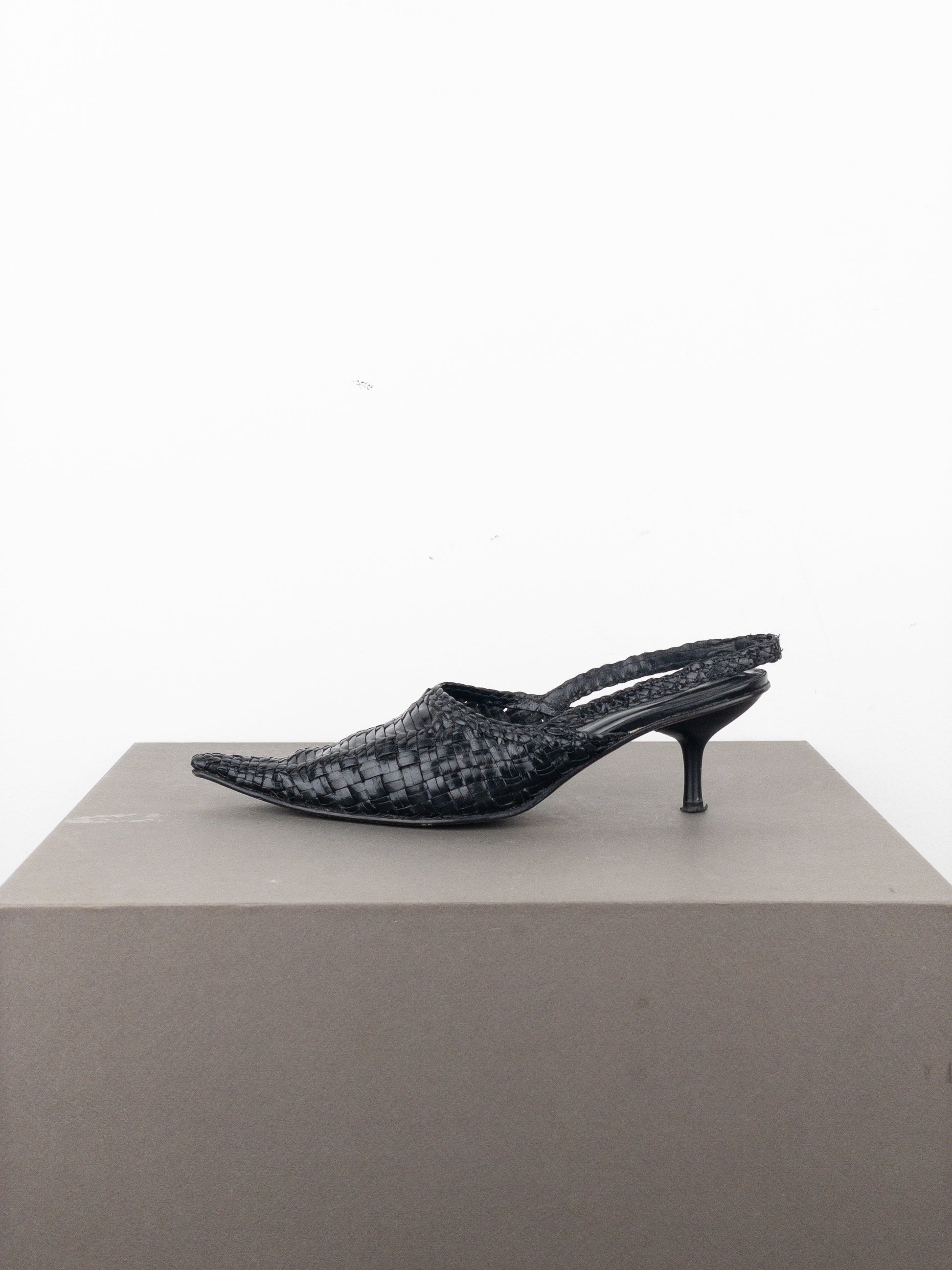 Slingback kitten heels with a pointed toe in woven black leather, from the 2010s.