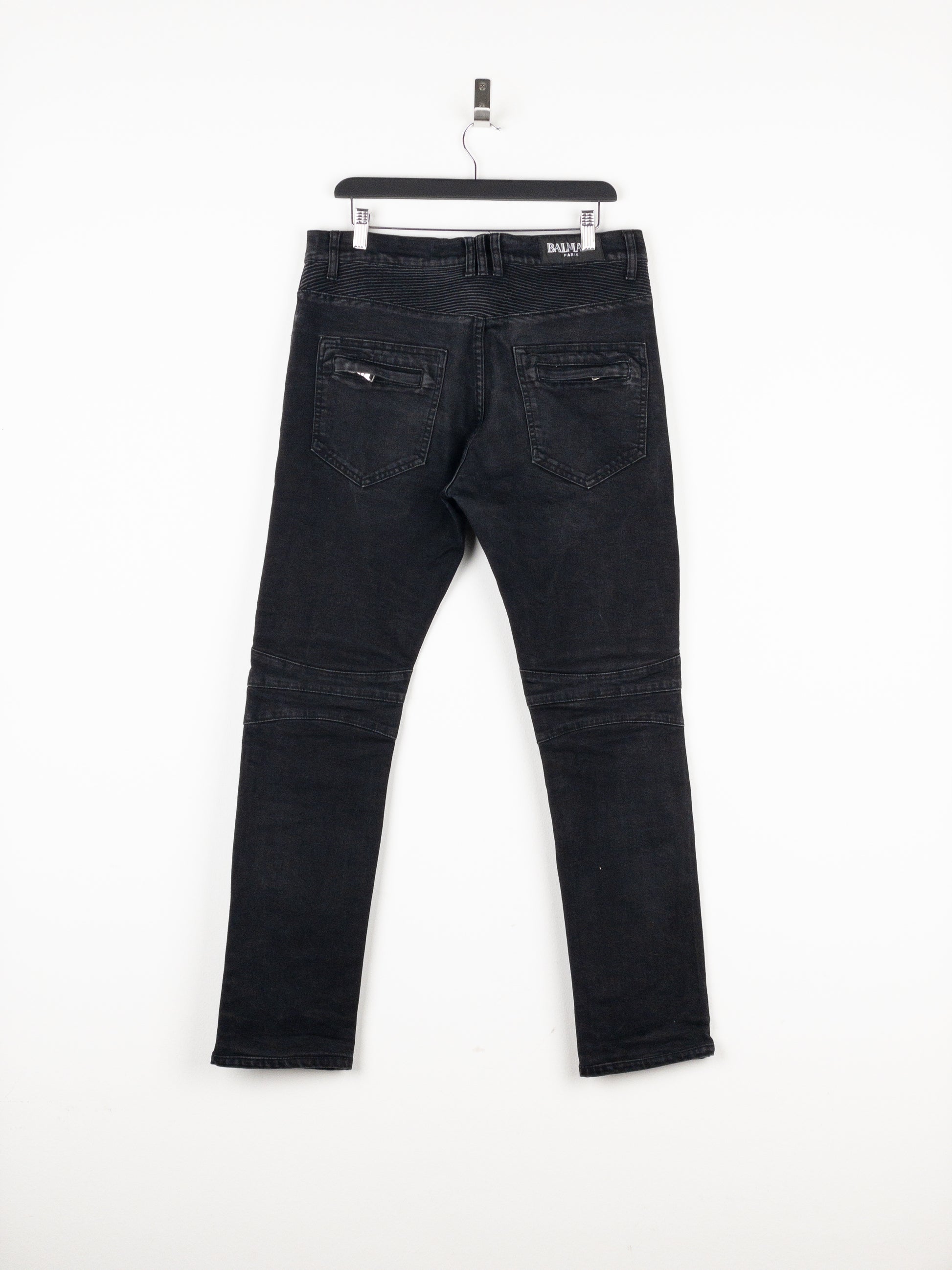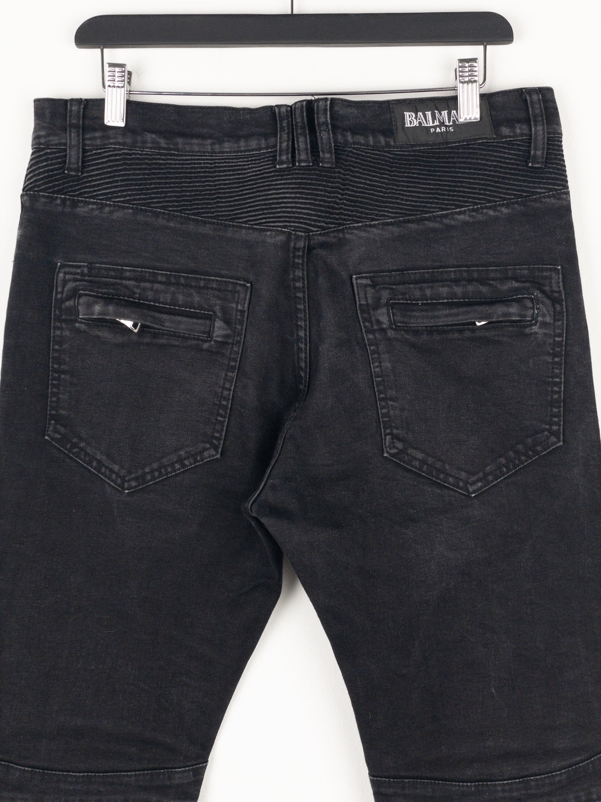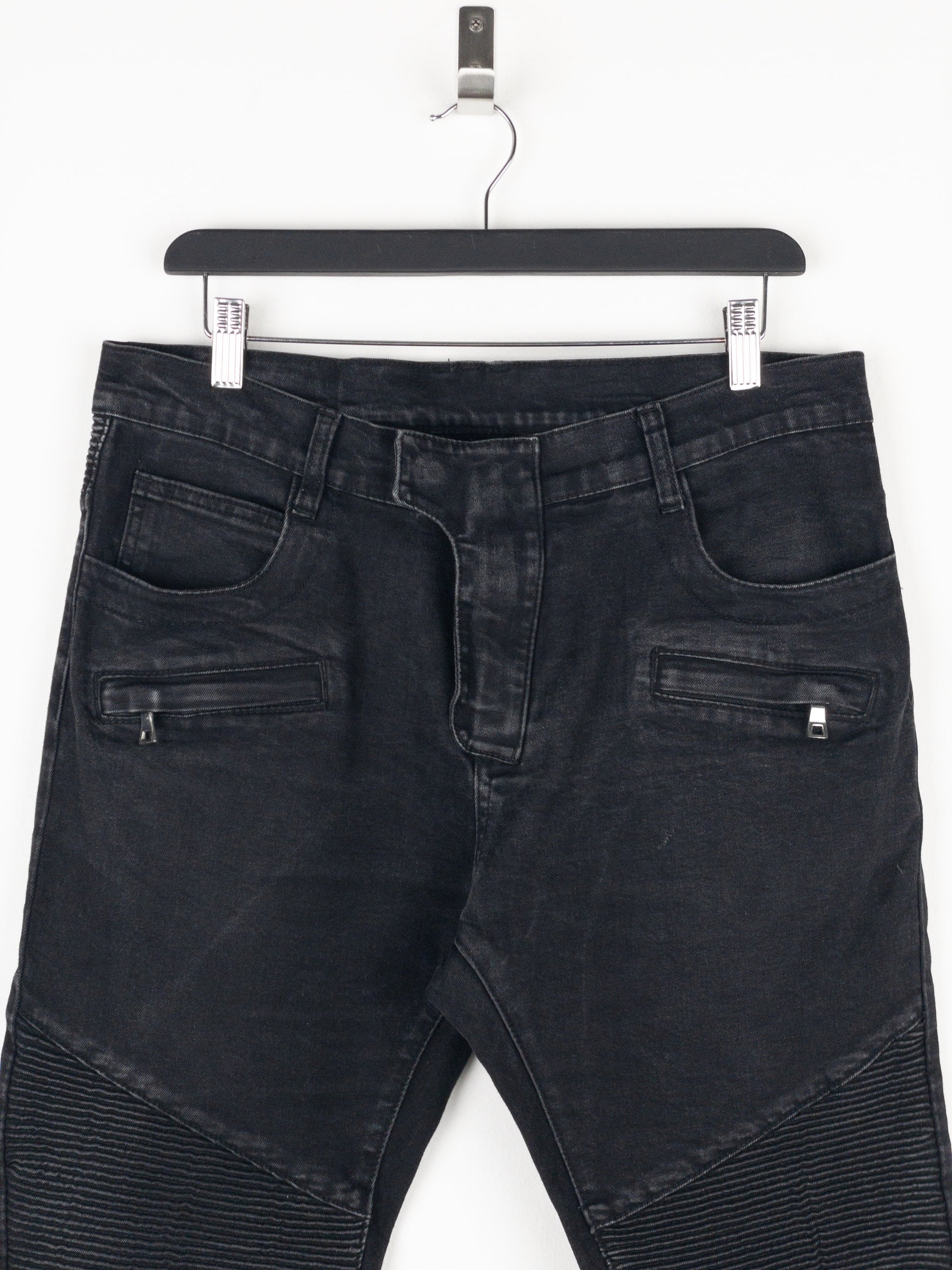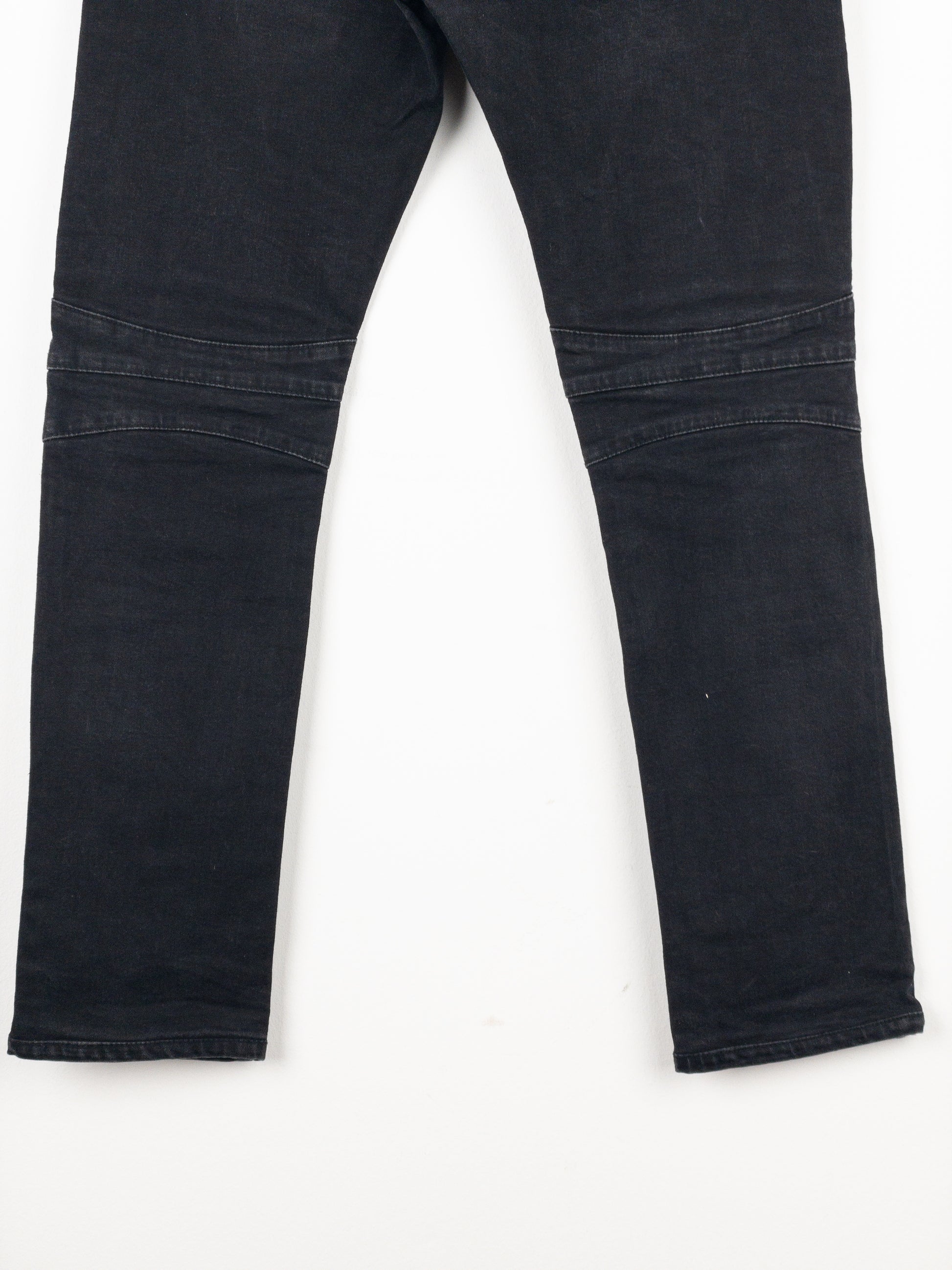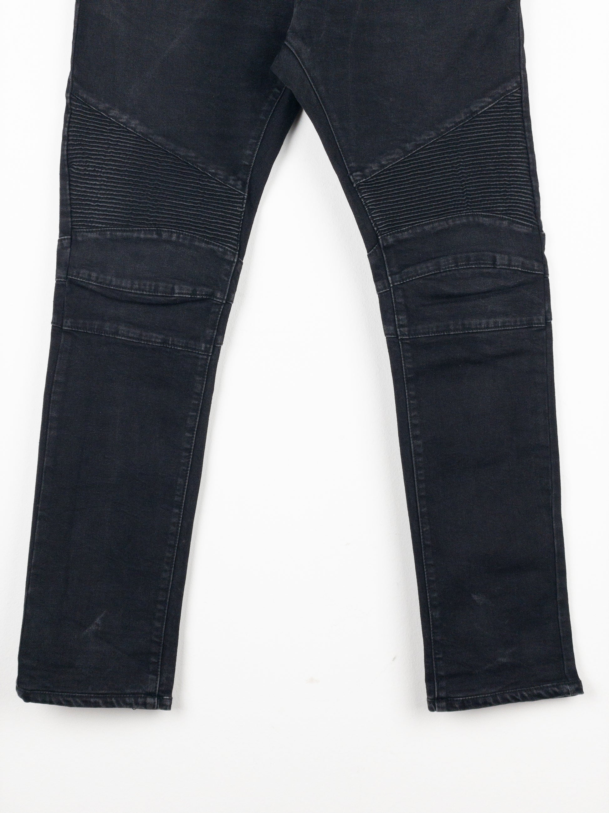 Black denim jeans with ribbed biker details on the knees and in the back of the waist, featuring the signature hidden front pockets and zip fly.