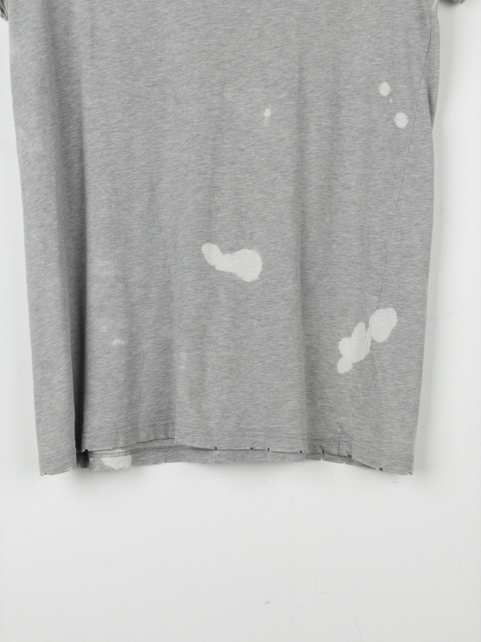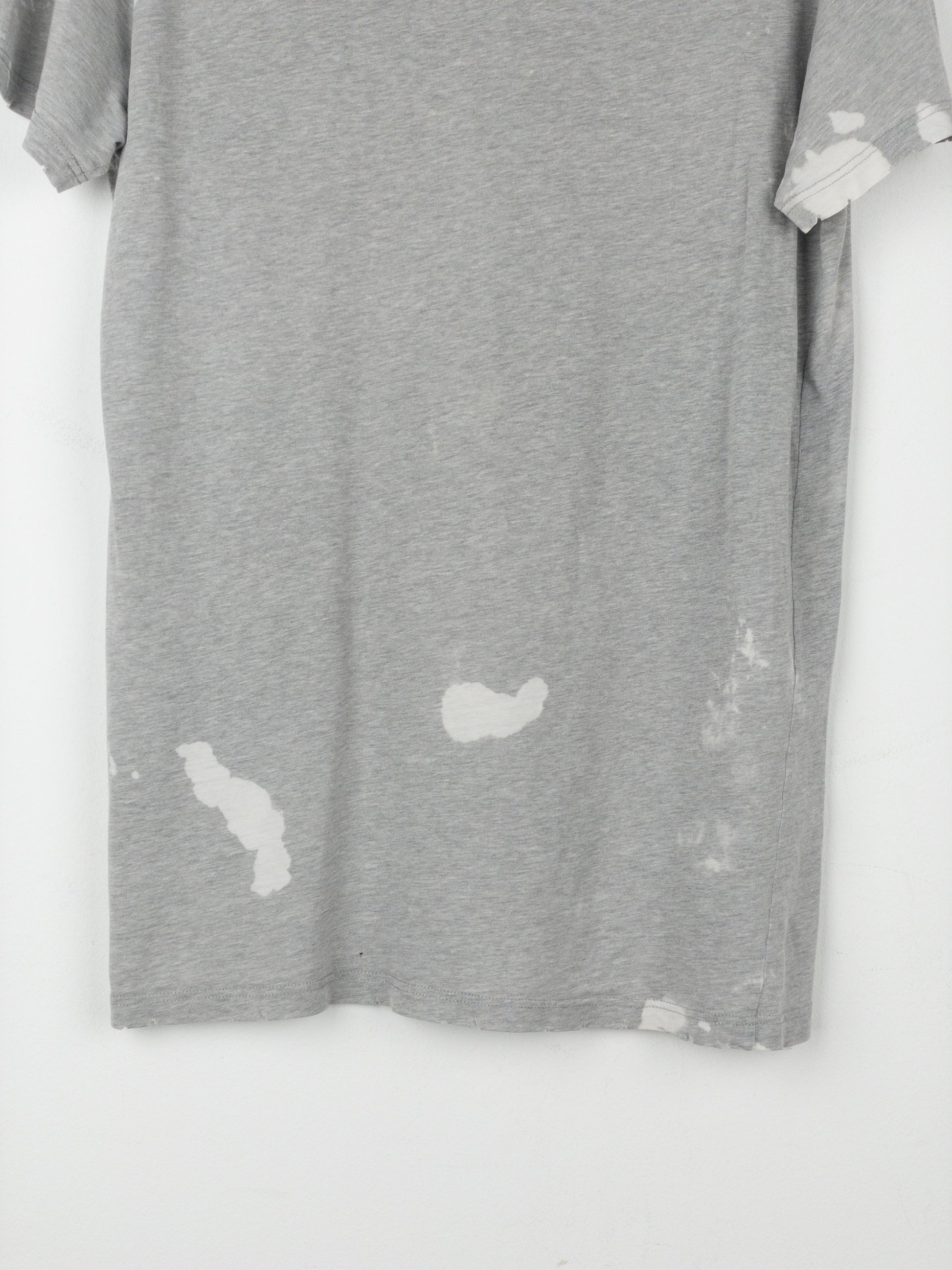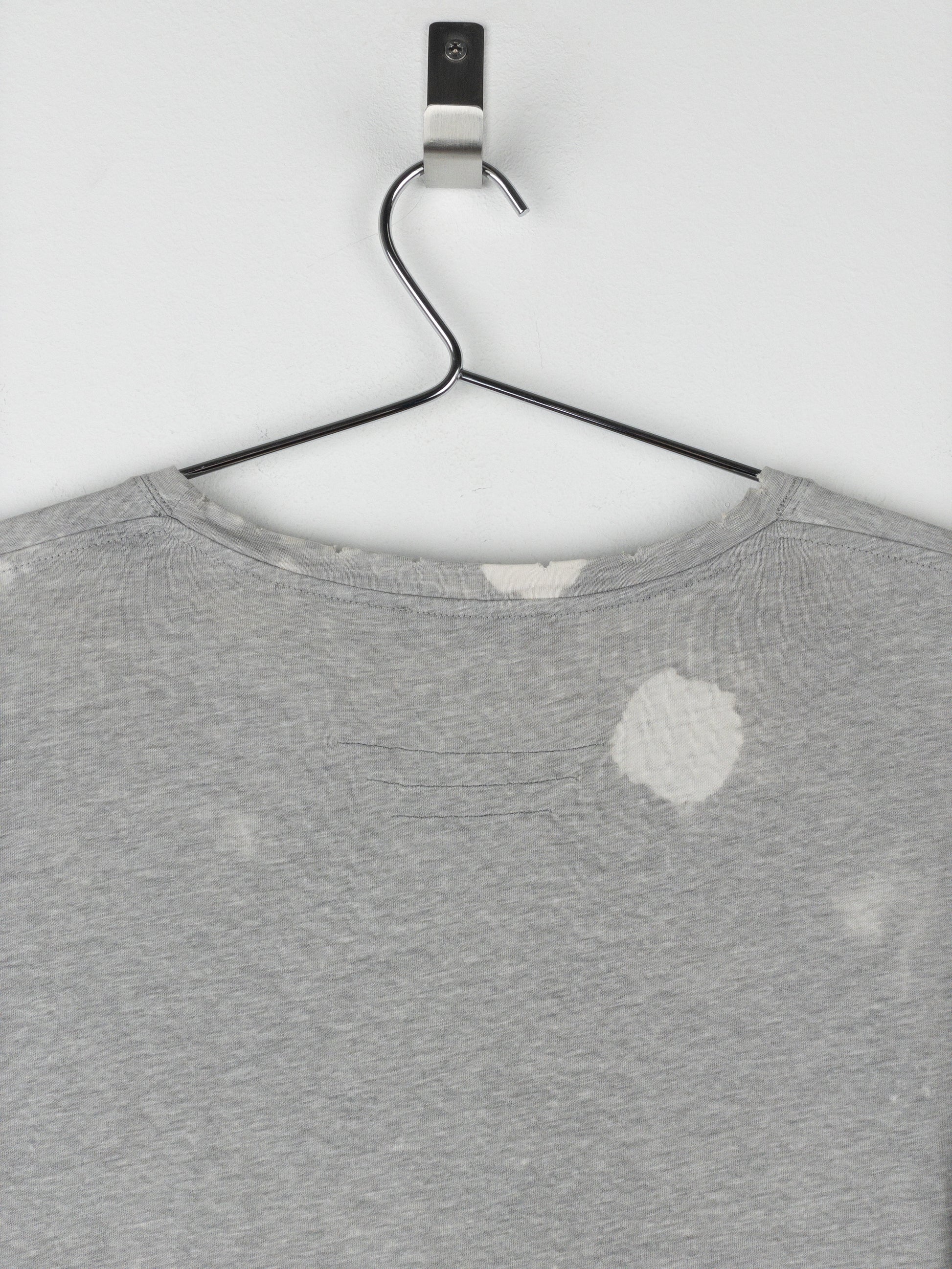 Light grey t-shirt with distress marks at the neckband, sleeves, and hem, featuring white bleach stains throughout.