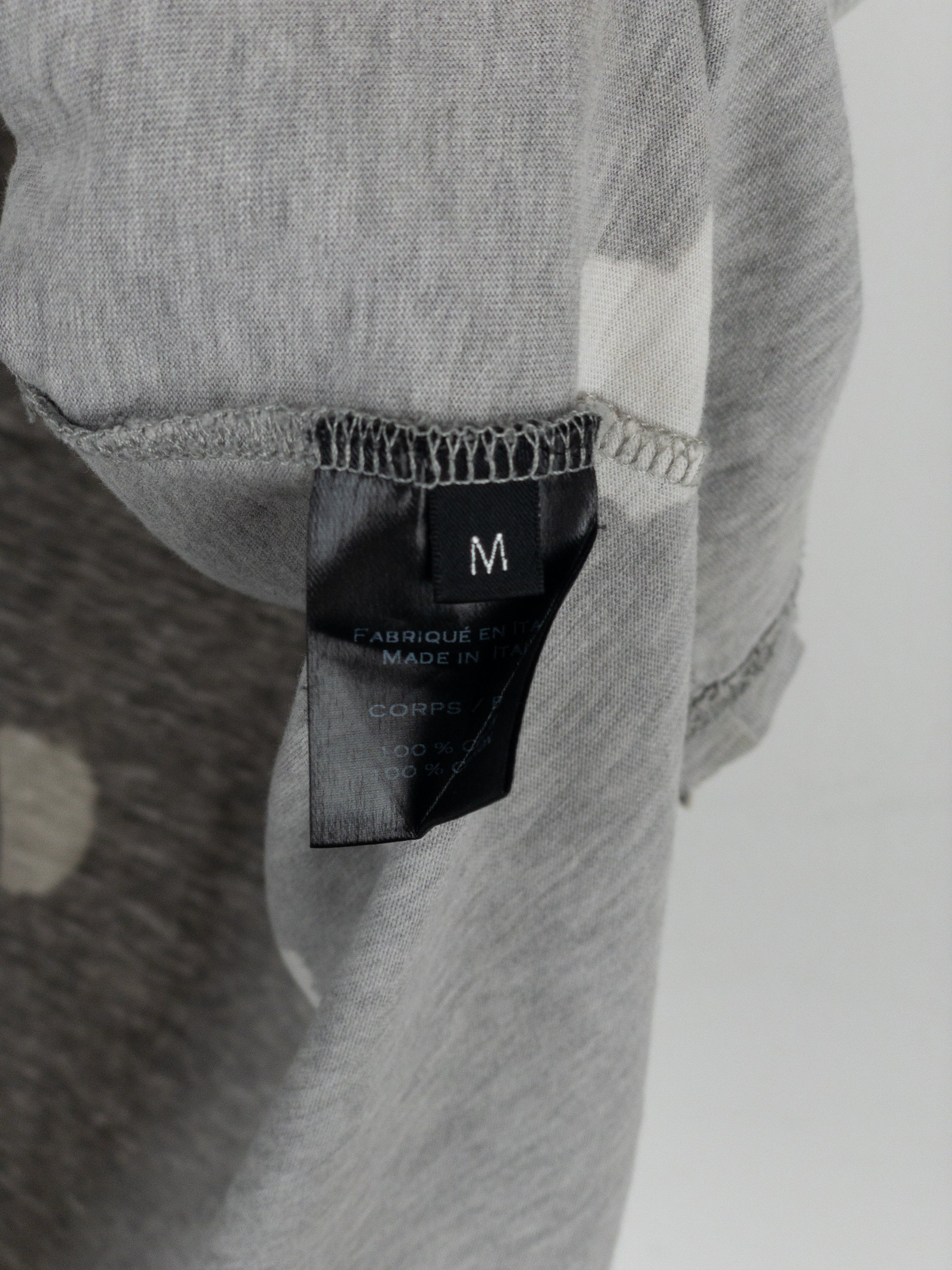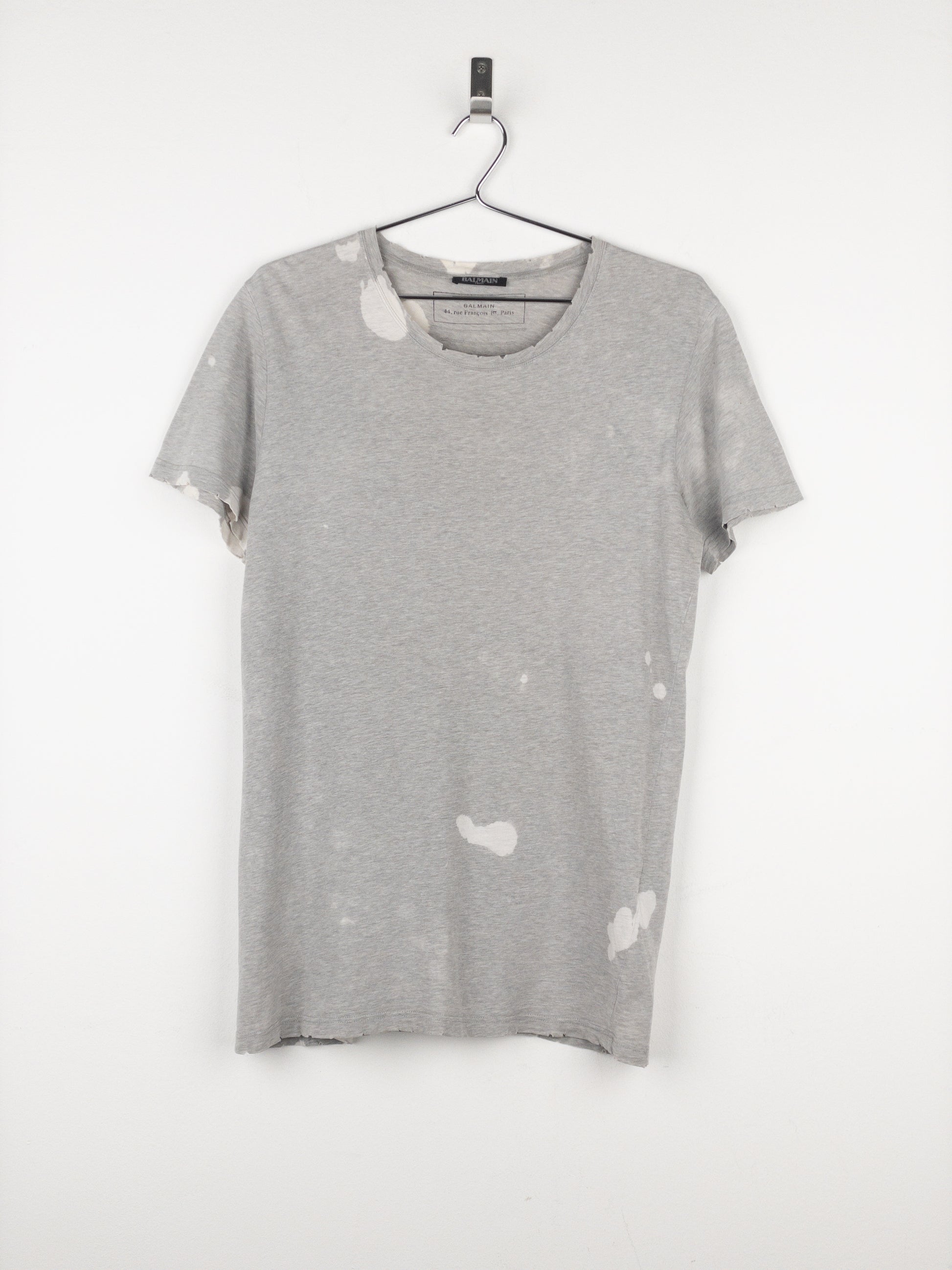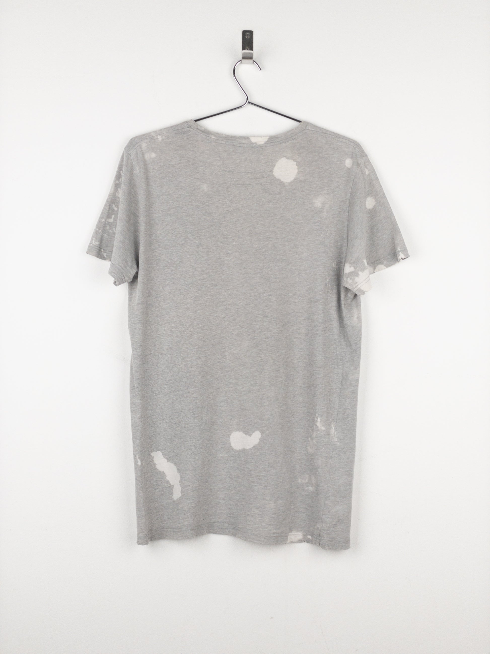 Light grey t-shirt with distress marks at the neckband, sleeves, and hem, featuring white bleach stains throughout.