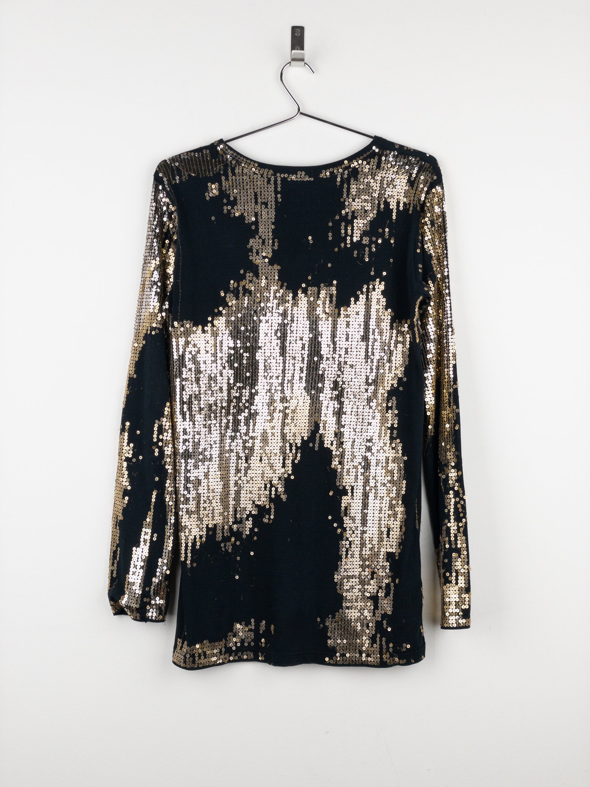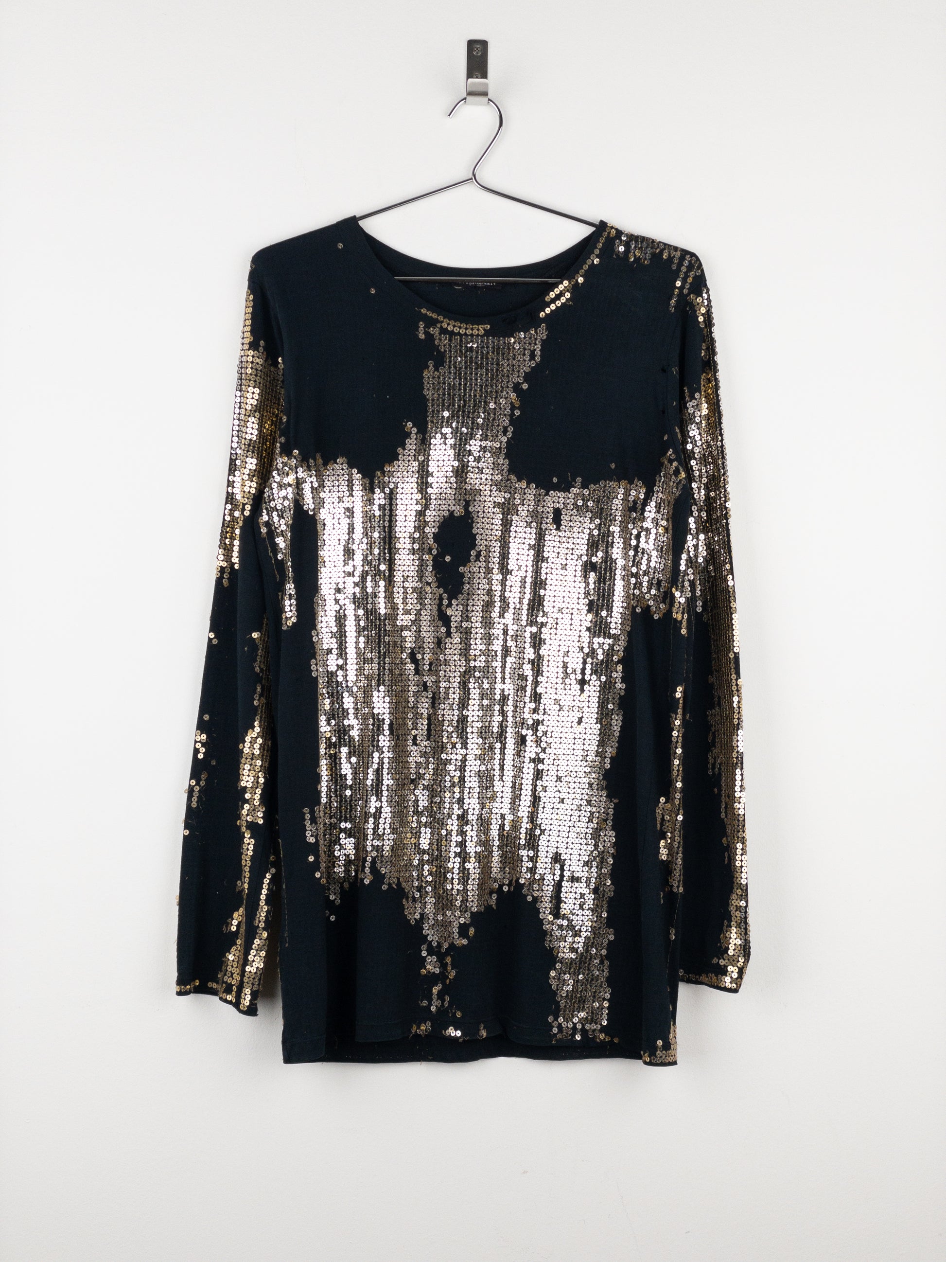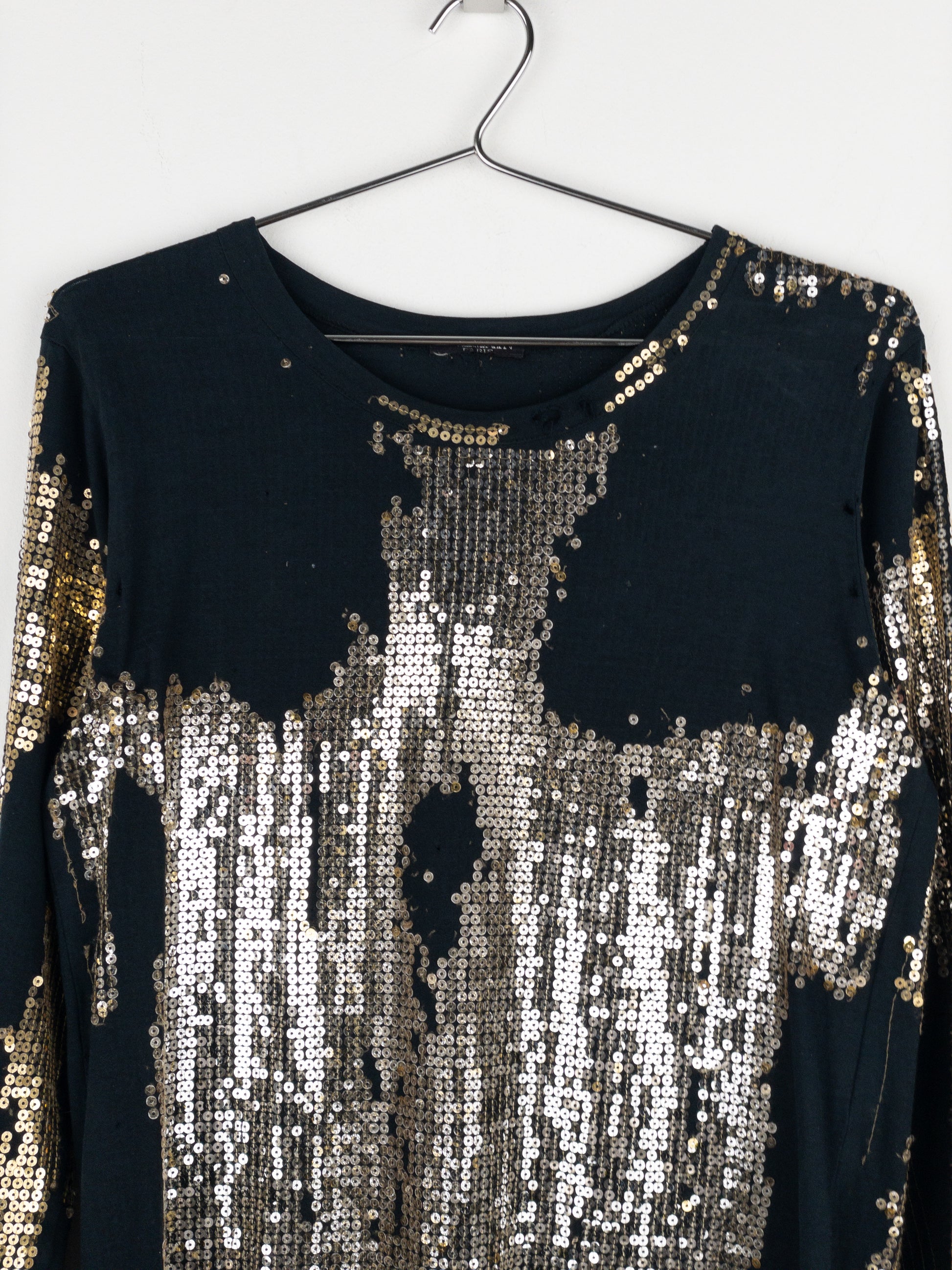 Black longsleeve shirt with gold sequins added unevenly thorughout to create a distressd and worn look, from the autumn-winter 2010 collection.