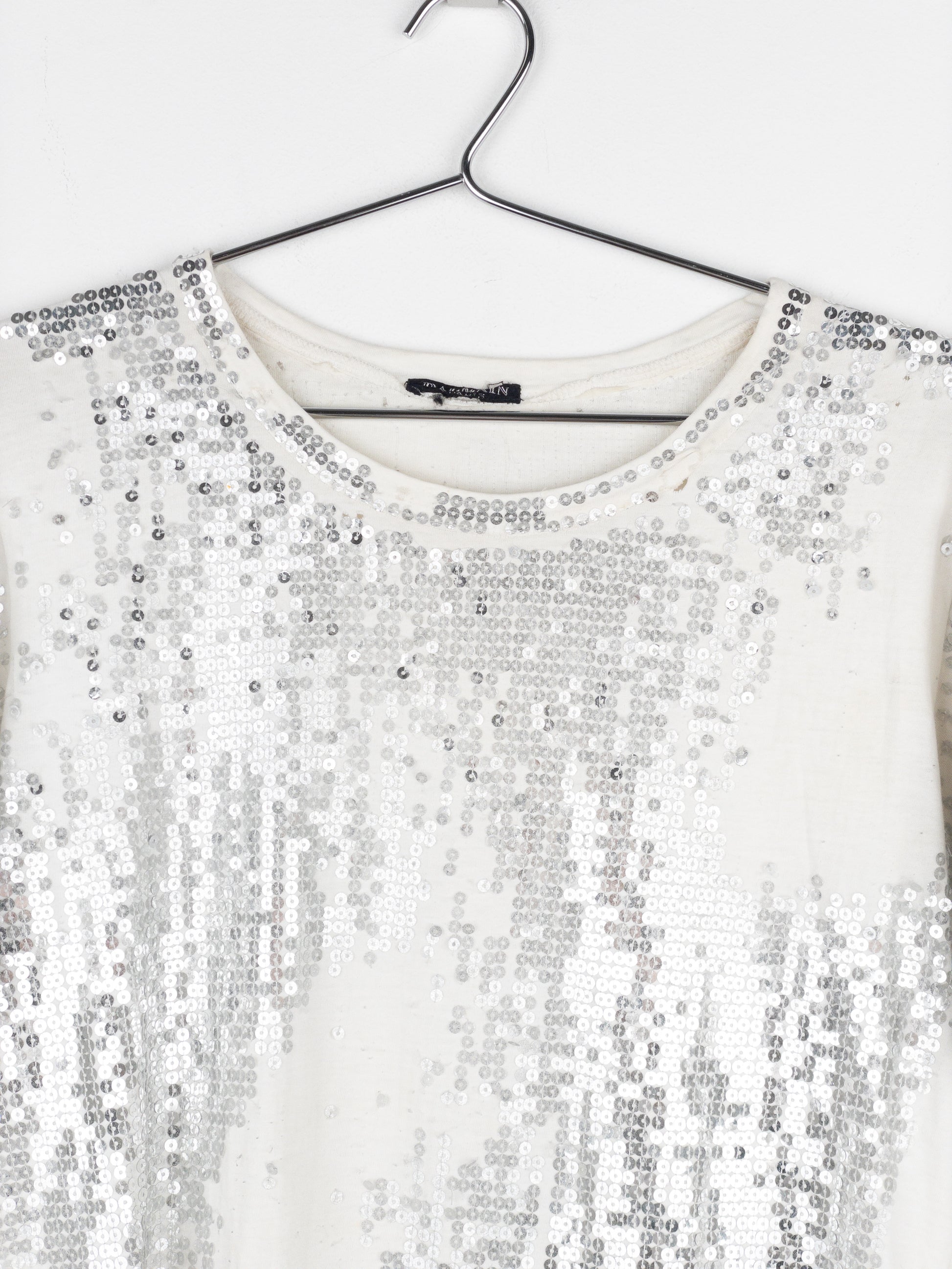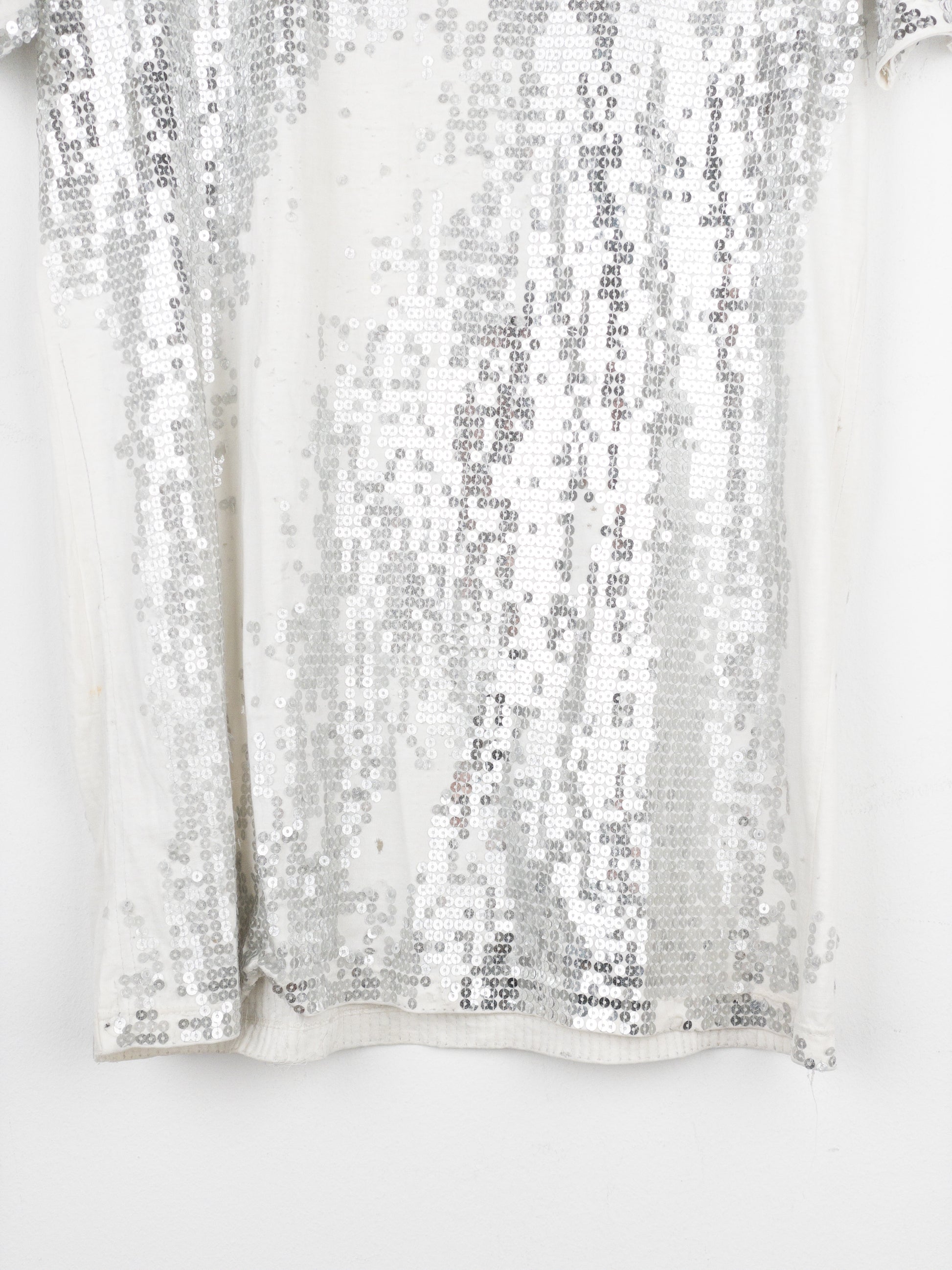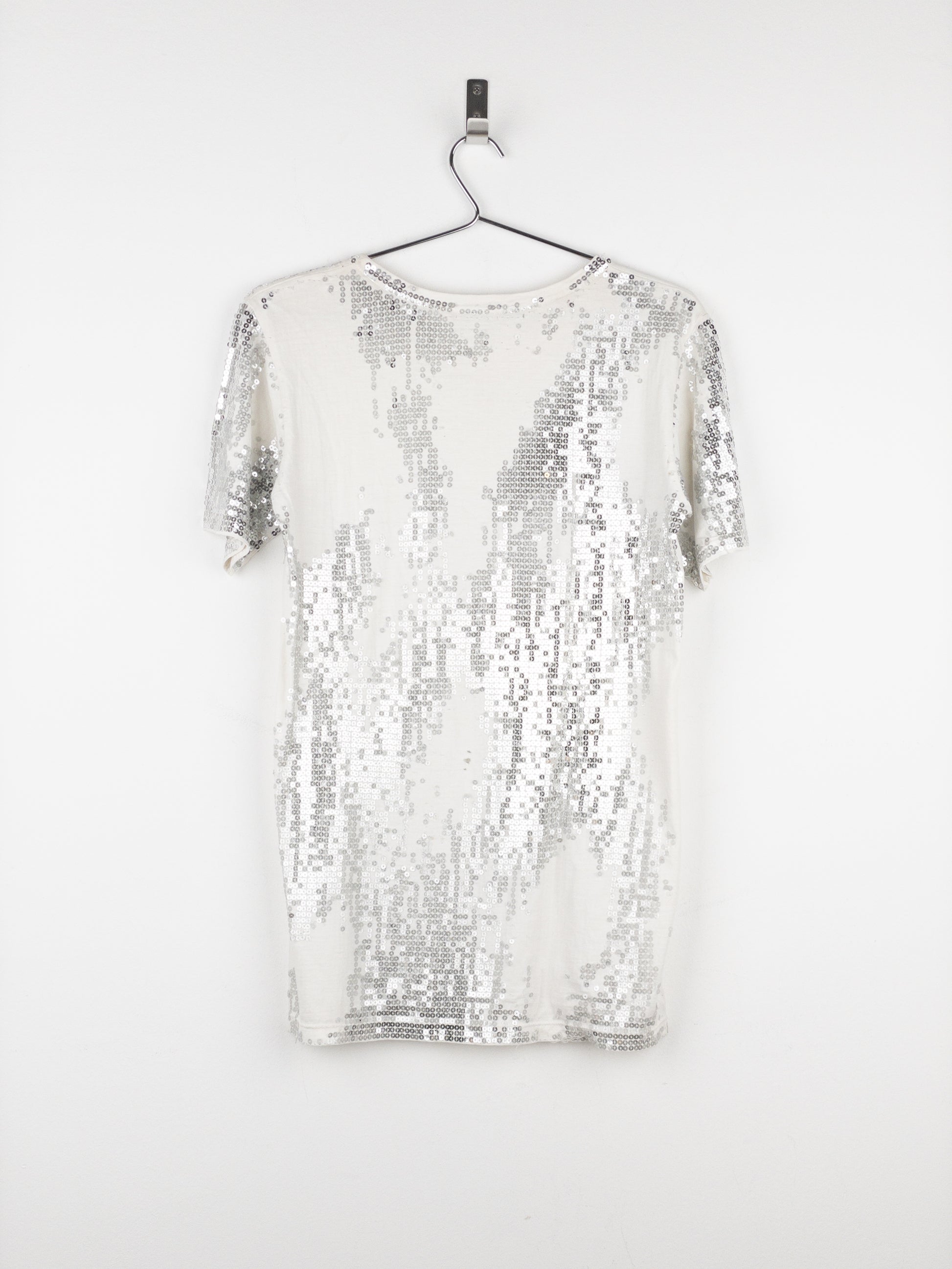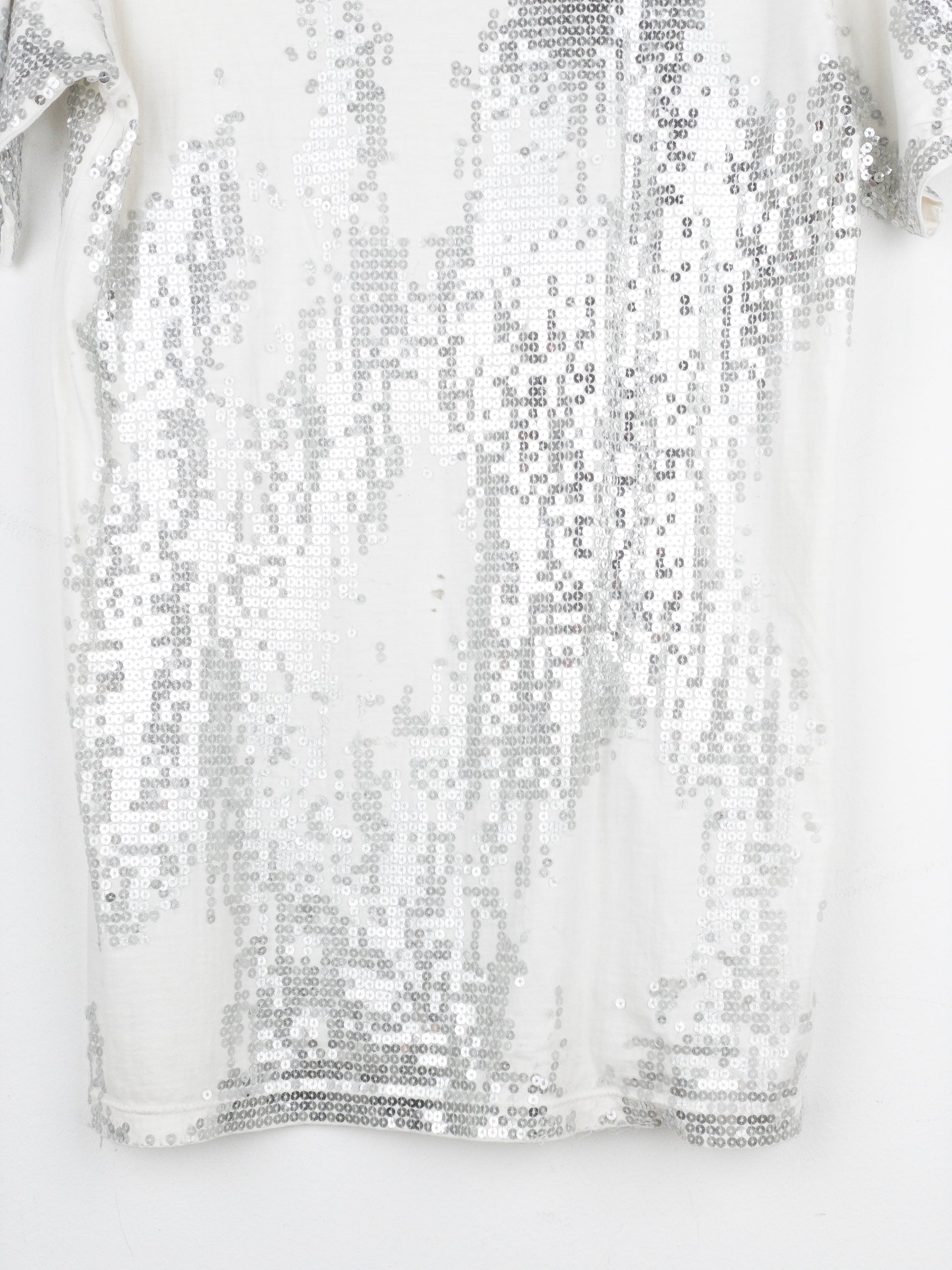 White t-shirt with silver sequins added unevenly thorughout to create a distressd and worn look, from the autumn-winter 2010 collection.