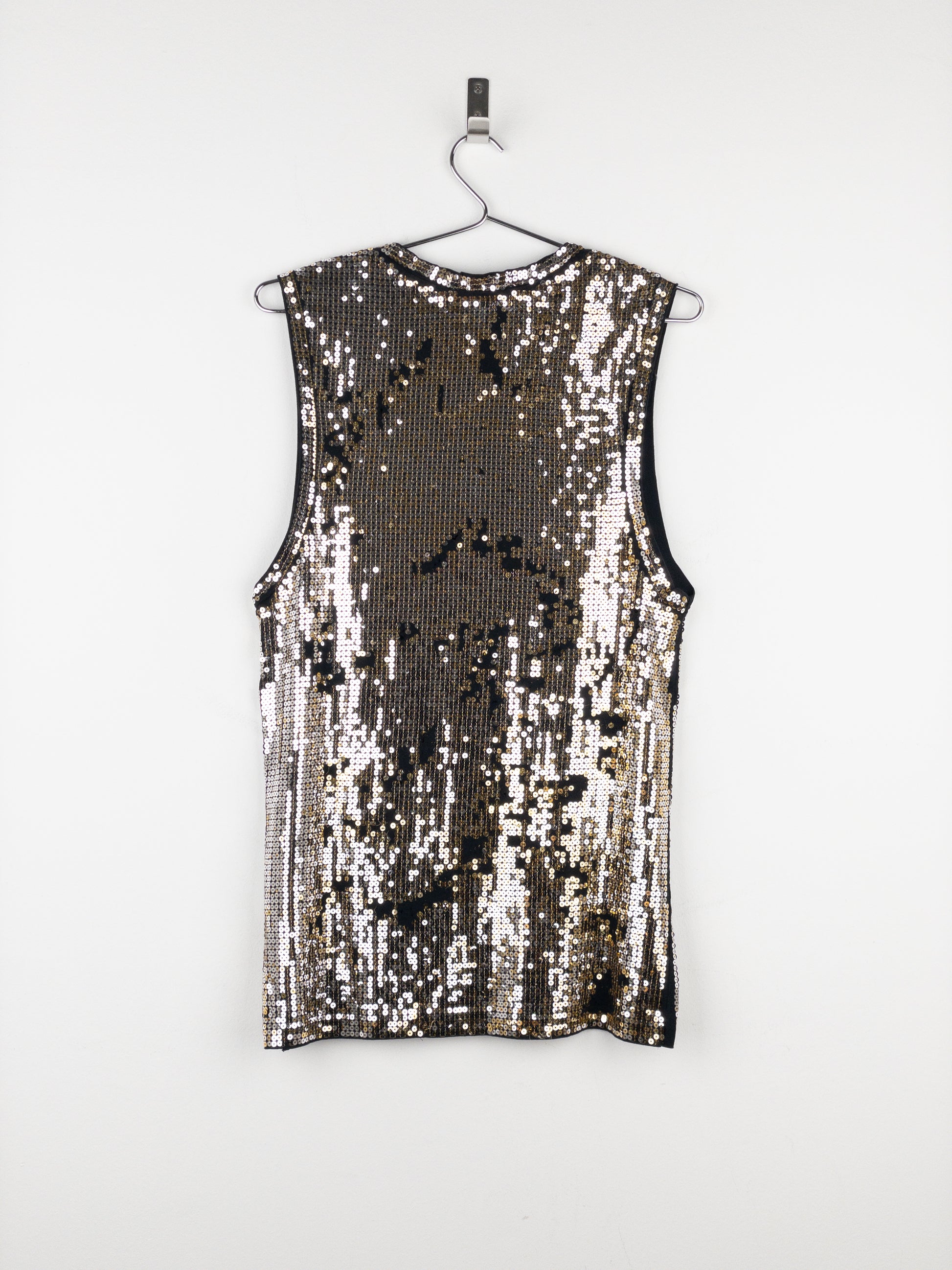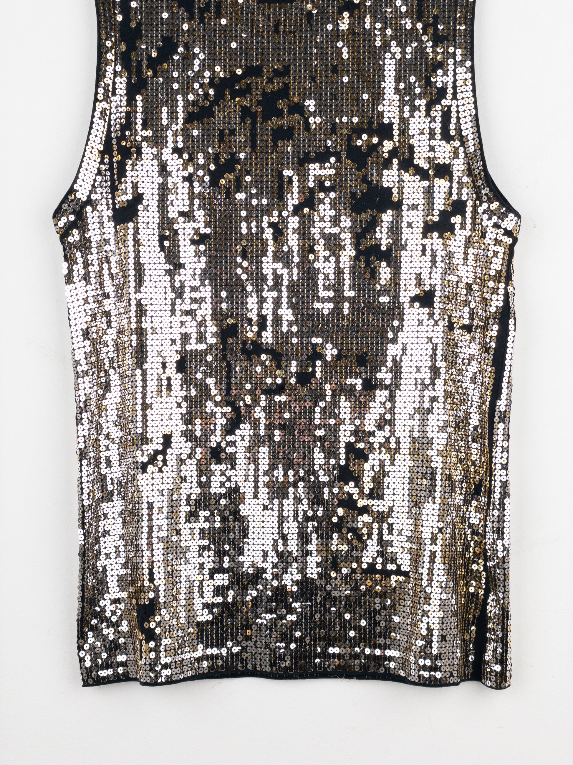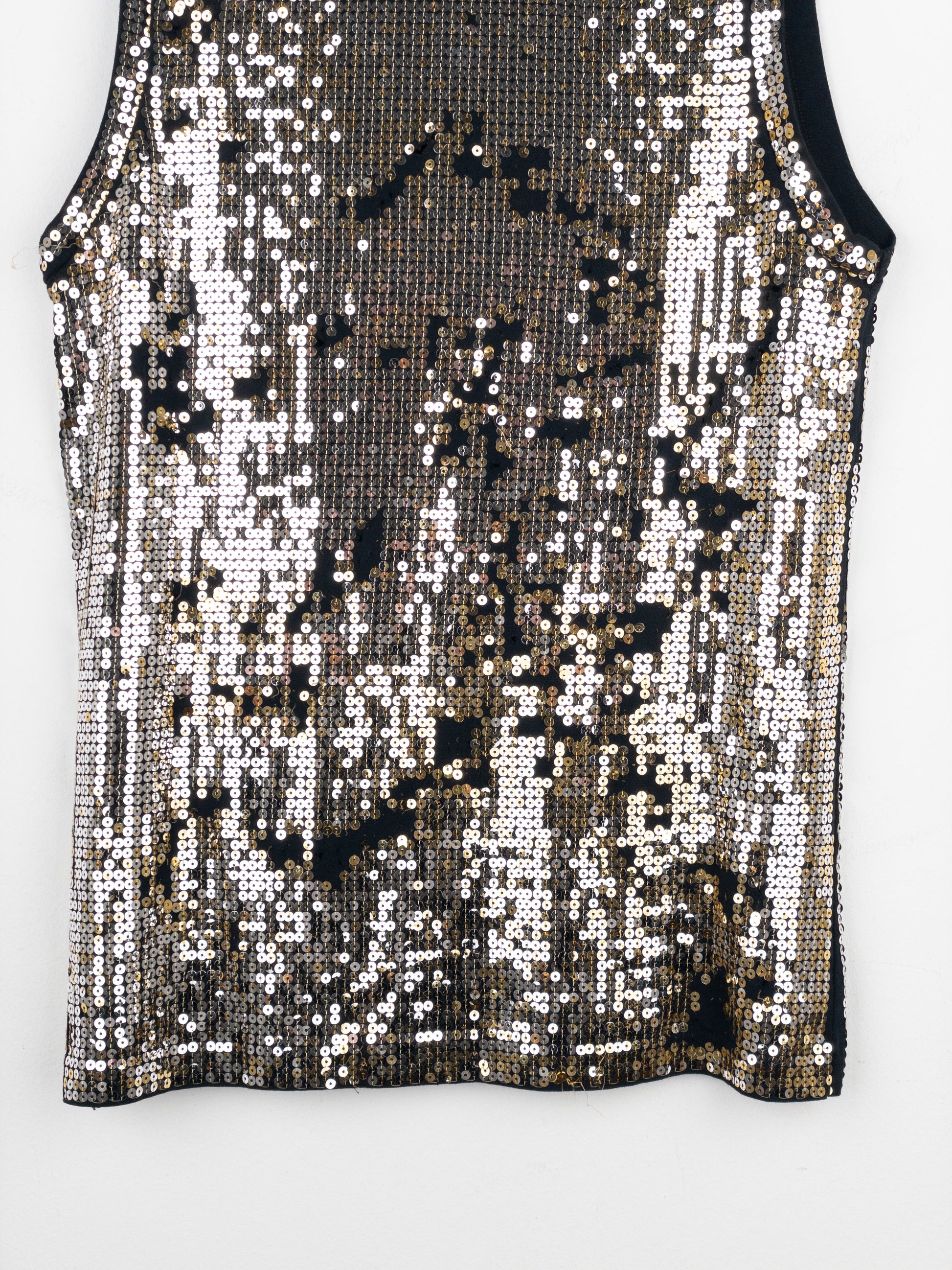 Black tank top with gold sequins added unevenly thorughout to create a distressd and worn look, from the autumn-winter 2010 collection.