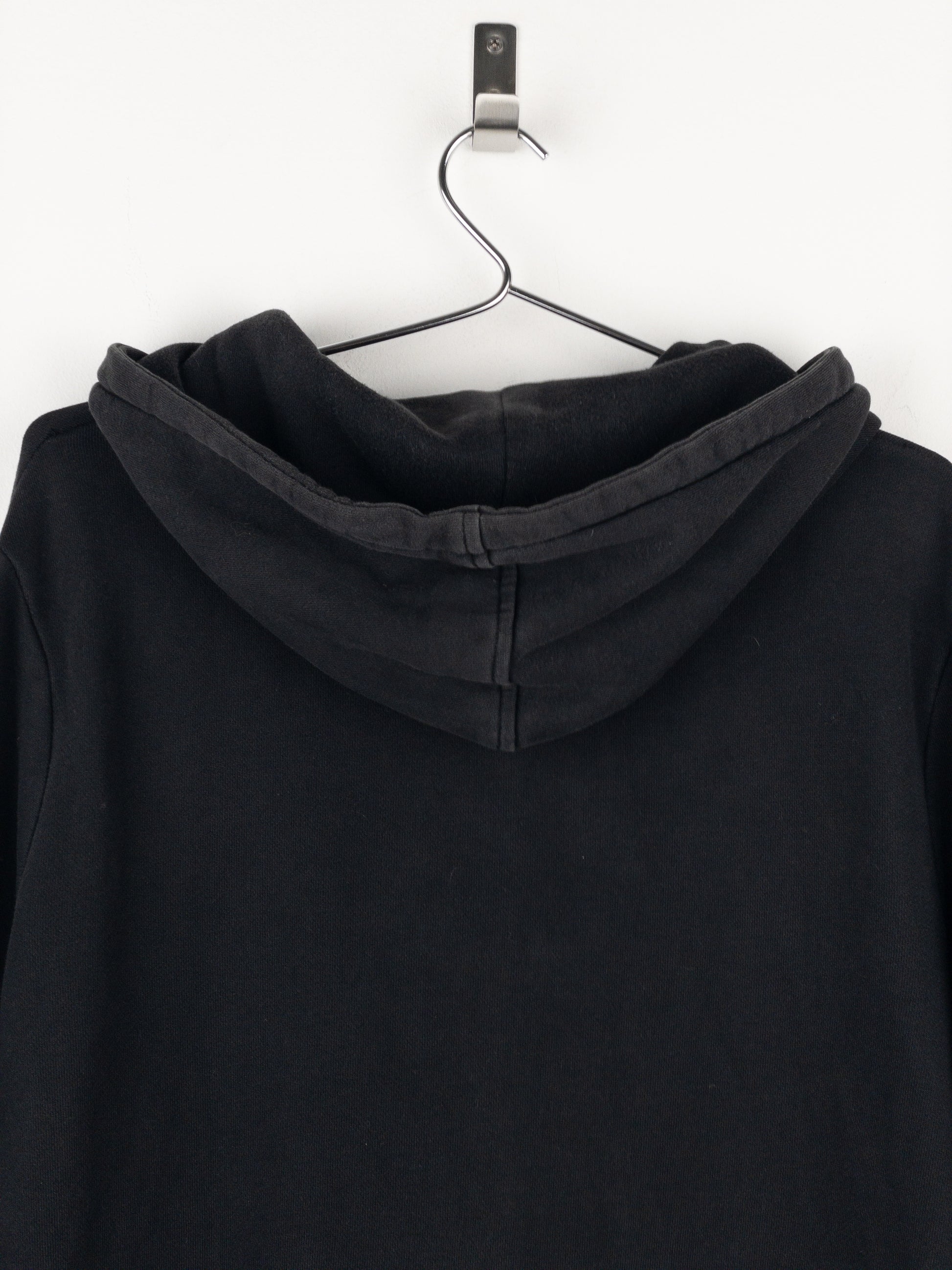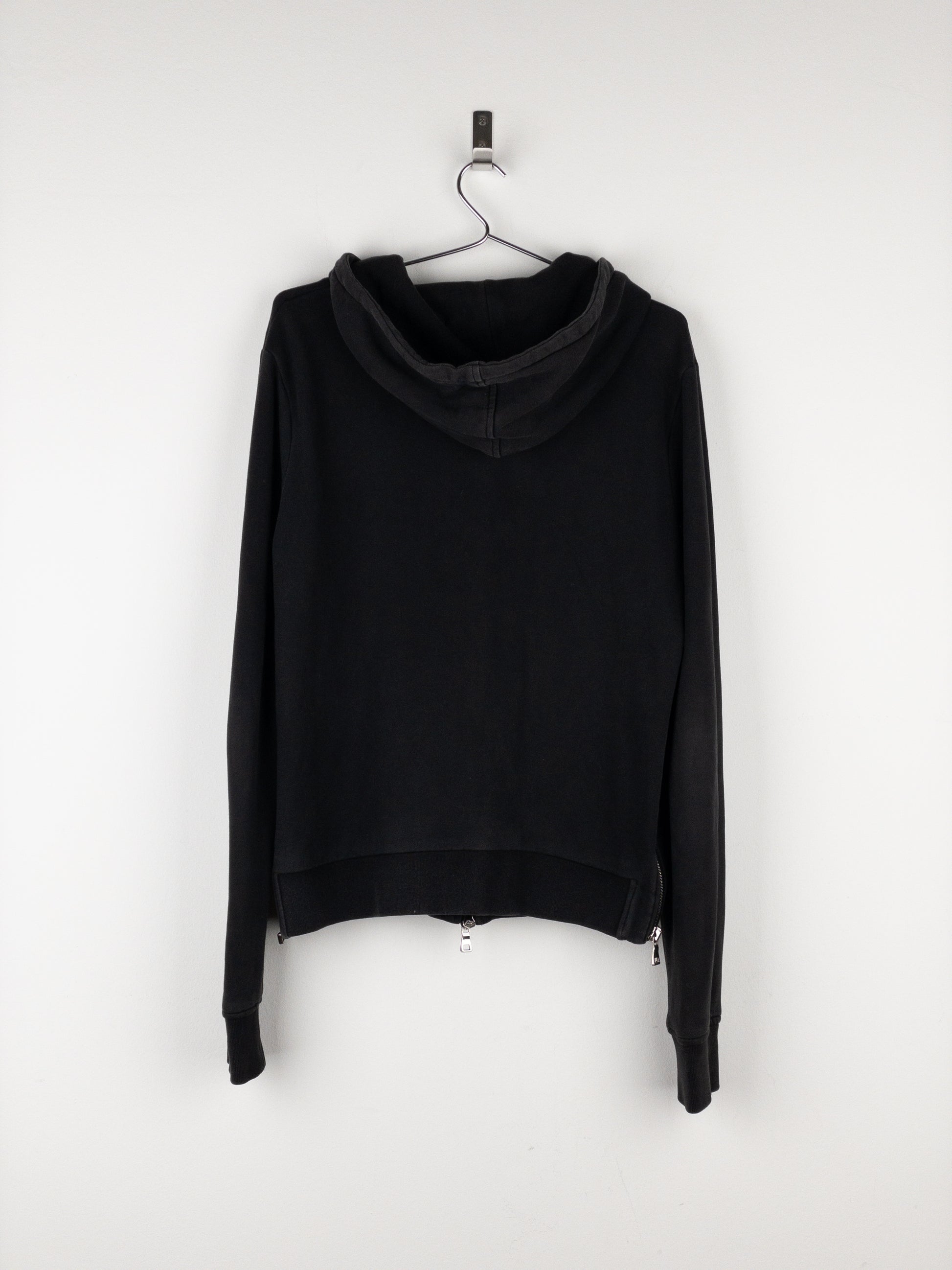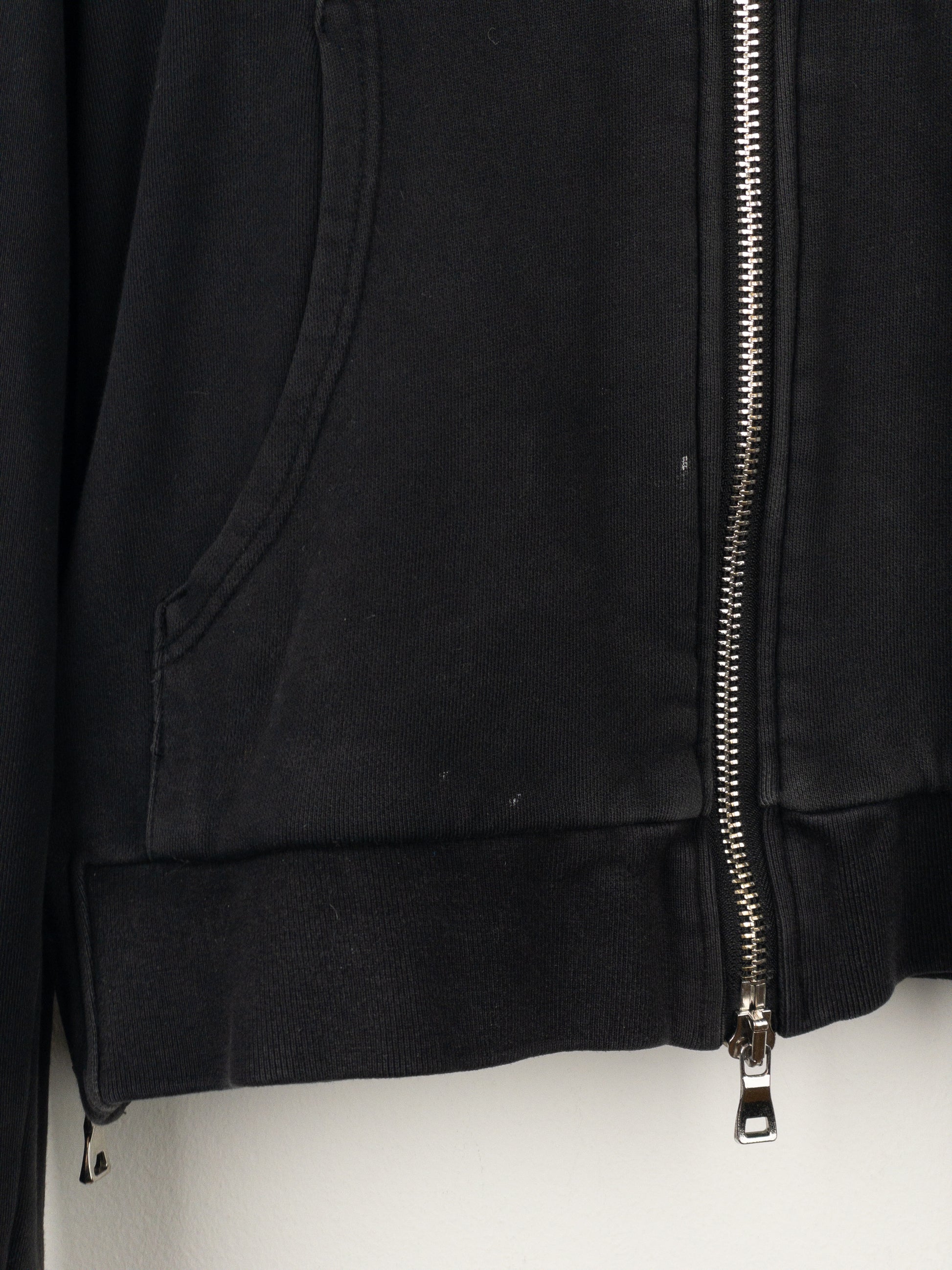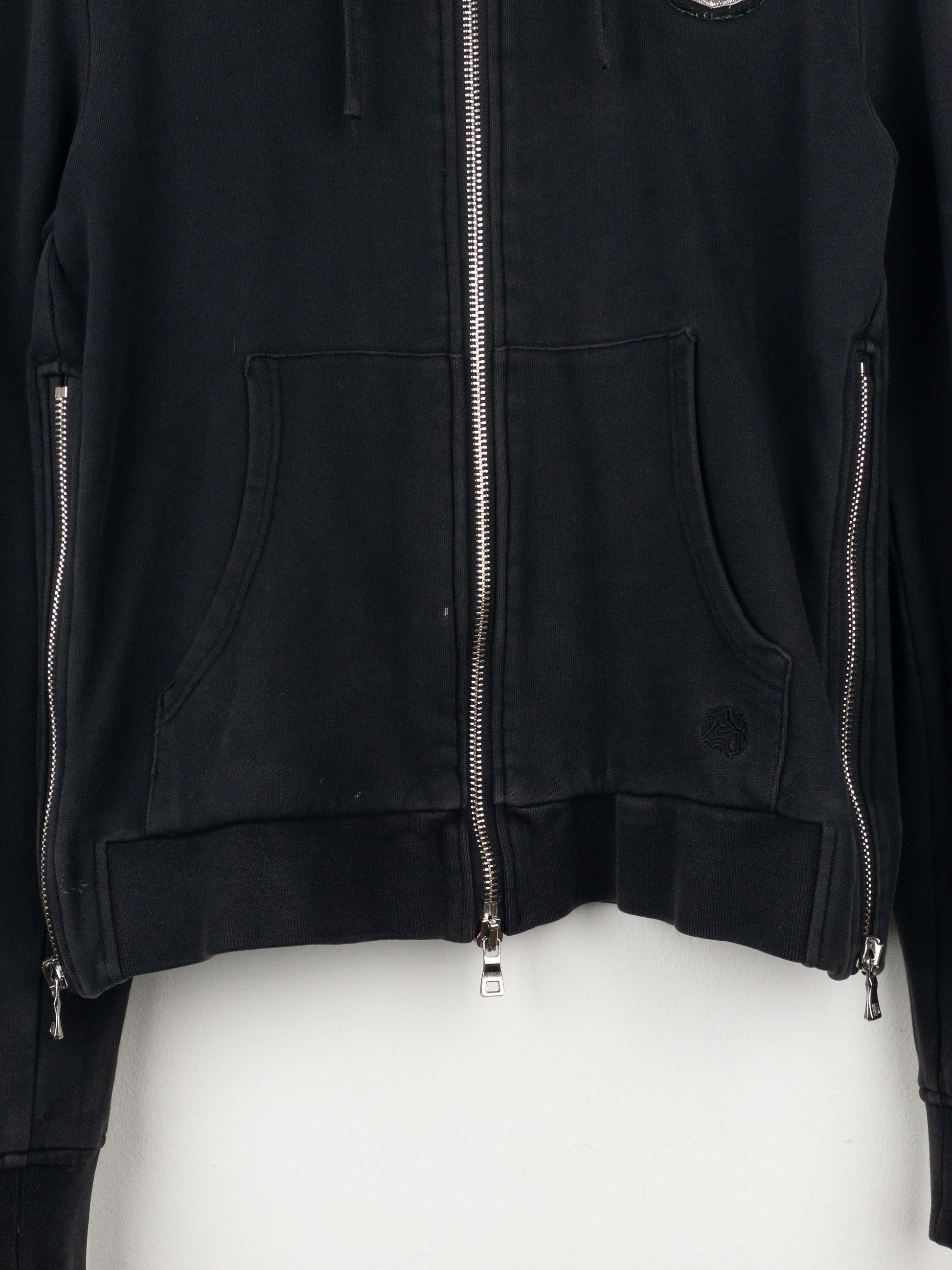 Zip hoodie in faded black, featuring a metalwire-embroidered crest badge on the chest and side zips at the hem.