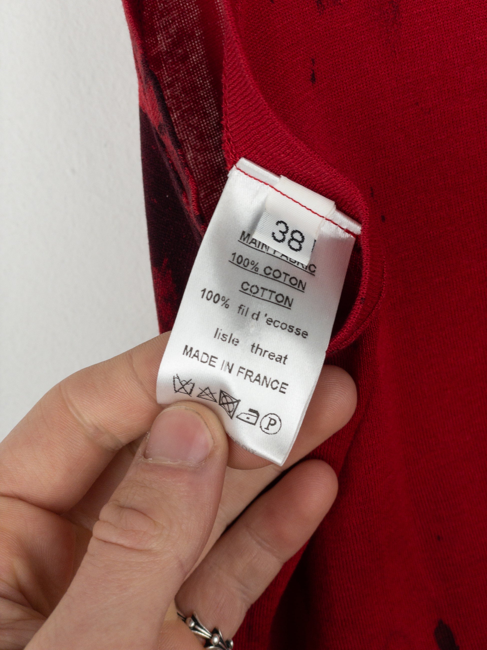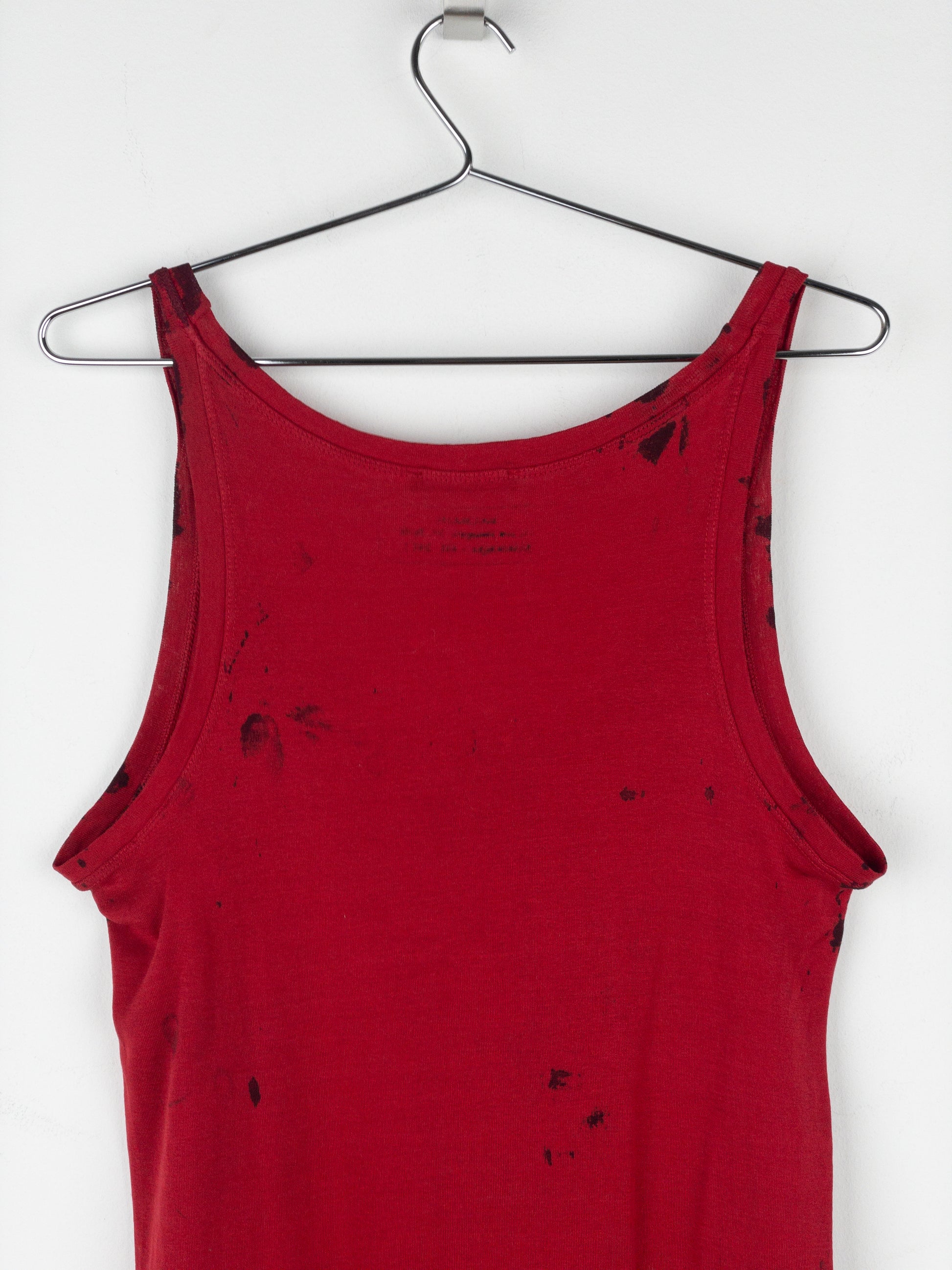 Red tank top with black stains and splatters reminiscent of dried blood, from the spring-summer 2011 collection. Seen on Minzy from the Kpop group 2NE1 in 2011 for the LONELY music video.