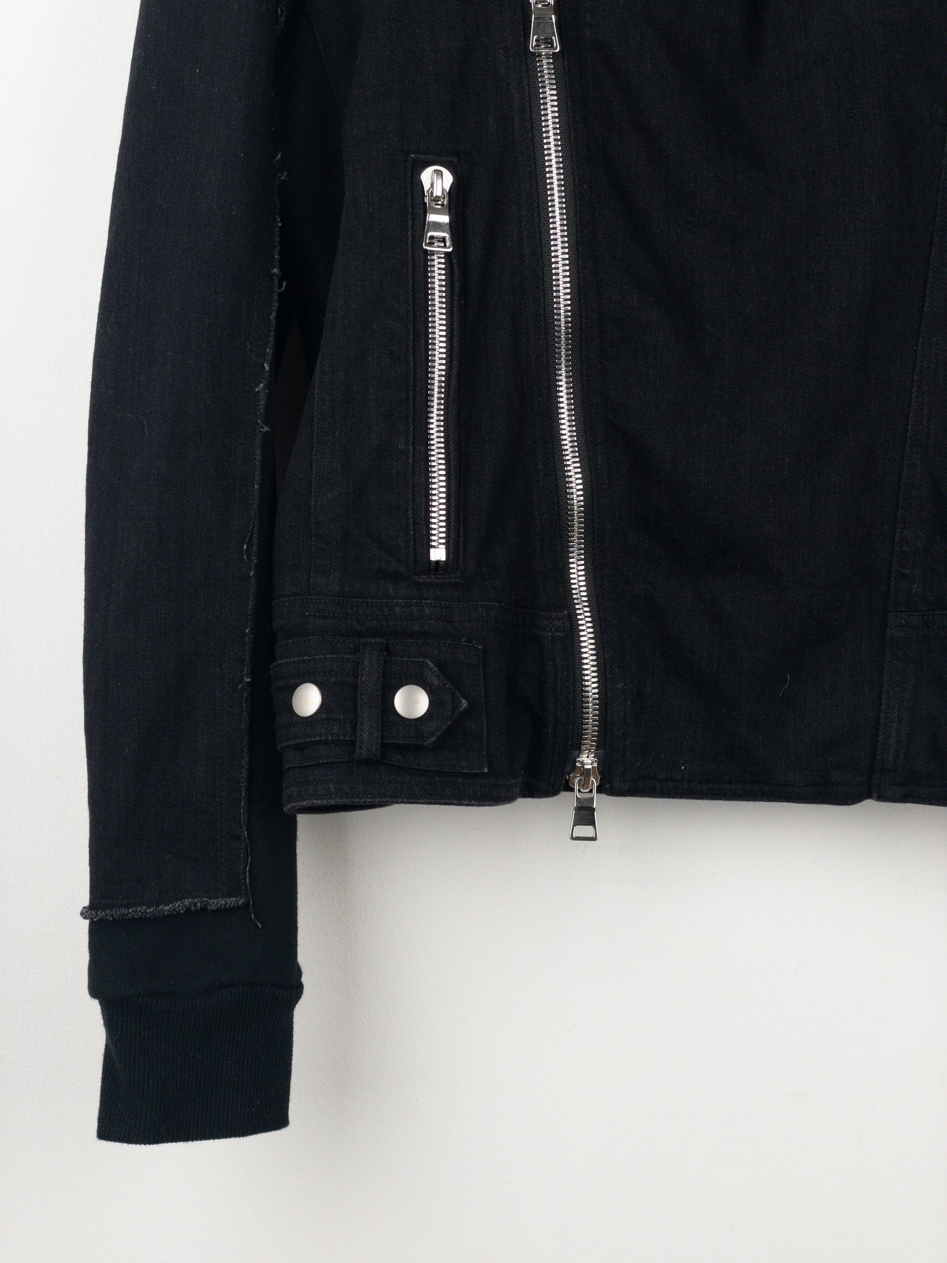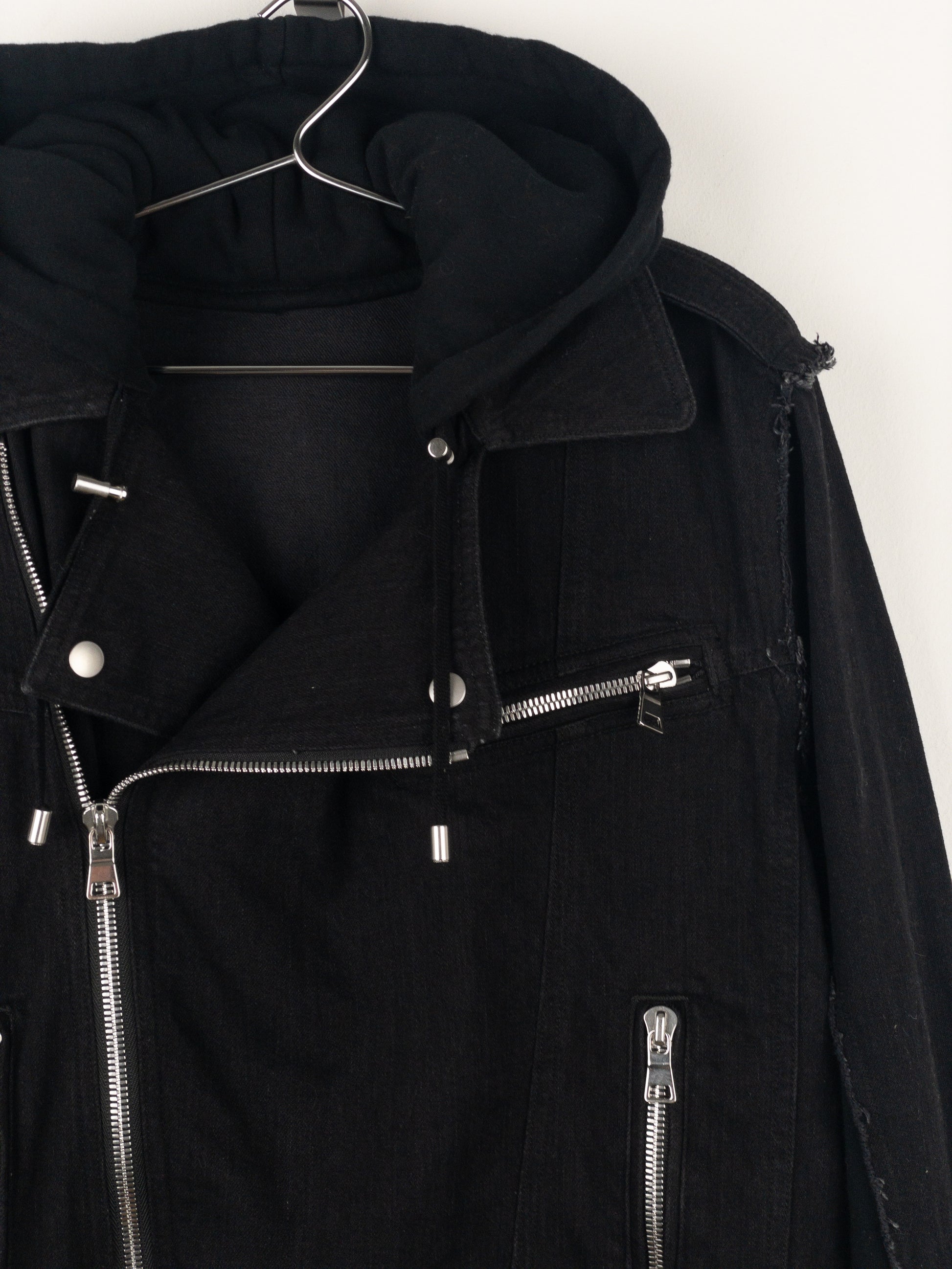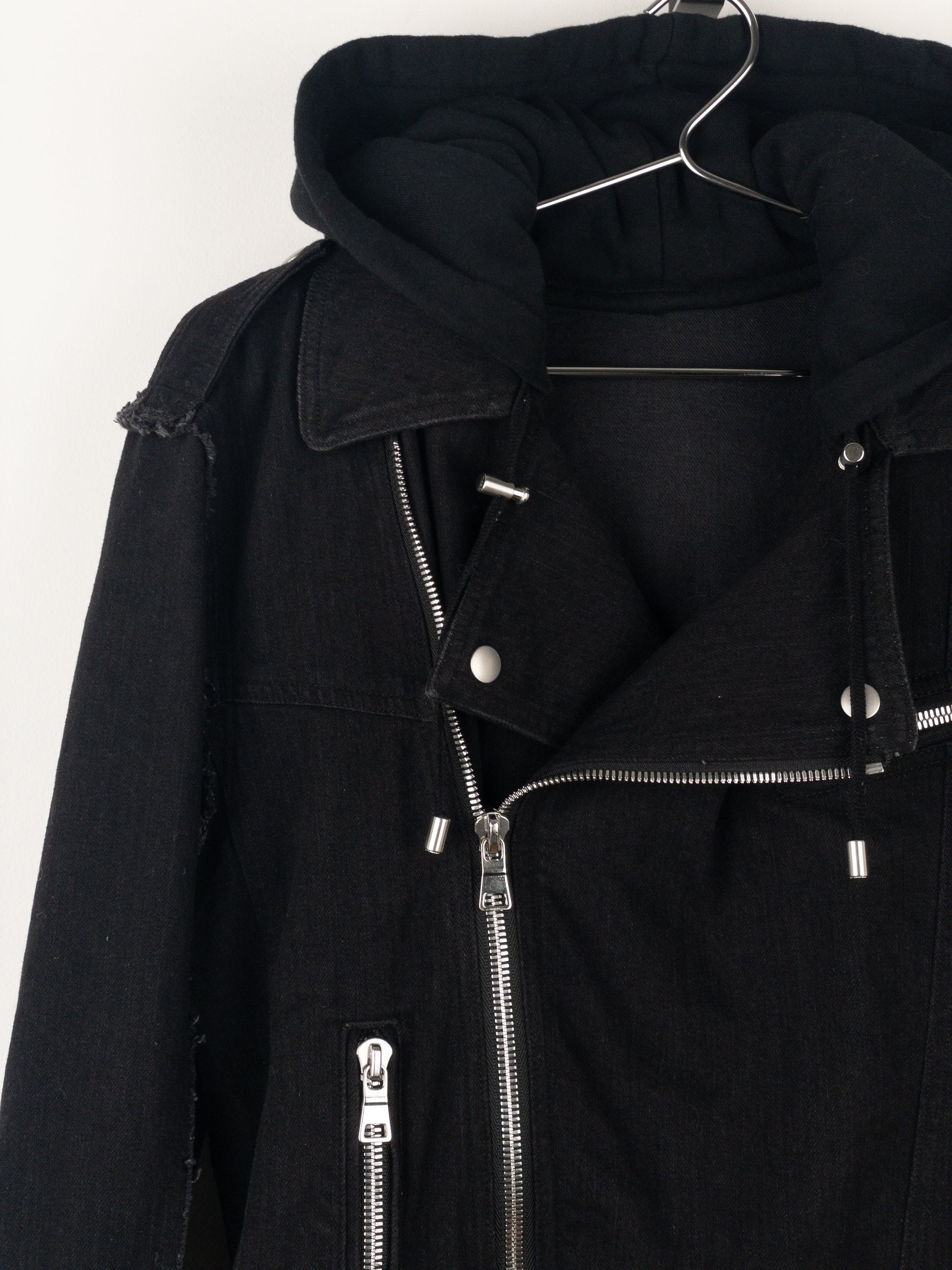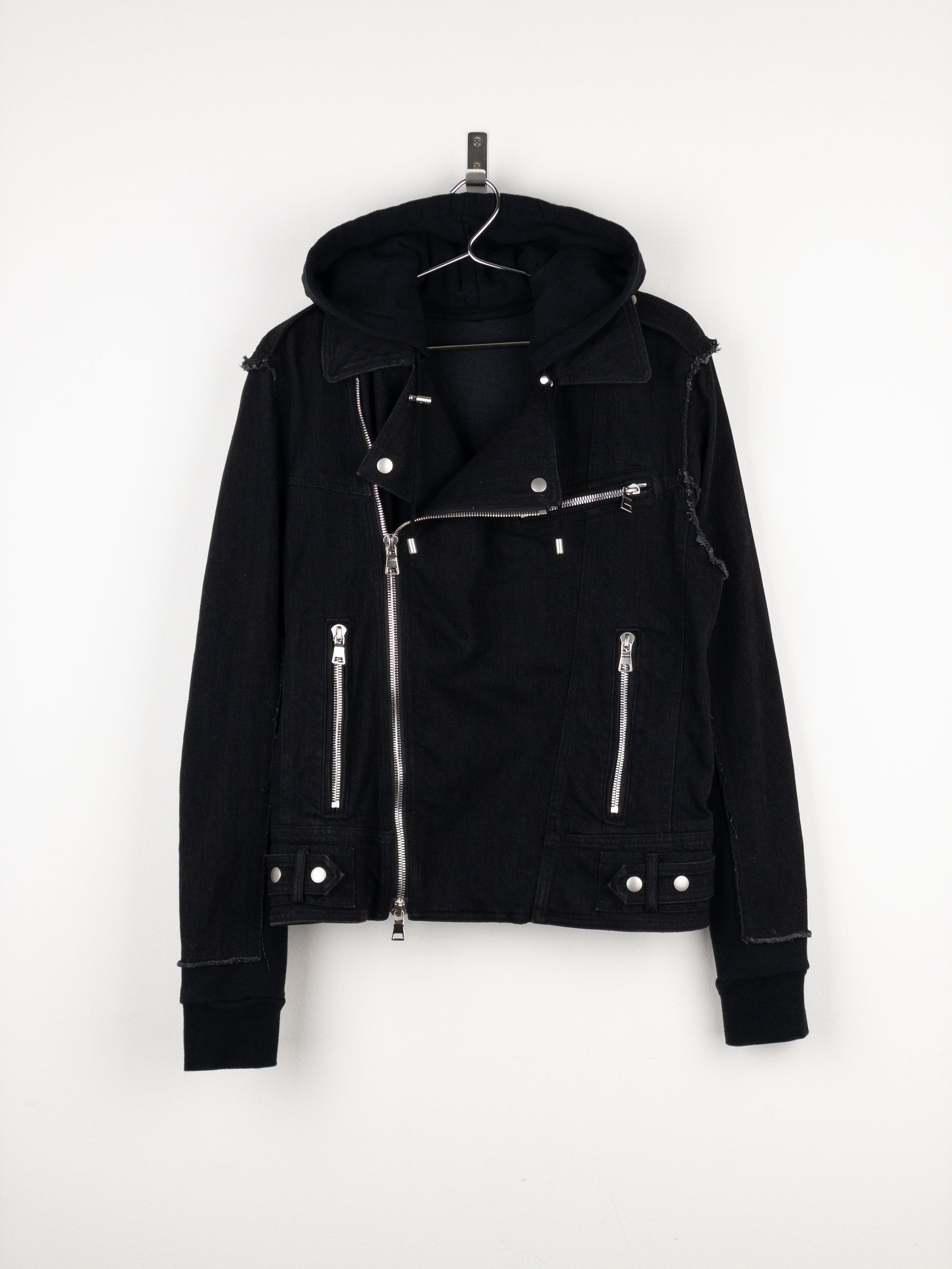 Perfecto biker jacket in black denim with exposed seams on the shoulders and arms, featuring ribbed panels in the back and a sweatshirt hood.