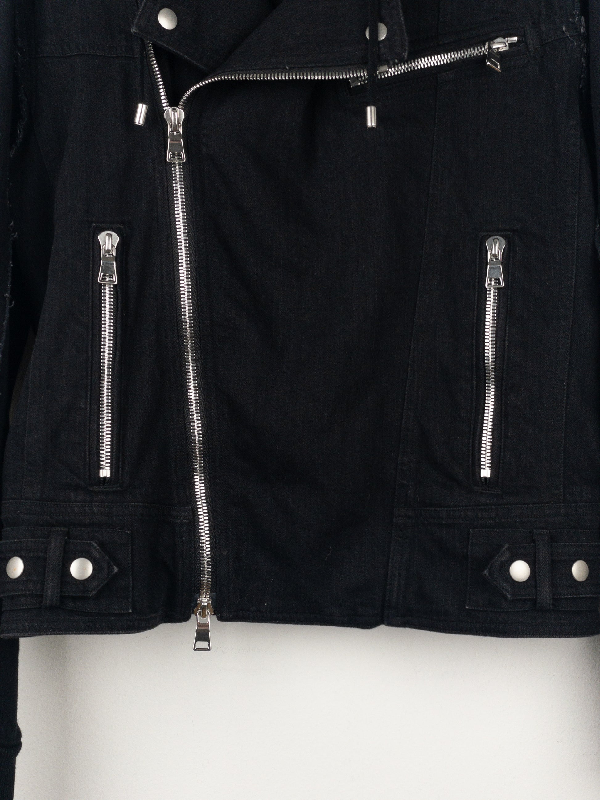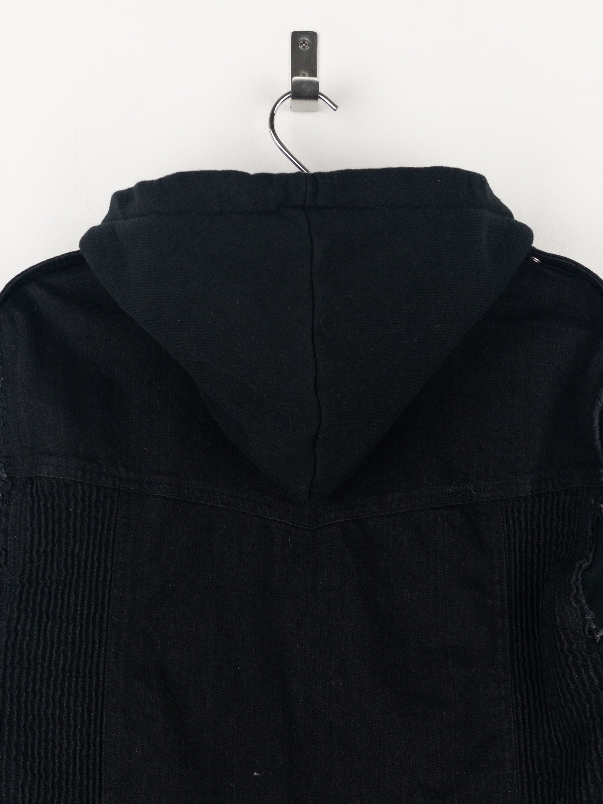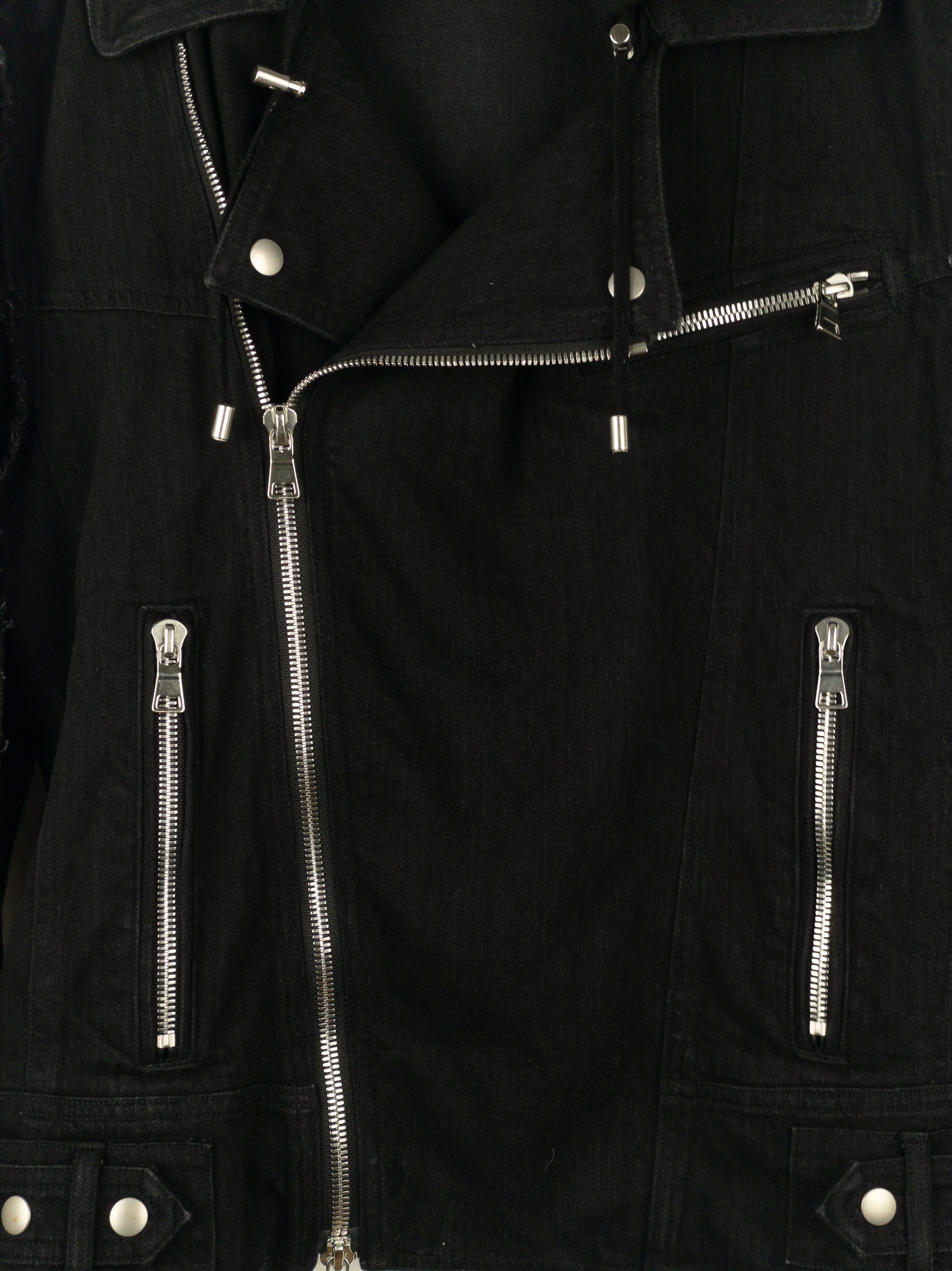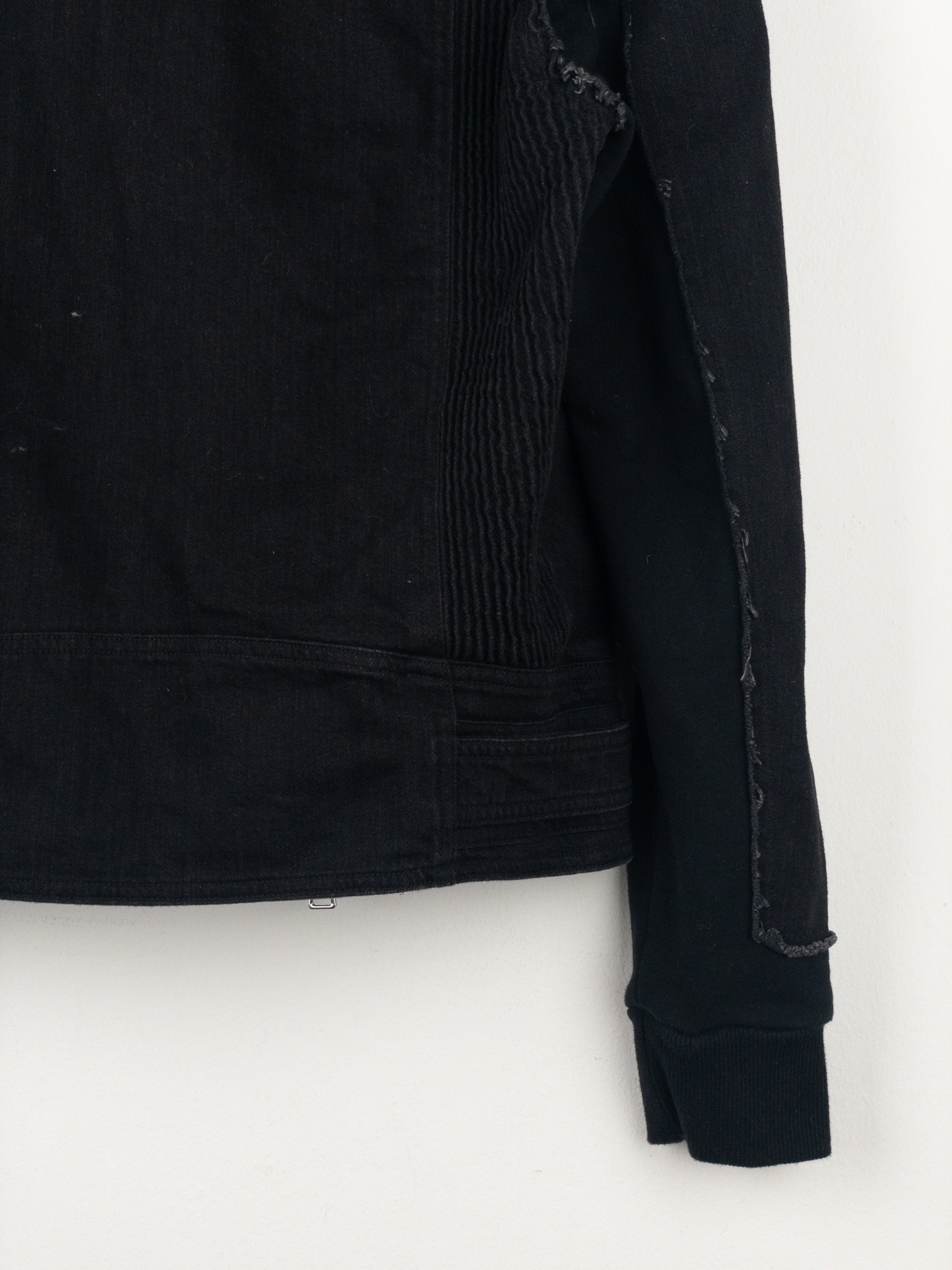 Perfecto biker jacket in black denim with exposed seams on the shoulders and arms, featuring ribbed panels in the back and a sweatshirt hood.