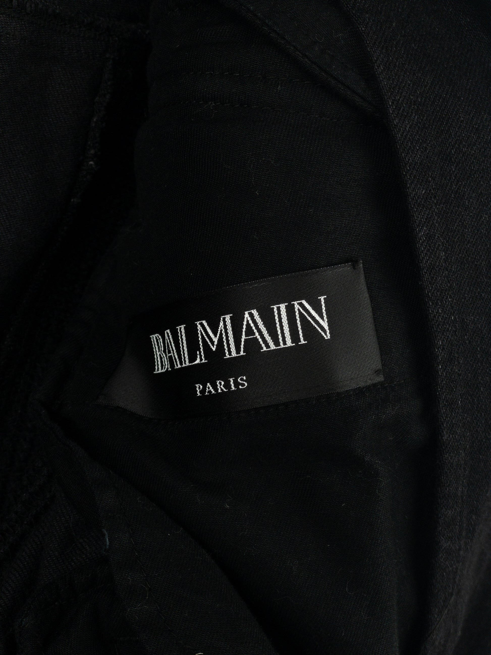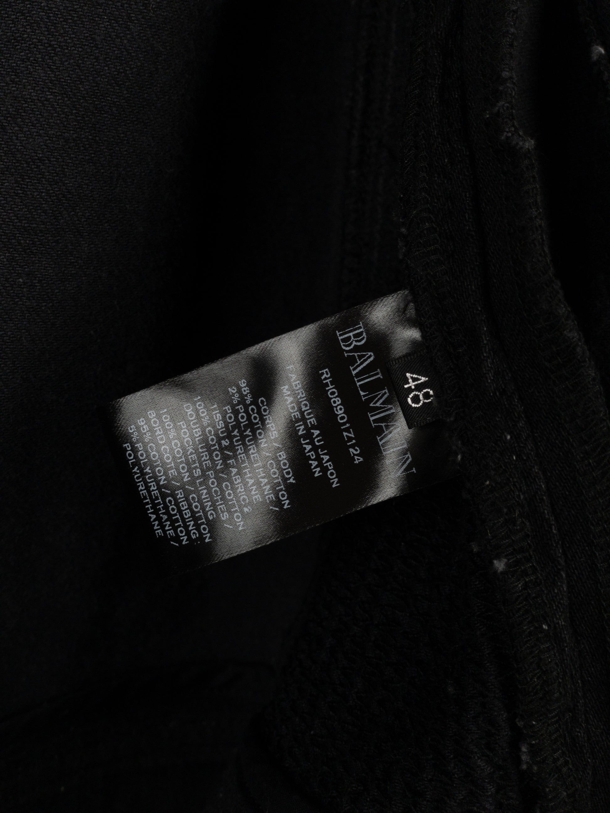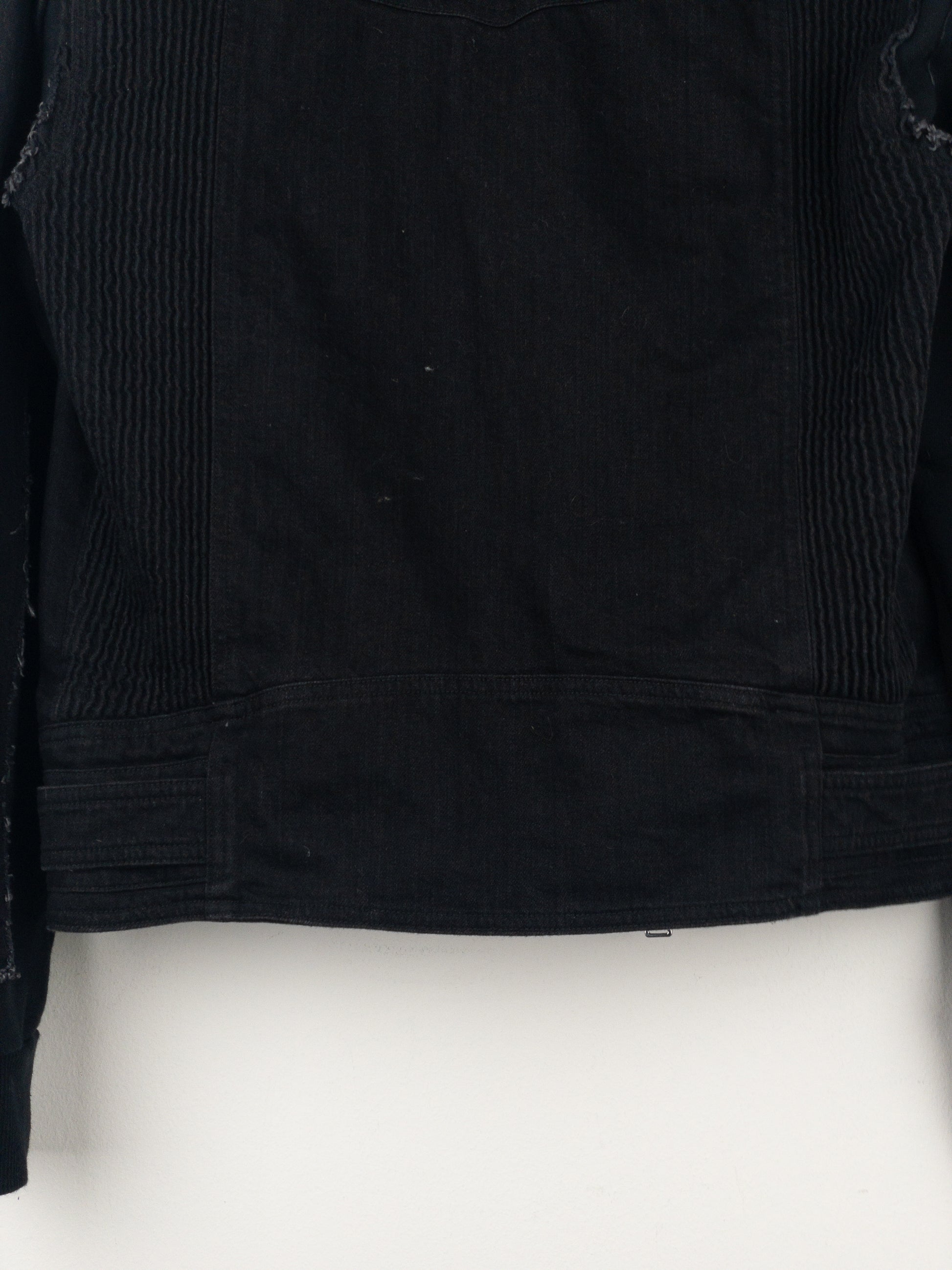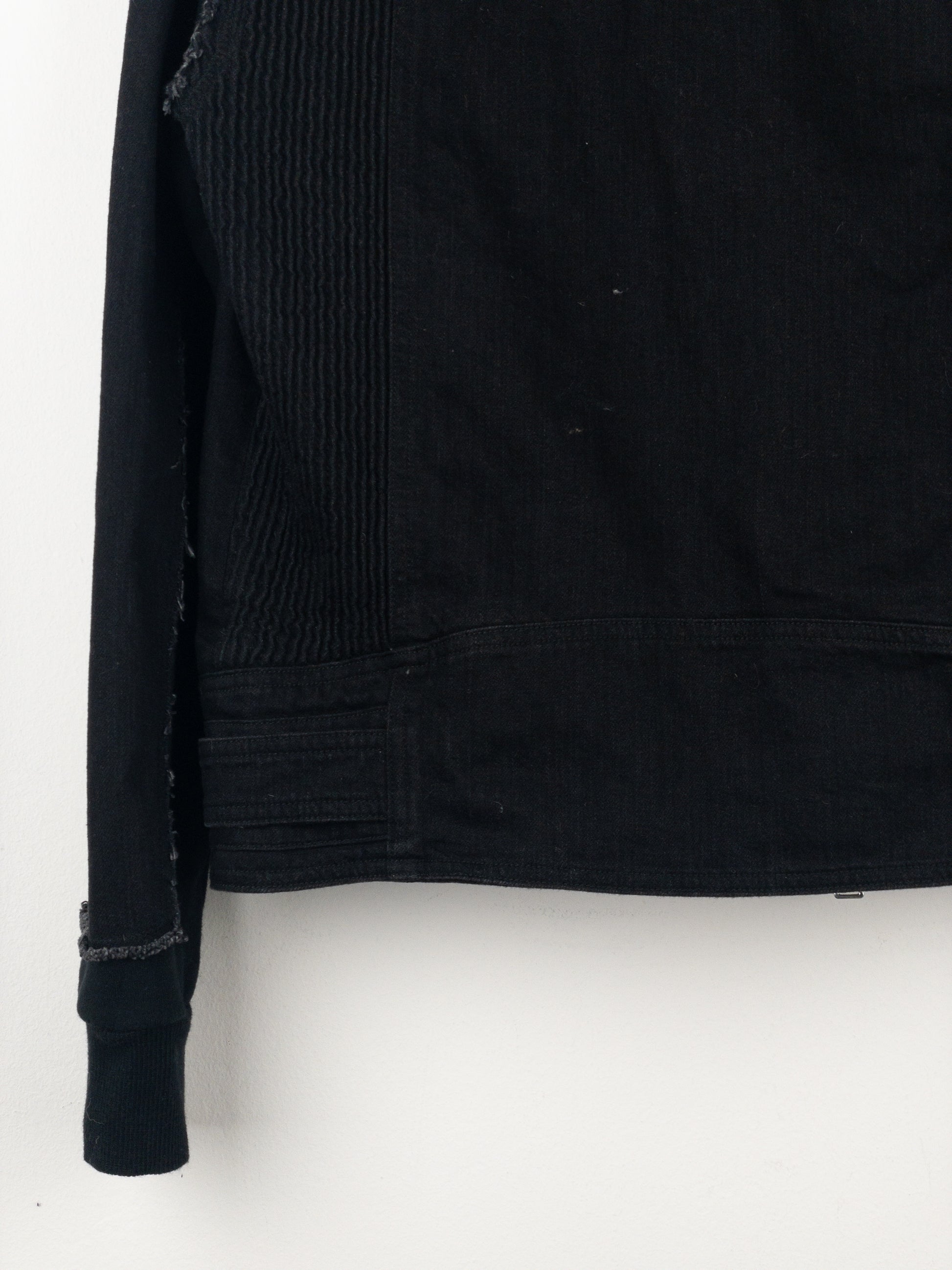 Perfecto biker jacket in black denim with exposed seams on the shoulders and arms, featuring ribbed panels in the back and a sweatshirt hood.