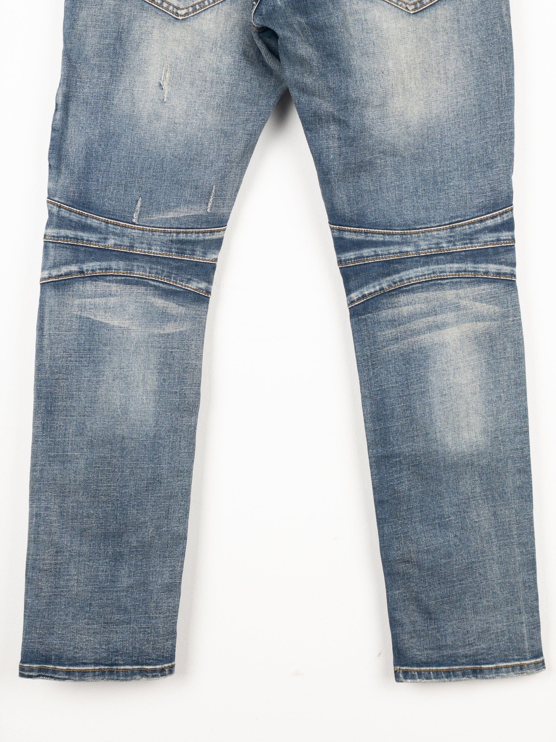 Blue sandwash denim jeans with ribbed biker details on the knees and in the back of the waist, featuring repairs throughout and the signature hidden front pockets and zip fly.