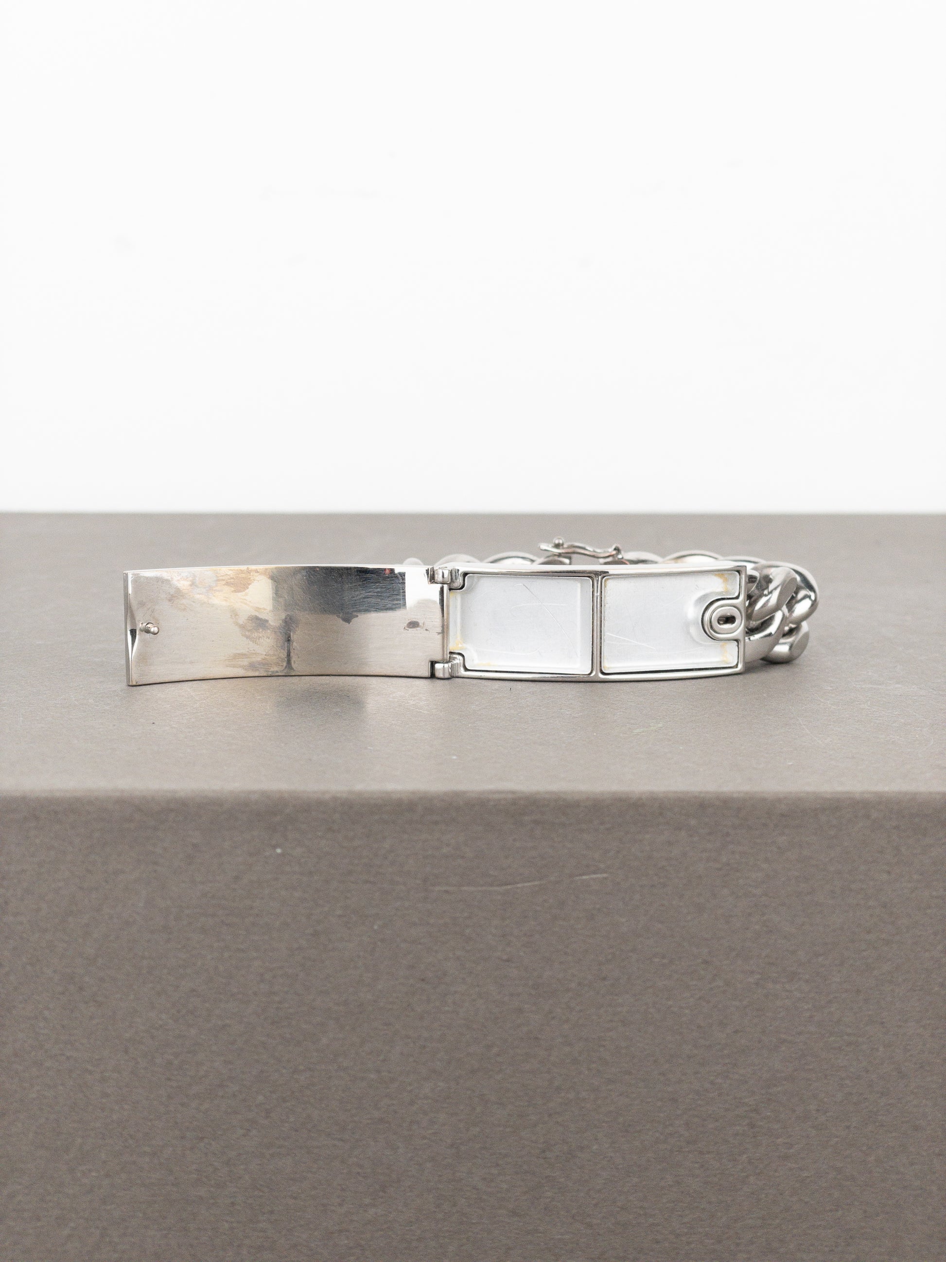 Silver-colored cuban link bracelet with branded and functional pill-case in the middle, from the sping-summer 2004 collection.