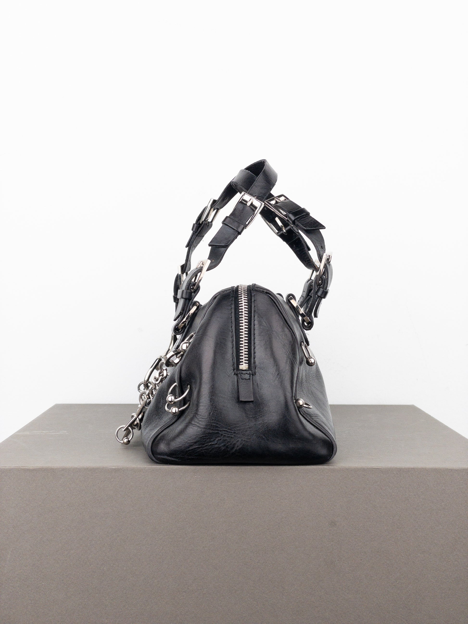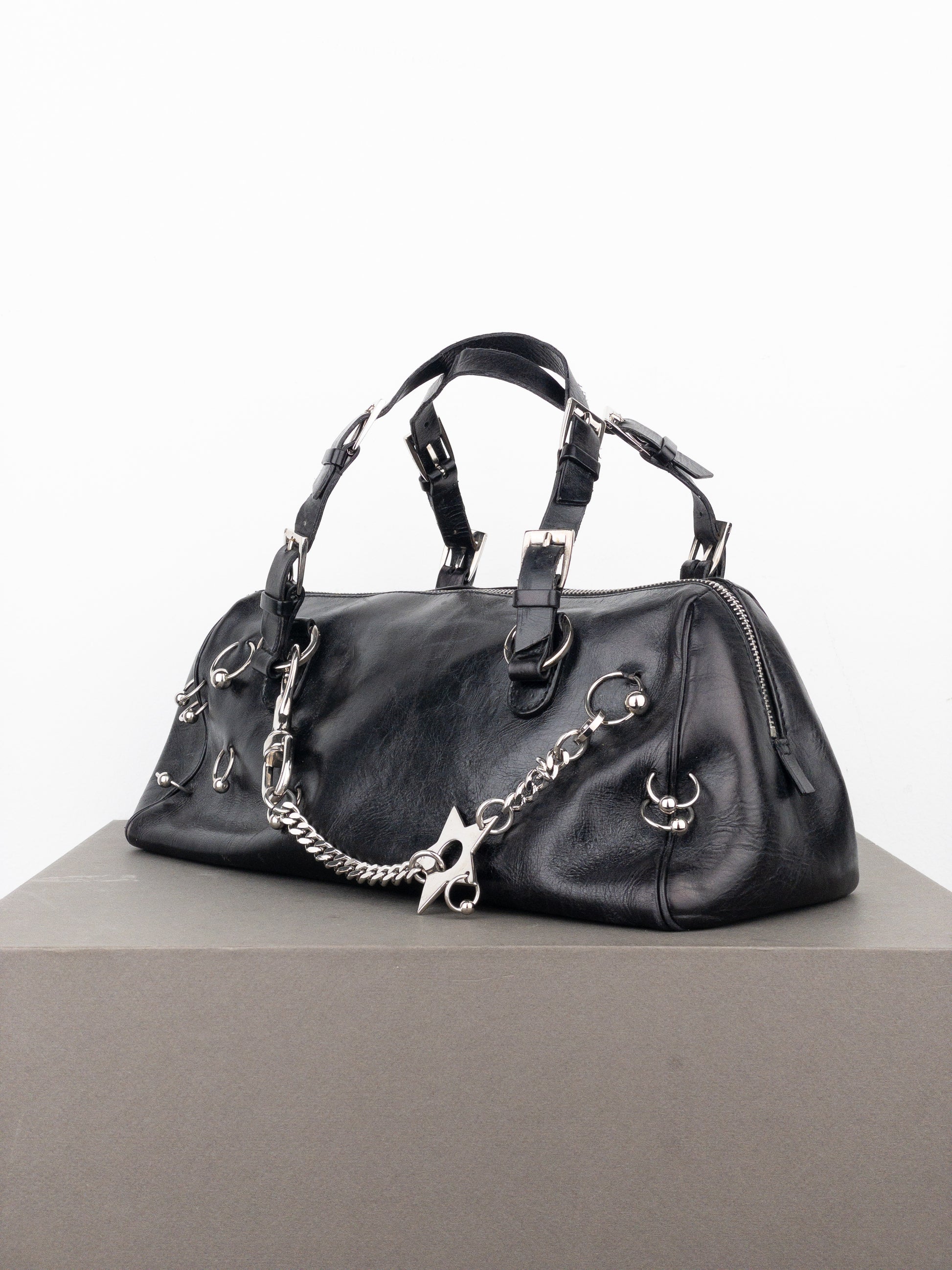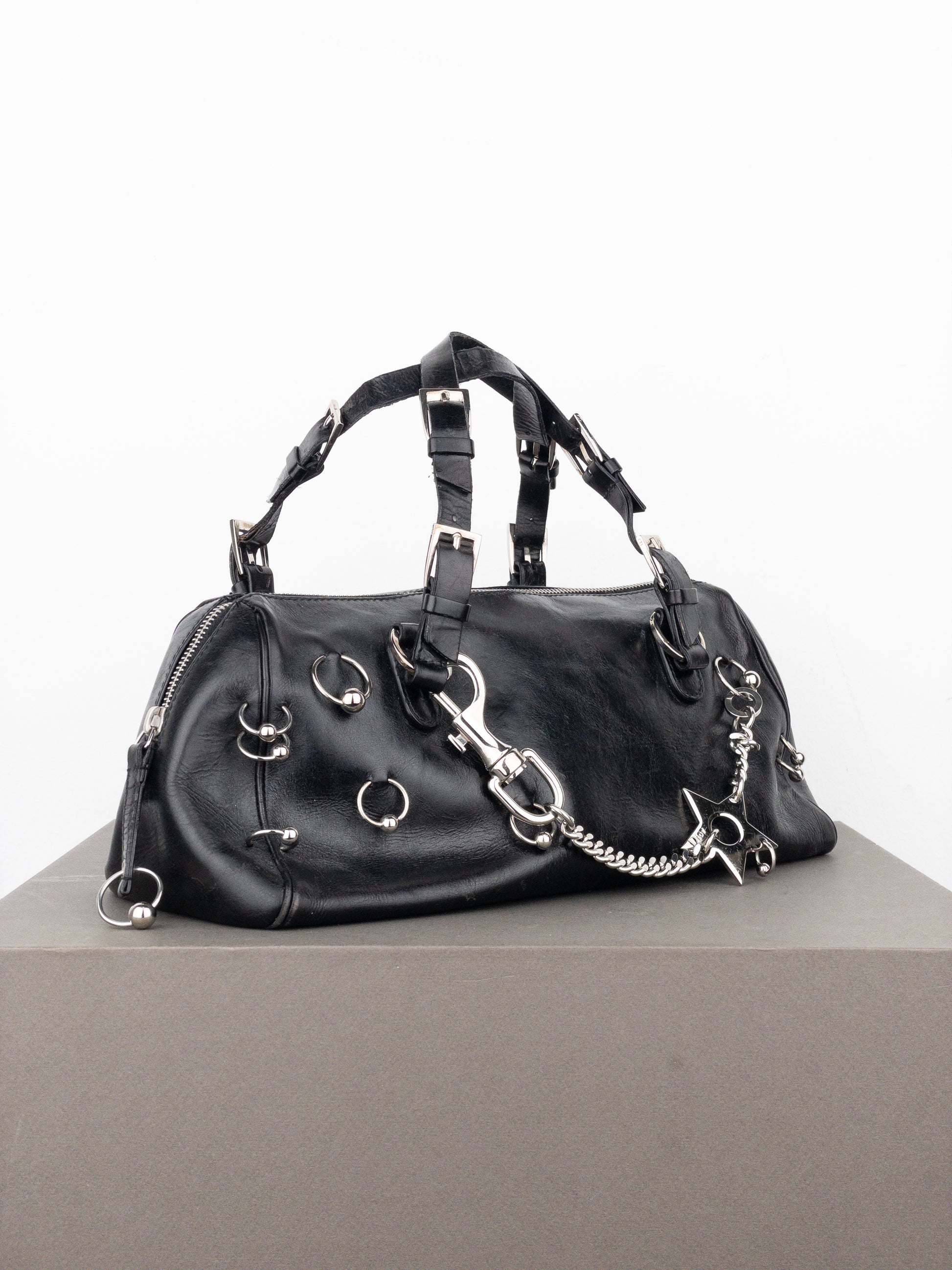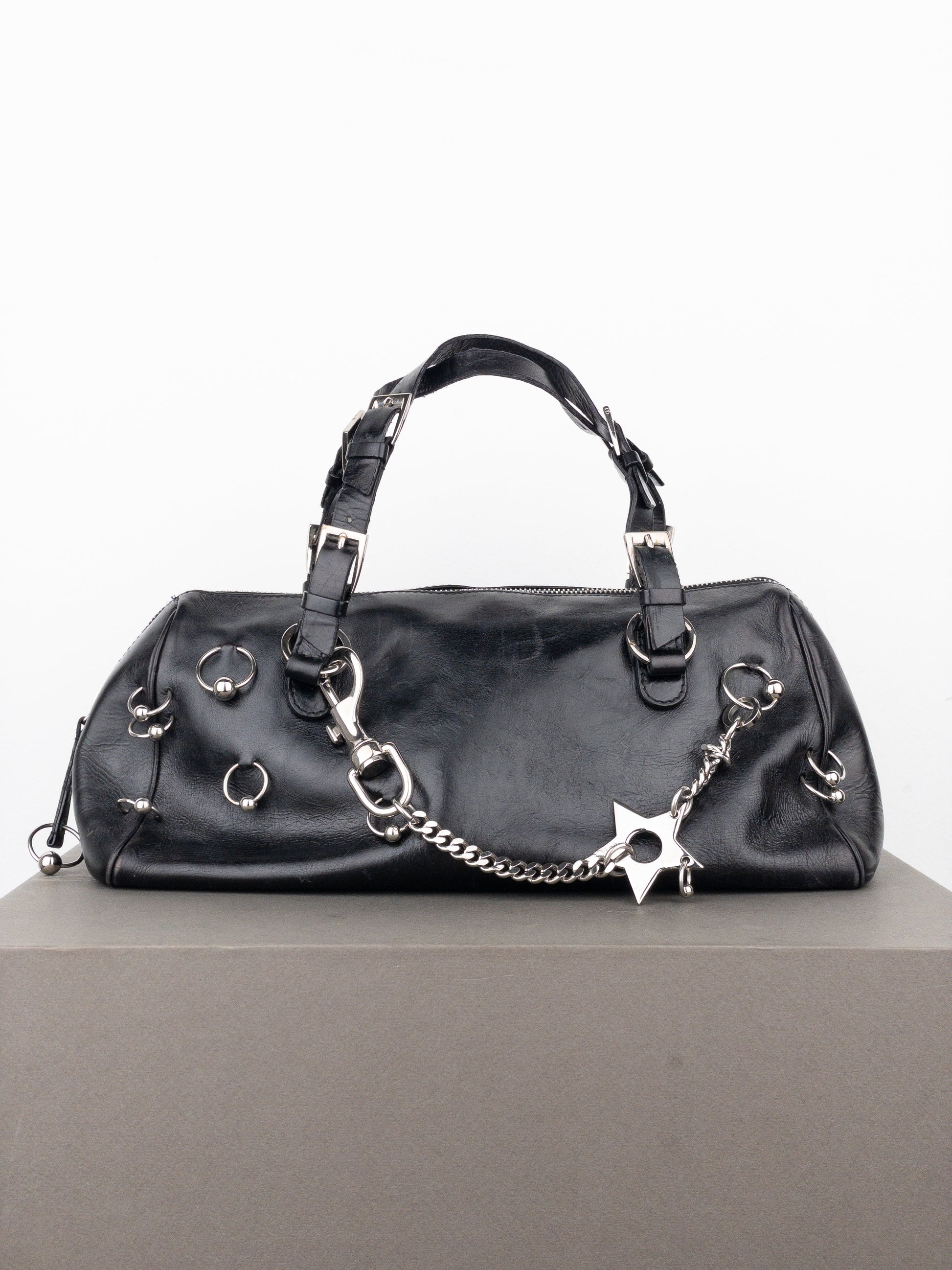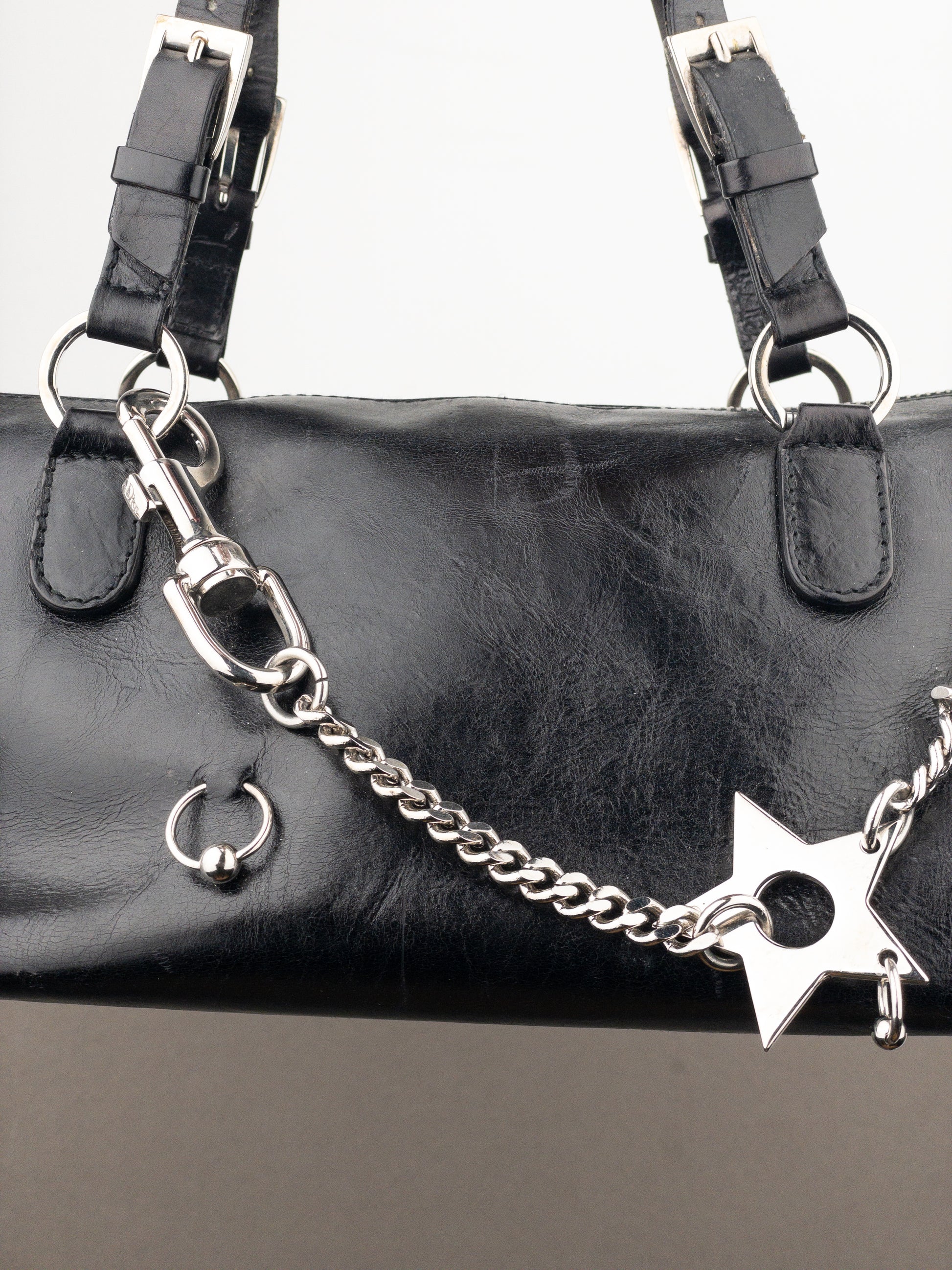 Black leather bowling bag with silver-colored hardware, featuring piercing rings throughout and a chain with the signature star hanging across the front, attached with a lobster clasp, from the spring-summer 2004 collection.
