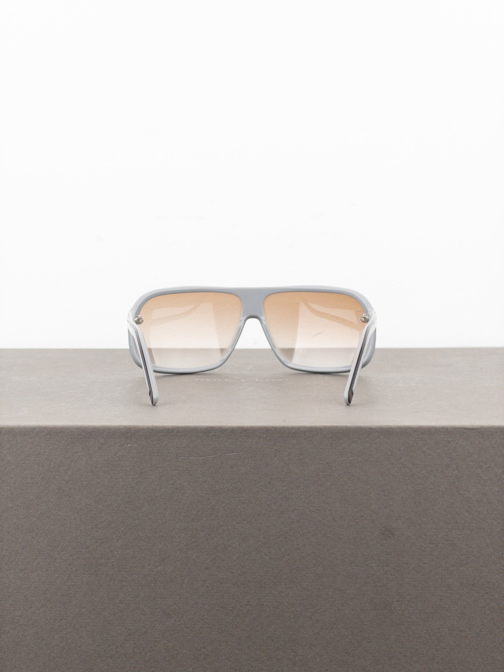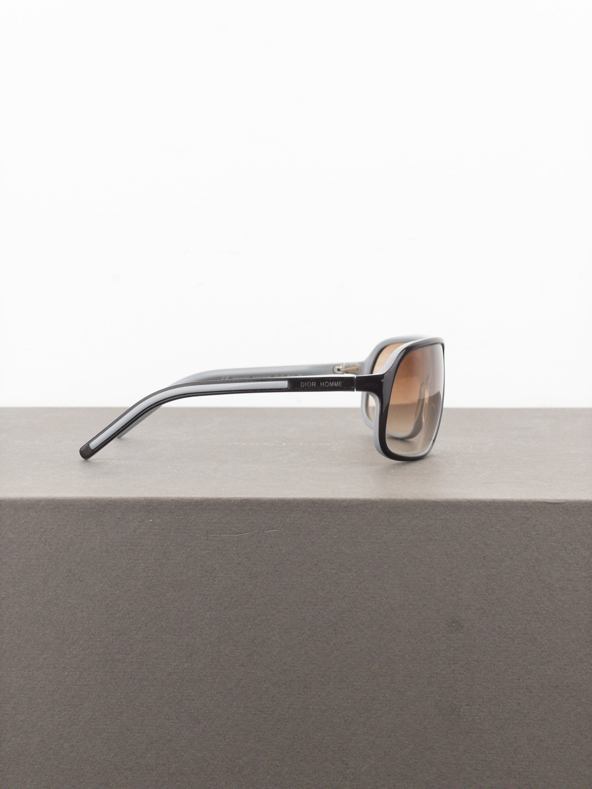 Angular aviator sunglasses in dark brown and light grey acetate, featuring brown tinted lenses.