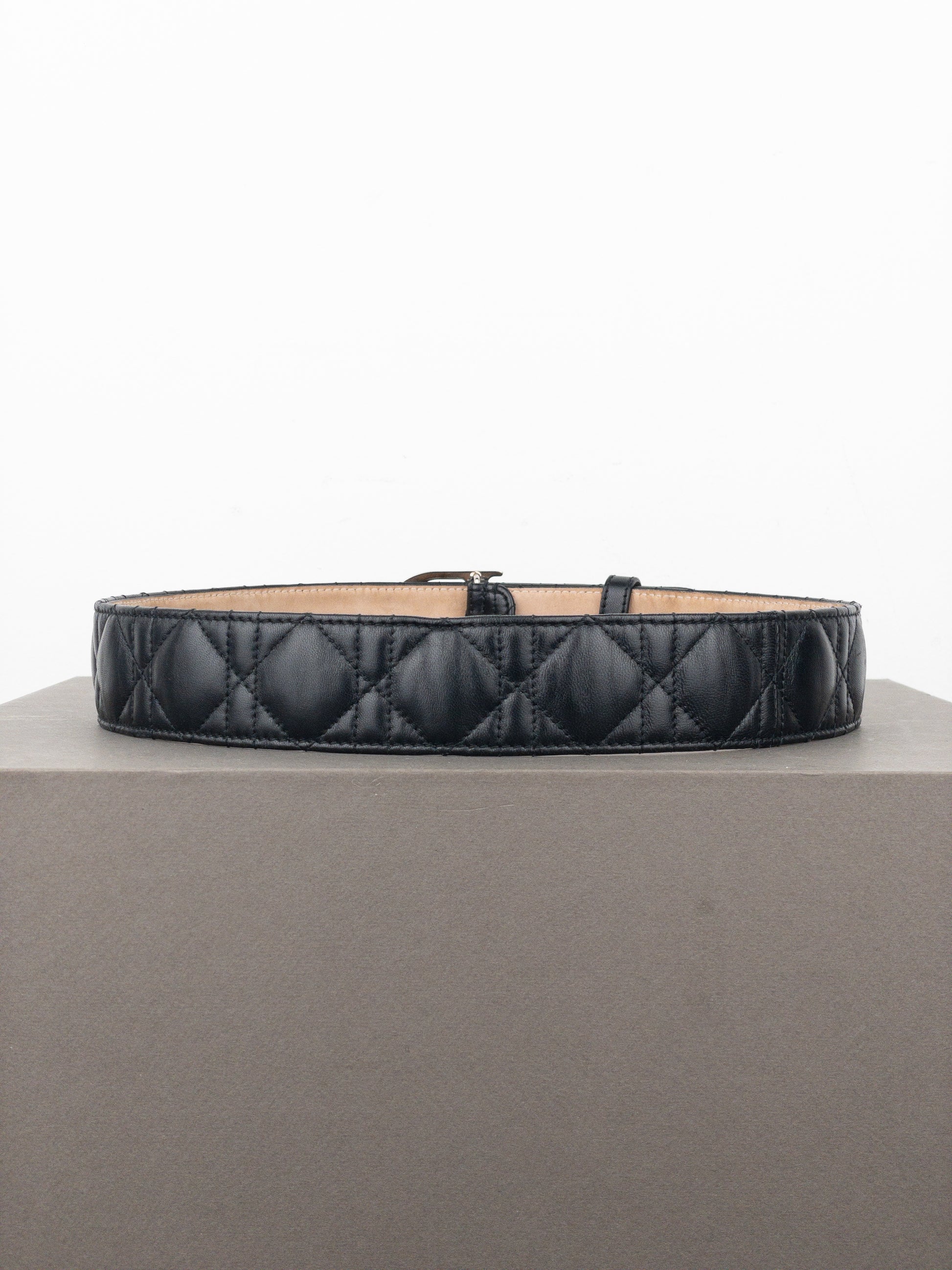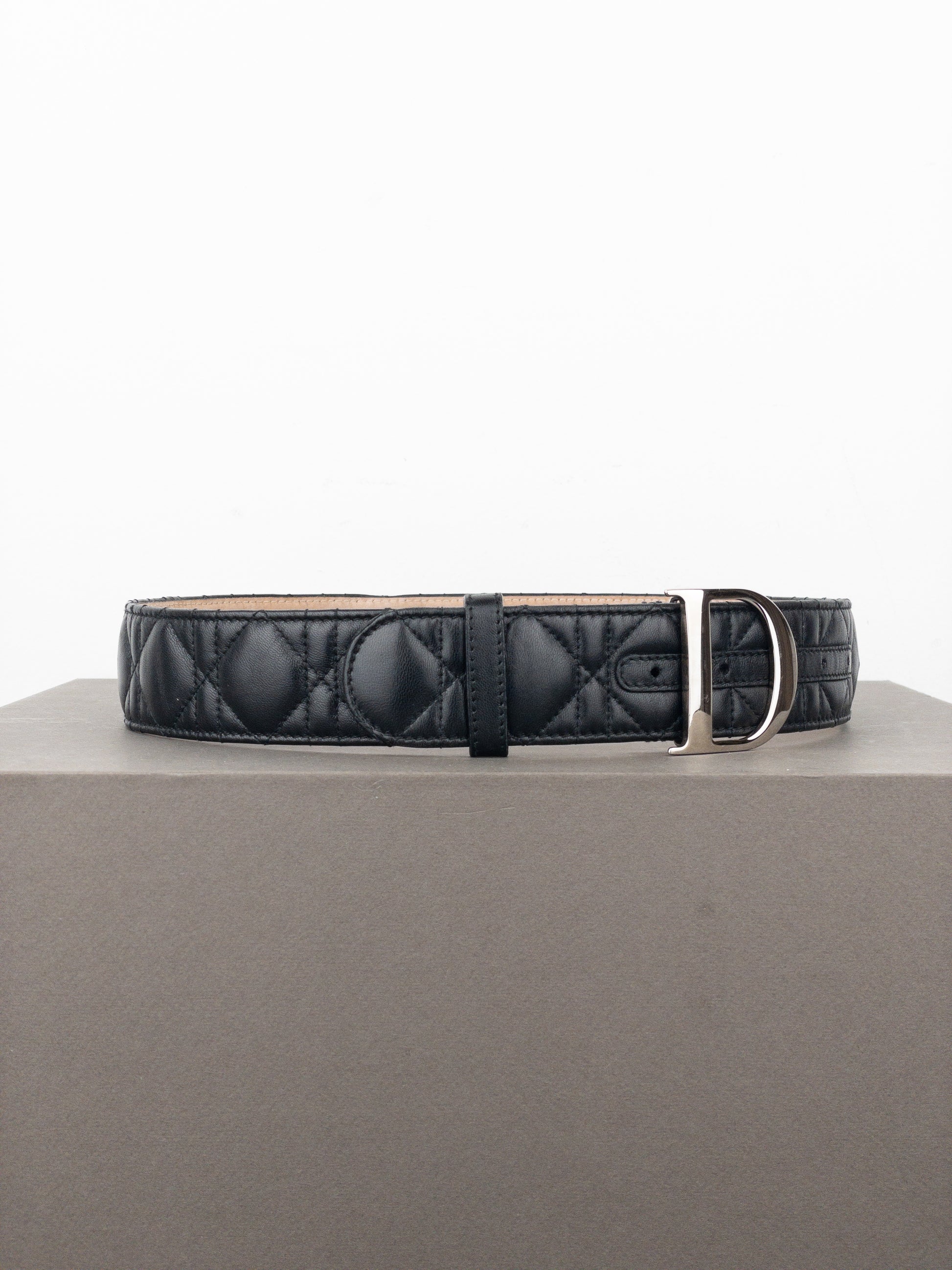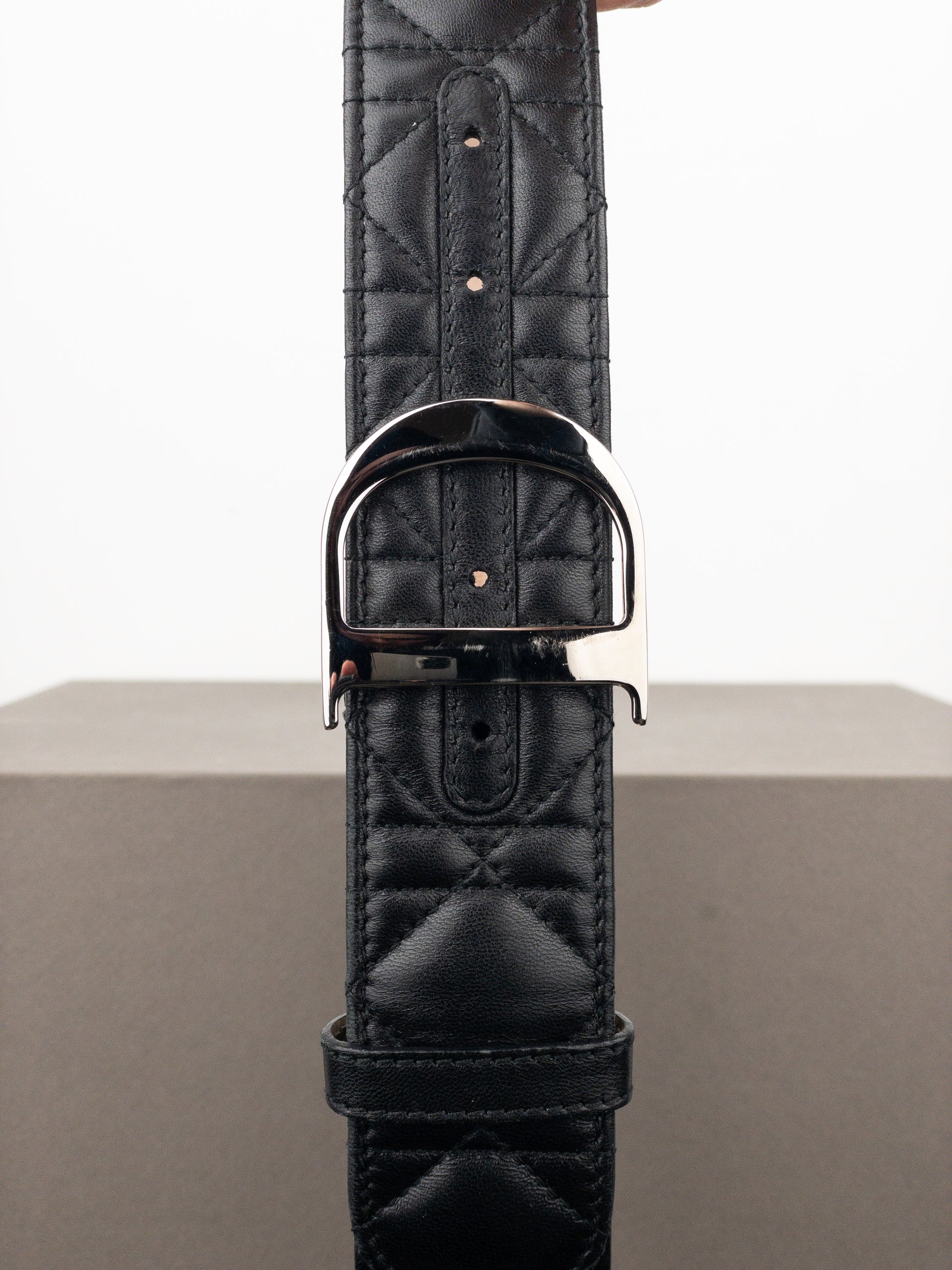Black leather belt with the signature ‘Lady Dior’ quilting and a silver-colored ‘D’ buckle.