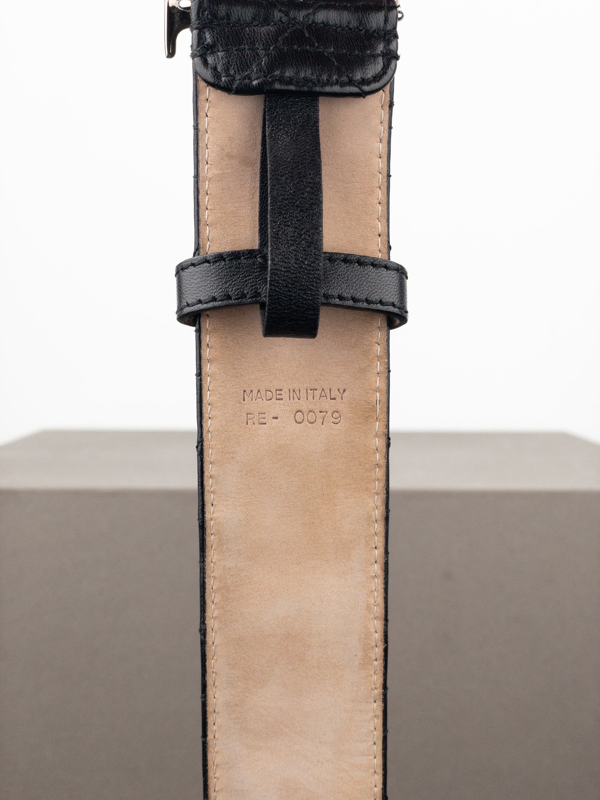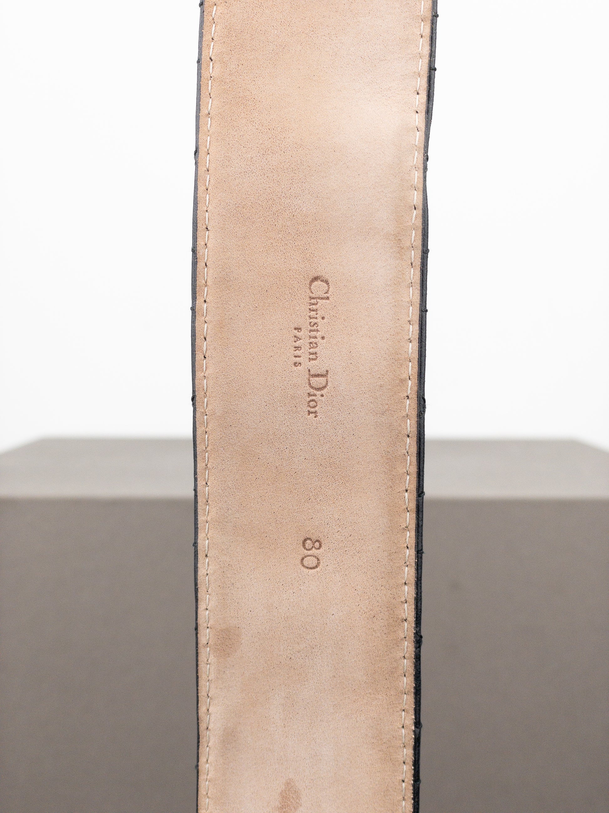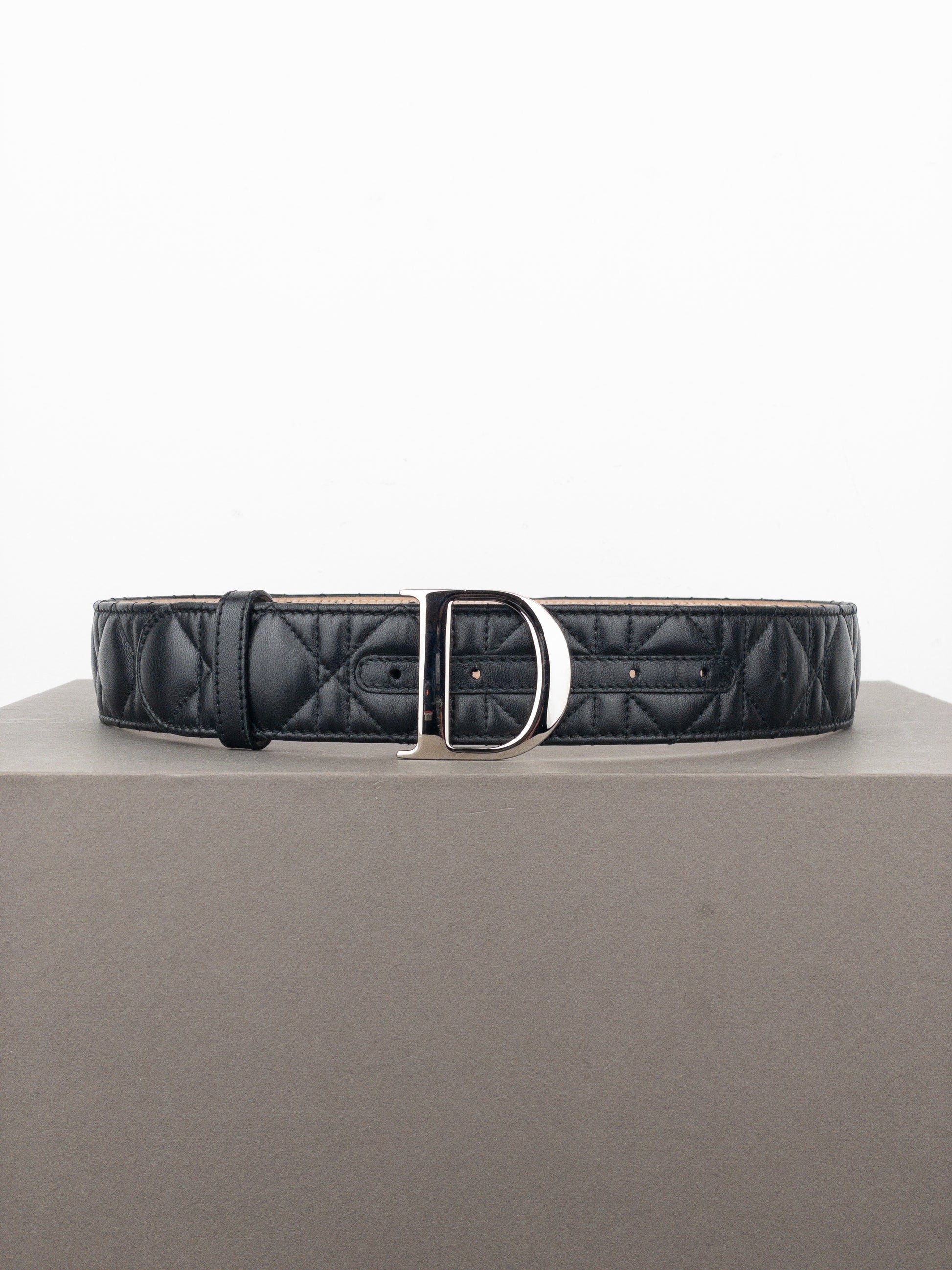Black leather belt with the signature ‘Lady Dior’ quilting and a silver-colored ‘D’ buckle.