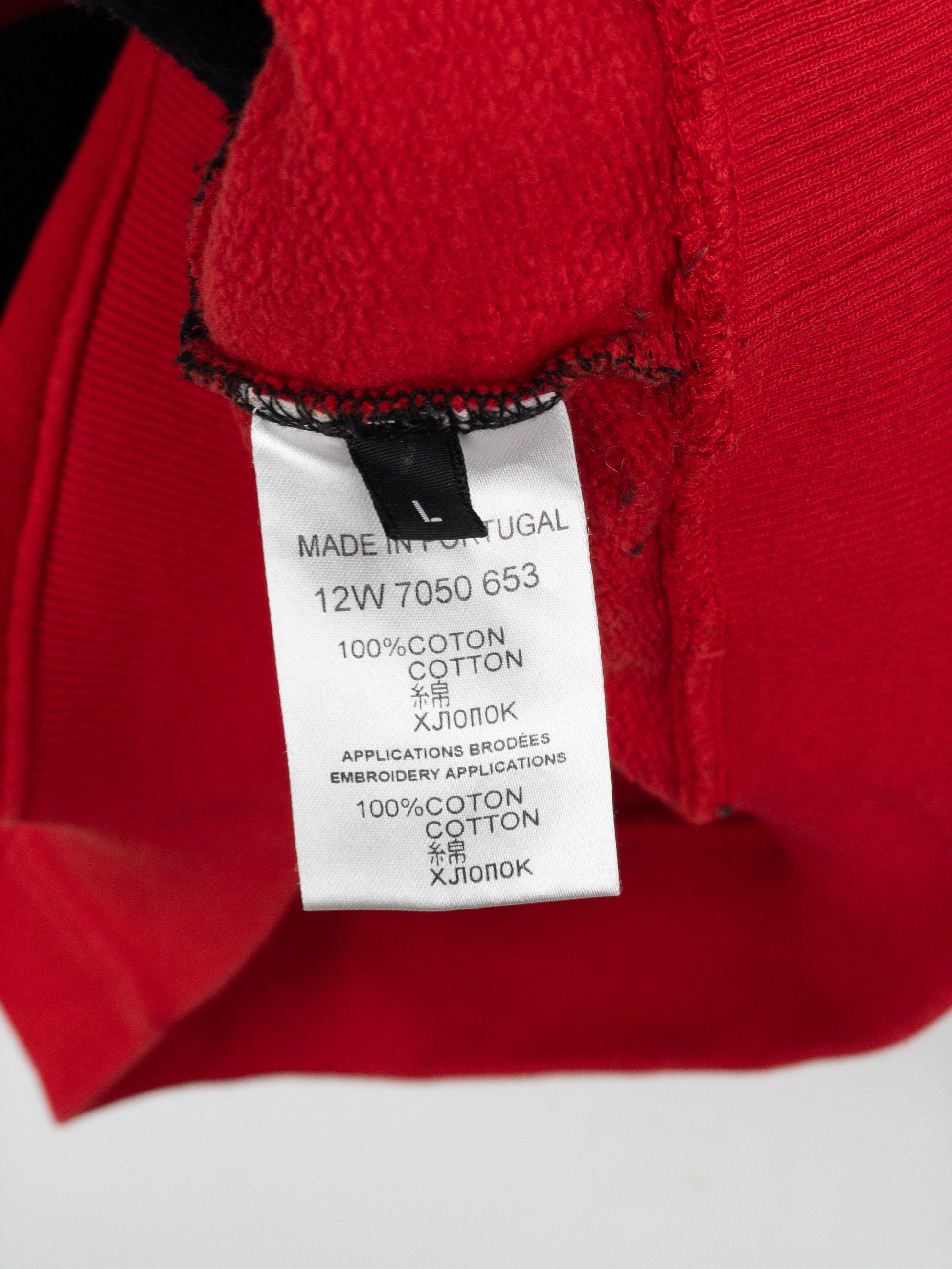 Striped crewneck sweater in black and red, featuring red stars around the neck, from the fall-winter 2012 collection.