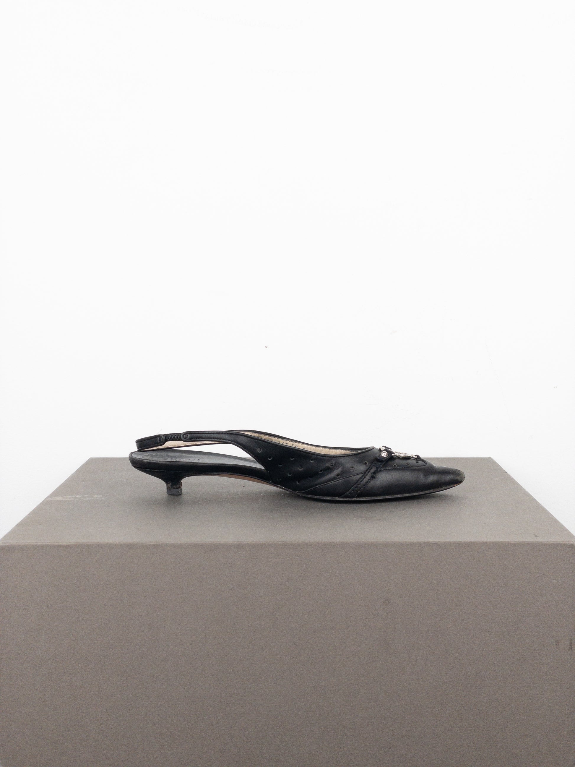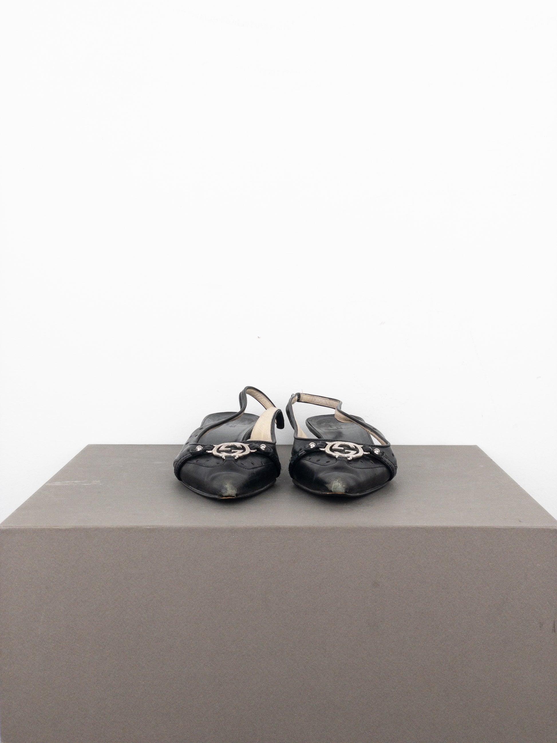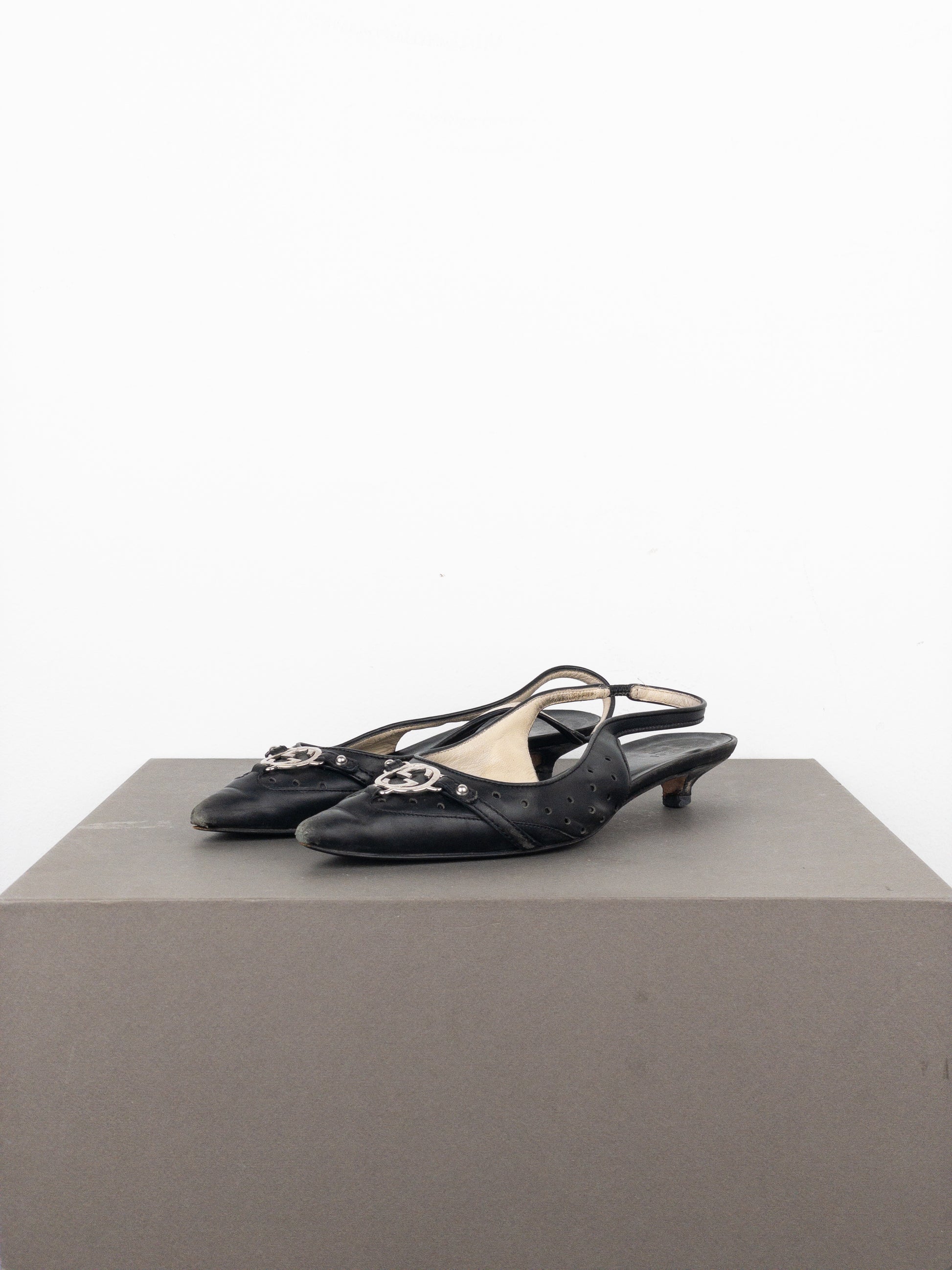Black leather kitten heels with a pointed toe and a slingback strap, featuring a silver-colored metal ‘GG’ logo on the toebox, from the 2000s.