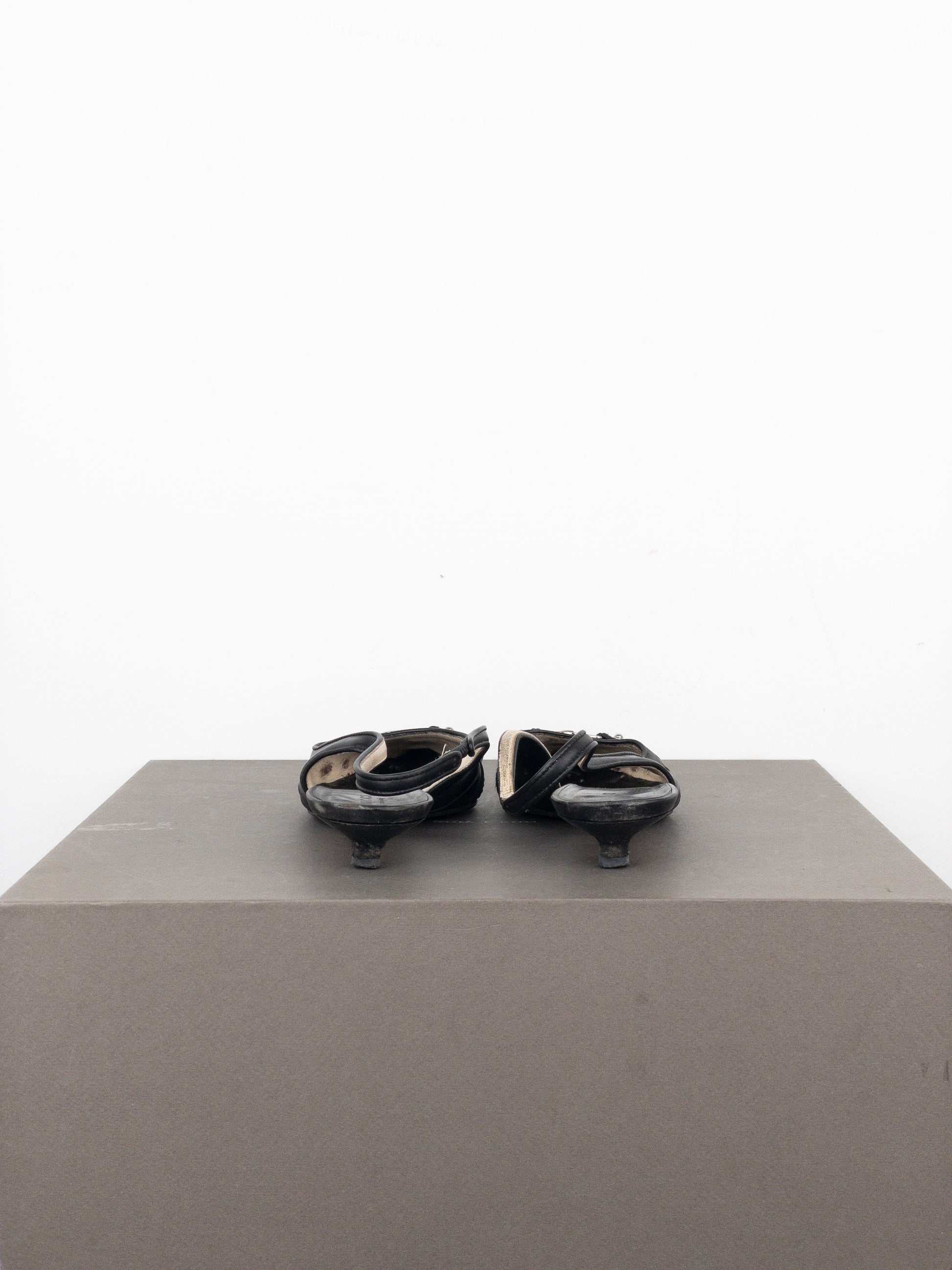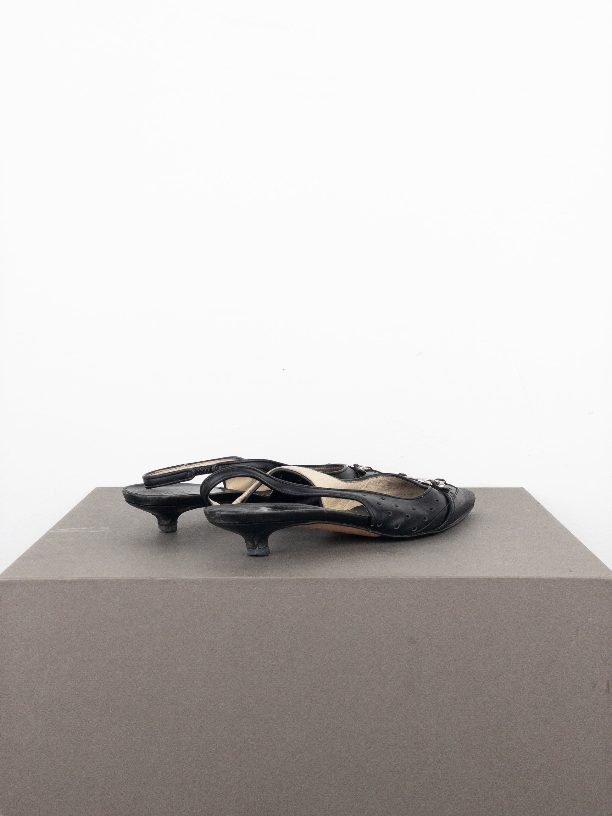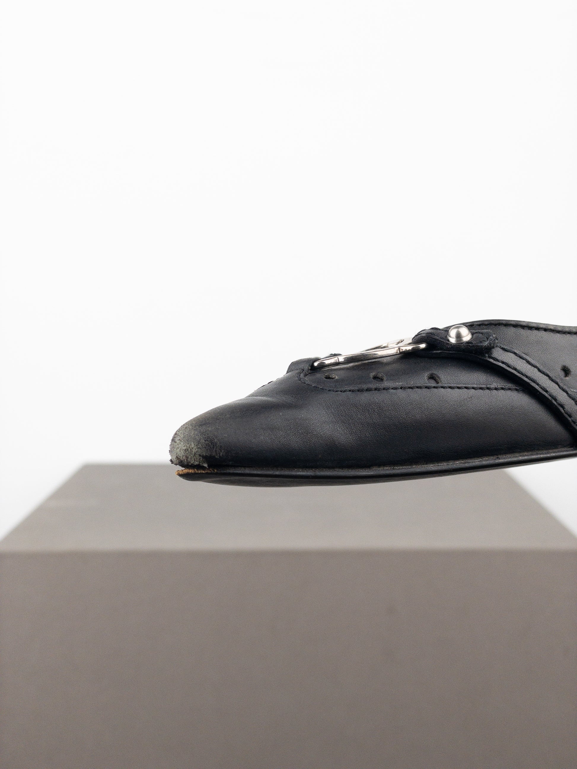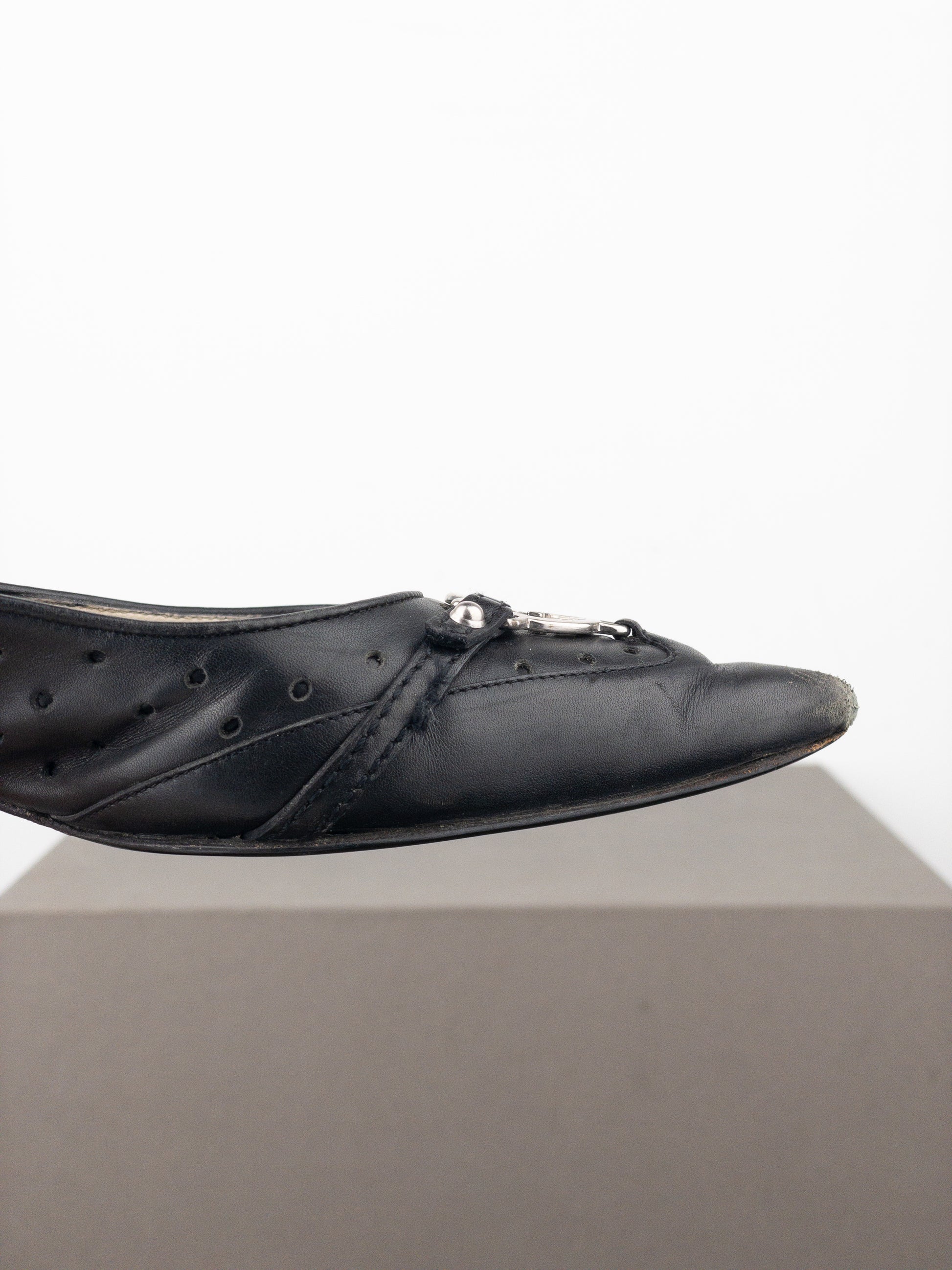 Black leather kitten heels with a pointed toe and a slingback strap, featuring a silver-colored metal ‘GG’ logo on the toebox, from the 2000s.