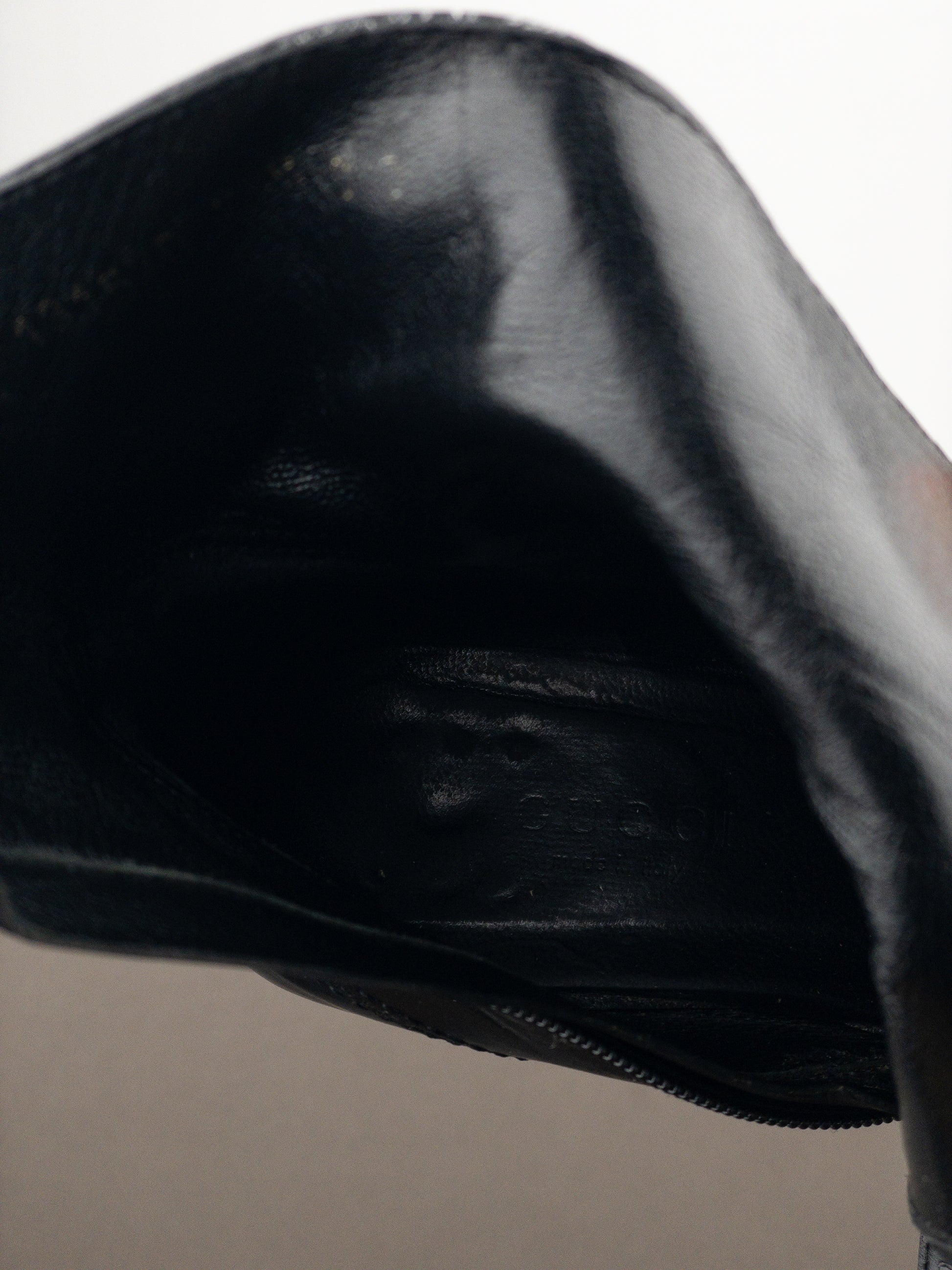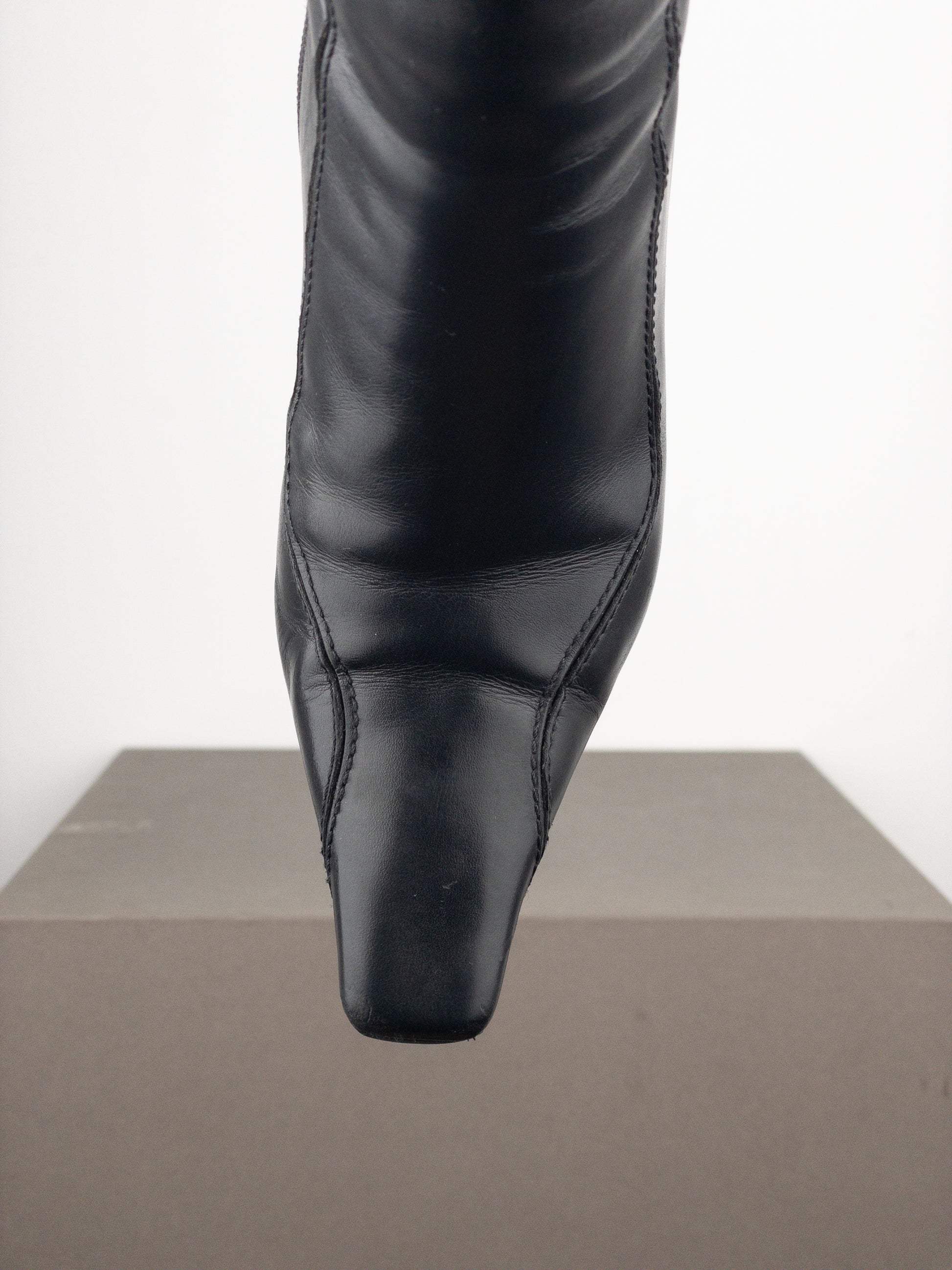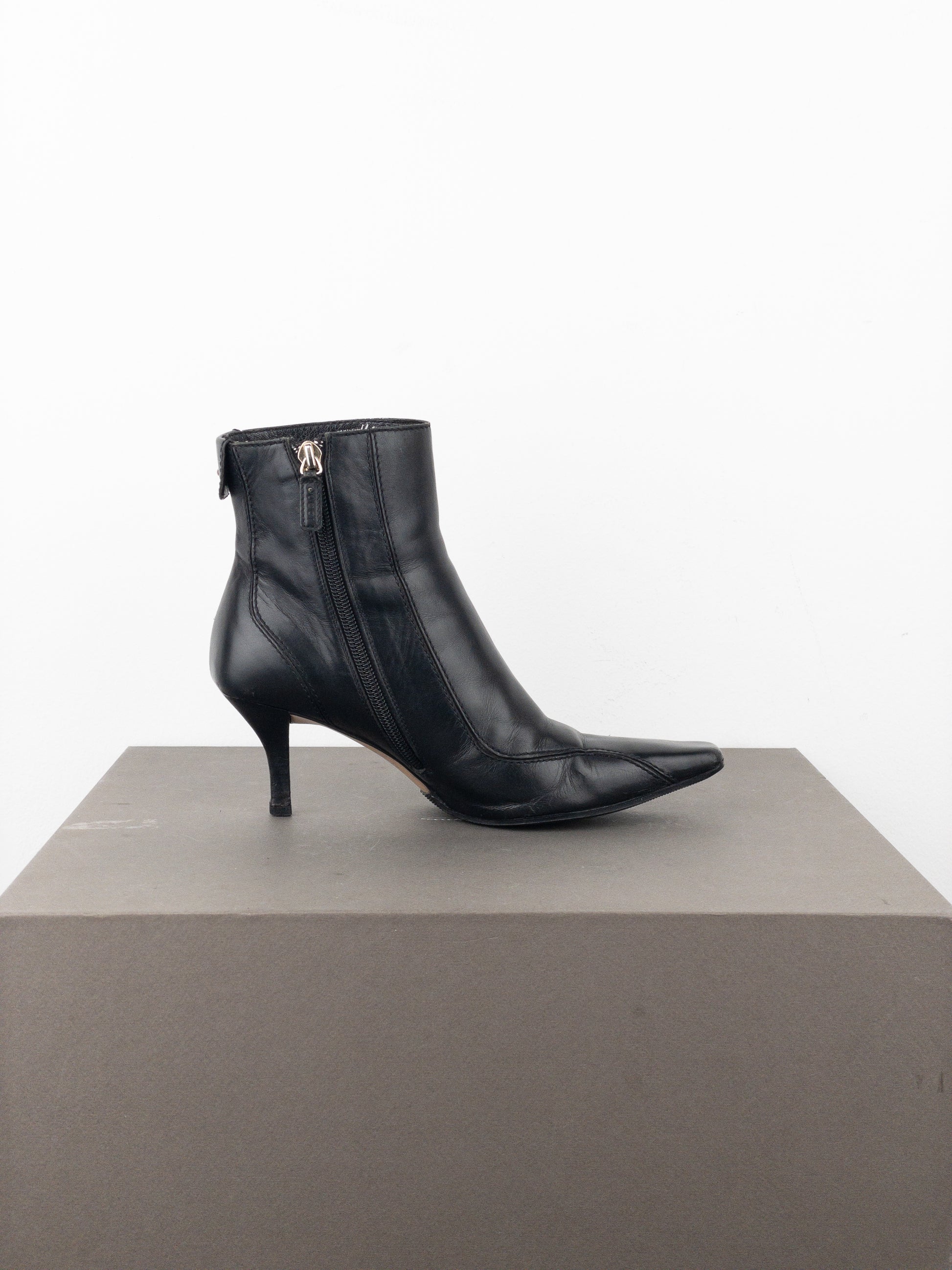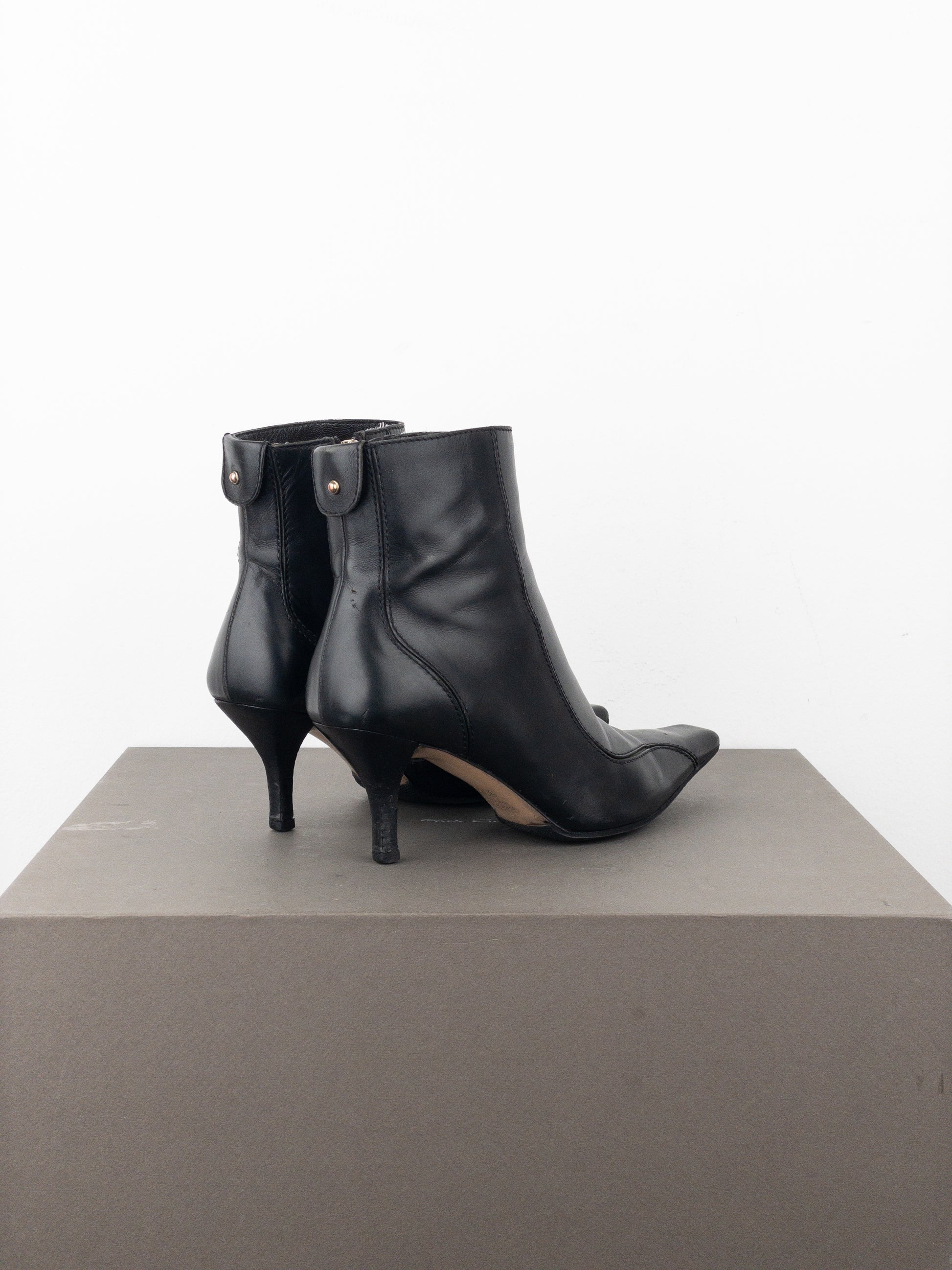 Black leather ankle boots with a slight square toe and kitten heel, featuring decorative panelling, a tab with a gold-colored rivet in the back, and a zipper on the inside, from the 2000s.