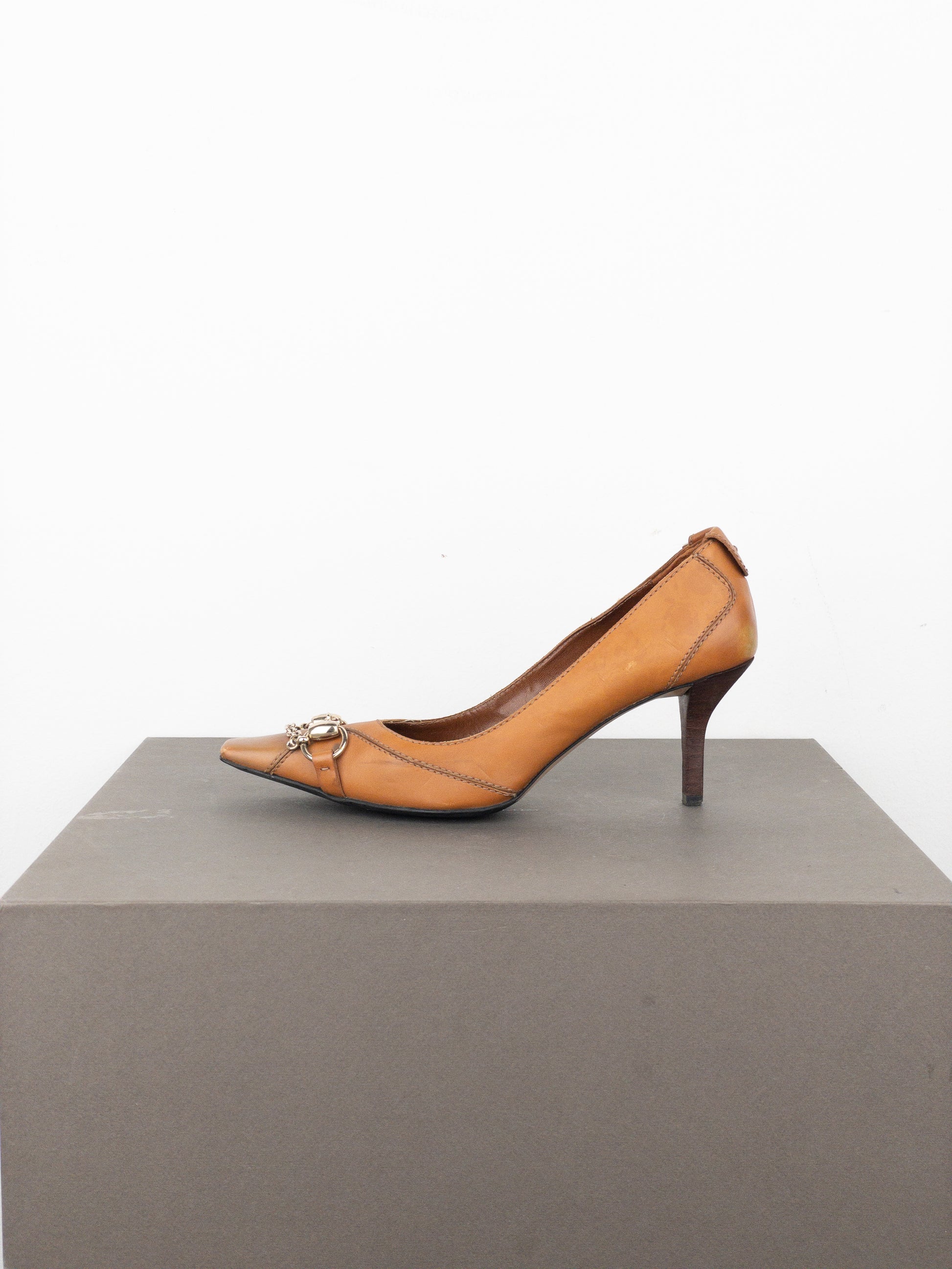 Light brown/orange leather pump heels with a matt finish, featuring a slight square toe and the signature silver-colored horsebit across the toebox with a chain at the bottom, from the autumn-winter 2003 collection.