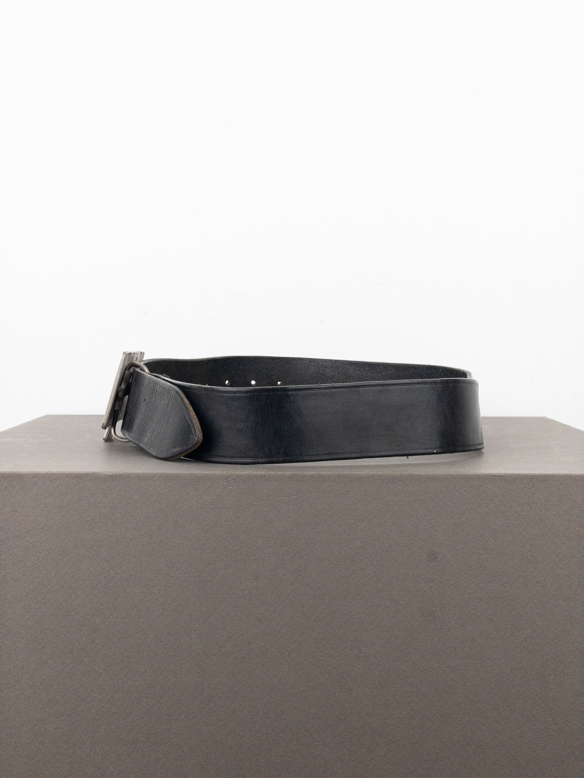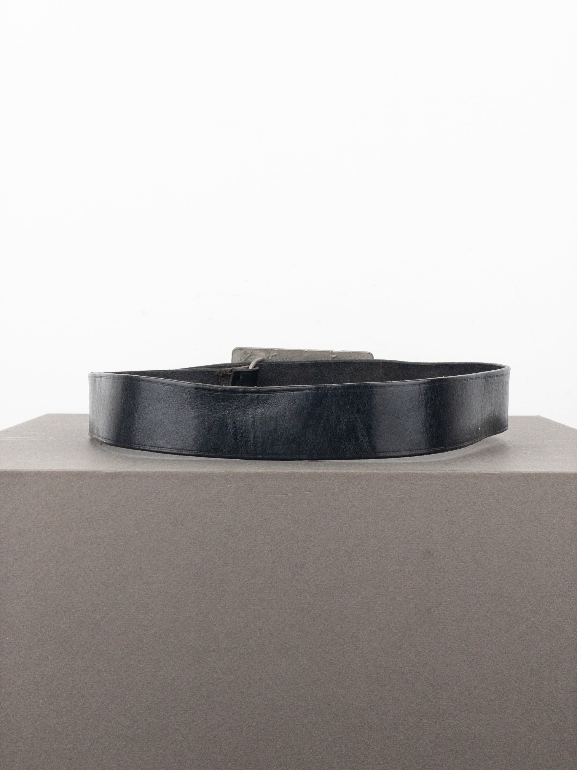 Black leather belt with an oversized logo buckle in a matt silver-colred finish, from the 1990s.