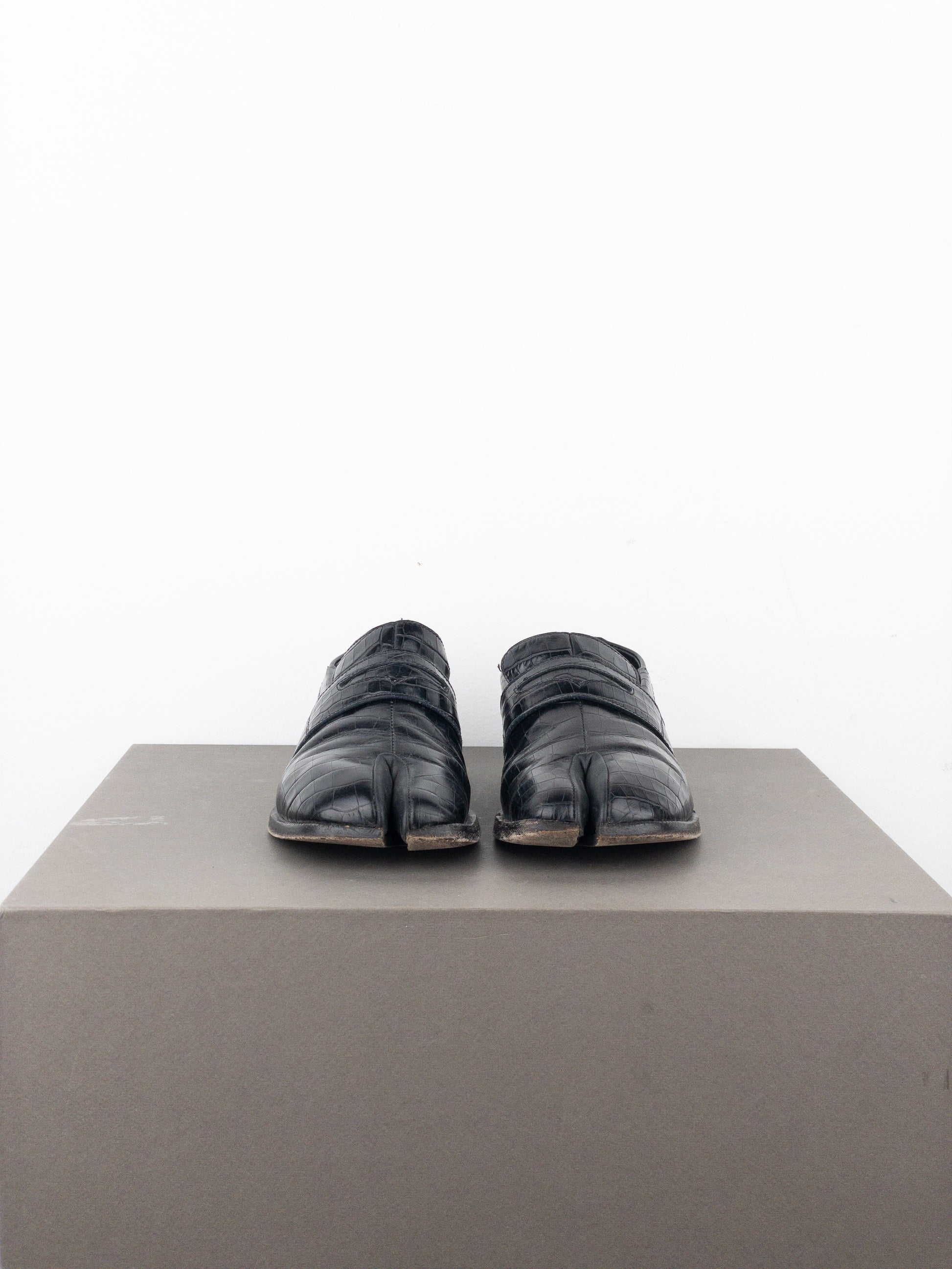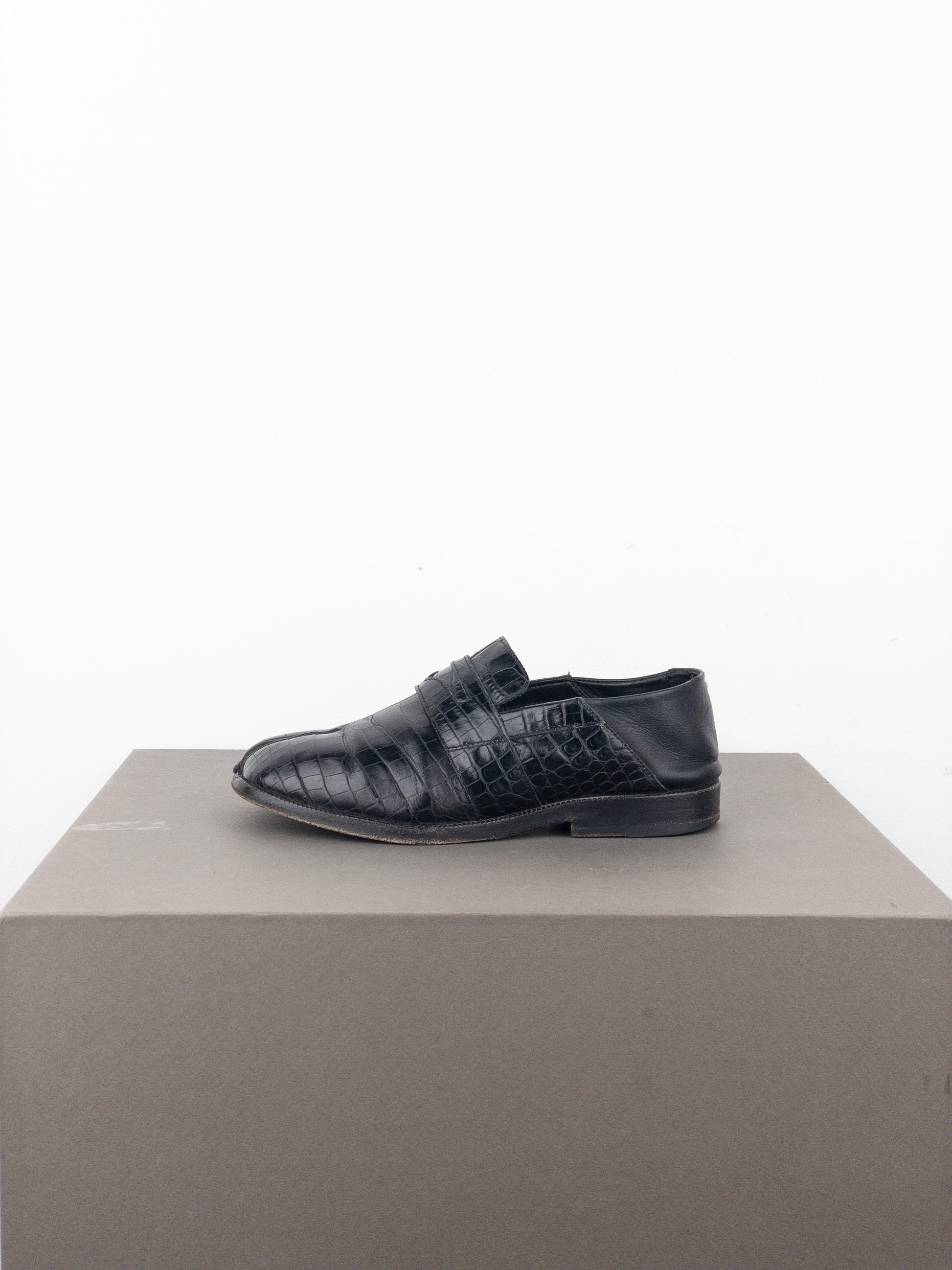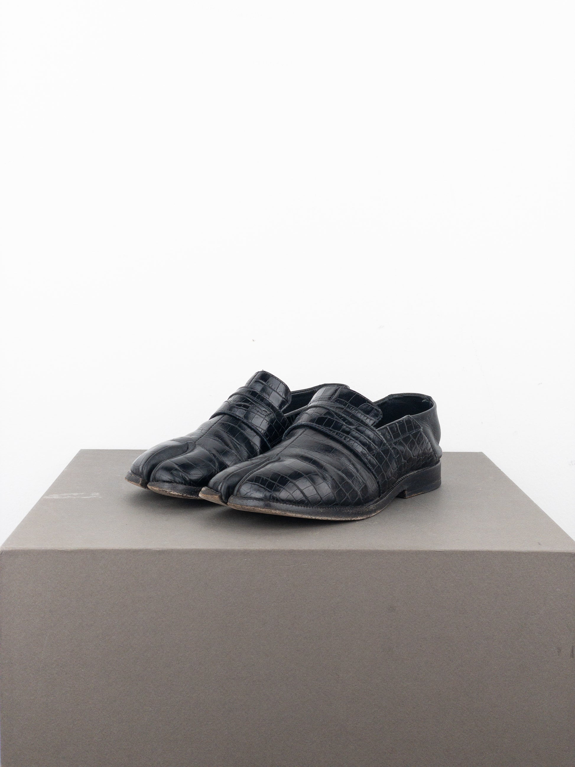 Black leather penny loafers with imprinted crocodile texture, featuring a flexible backpanel for wearing as mules and the signature “Tabi” split toe.