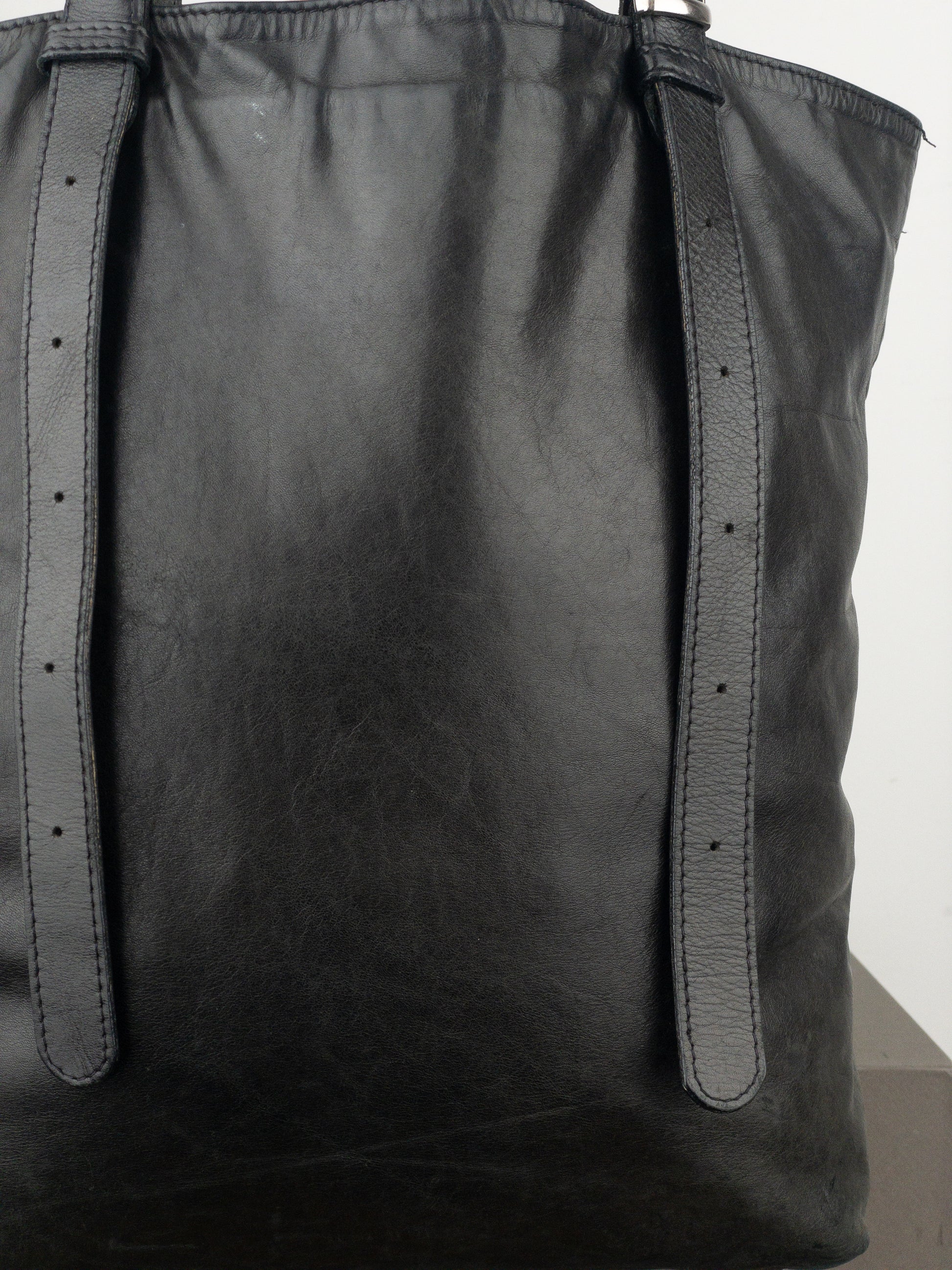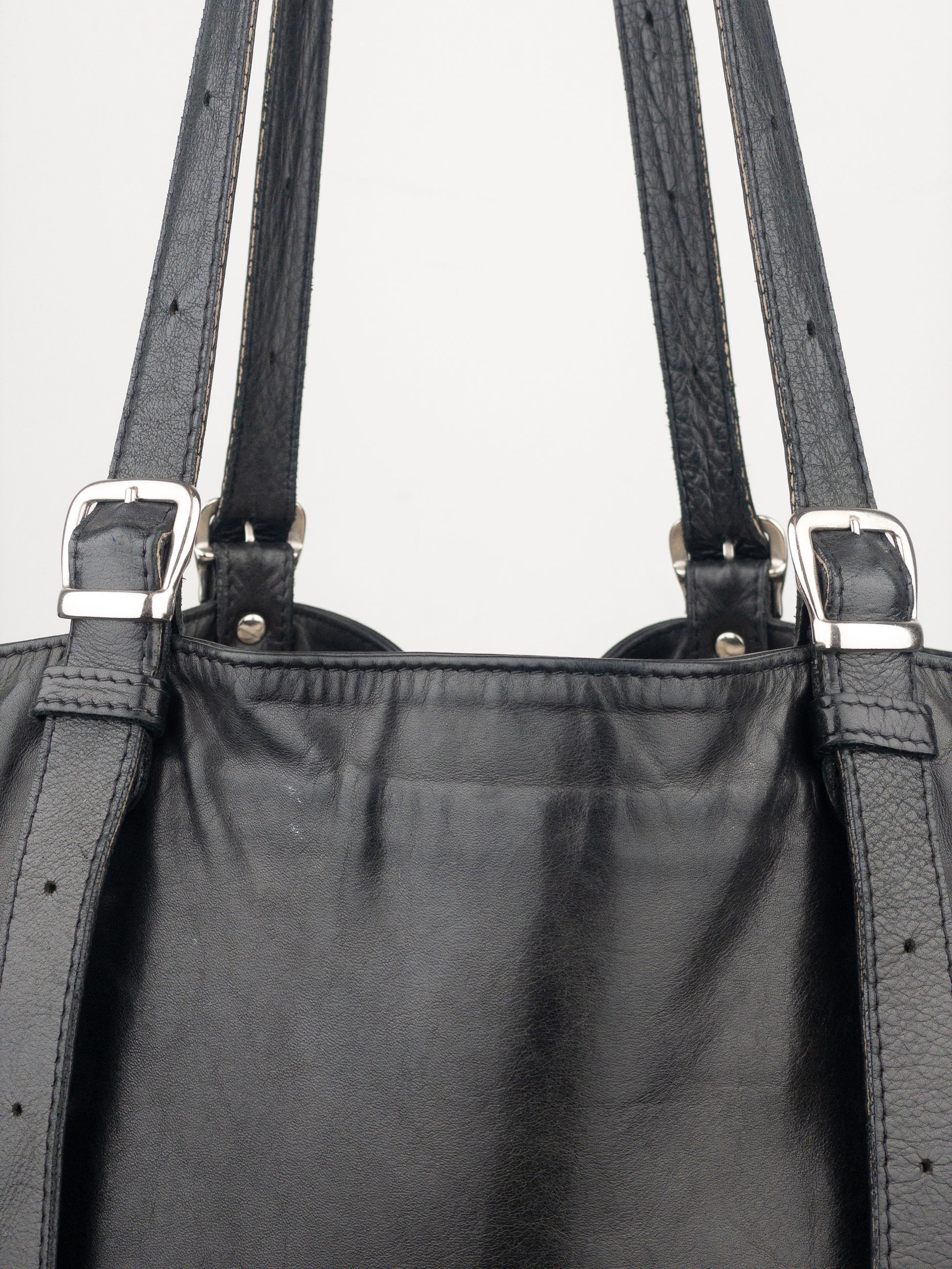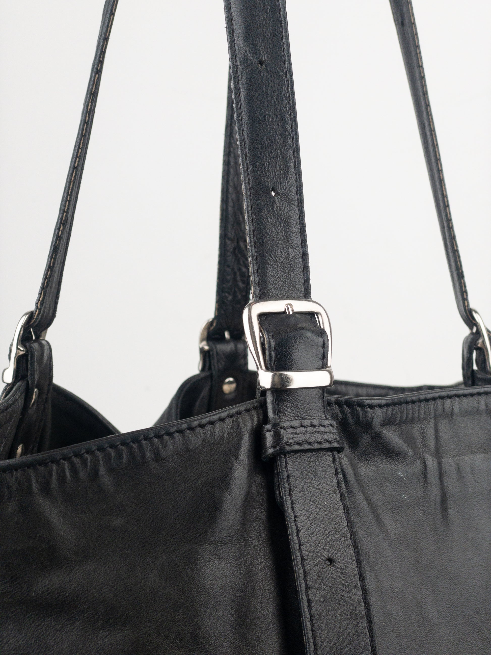 Large black tote bag in beautifully aged leather, featuring adjustable buckle-straps and silver-colored hardware.