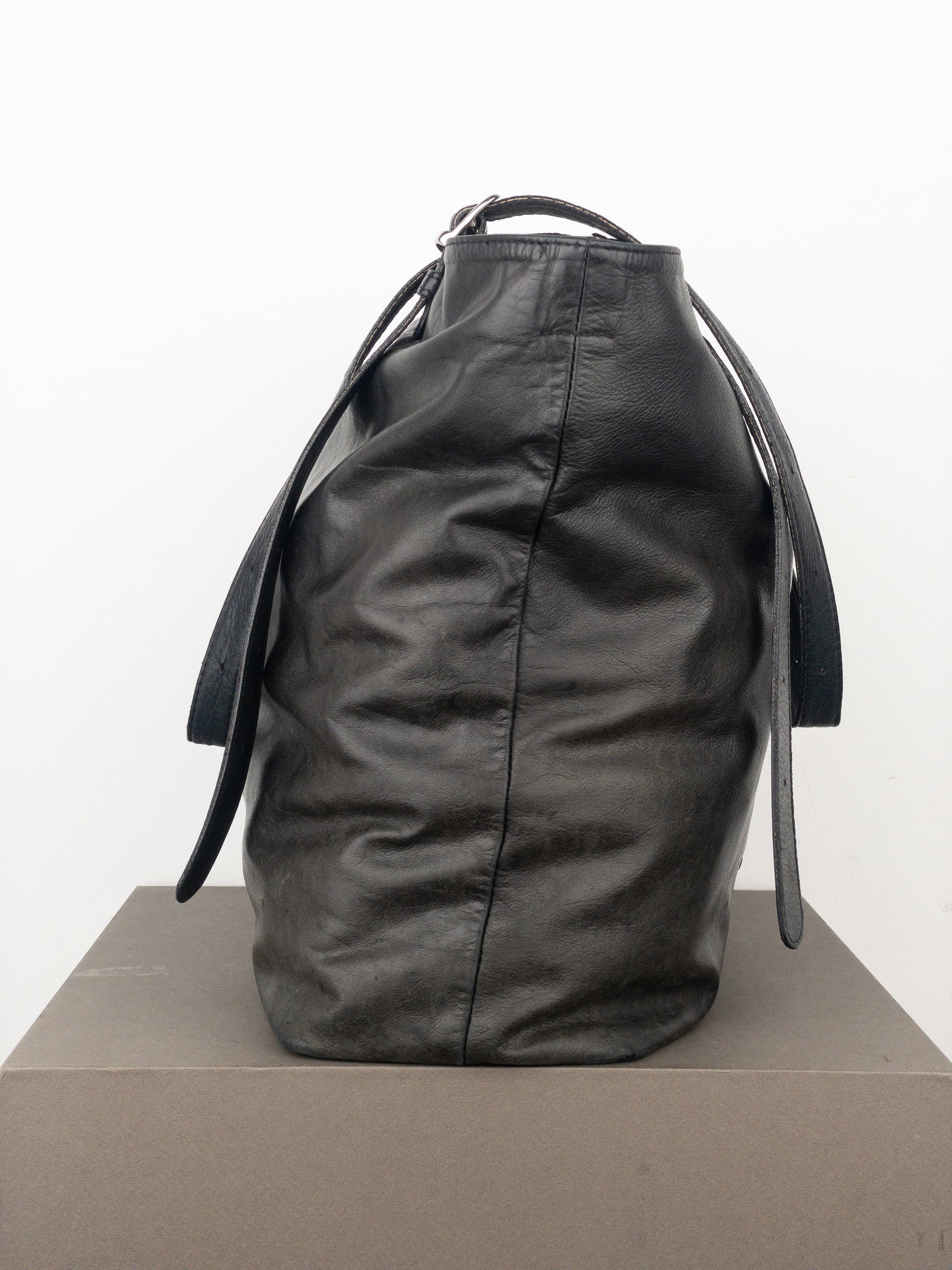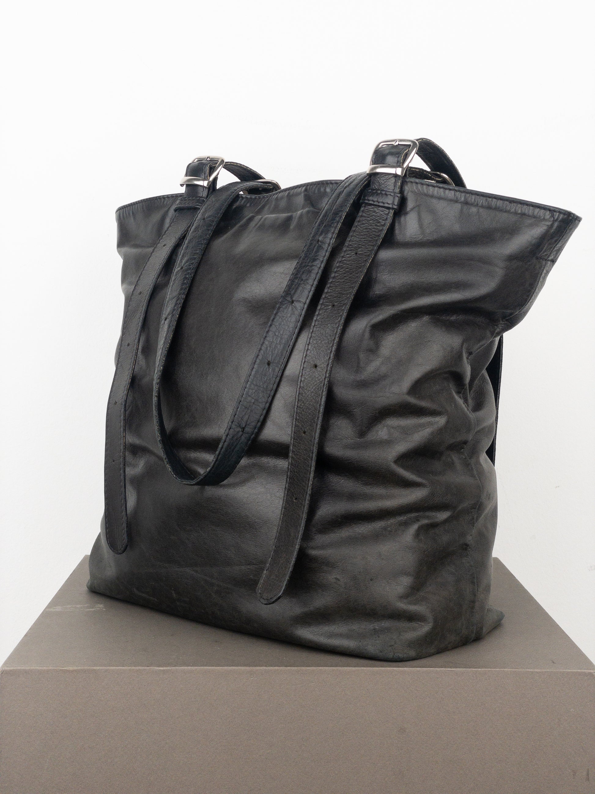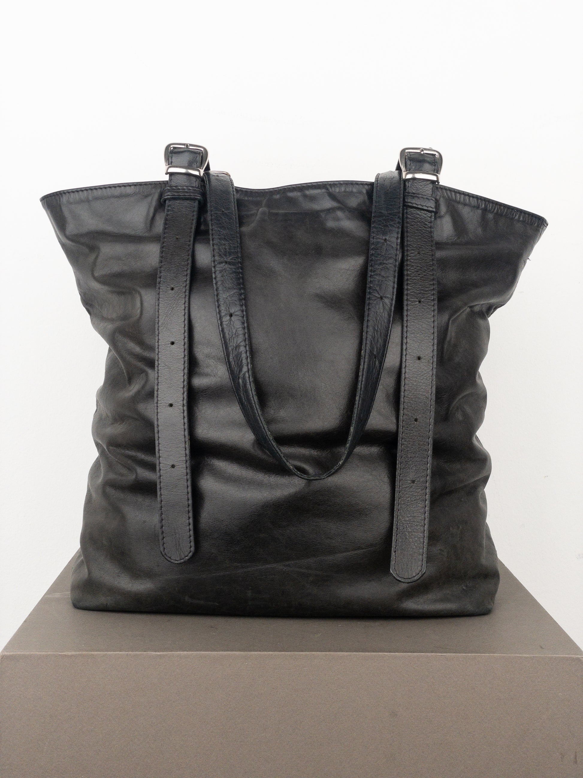 Large black tote bag in beautifully aged leather, featuring adjustable buckle-straps and silver-colored hardware.