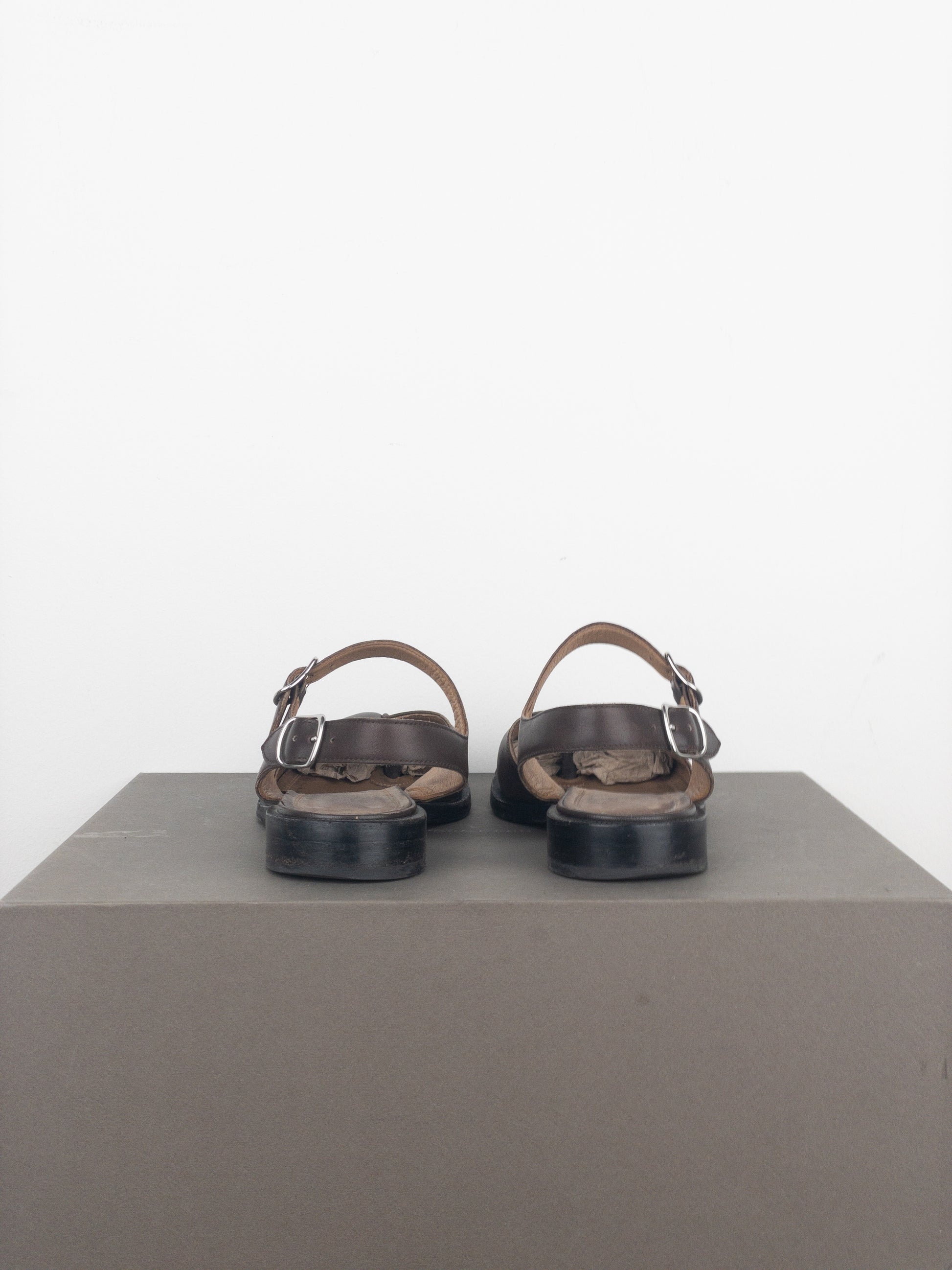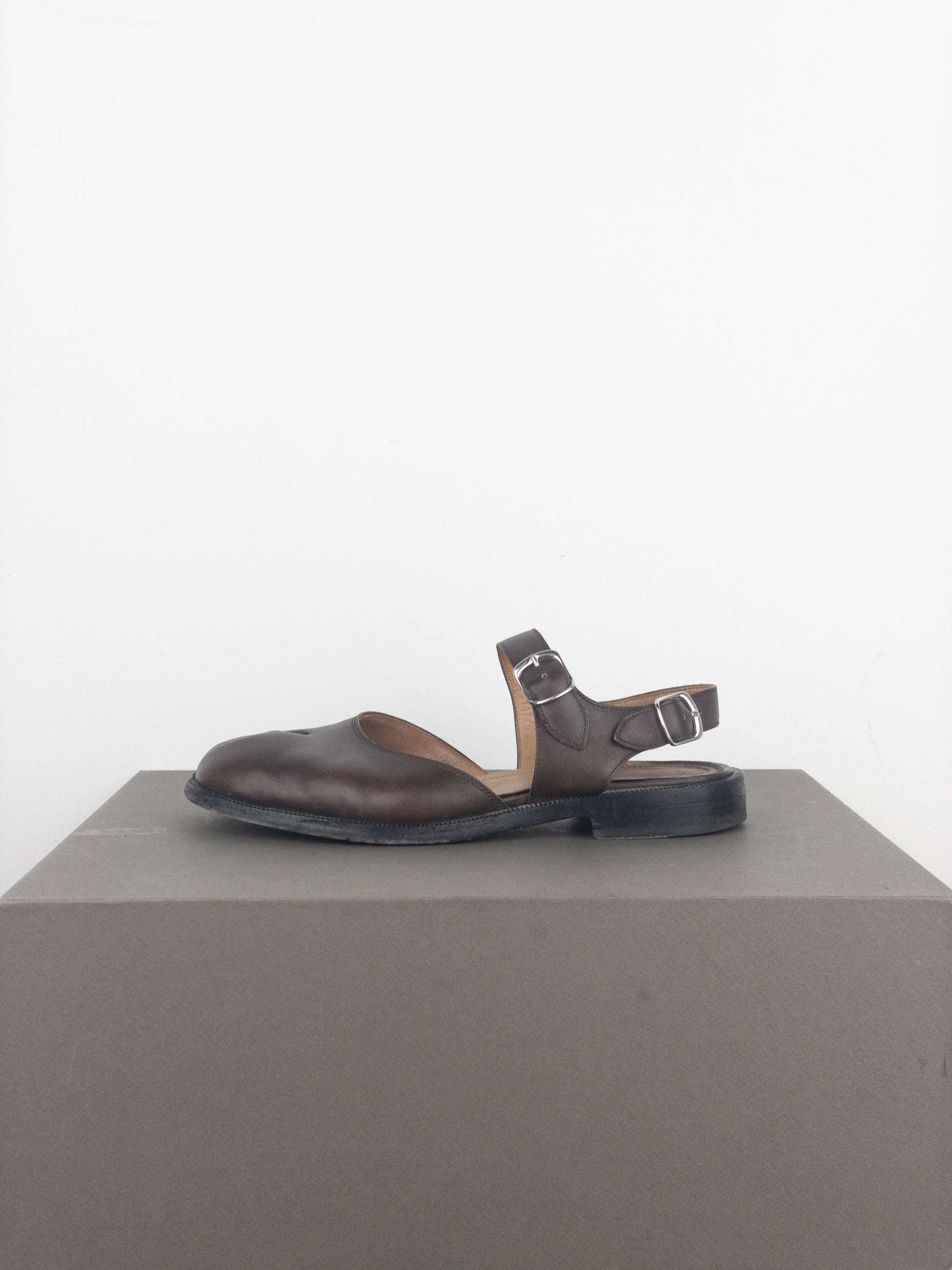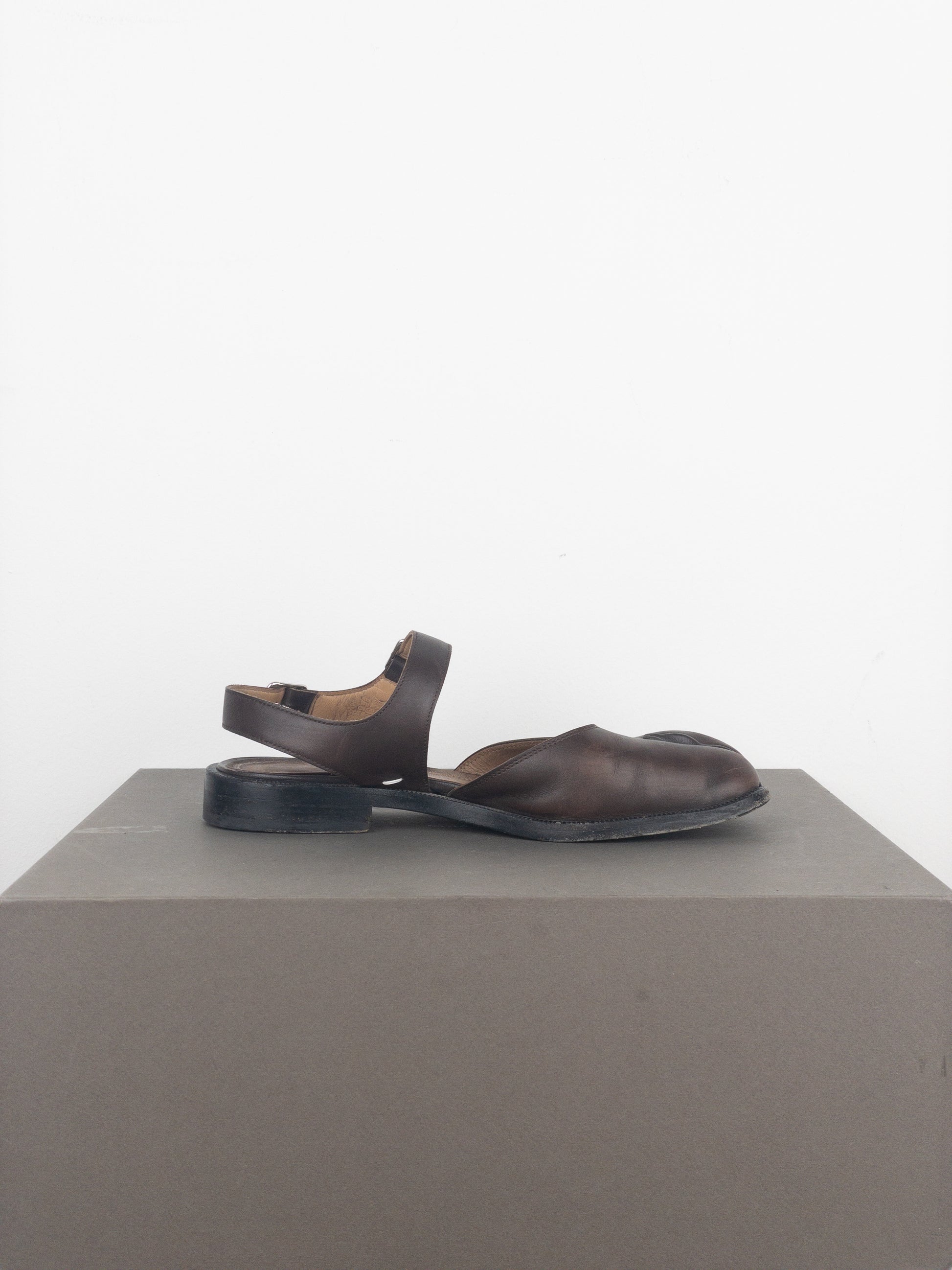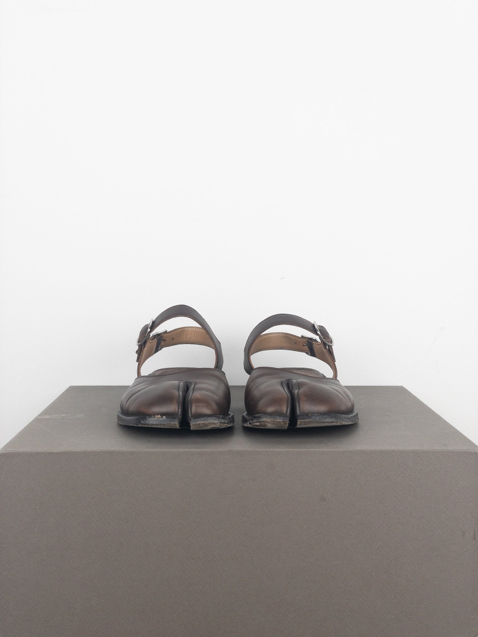 Brown leather sandals with adjustable straps around the ankle and the signature ‘Tabi’ split toe.