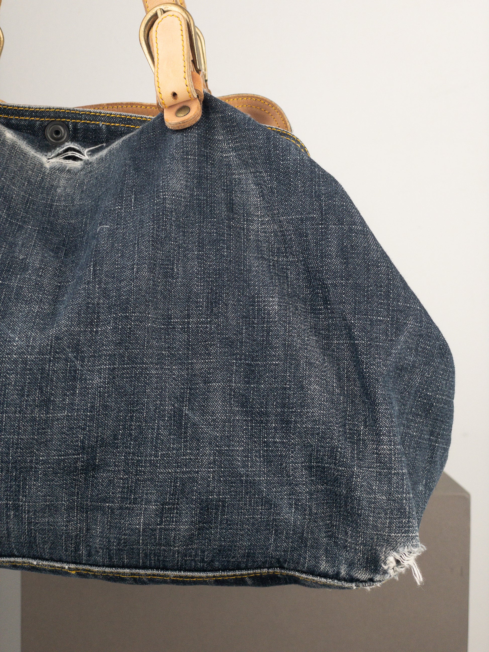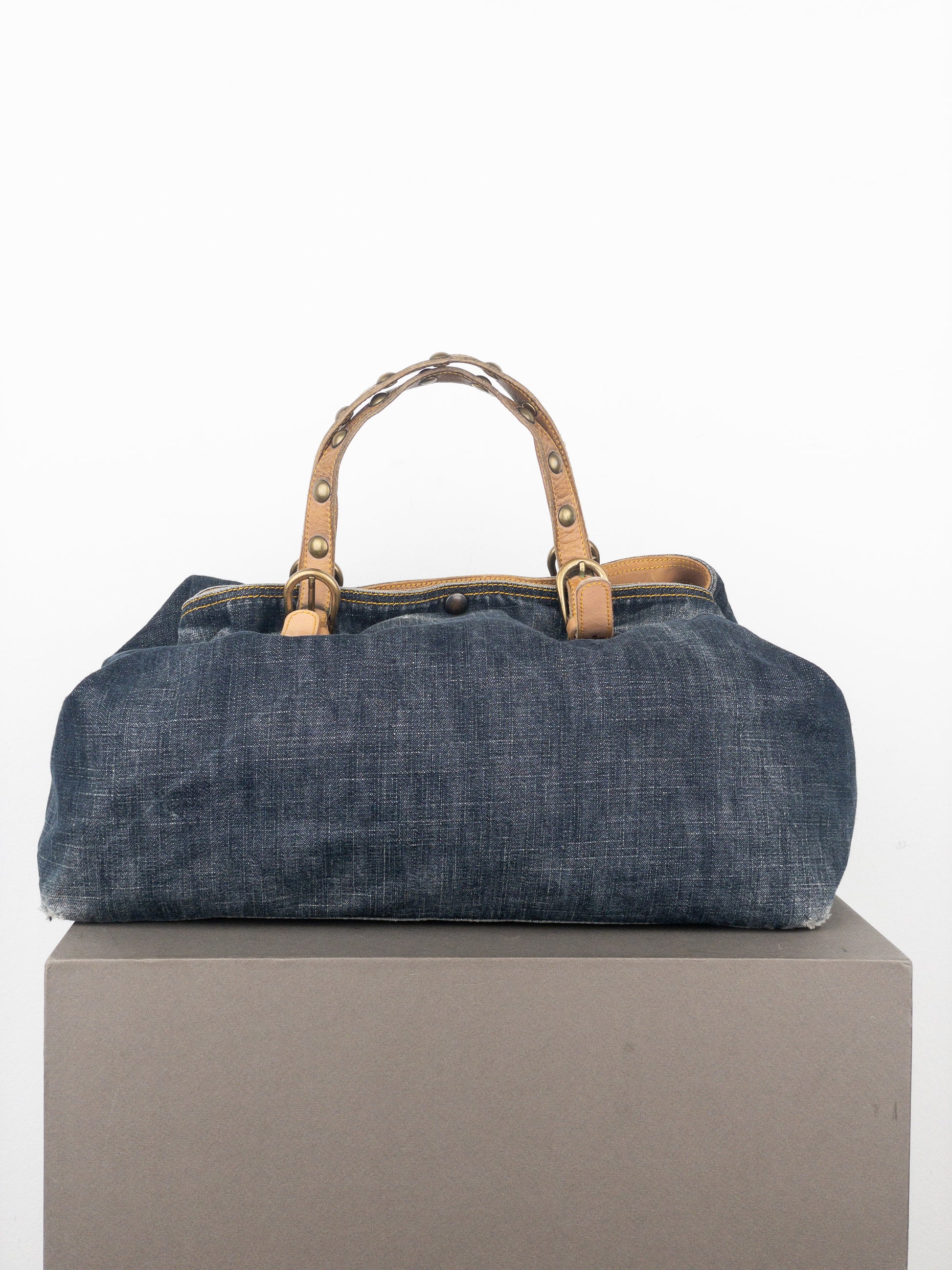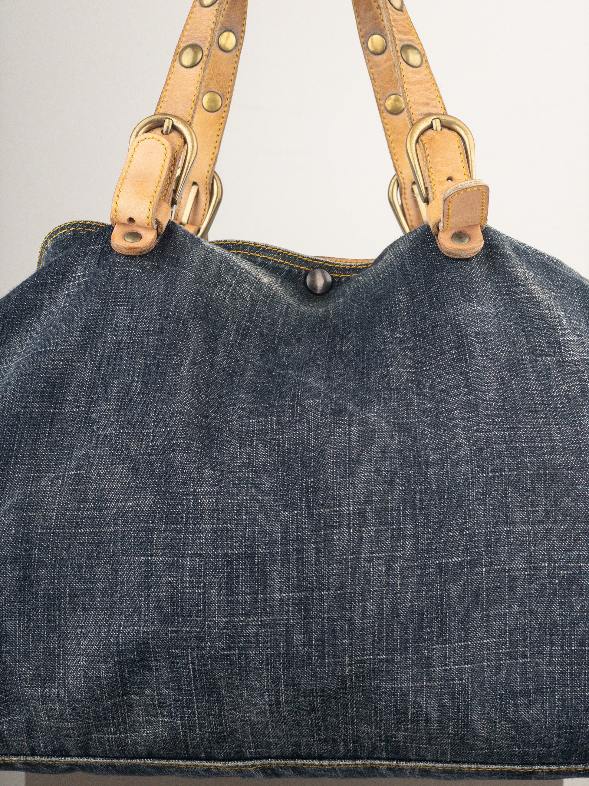 Large shopper tote handbag in darkwash denim, featuring tan leather straps with bronze-colored buckles and rivets, from the 2000s.