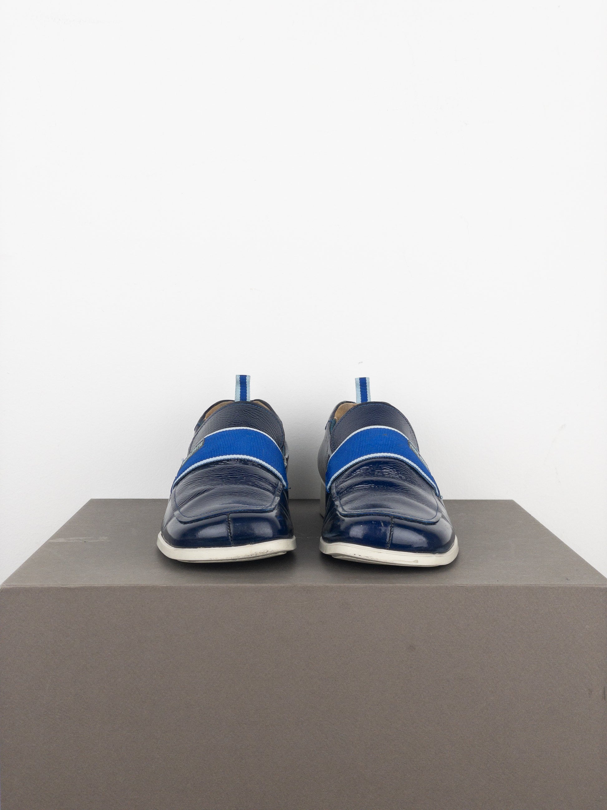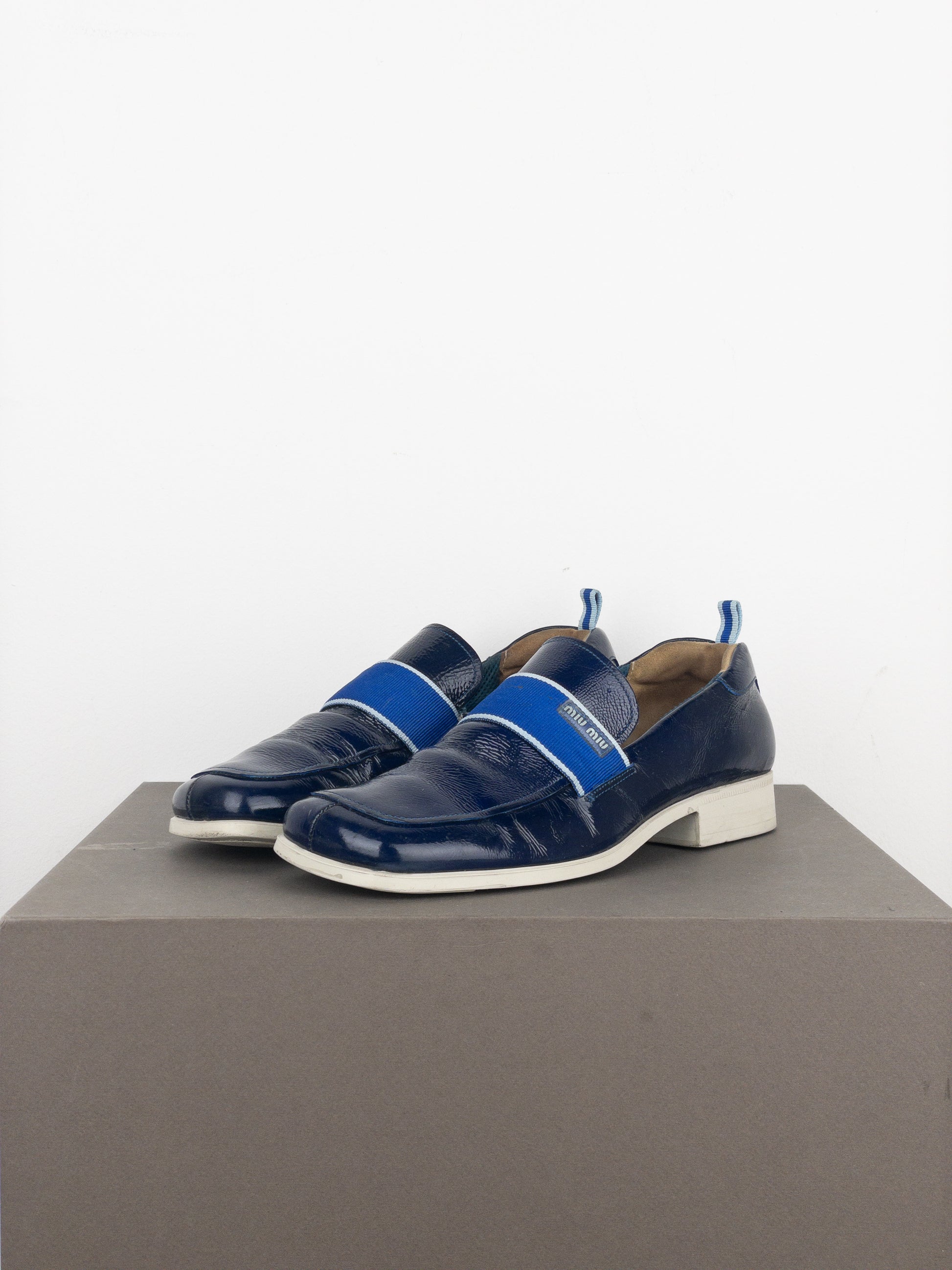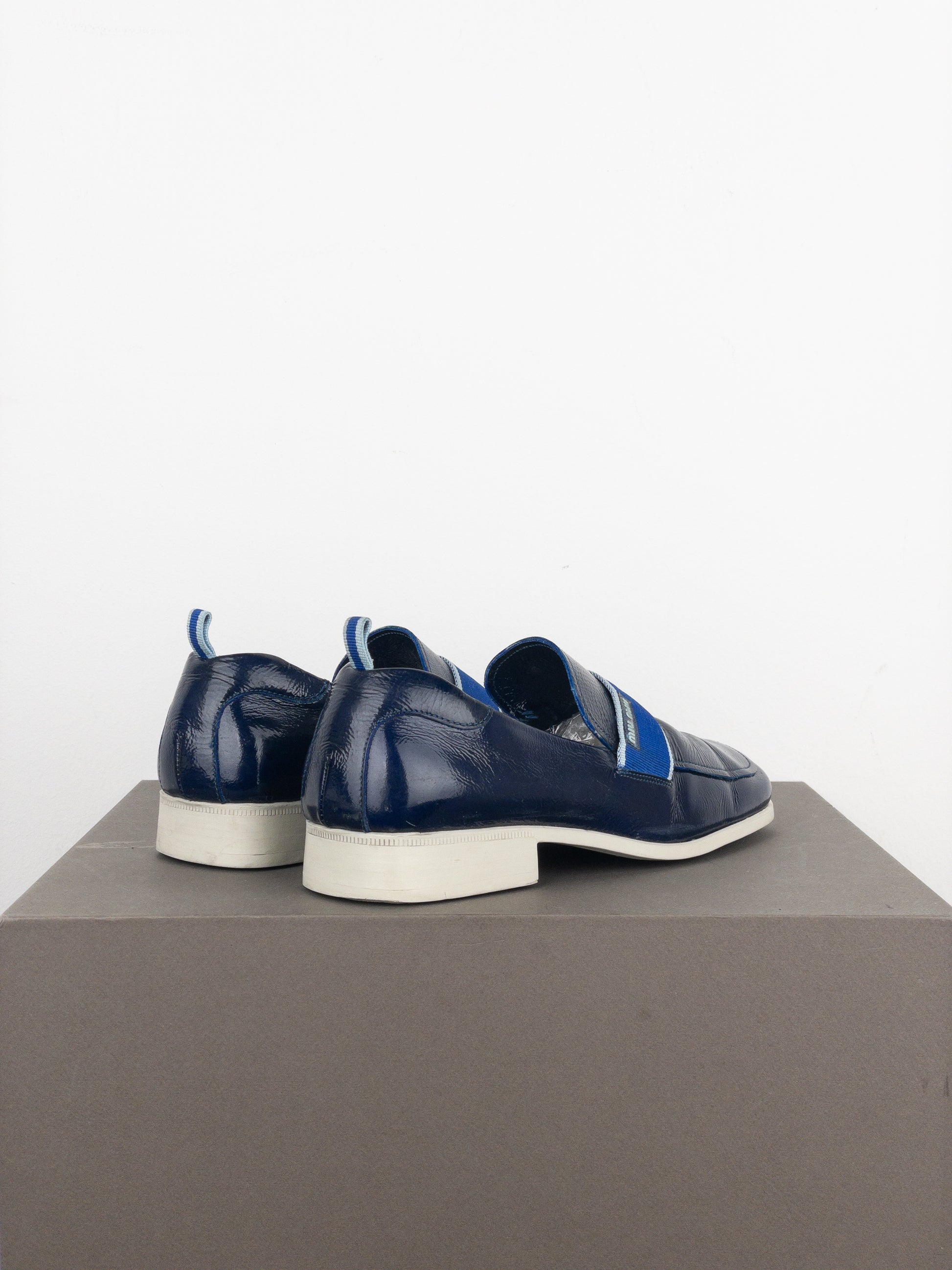 Square toe loafers in blue patent leather, featuring a white sole and a logo-branded strap across the forefoot, from the 2000s.