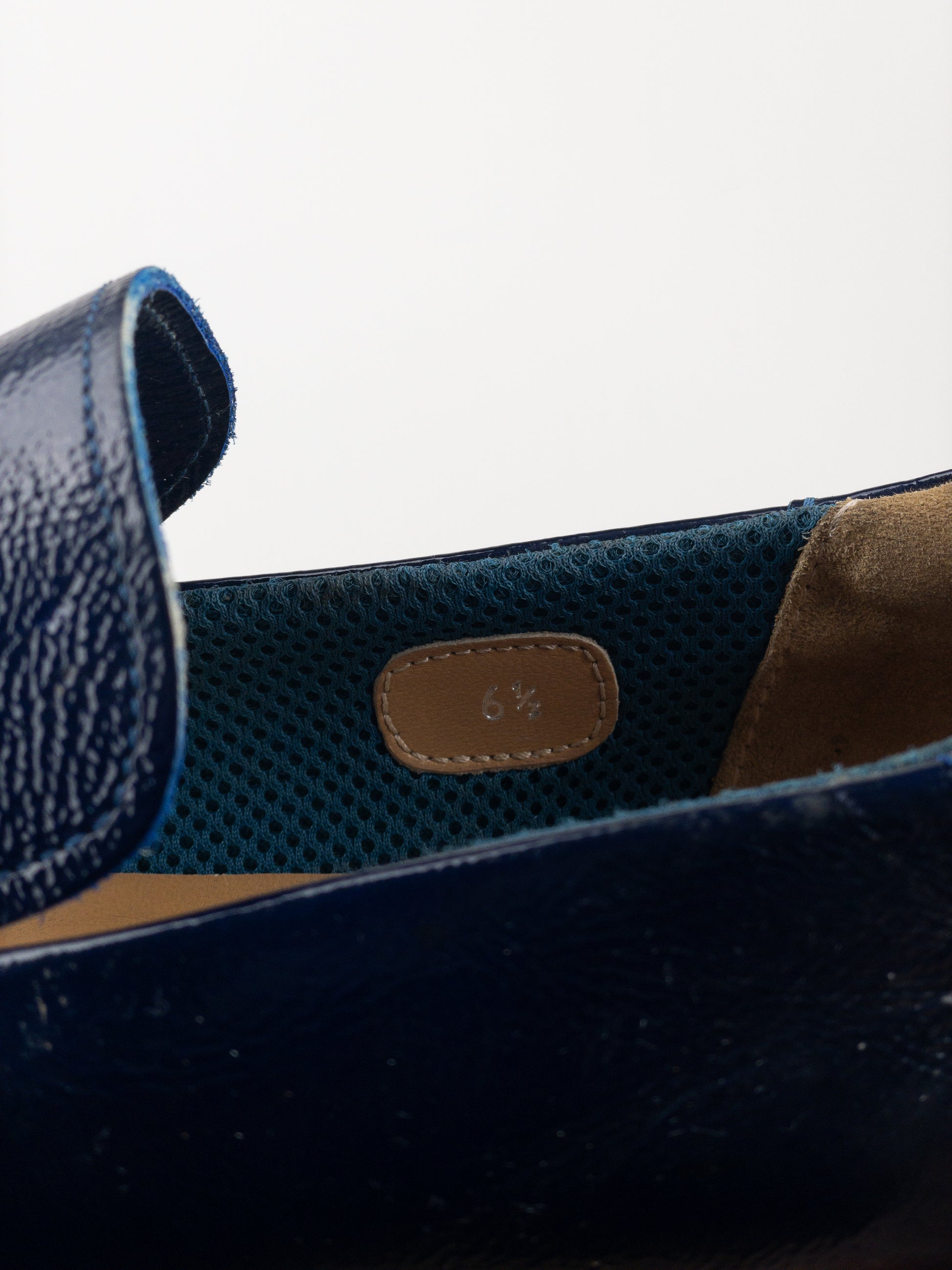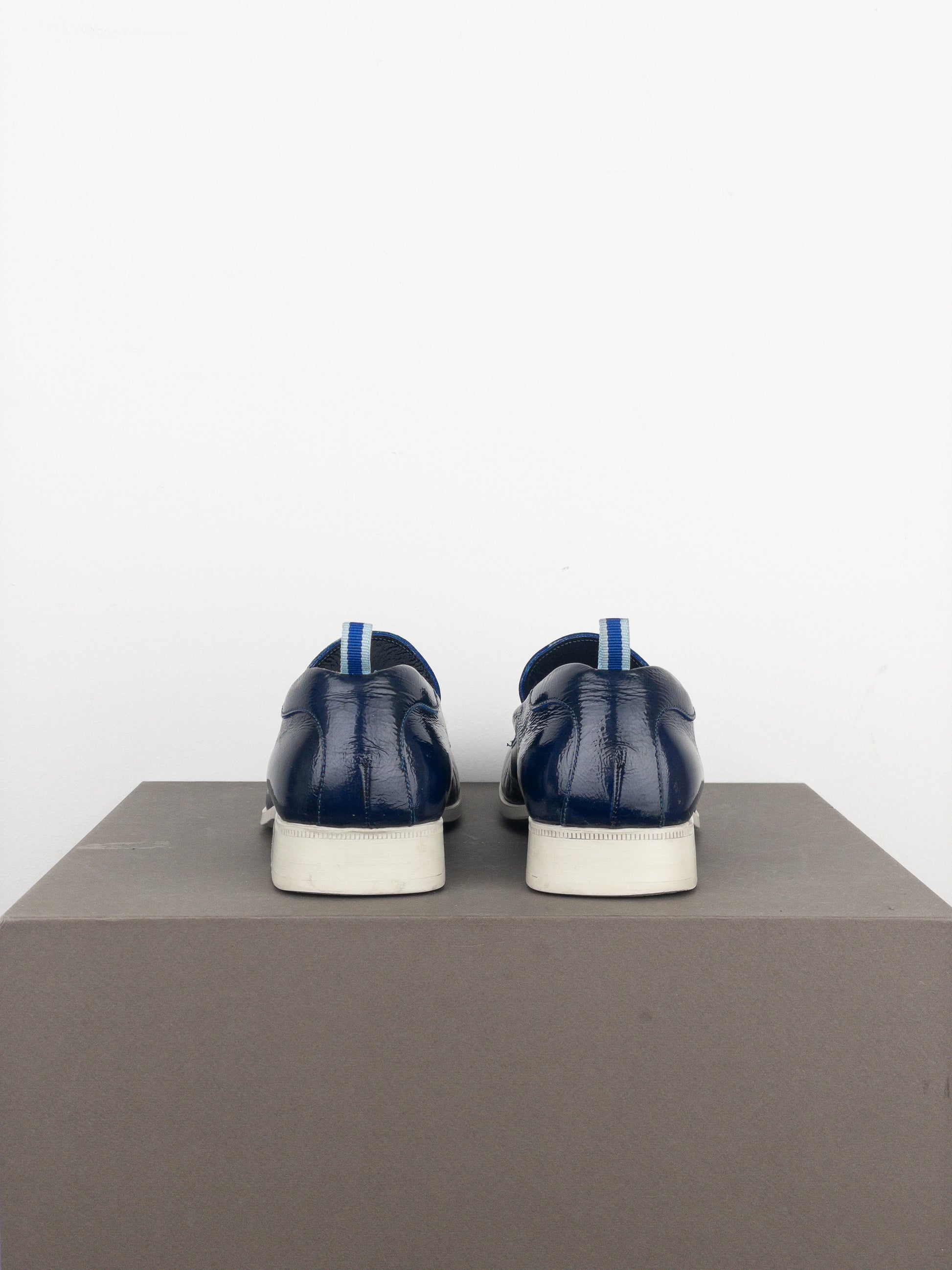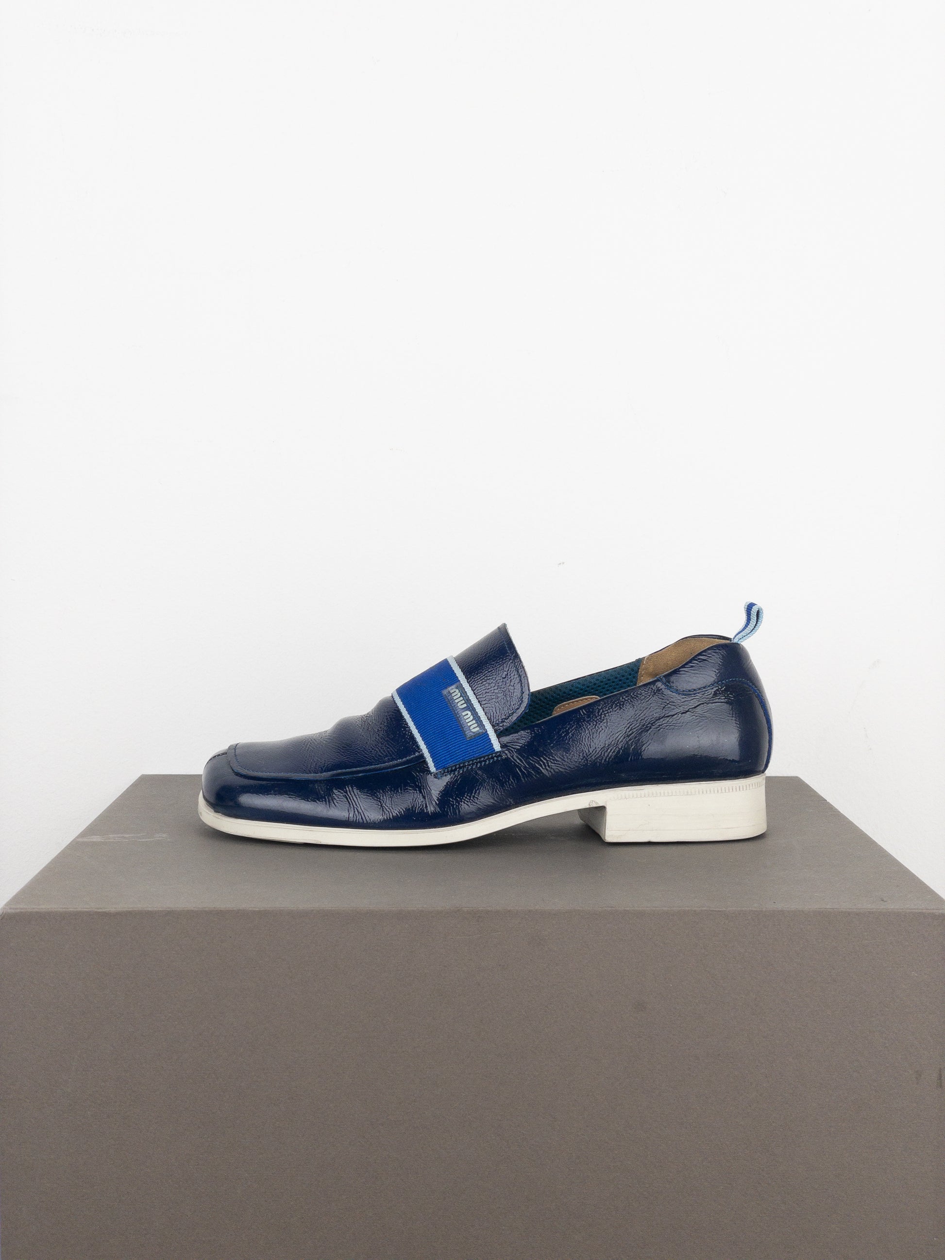 Square toe loafers in blue patent leather, featuring a white sole and a logo-branded strap across the forefoot, from the 2000s.