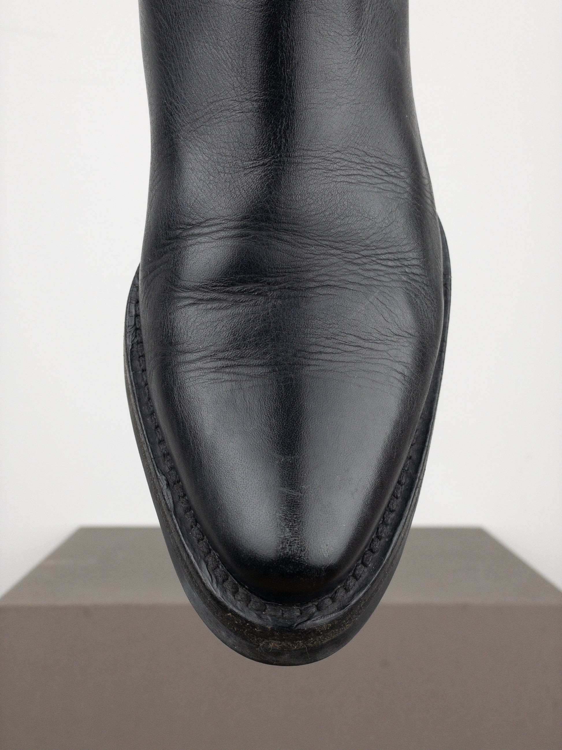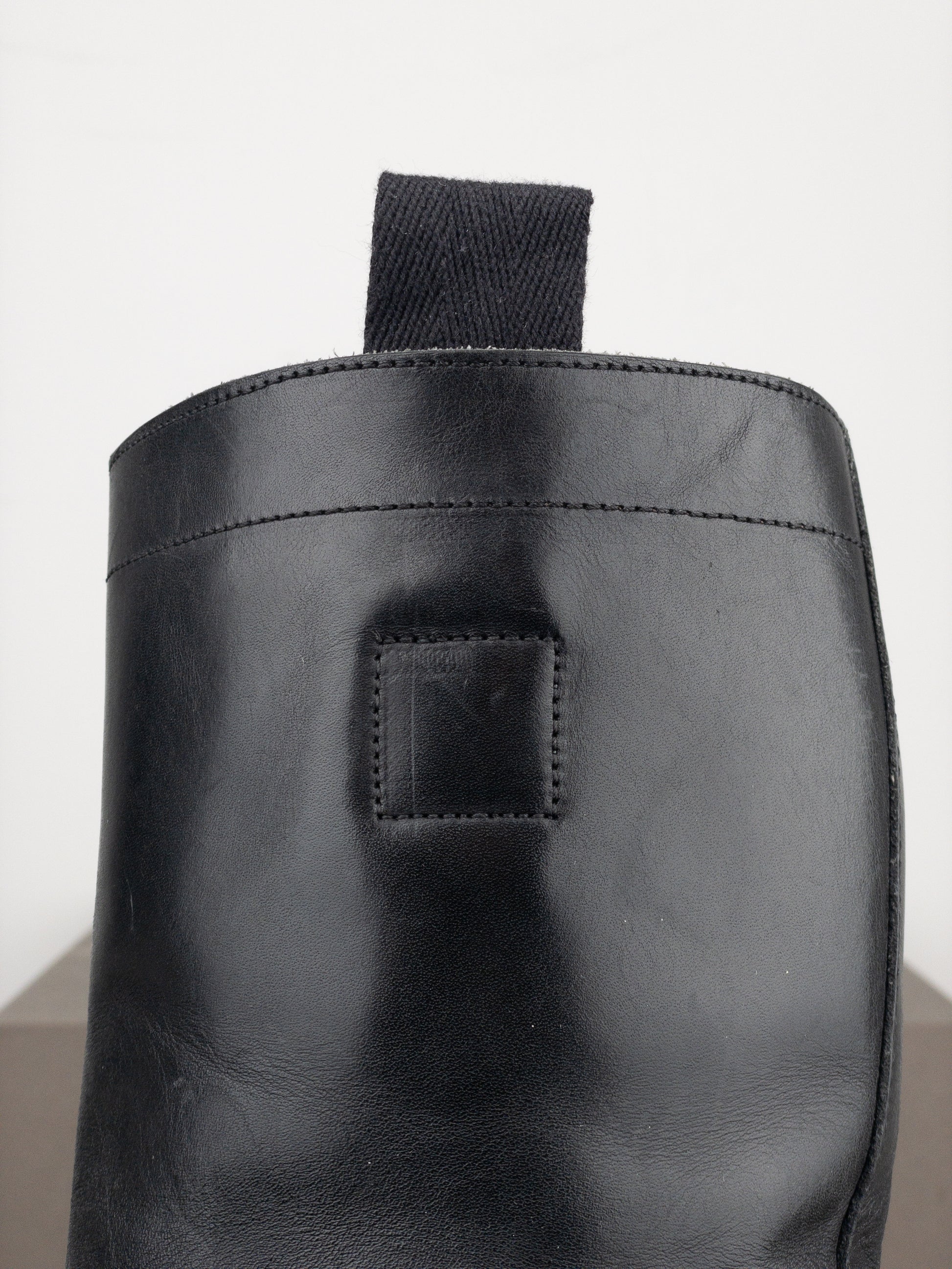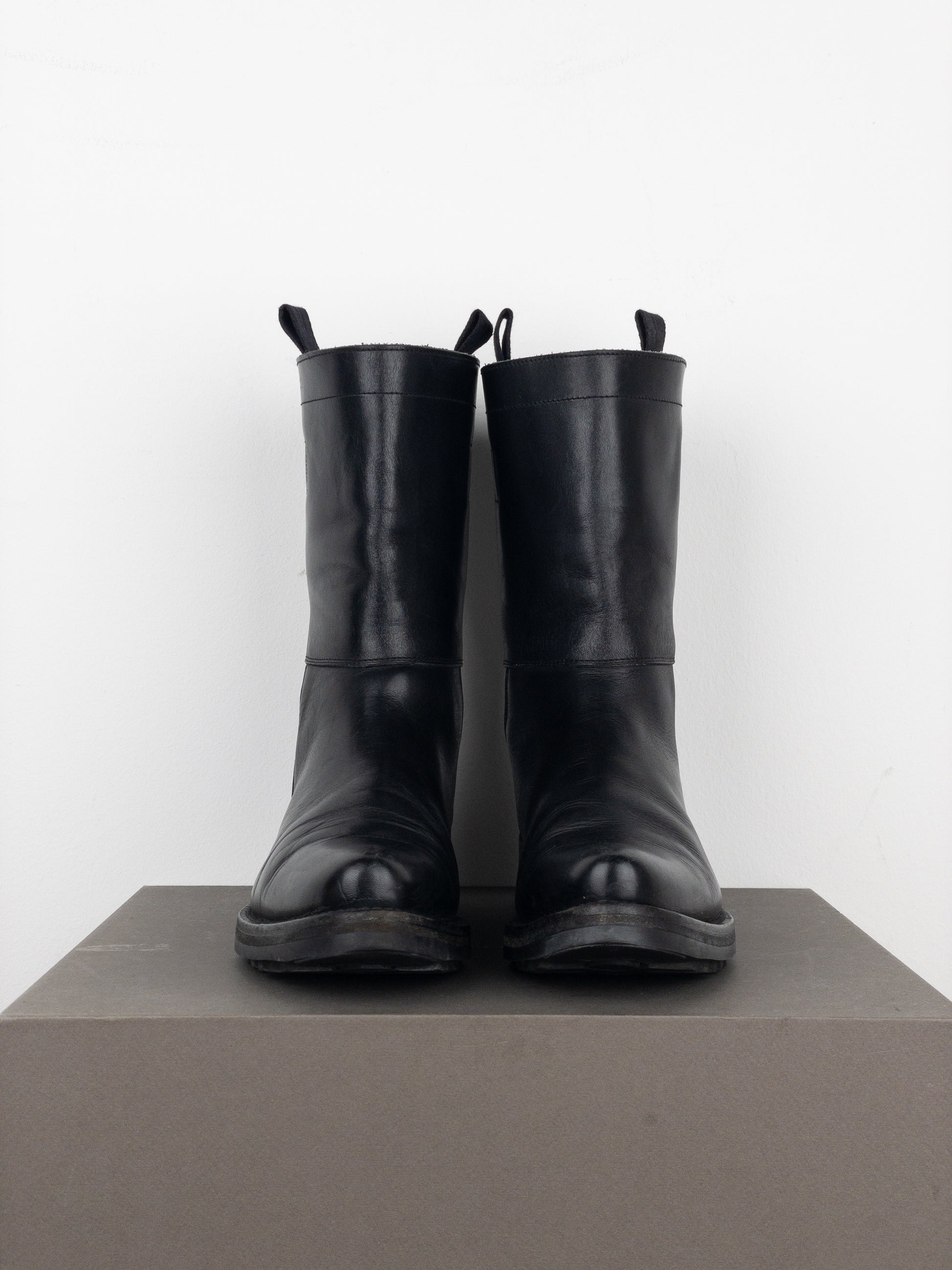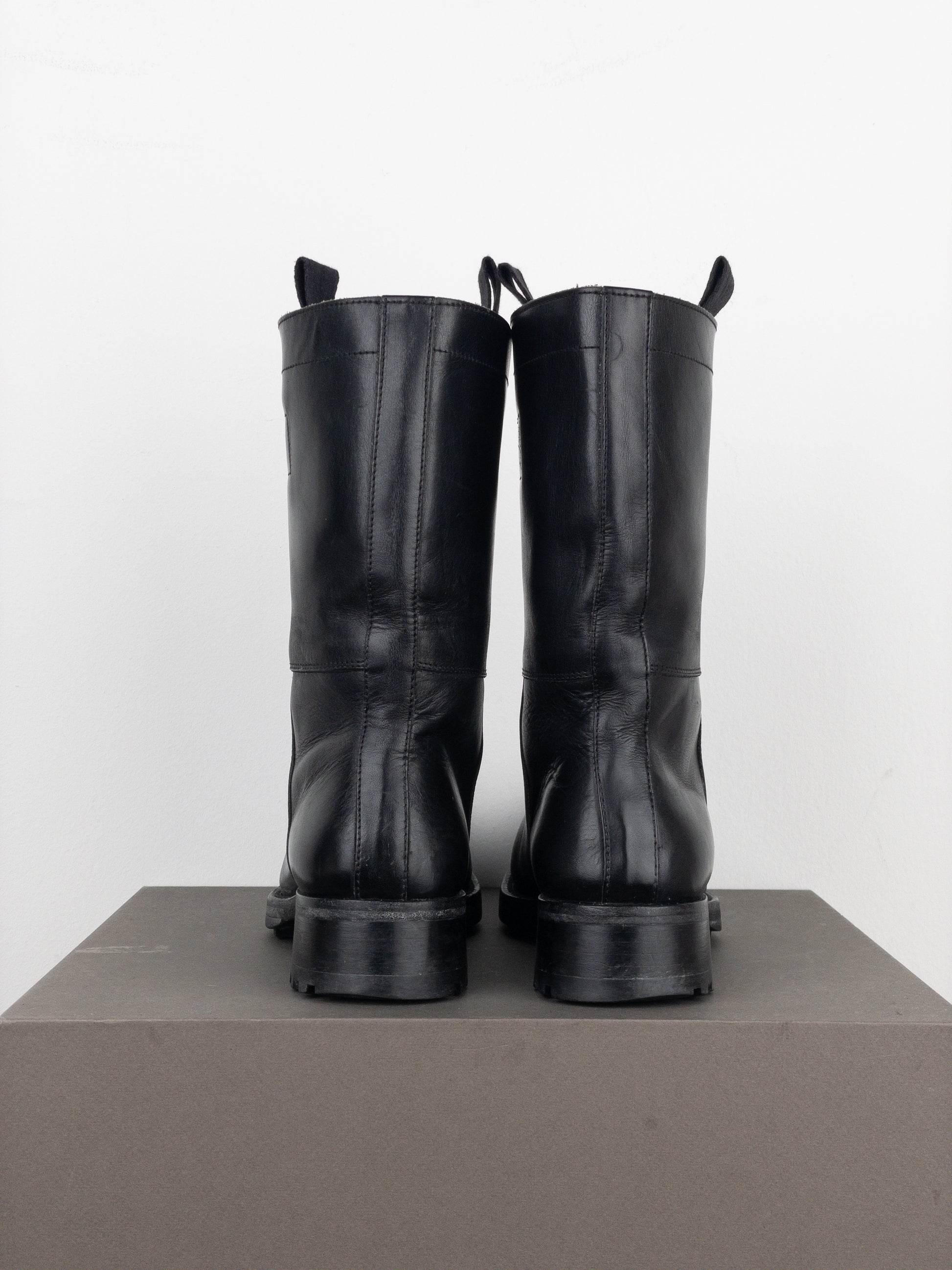 Black leather biker boots with pointed toe, a rugged sole, and a wide shaft, from the autumn-winter 2001 collection. Featured in the ad campaign.