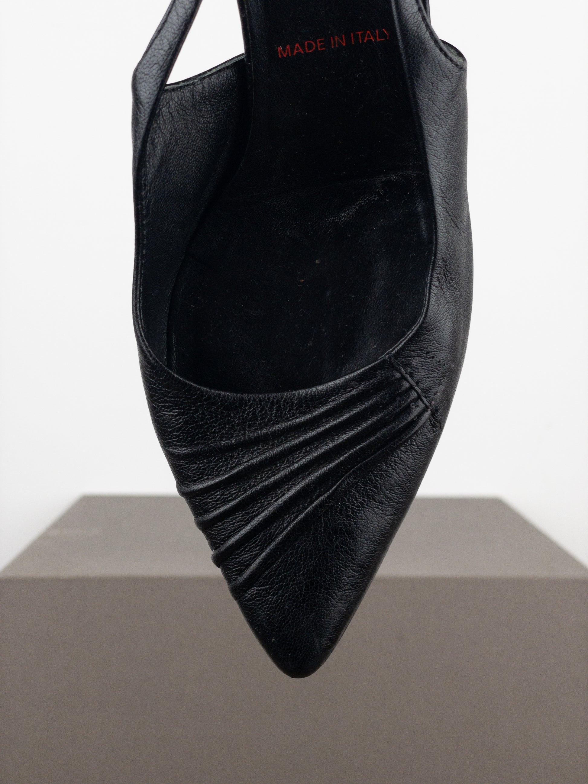 Black leather kitten heels with a pointed toe, featuring an elastic slingback strap, ripples across the forefoot, and an embossed brand logo in the back, from the spring-summer 2000 collection.