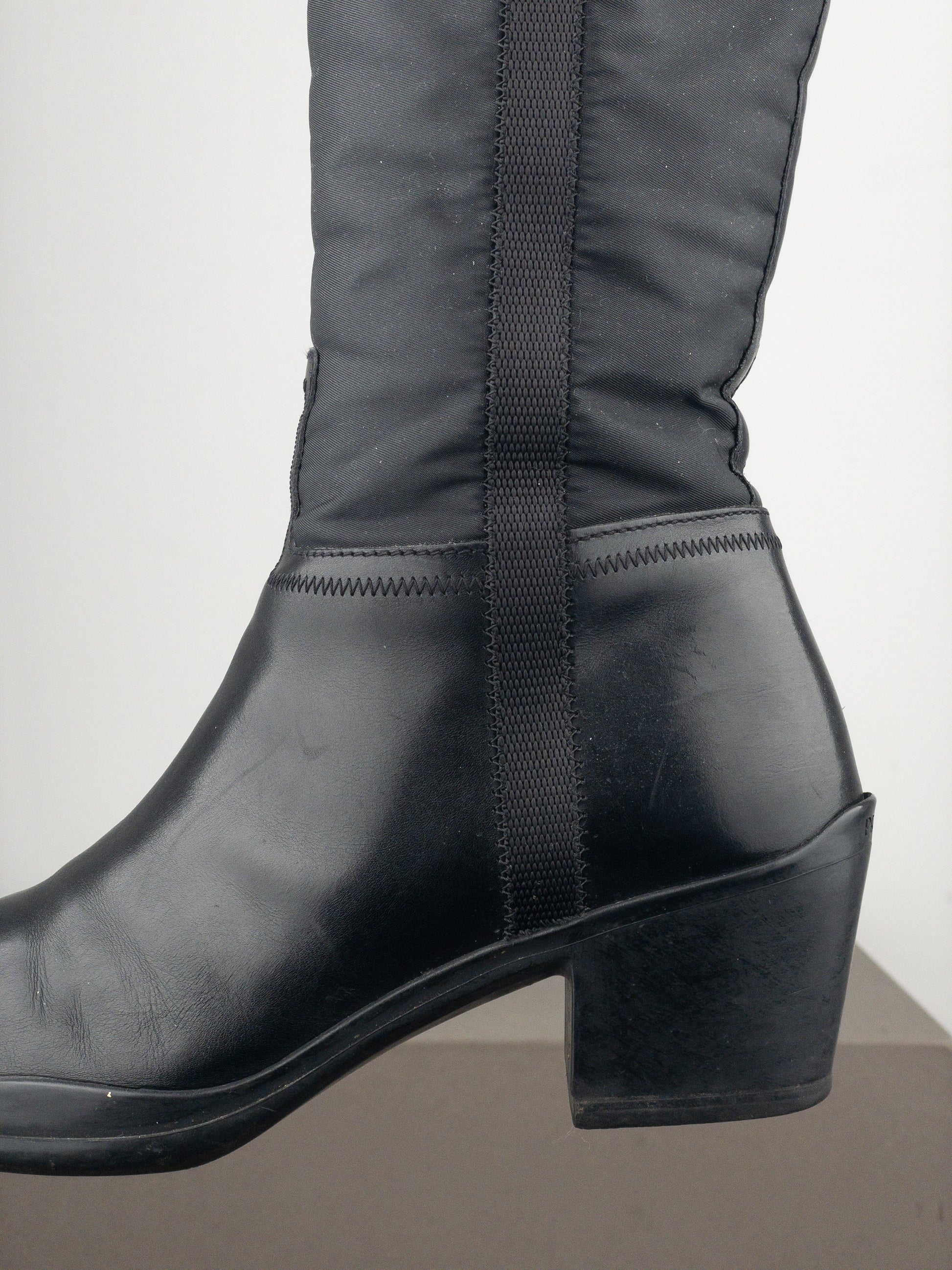 Cowboy boots in black leather and nylon with a cuban heel and organically formed sports sole, featuring a canvas sidestripe and branded silver colored buckle at the top of the shaft, from the 2000s.