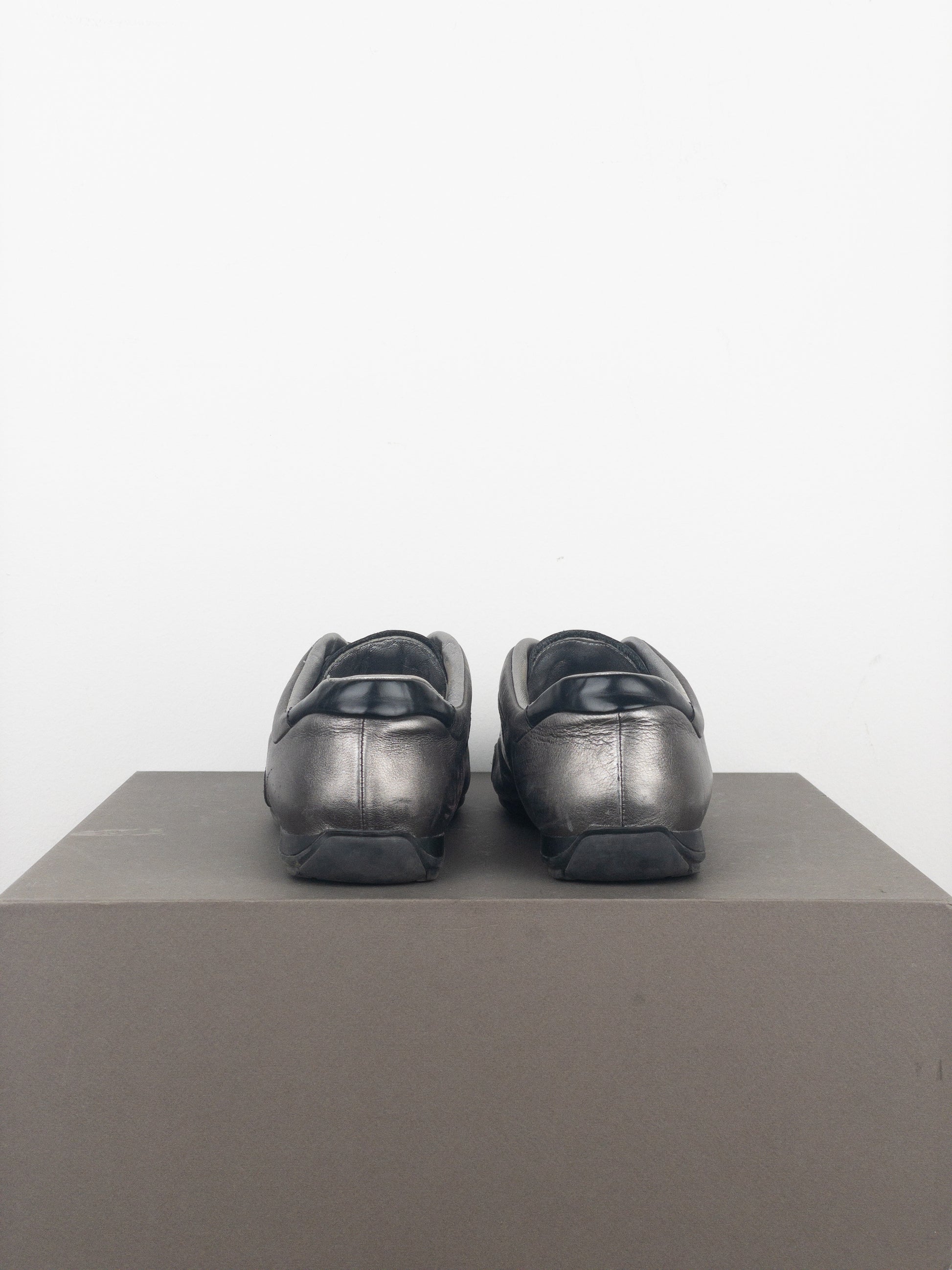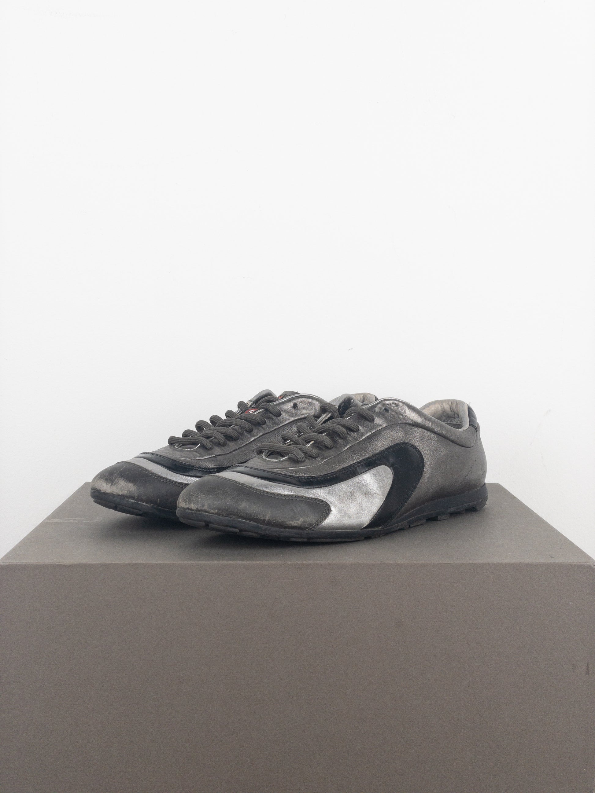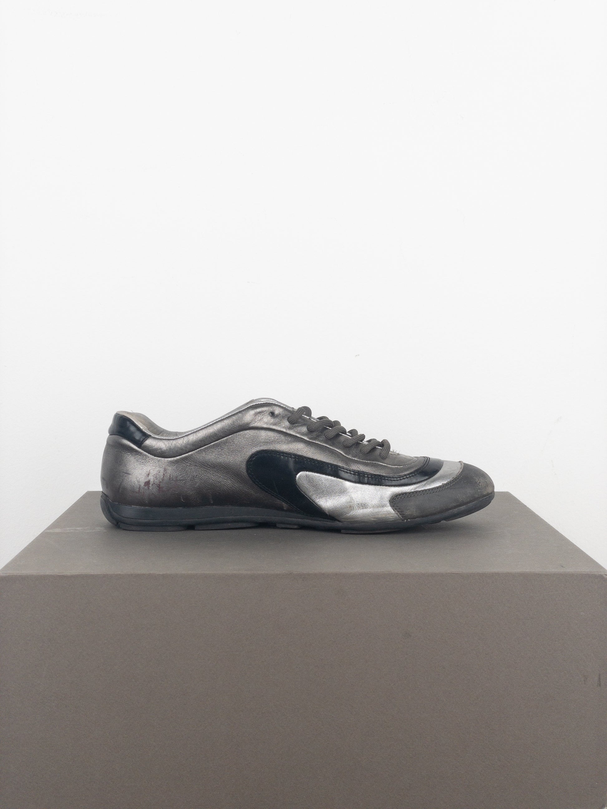 Silver-colored leather low-top sneakers with curved black panels, featuring the signature red “Linea Rossa” tab on the tongue, and a flat sole reminiscent of racing shoes used in motorsports, from the 2000s.