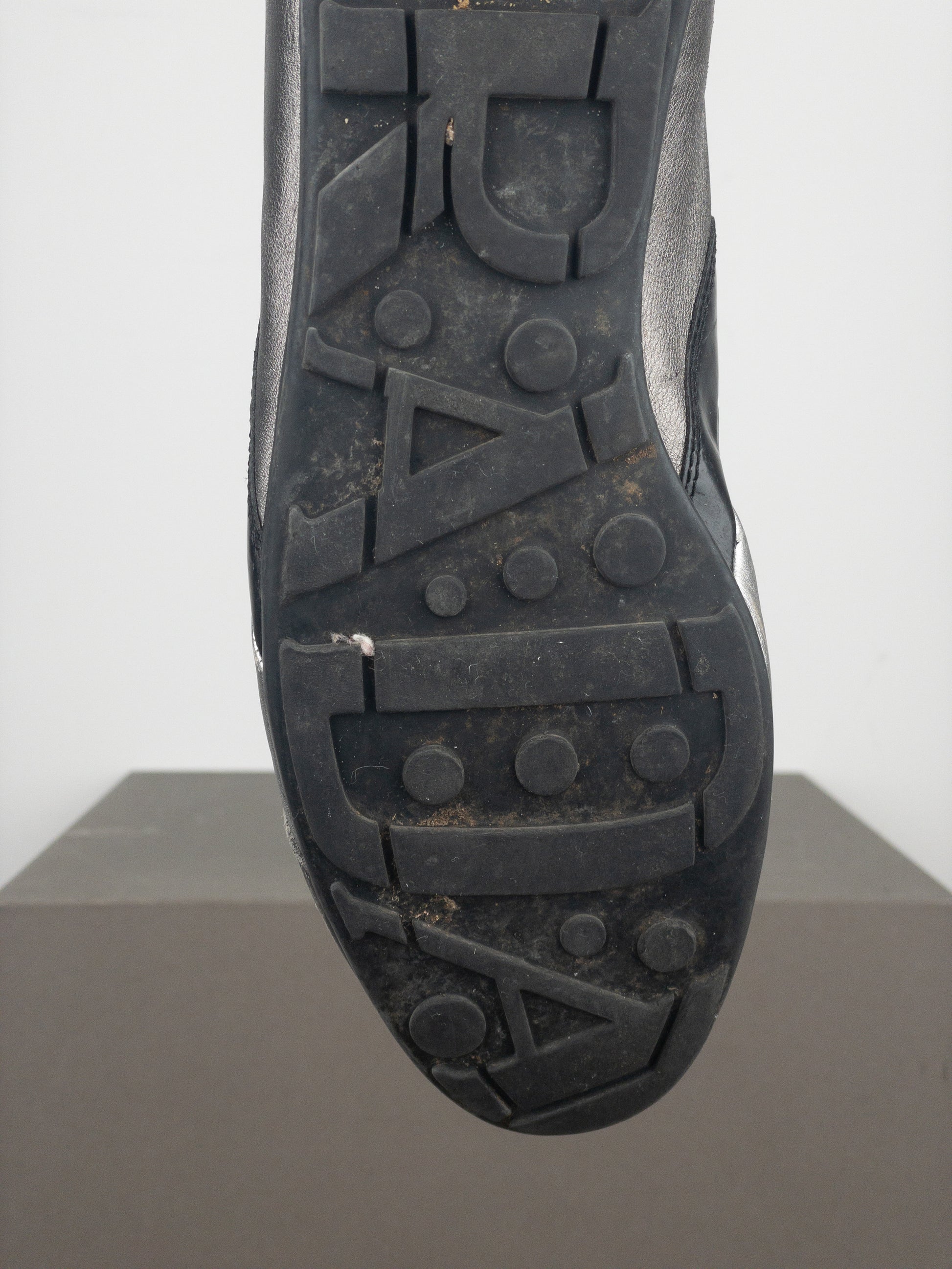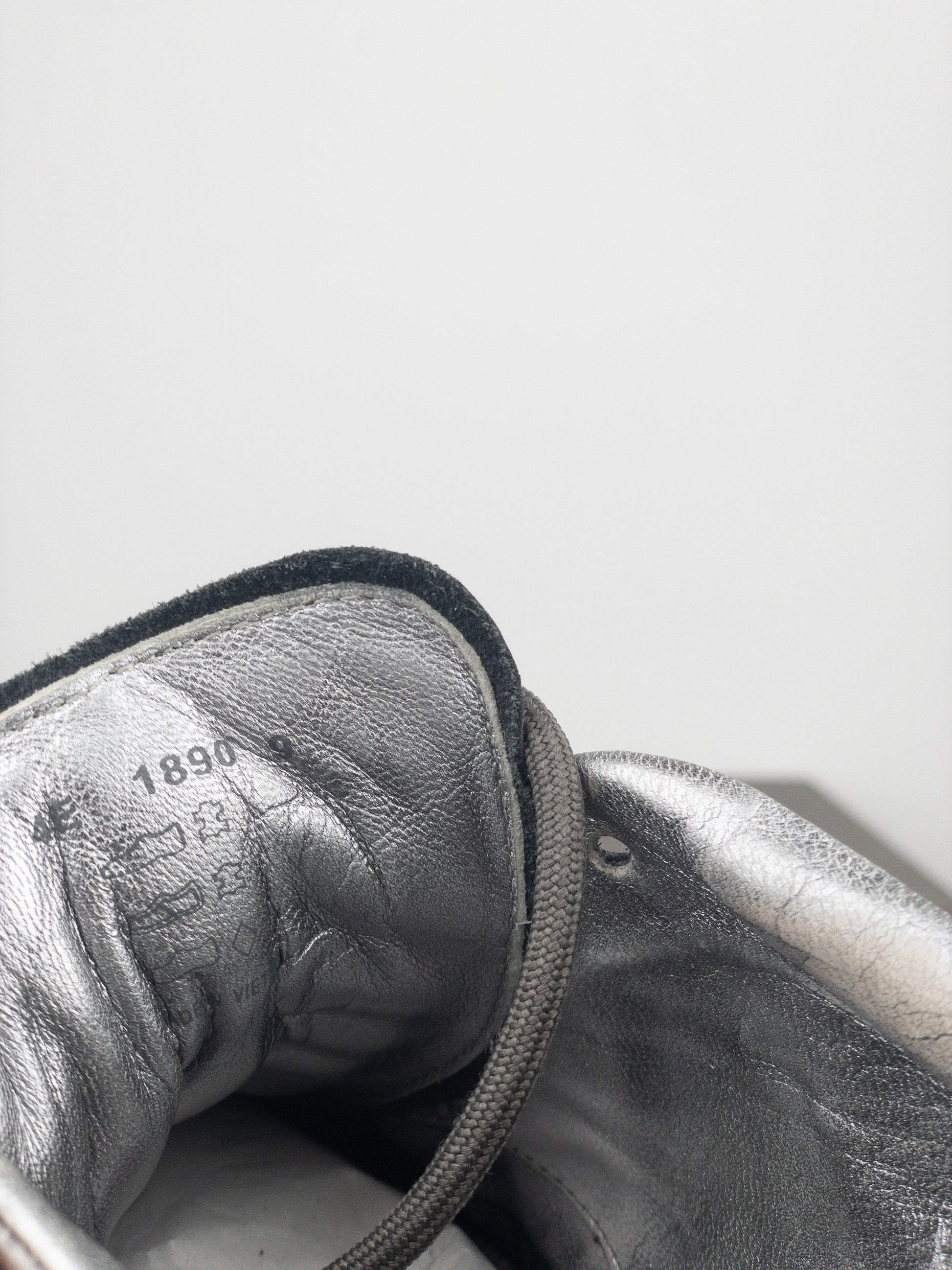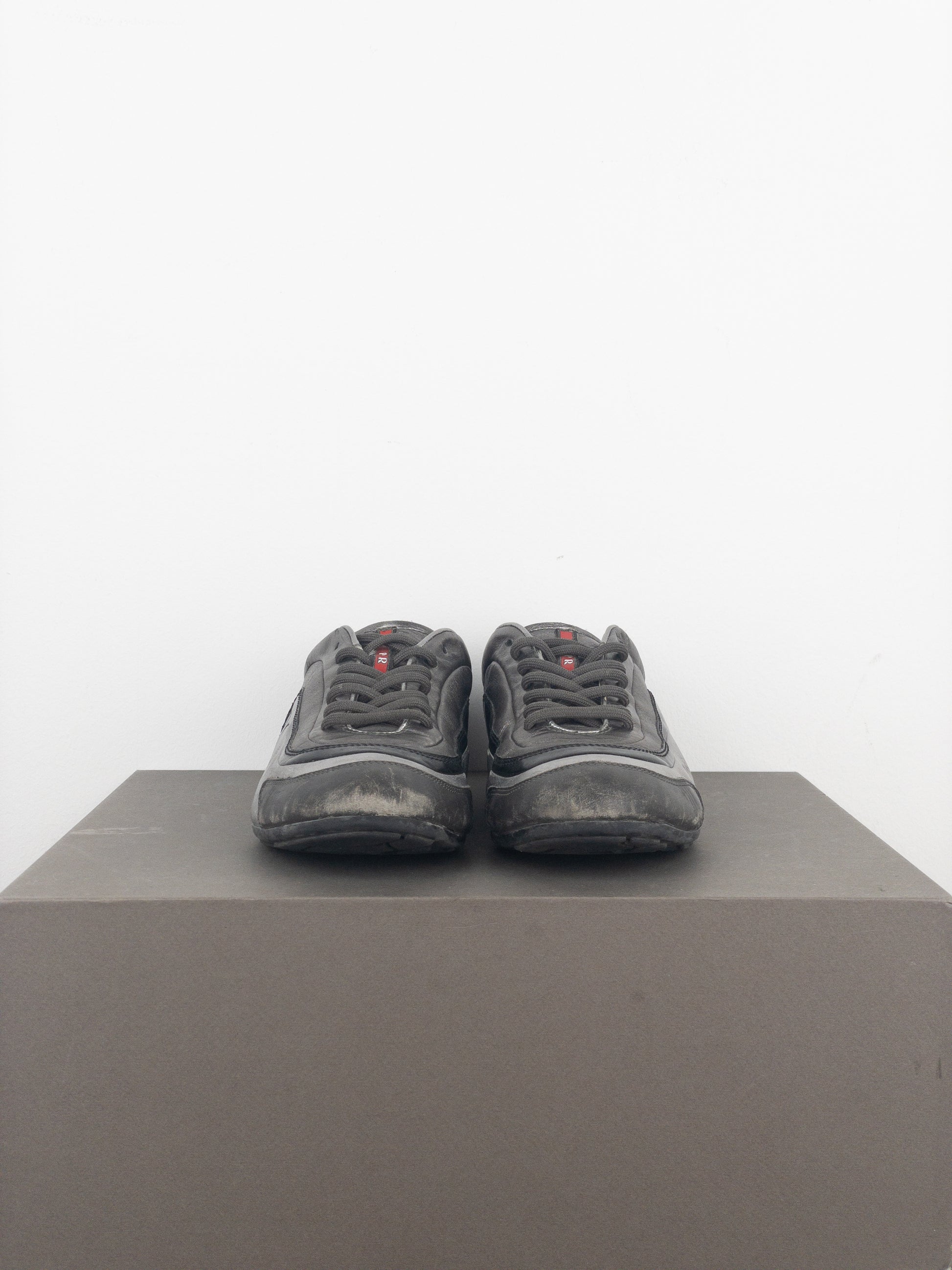 Silver-colored leather low-top sneakers with curved black panels, featuring the signature red “Linea Rossa” tab on the tongue, and a flat sole reminiscent of racing shoes used in motorsports, from the 2000s.