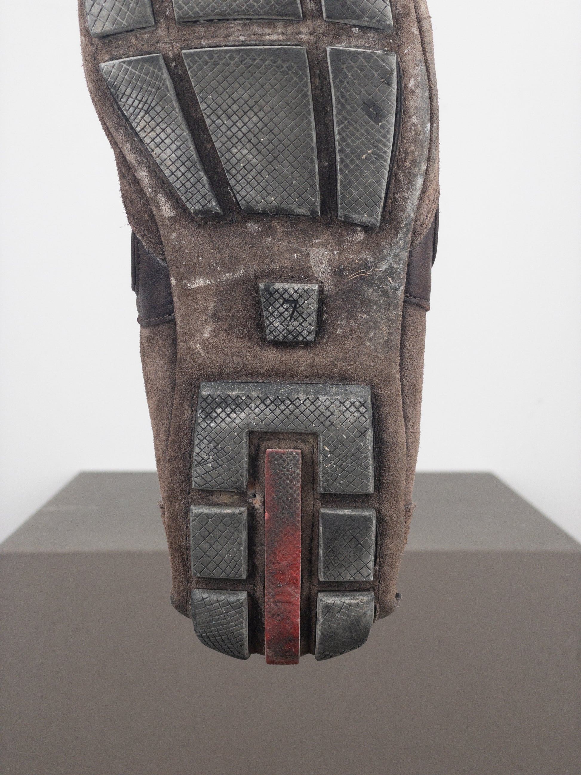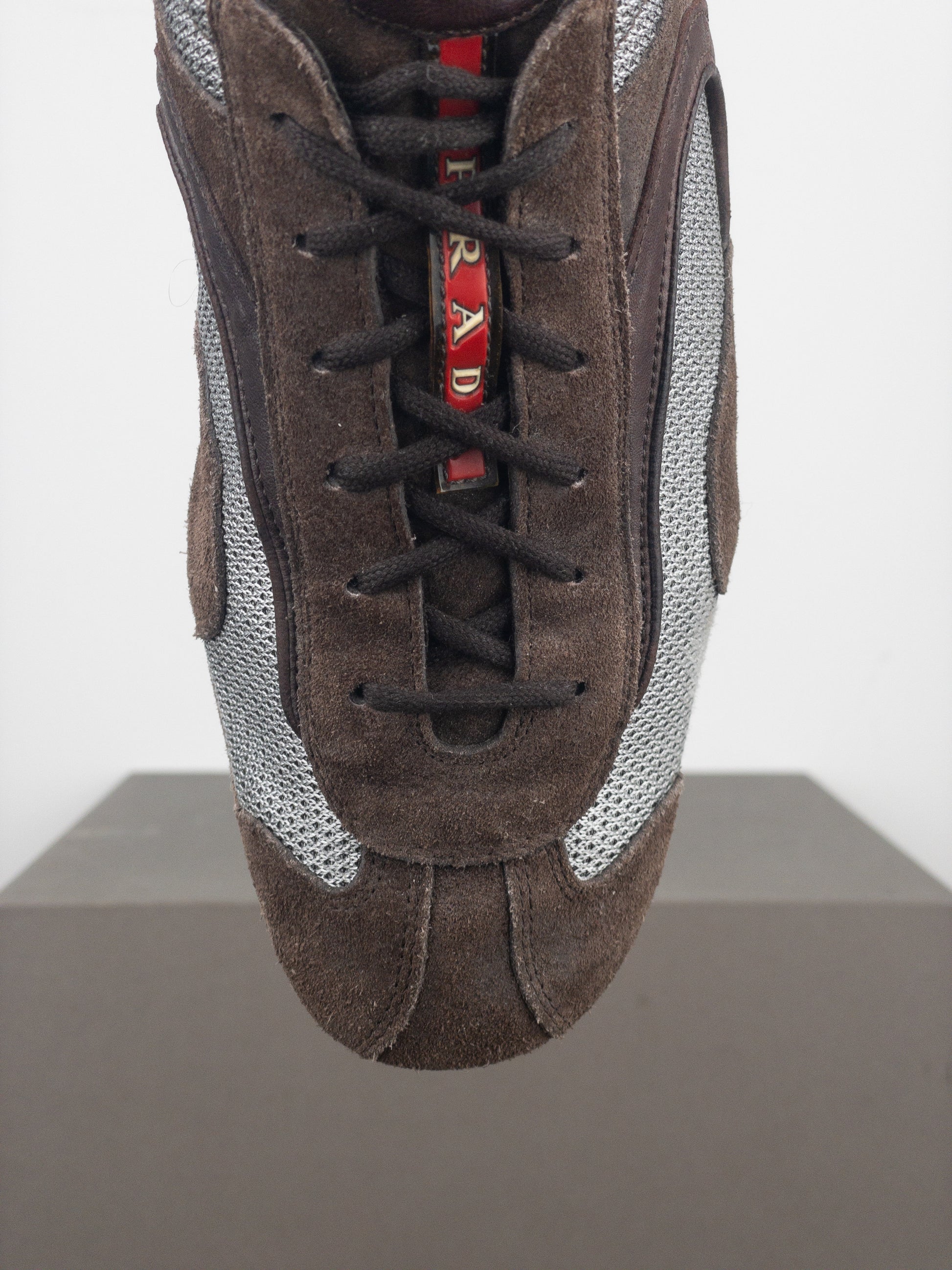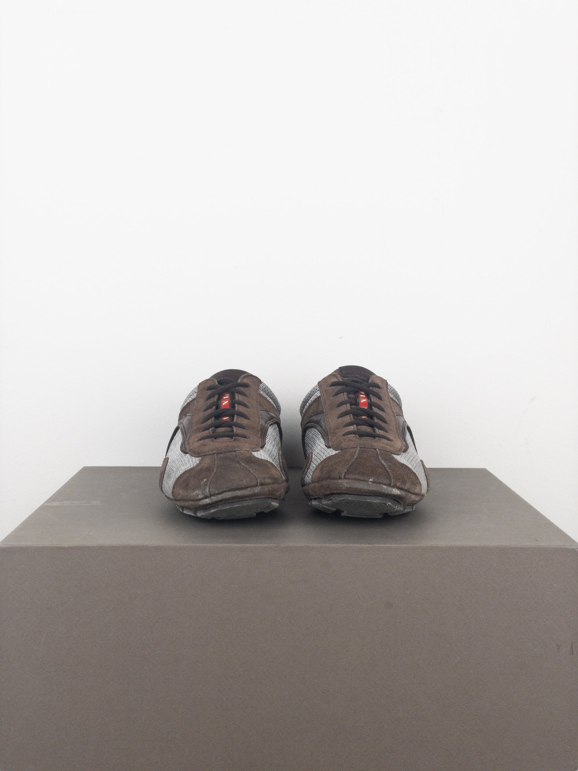 Low-top sneakers in light brown suede with light grey mesh panels, featuring the signature red “Linea Rossa” tab on the tongue, and a flat sole reminiscent of racing shoes used in motorsports, from the 2000s.