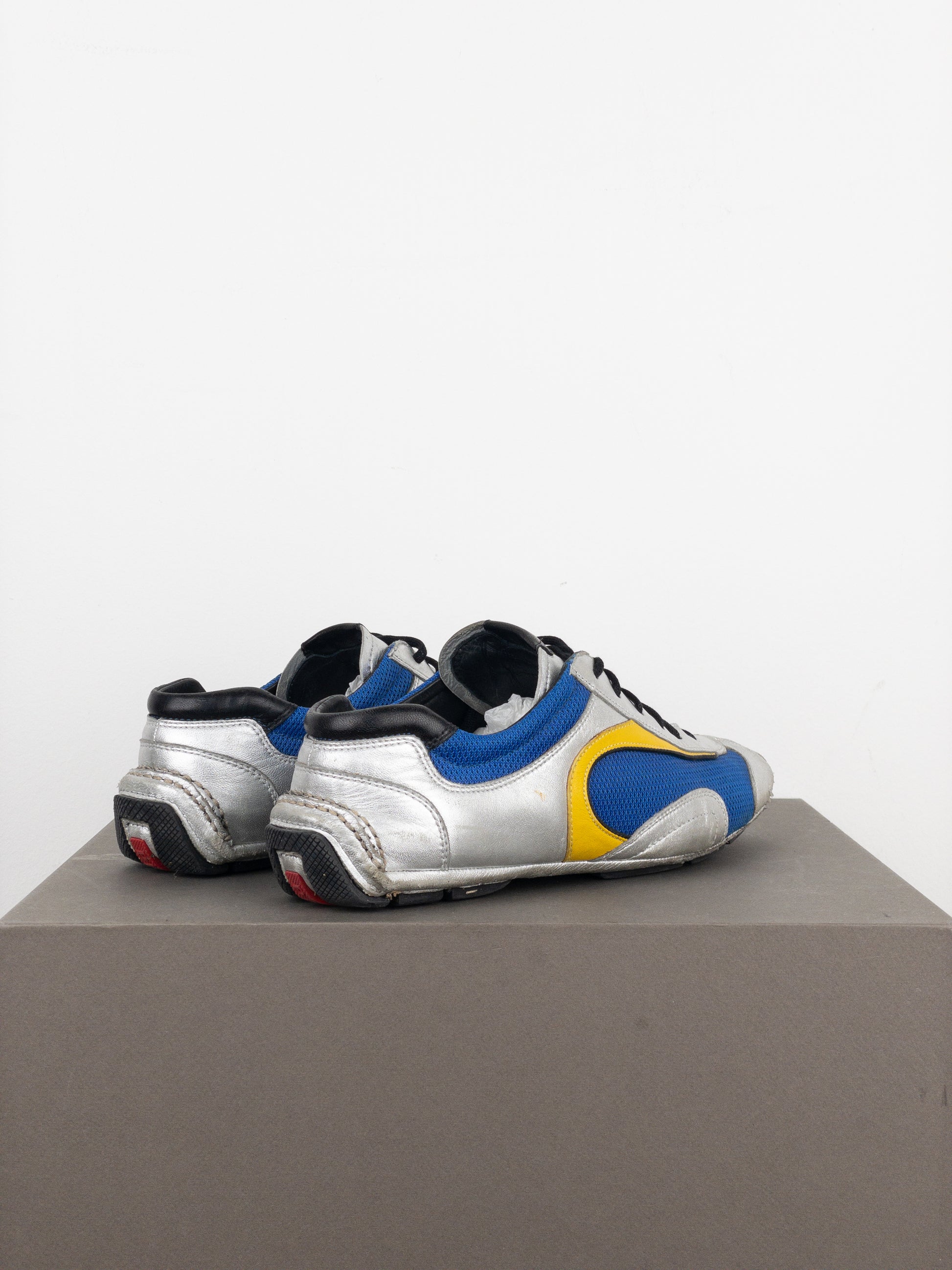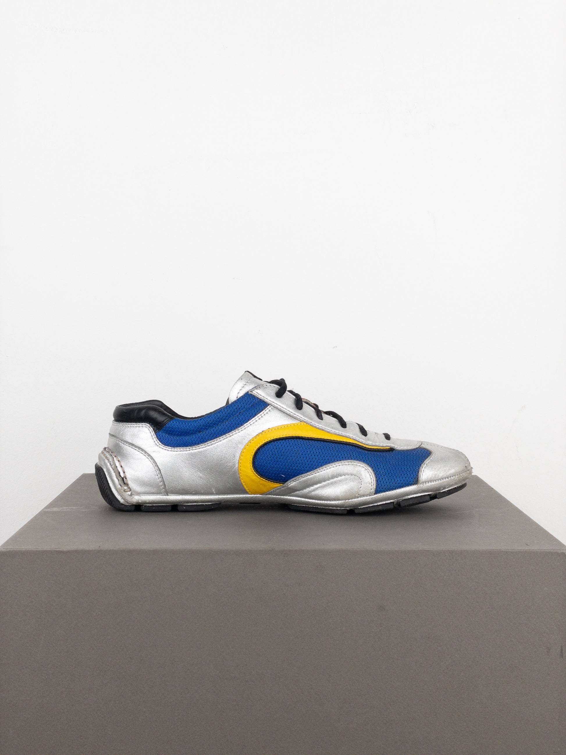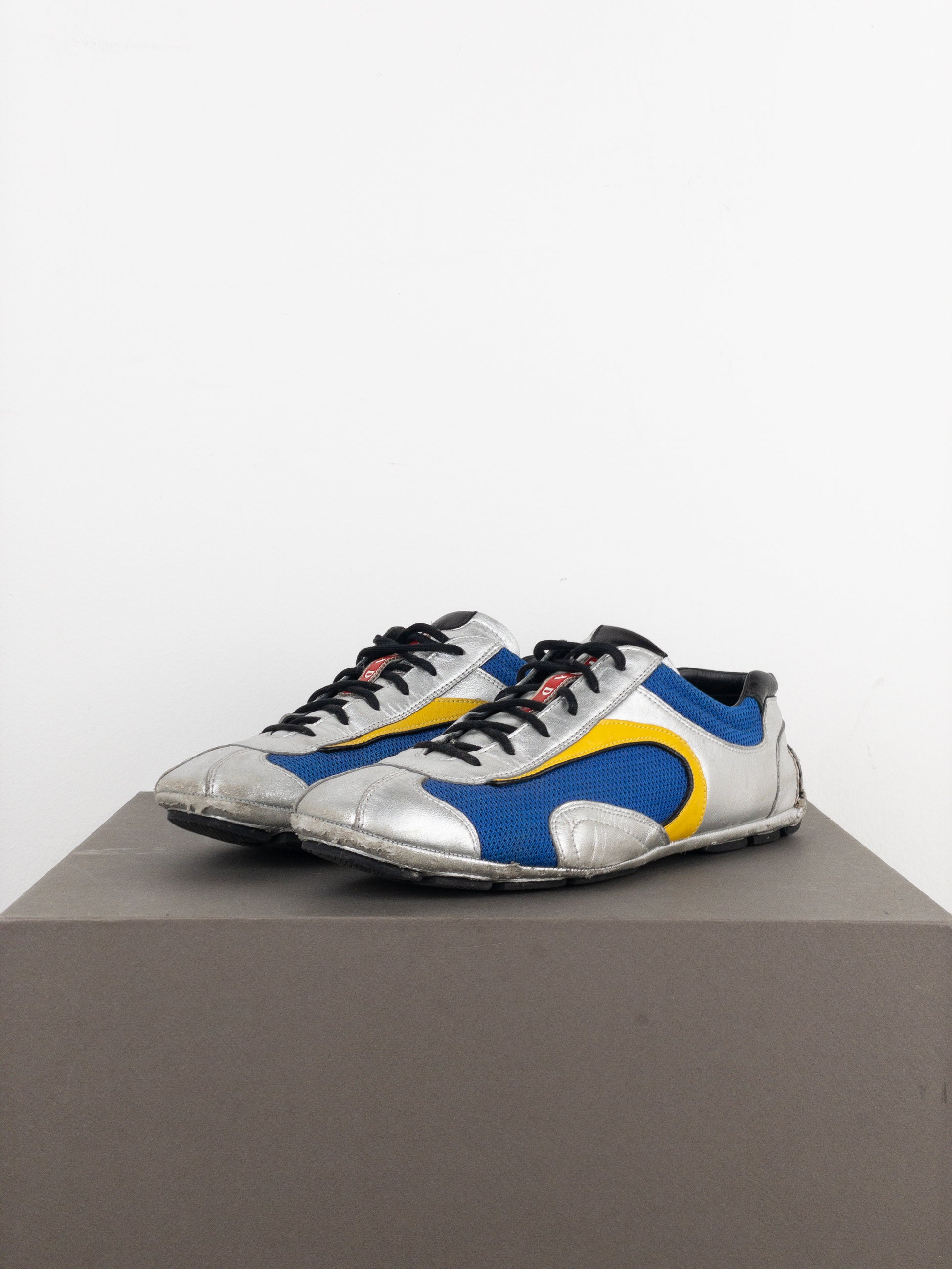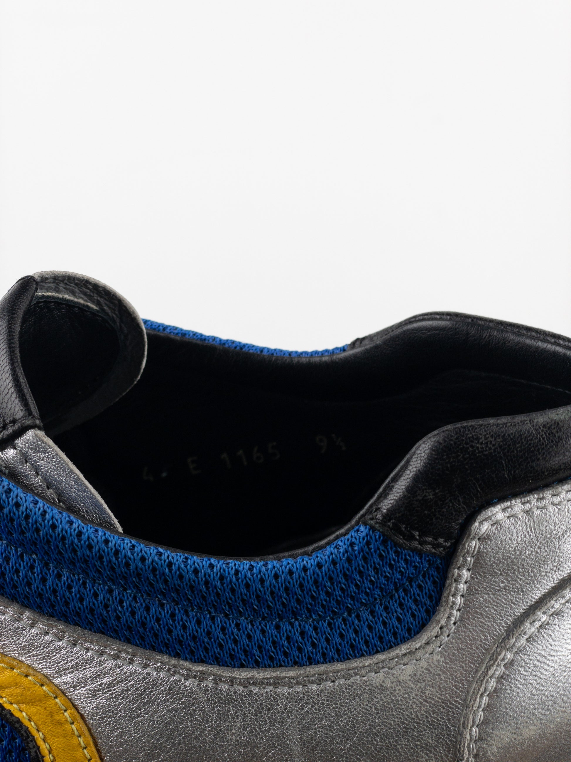 Silver-colored leather low-top sneakers, with blue mesh panels and yellow detailing, featuring the signature red “Linea Rossa” tab on the tongue, and a flat sole reminiscent of racing shoes used in motorsports, from the 2000s.