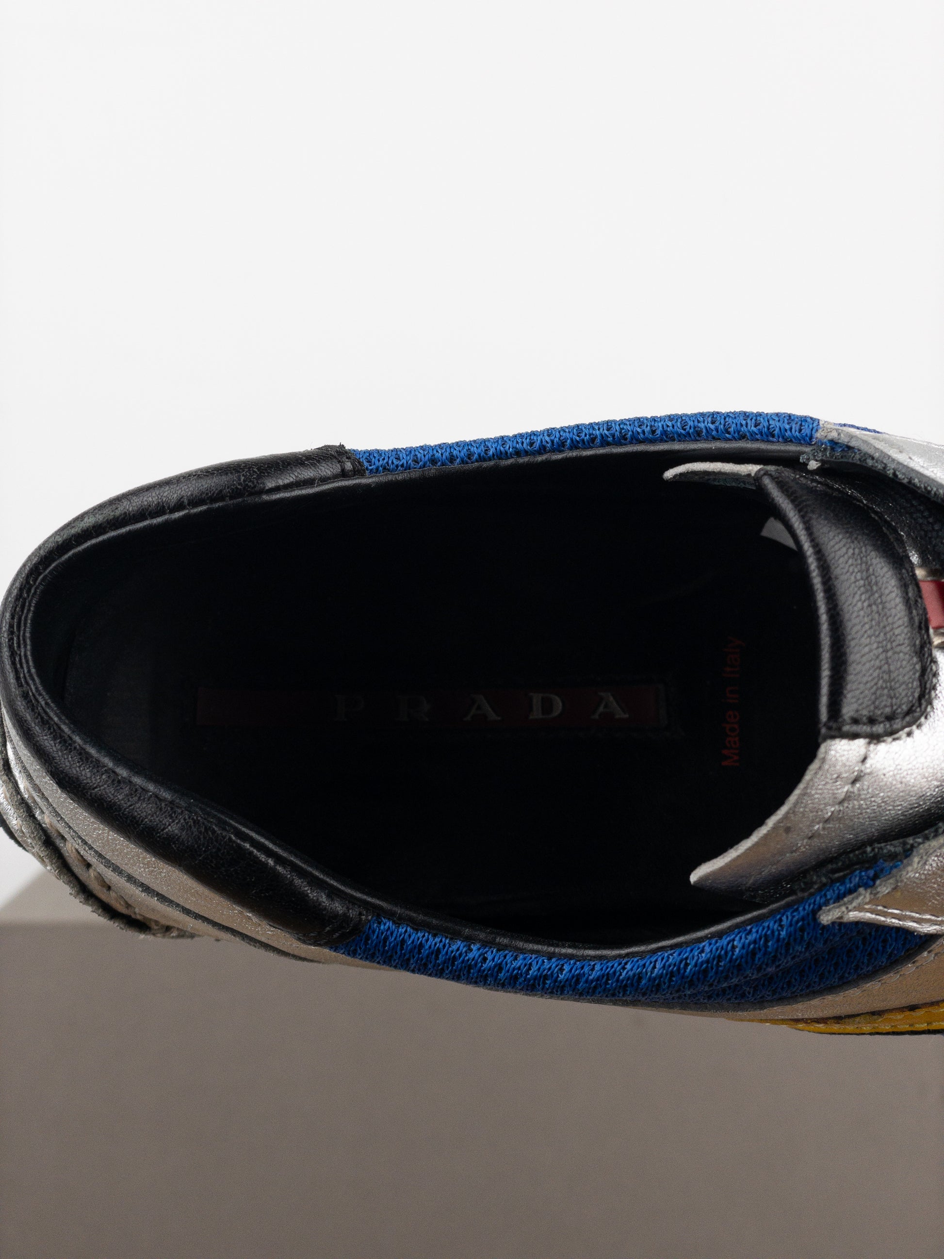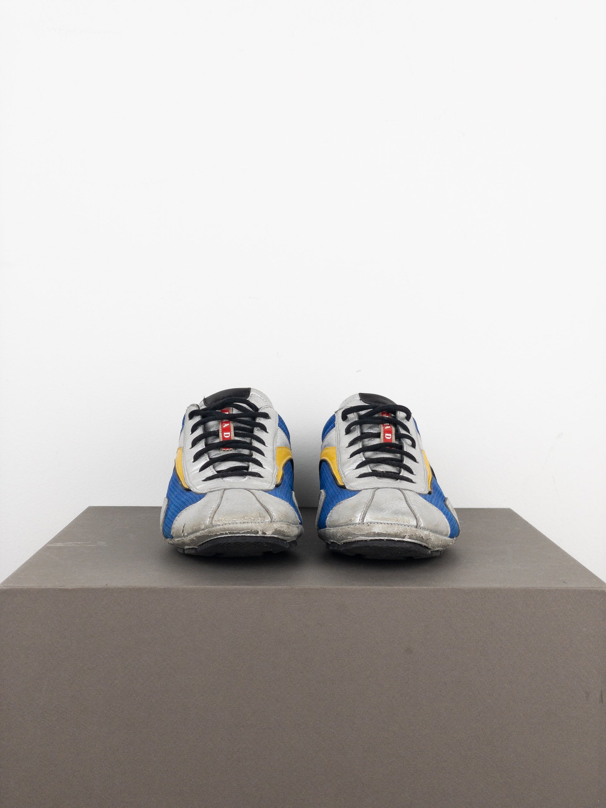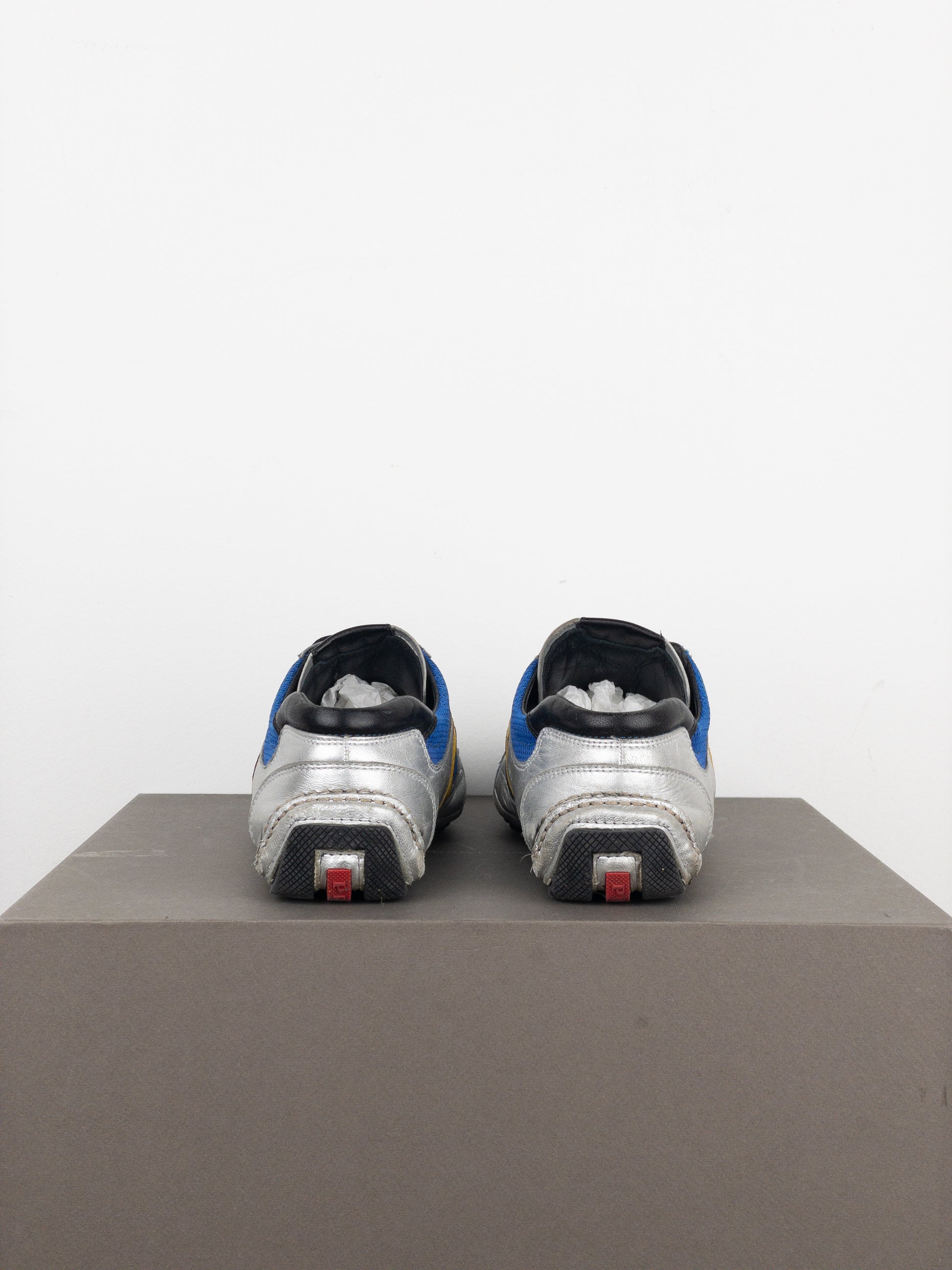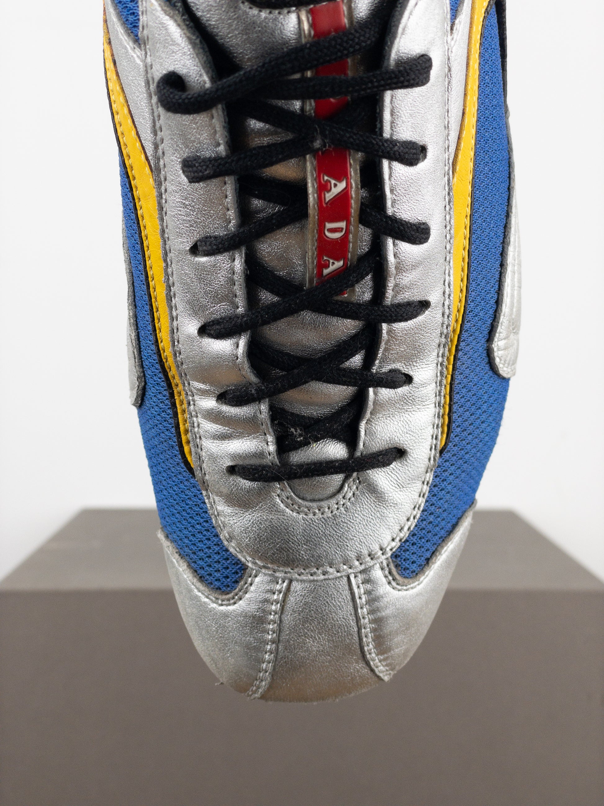 Silver-colored leather low-top sneakers, with blue mesh panels and yellow detailing, featuring the signature red “Linea Rossa” tab on the tongue, and a flat sole reminiscent of racing shoes used in motorsports, from the 2000s.