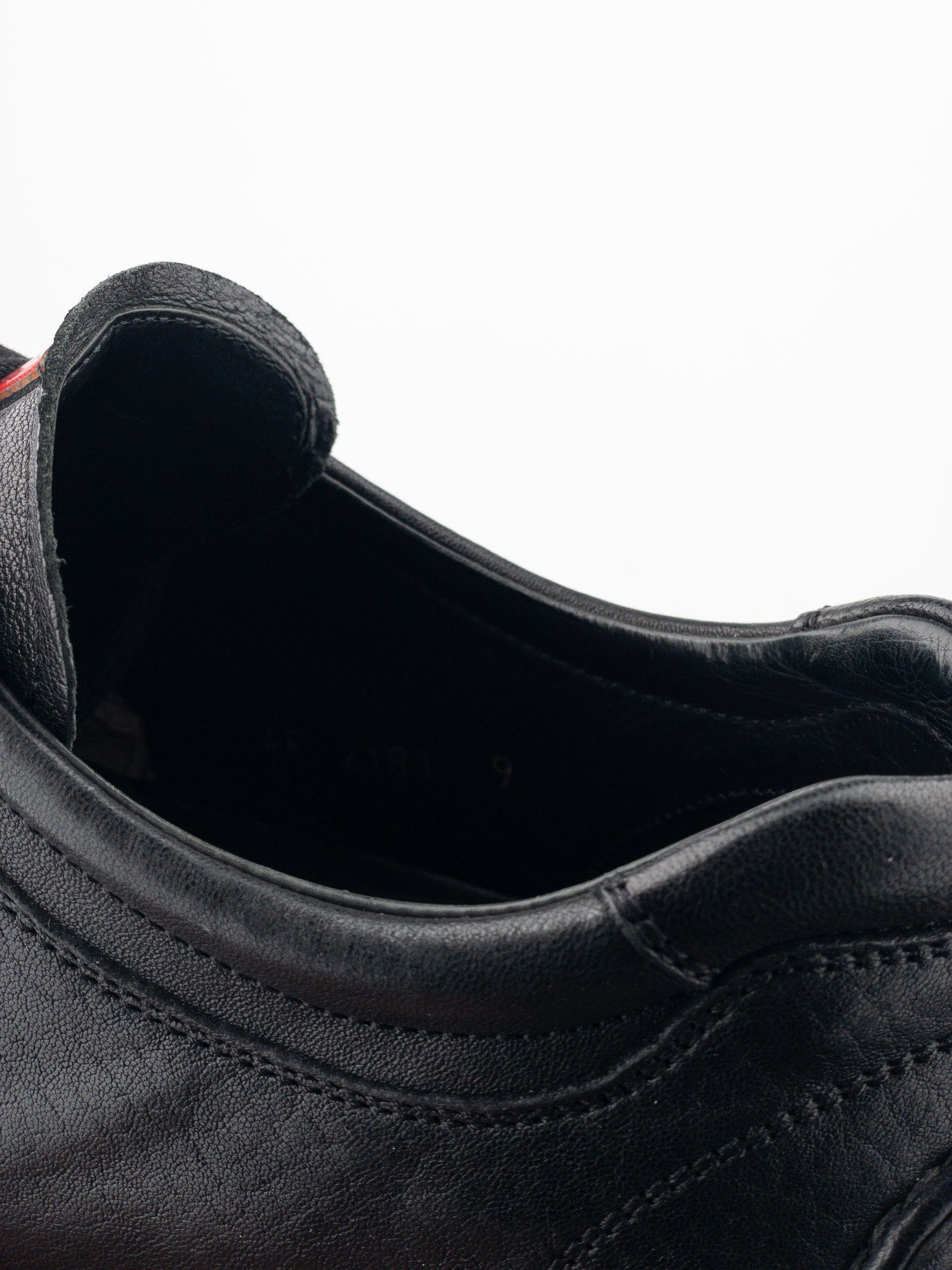 Black leather low-top sneakers with the signature red “Linea Rossa” tab on the tongue and a flat sole reminiscent of racing shoes used in motorsports, from the 2000s.