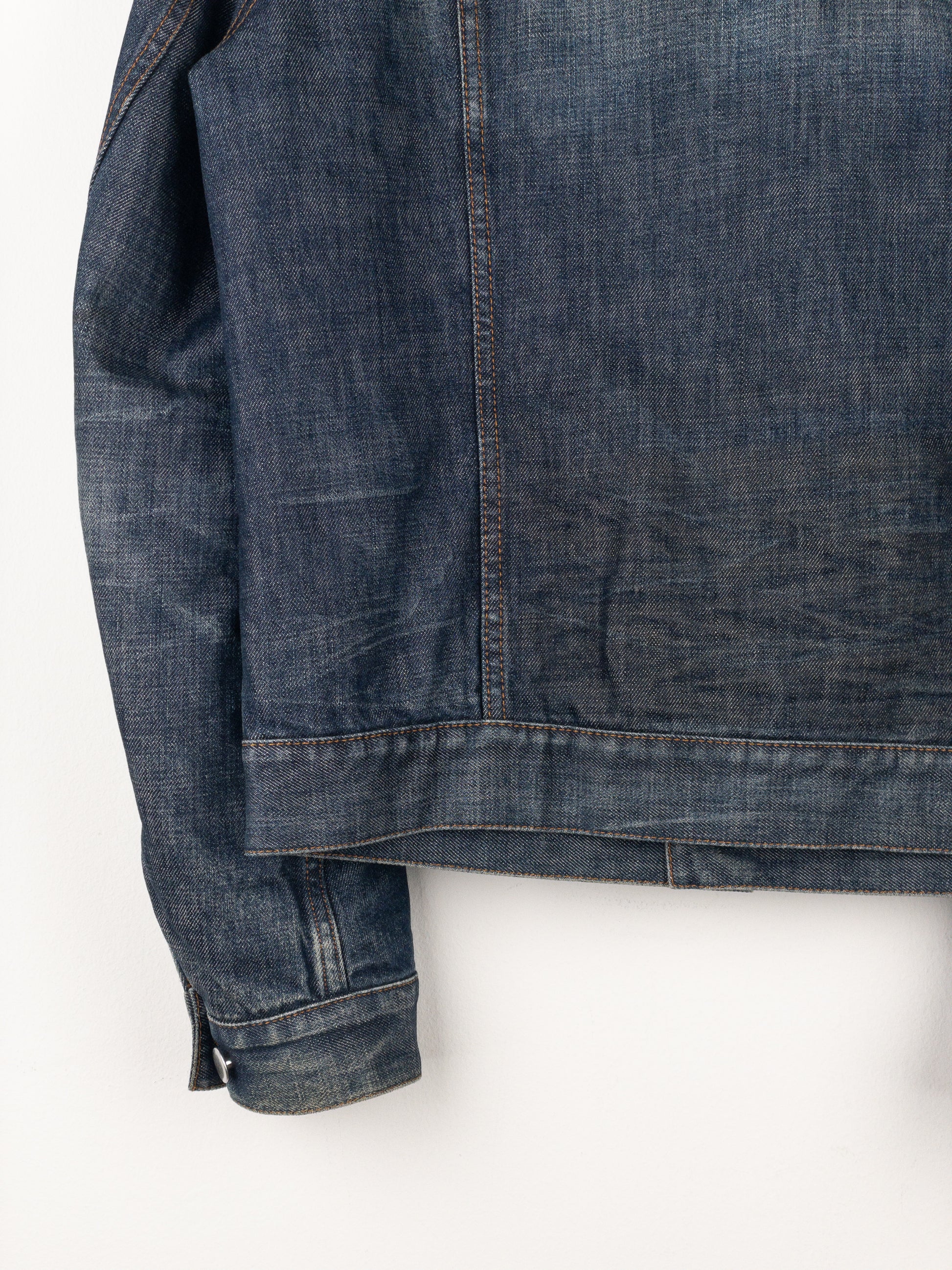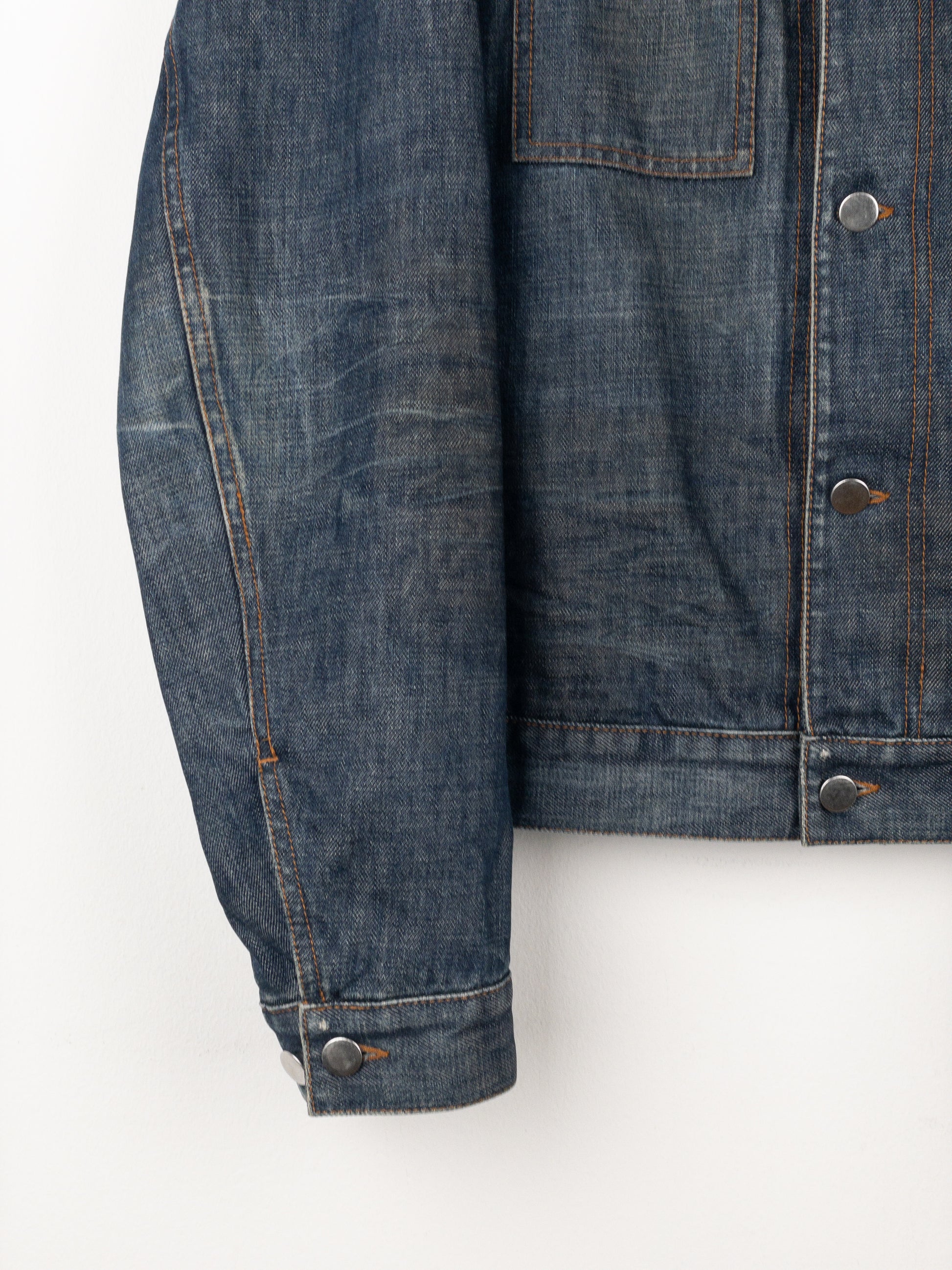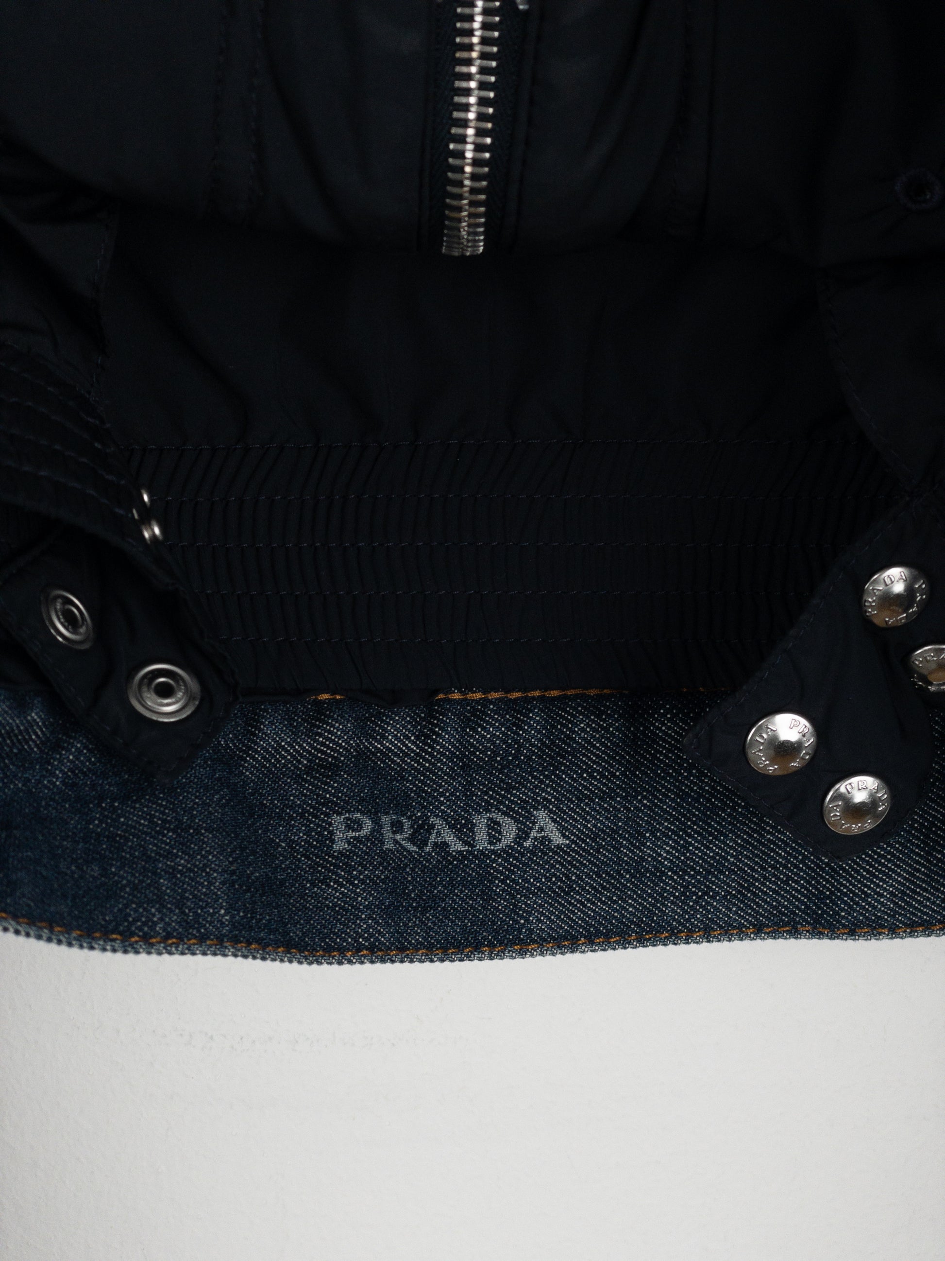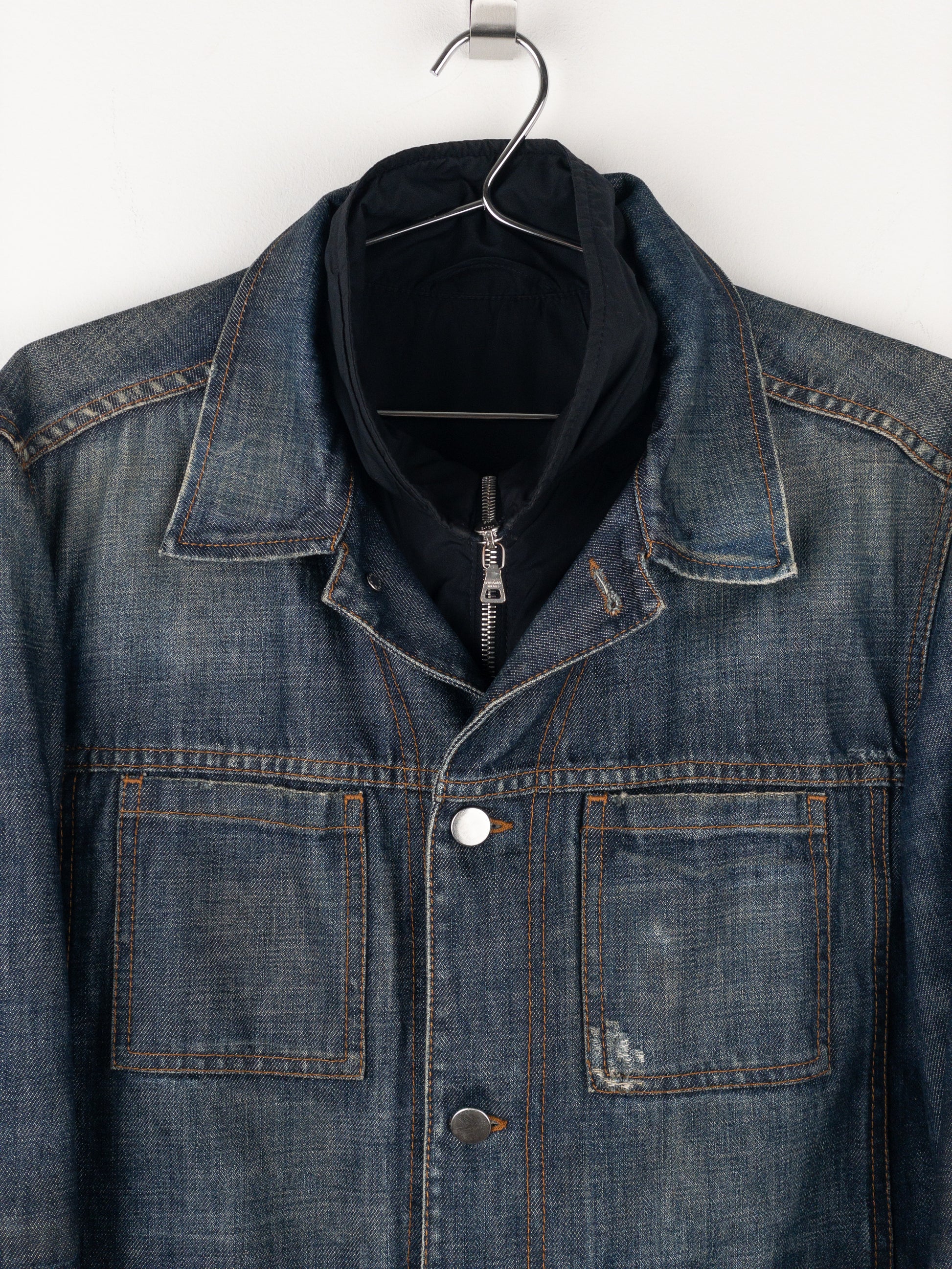 Dark wash denim trucker jacket with an insewn black padded lining jacket, angular chest pockets, and slight distressing in the chest, from the autumn-winter 2005 collection.
