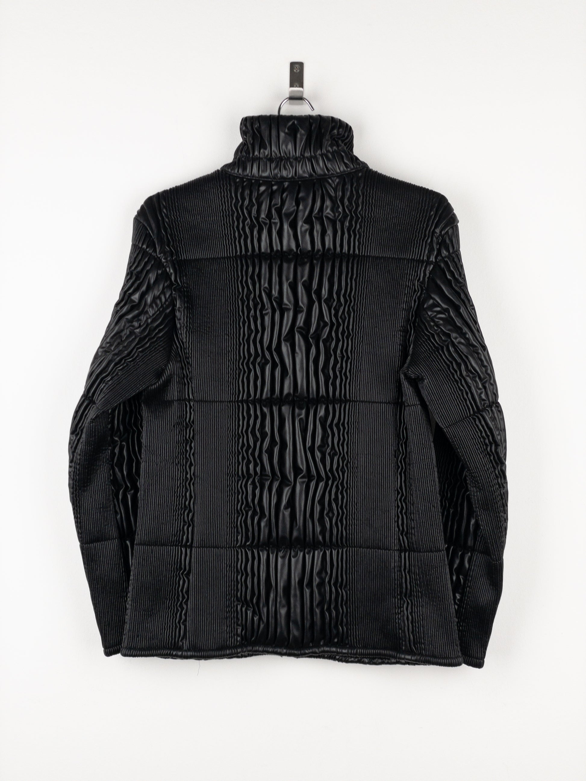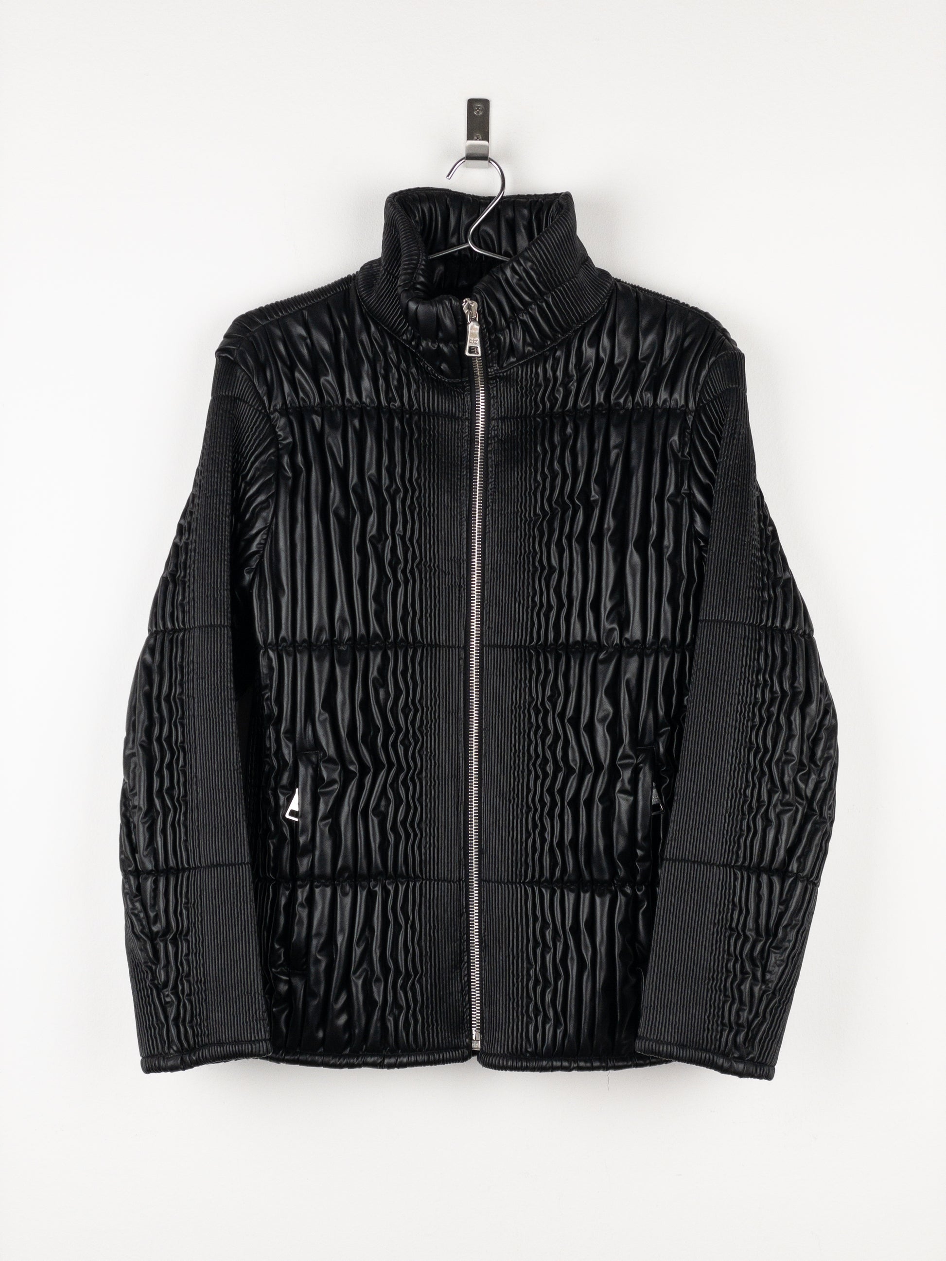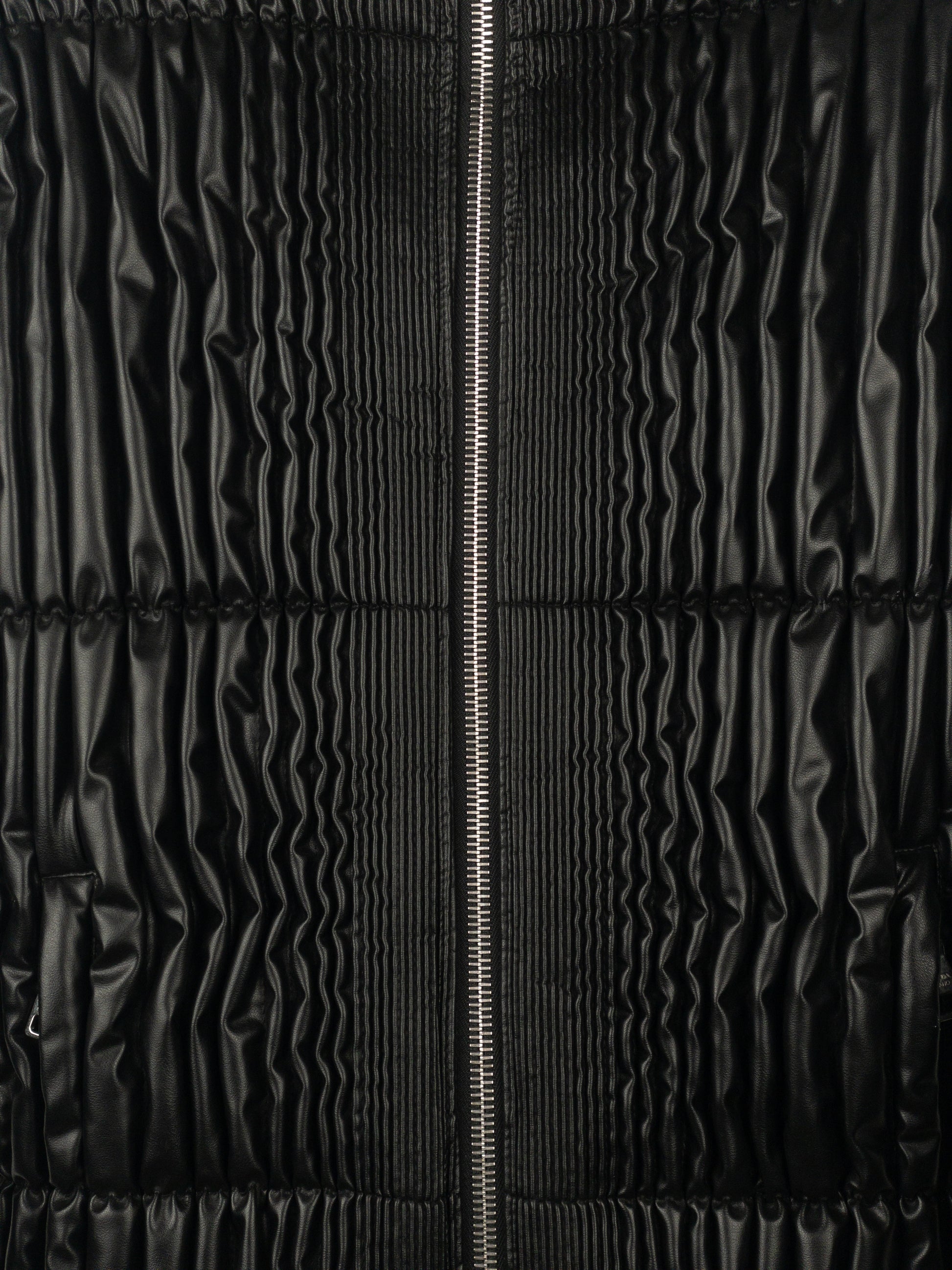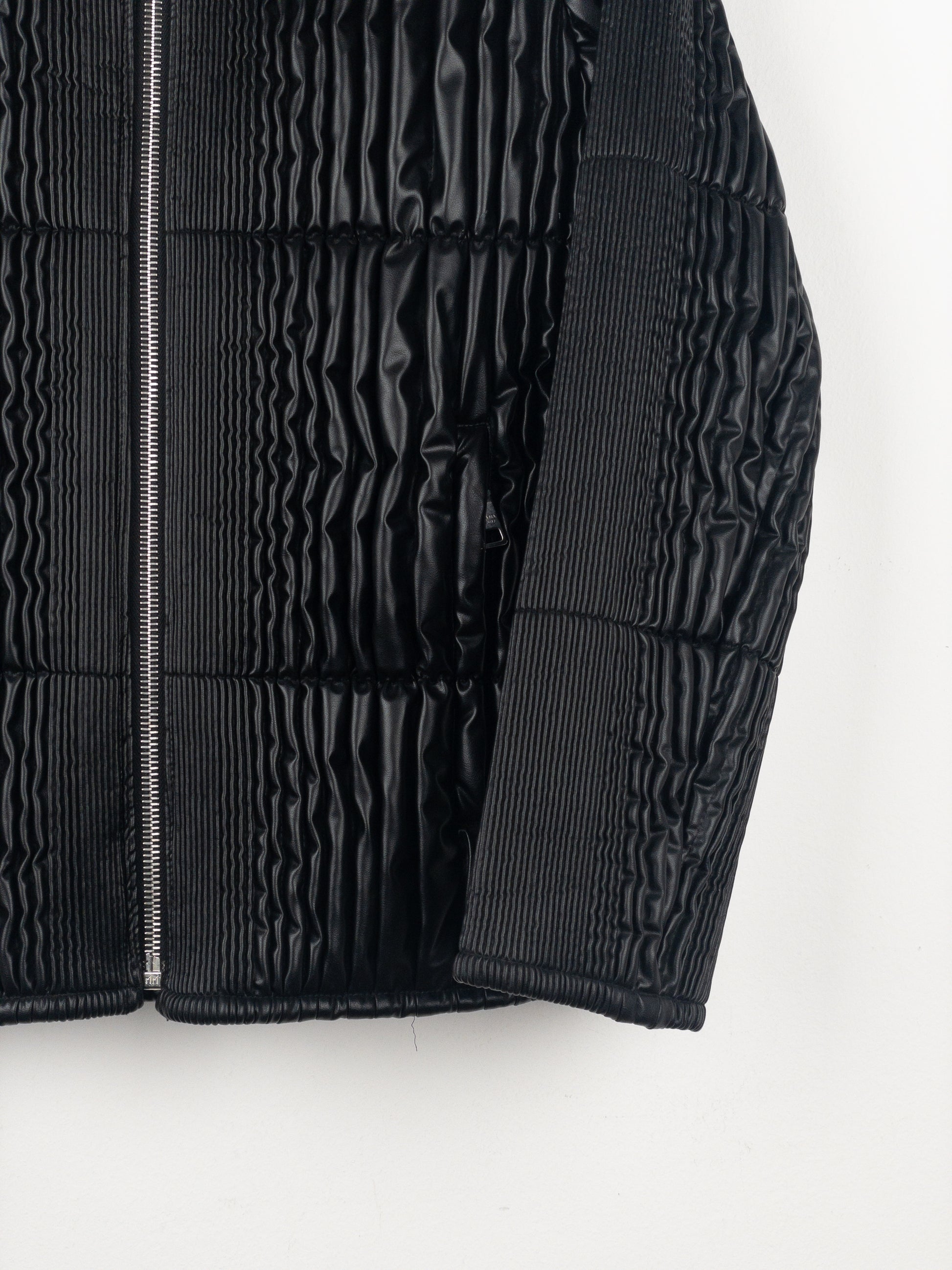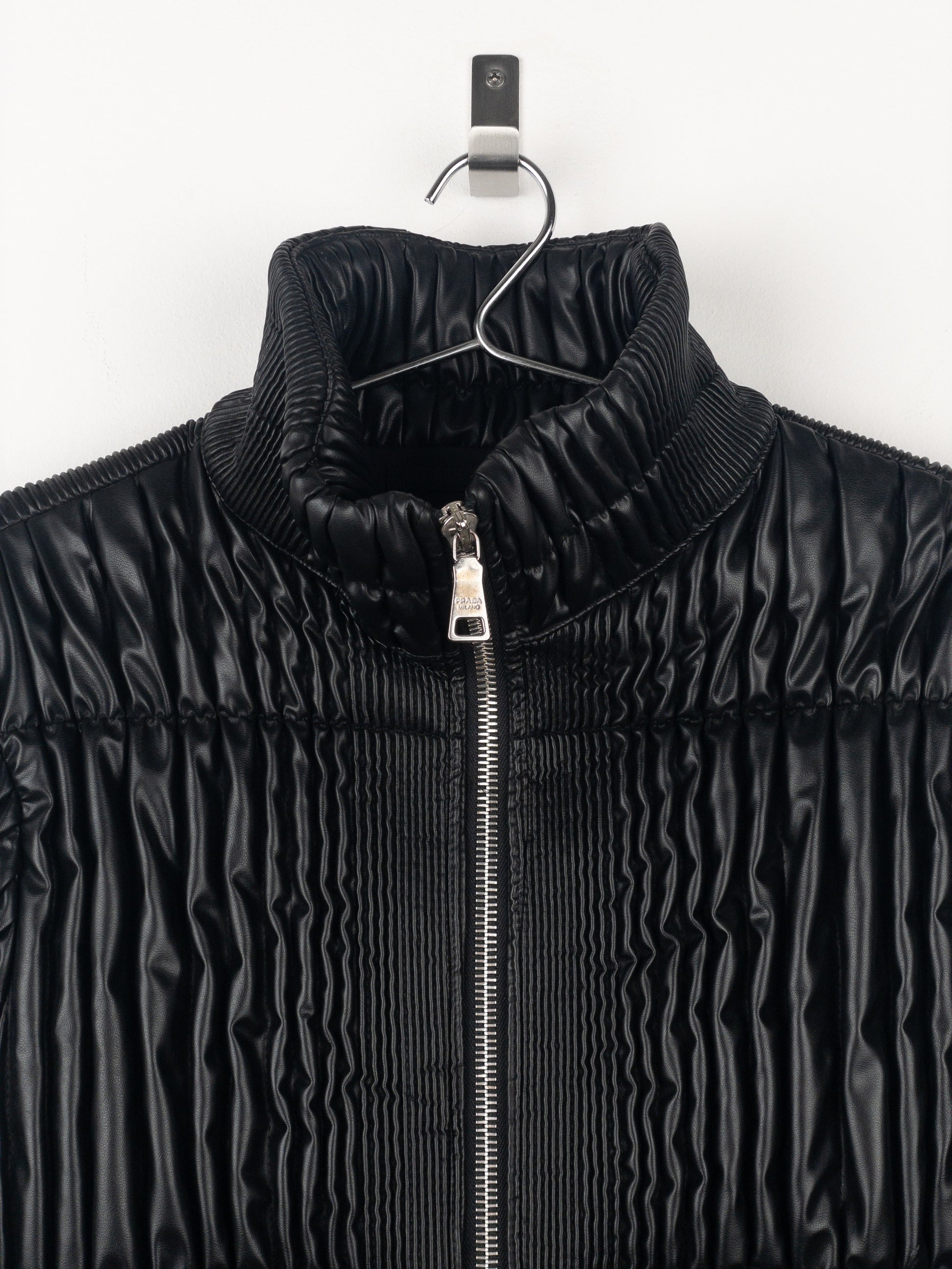 Black faux leather puffer jacket with vertical shirring throughout, with the ripples varying in size, from the autumn-winter 2008 collection.
