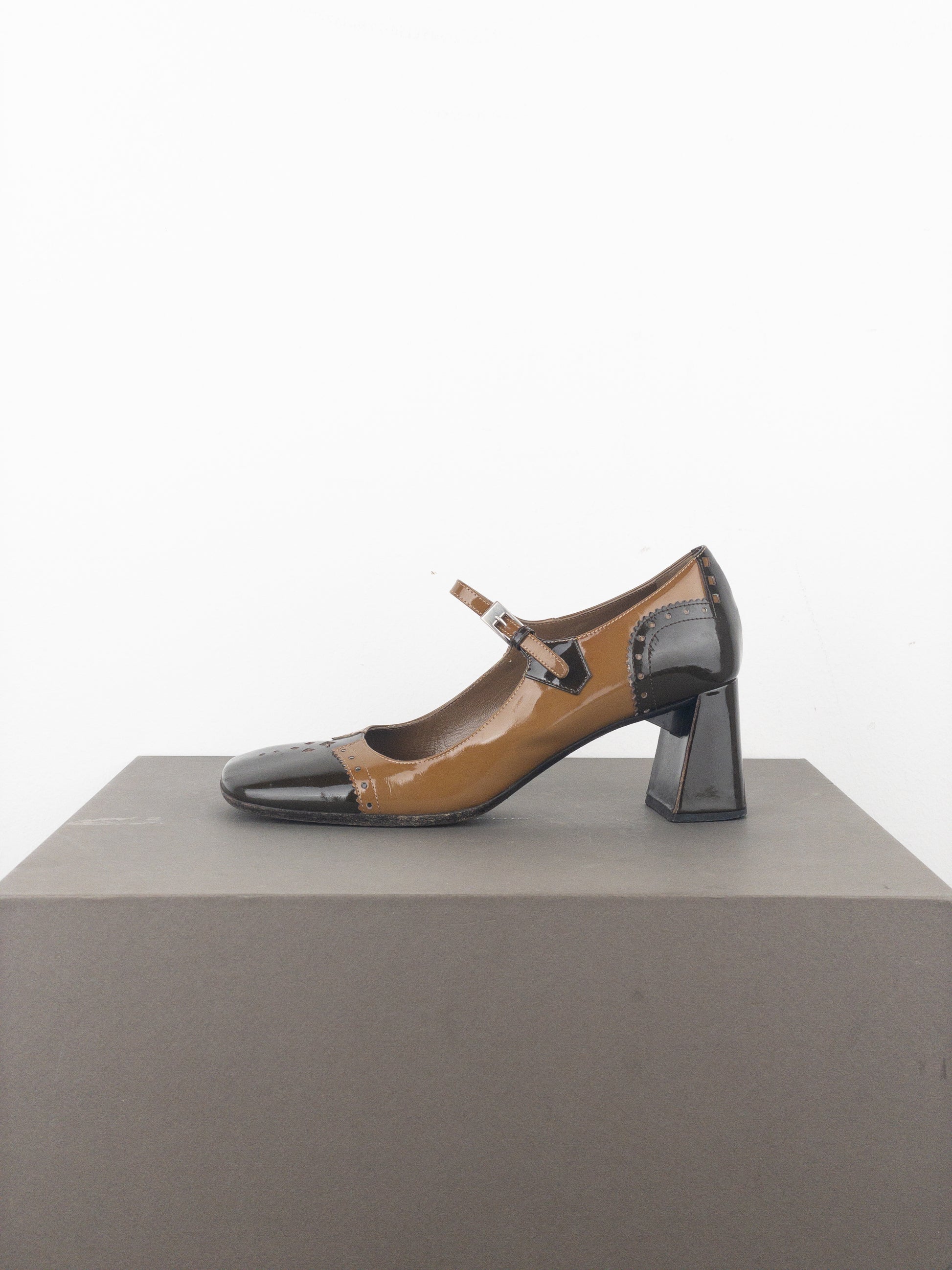 Pumps in light and chocolate brown patent leather with a square toe, featuring decorative brogueing throughout, a sculptural heel, and a buckled strap across the foot, from the fall-winter 1999 collection.