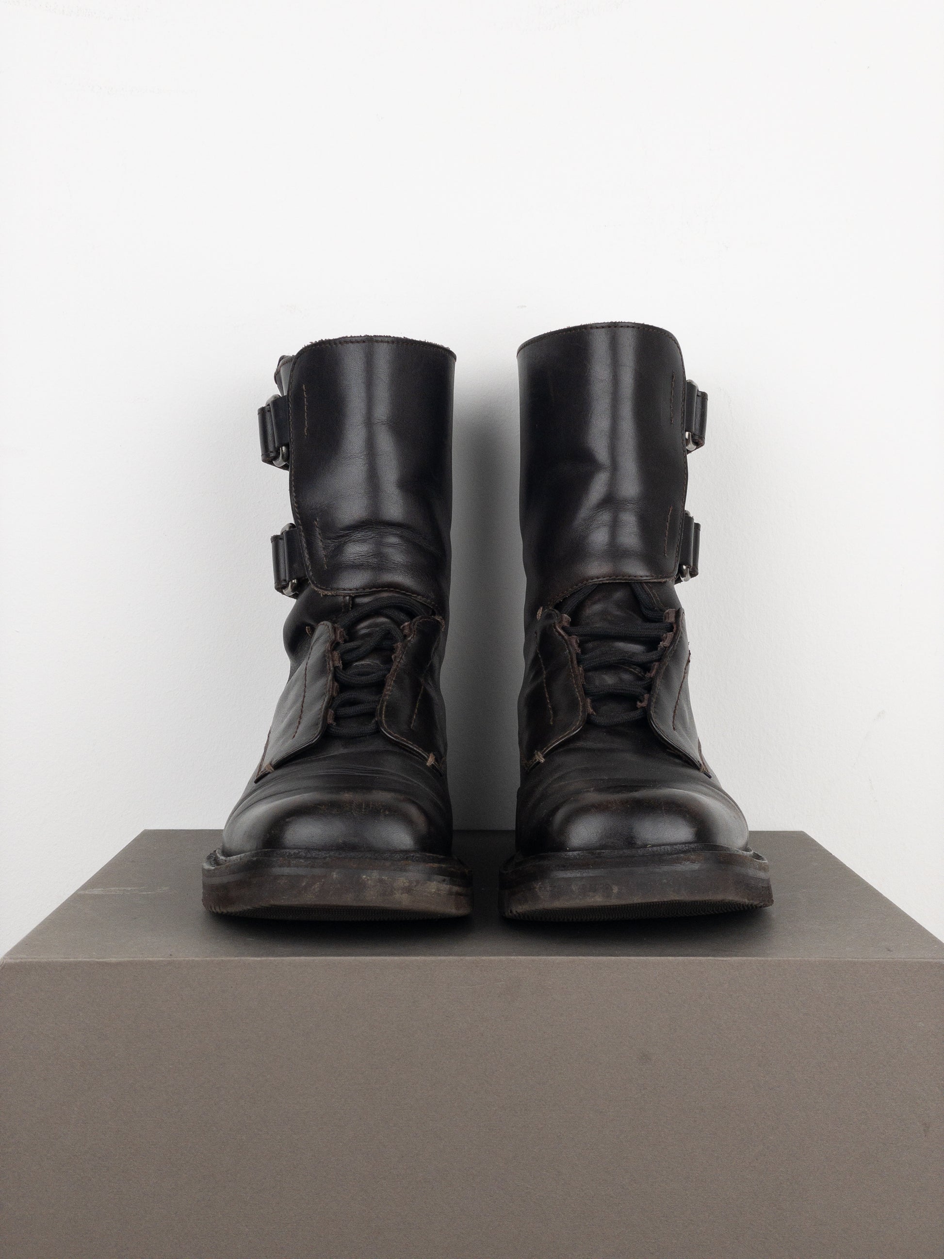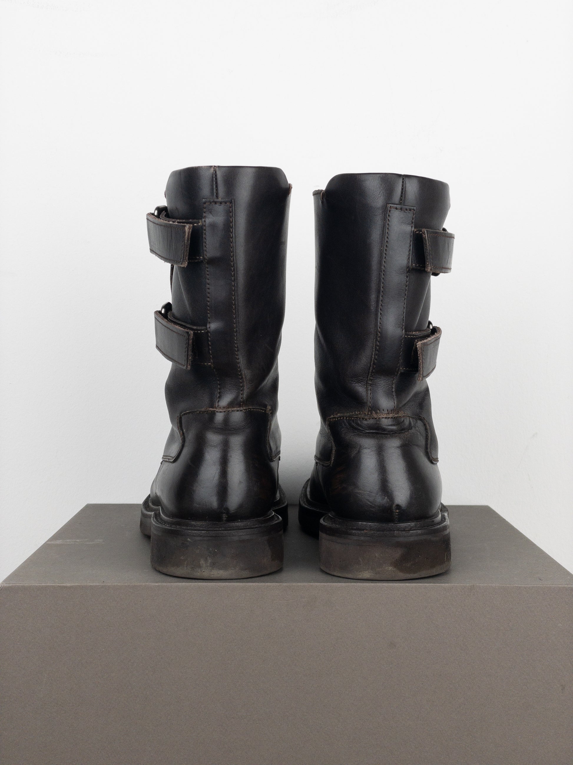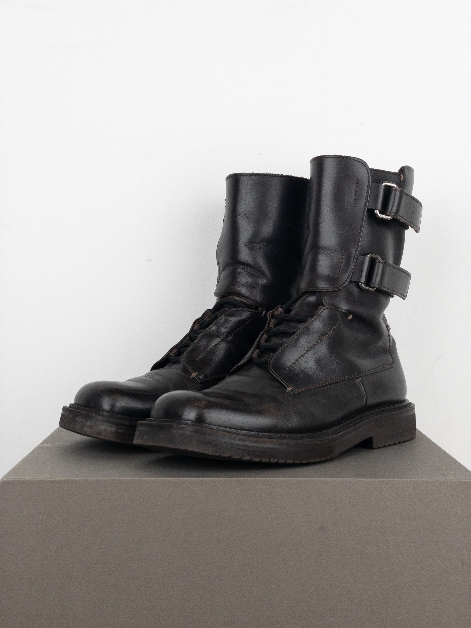 Chunky combat boots in dark brown leather, featuring a square toebox, hidden lacing, and a strapped leather shin guard, from the autumn-winter 1999 collection.