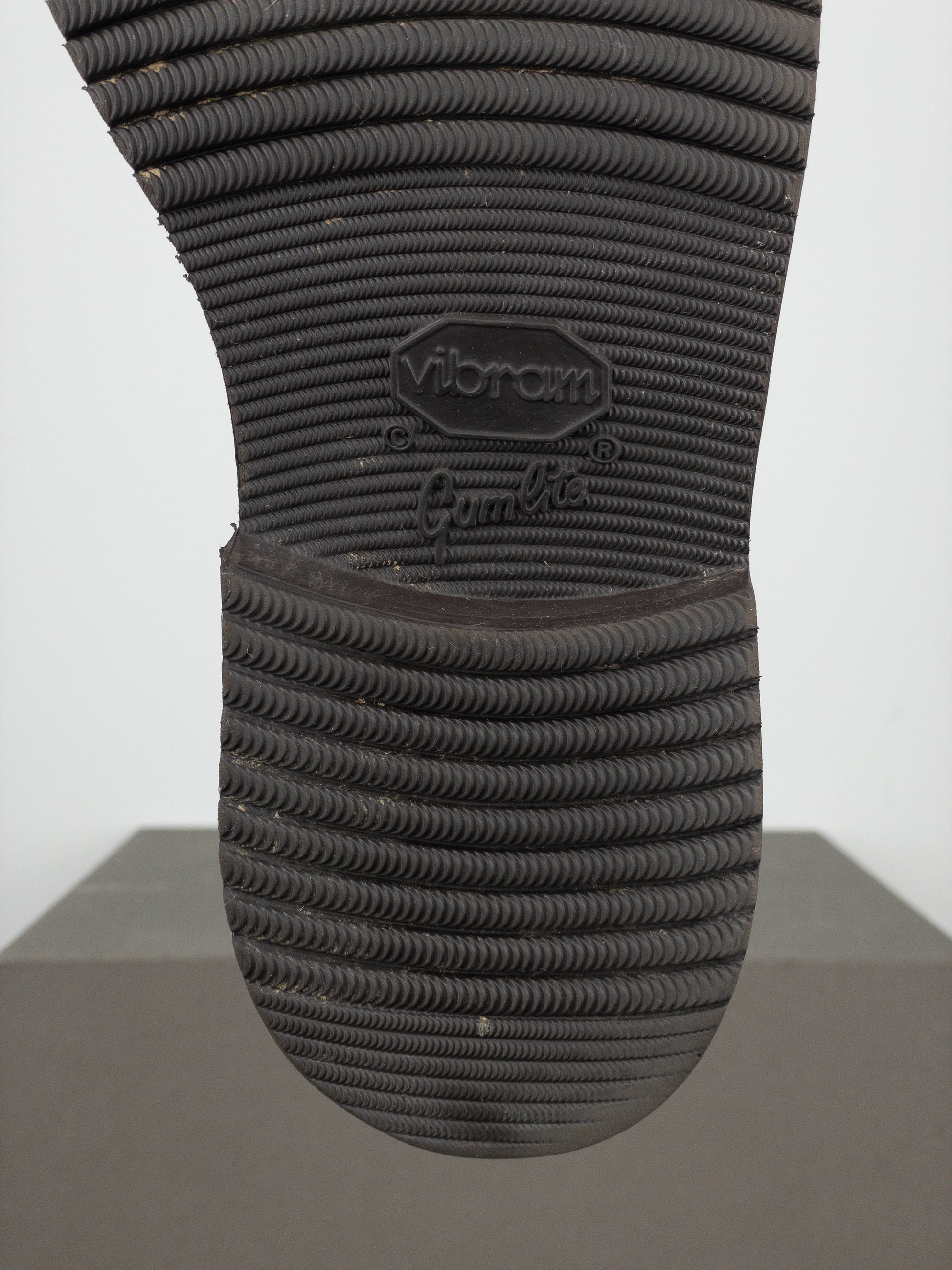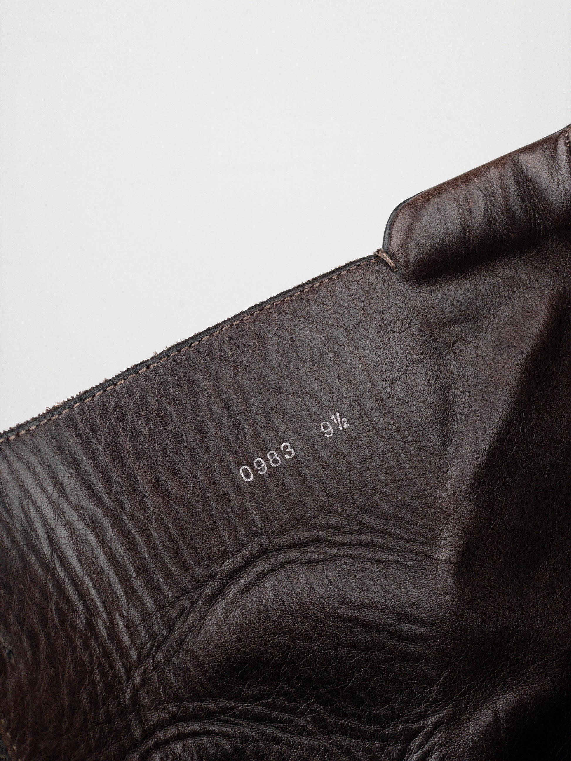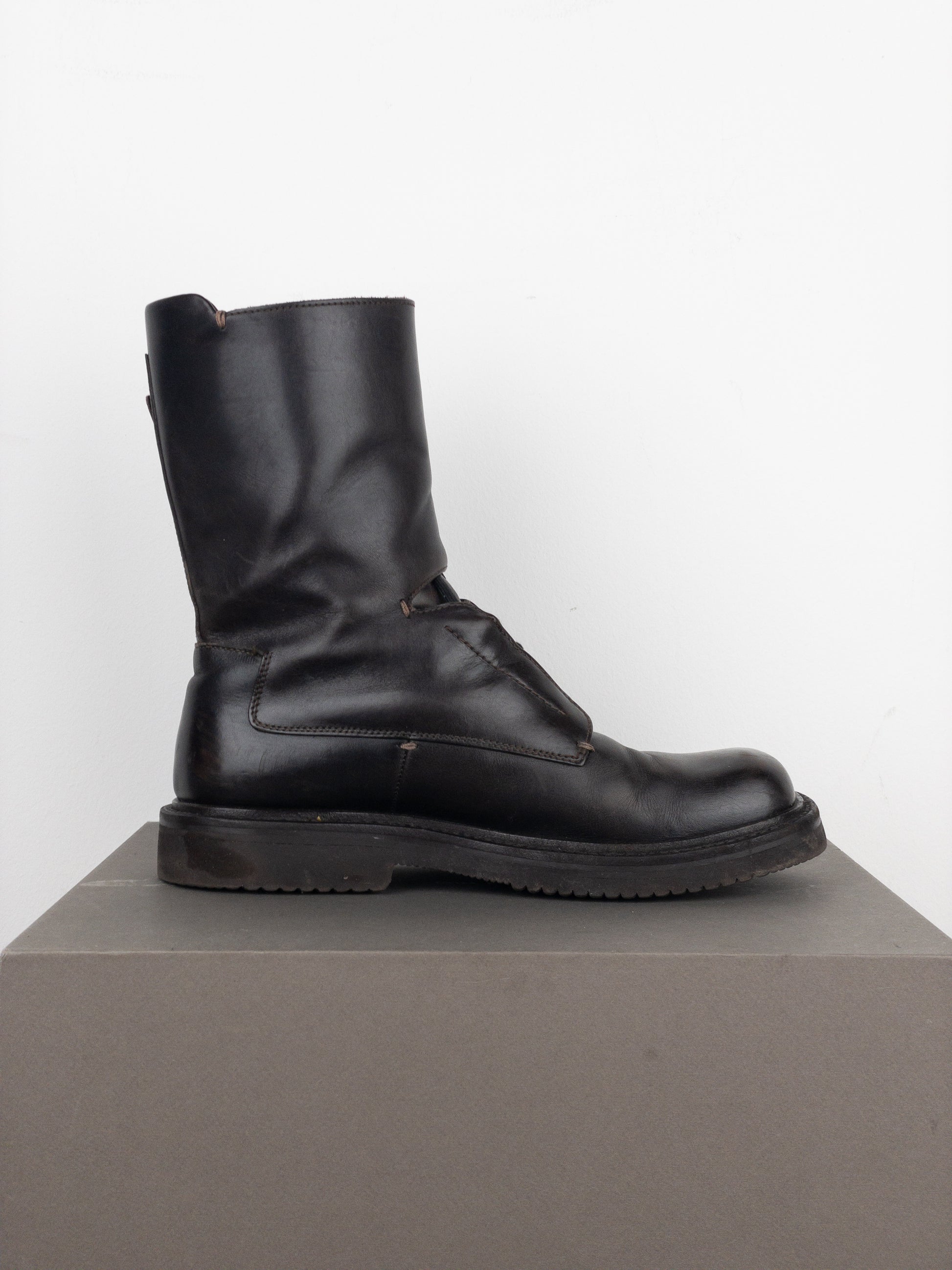 Chunky combat boots in dark brown leather, featuring a square toebox, hidden lacing, and a strapped leather shin guard, from the autumn-winter 1999 collection.