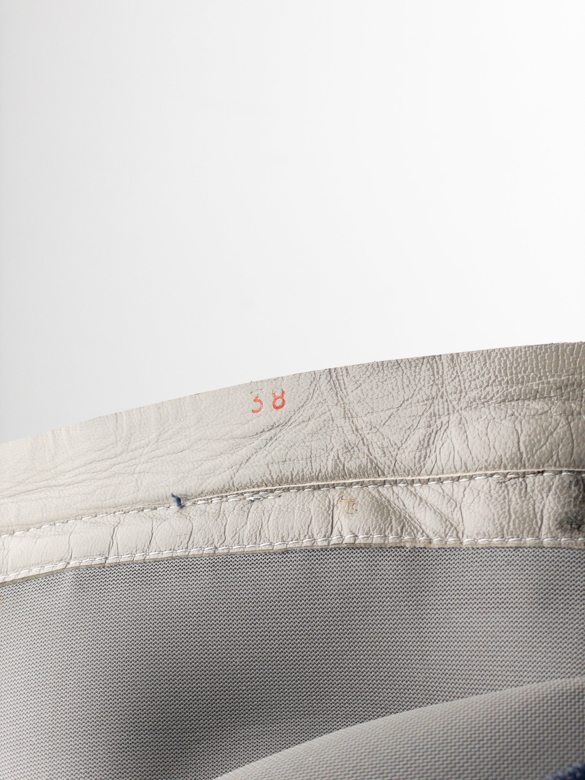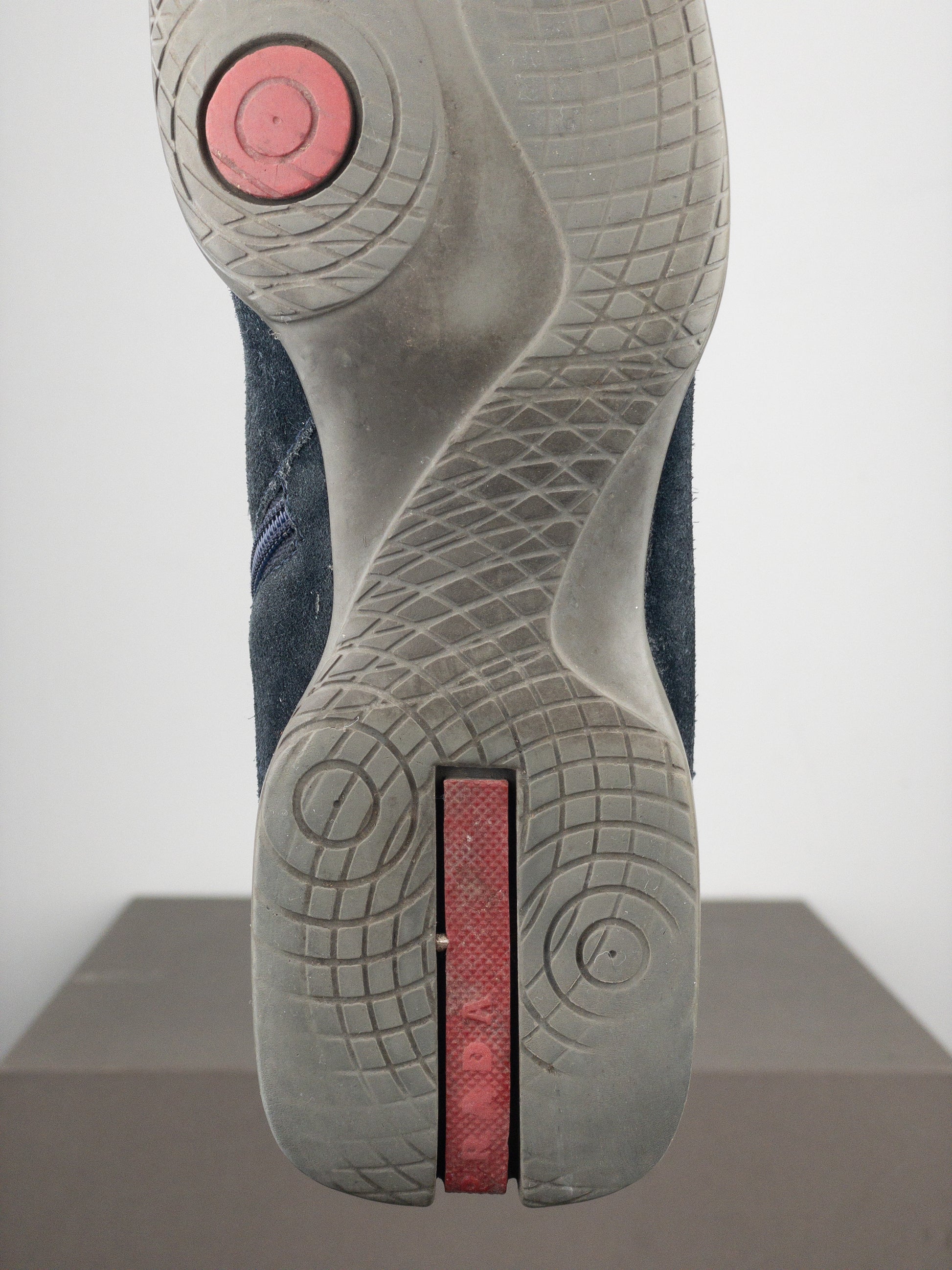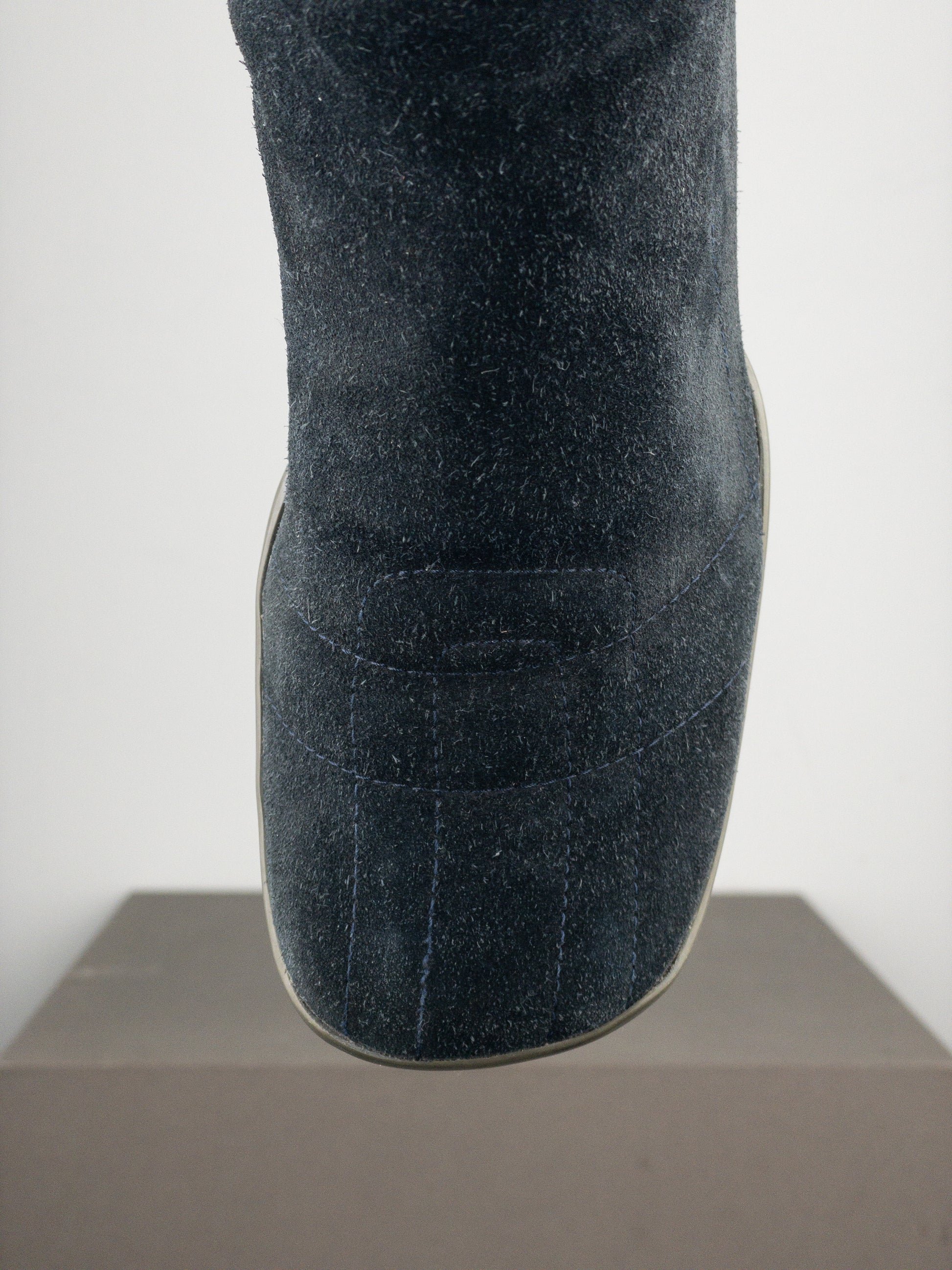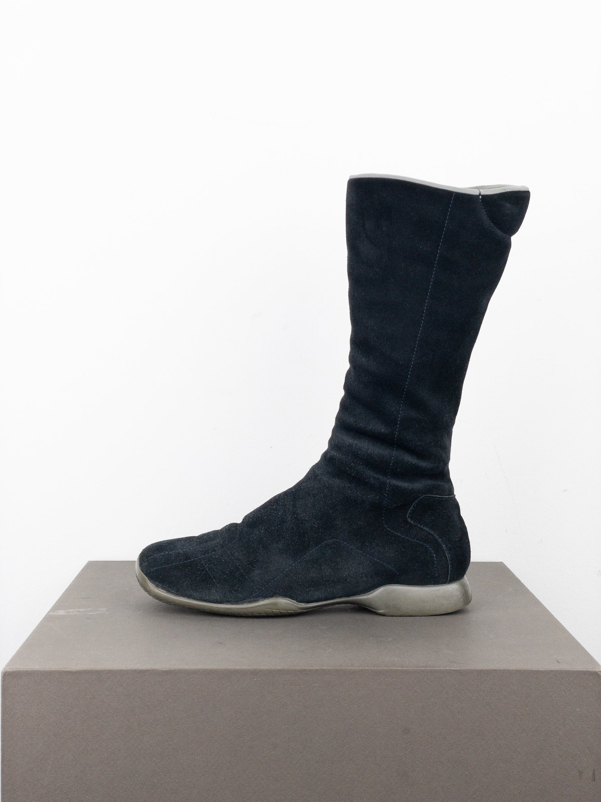 Knee high black suede boots with a prominent square toe, a grey ‘Sport’ rubber sole, decorative seams throughout, and a zipper on the inside of the shaft, from the autumn-winter 1999 collection.