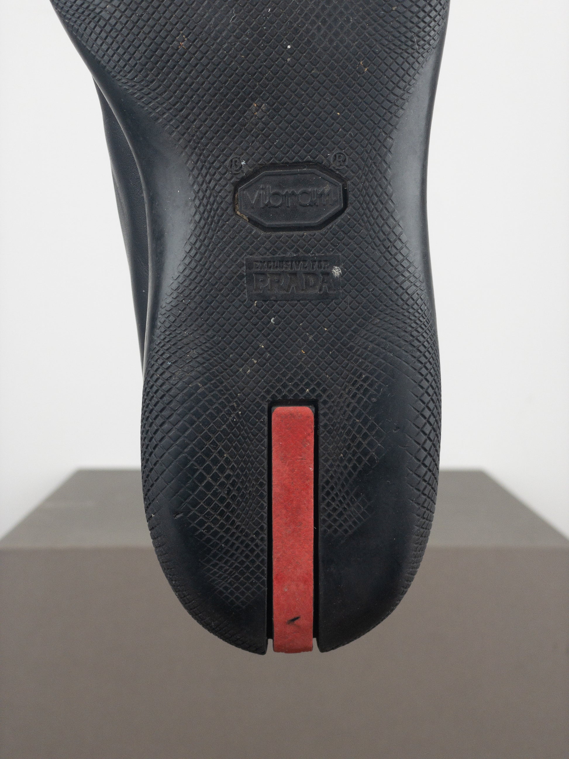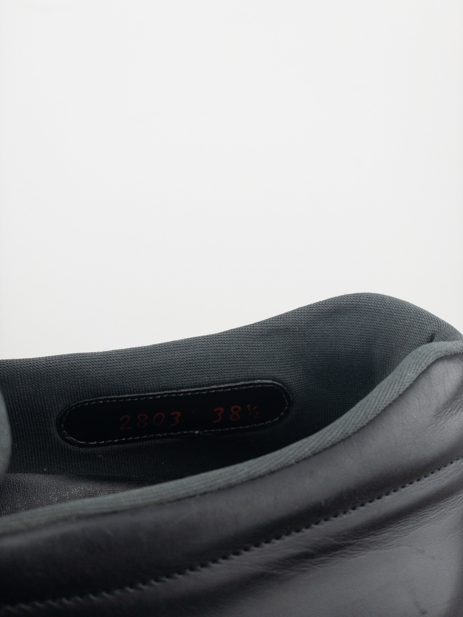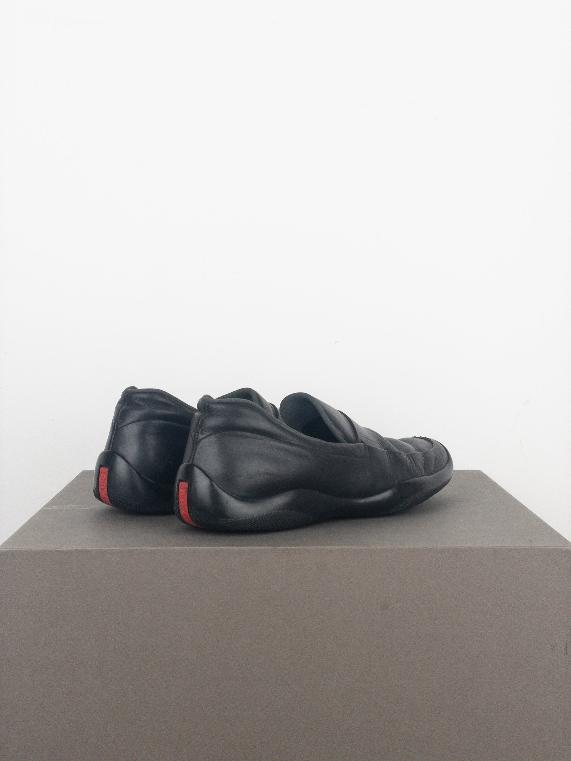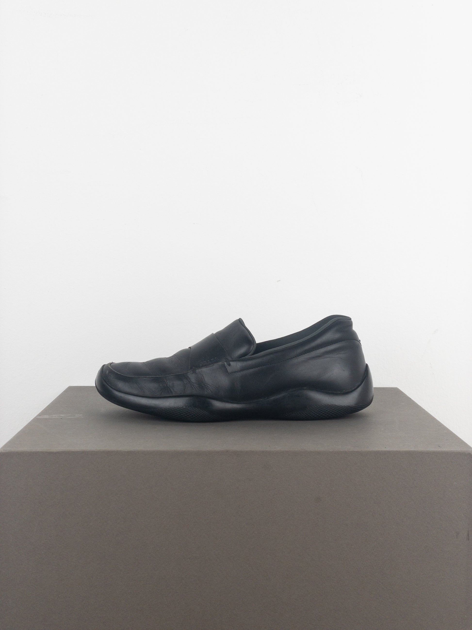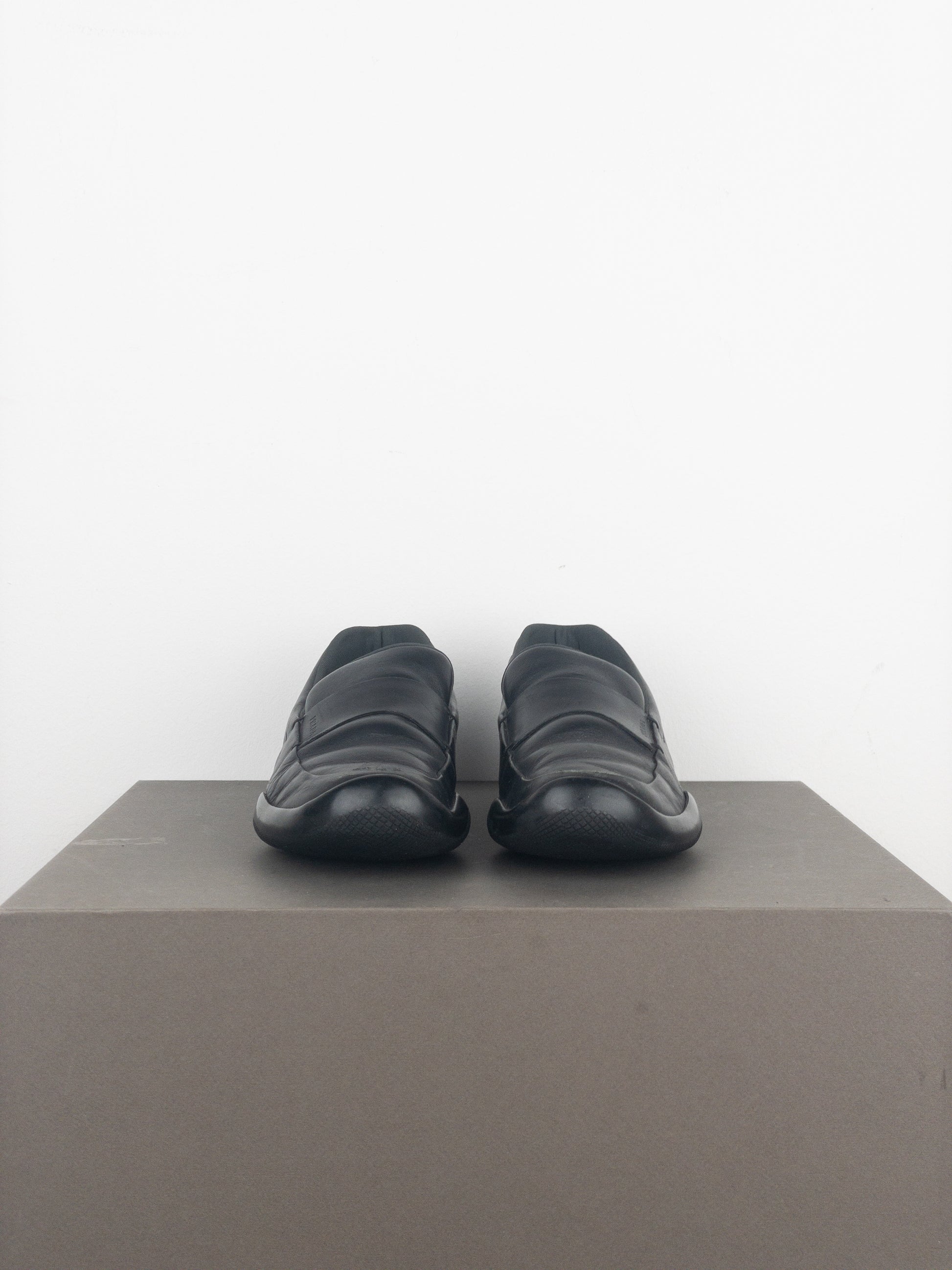 Black leather penny loafers with a rounded toe and chunky Vibram® sole, from the autumn-winter 1999 collection.