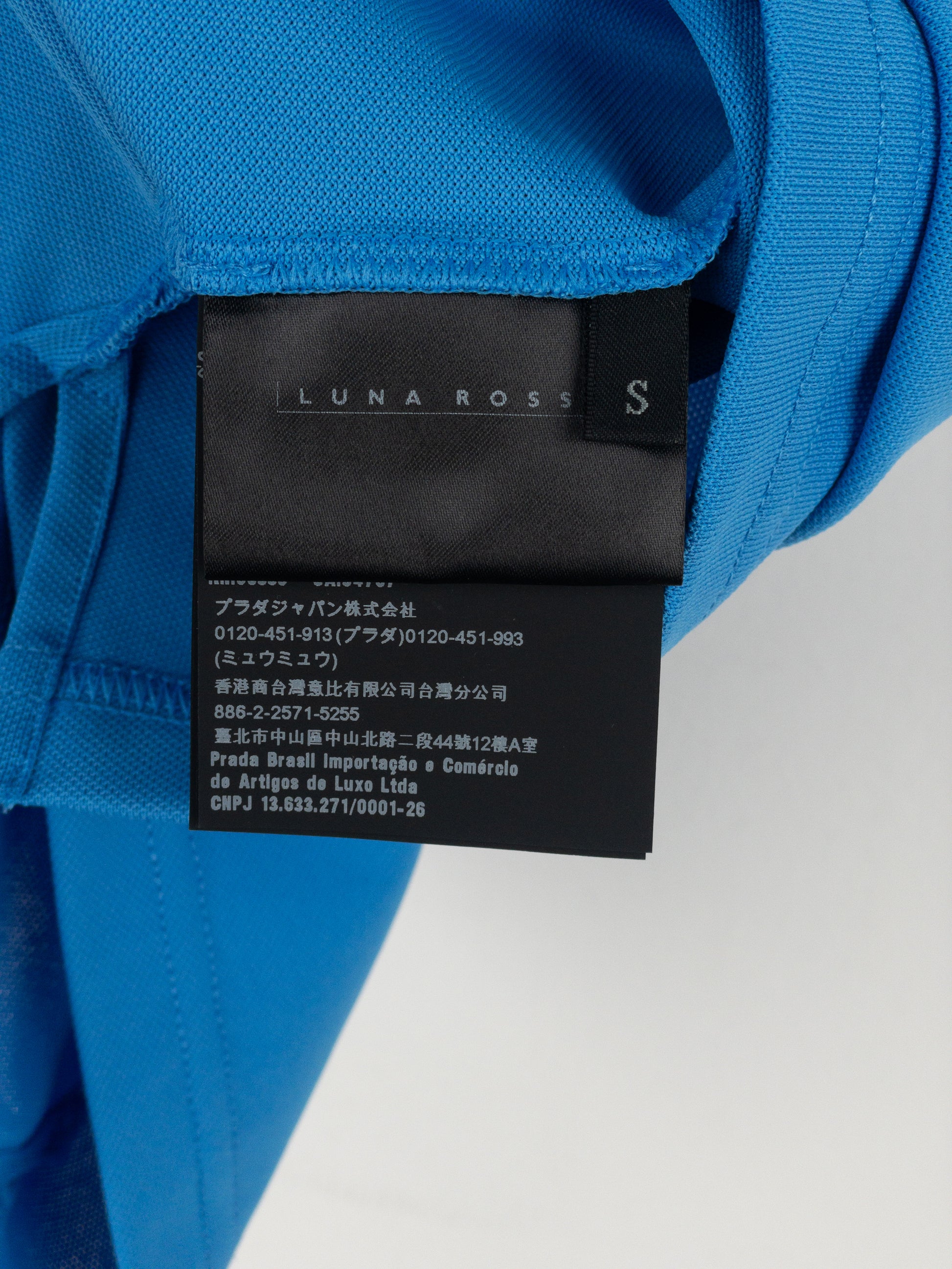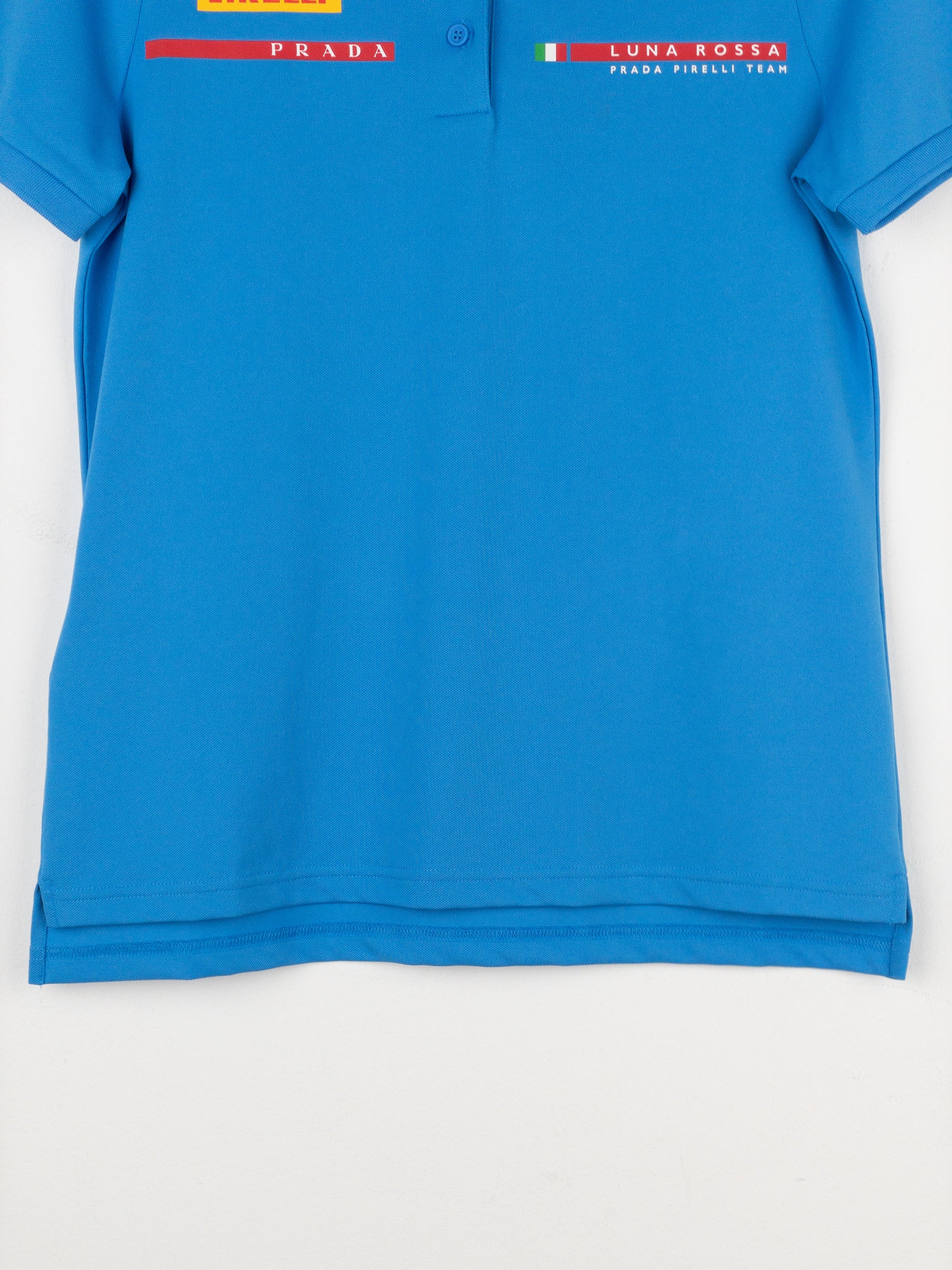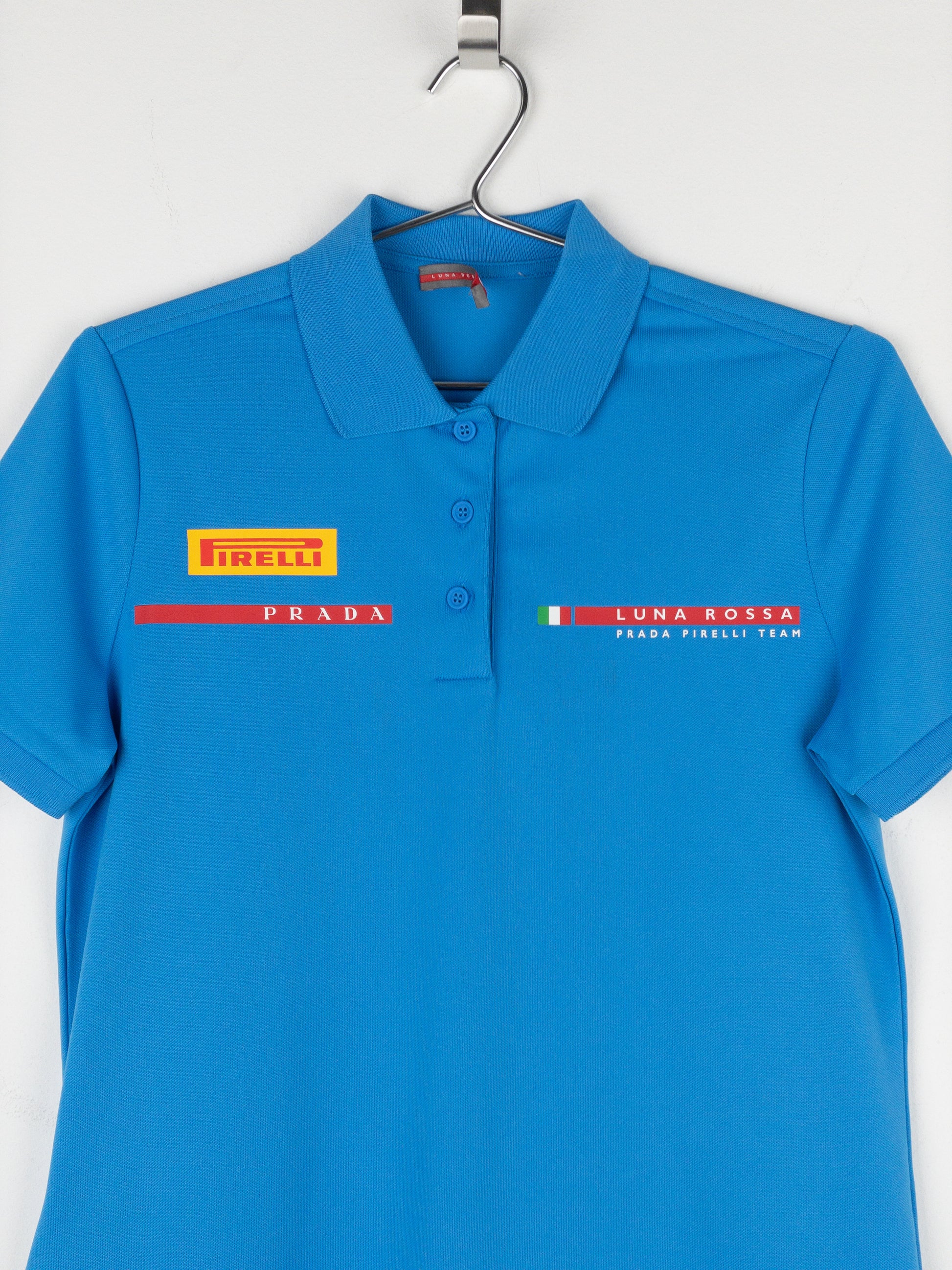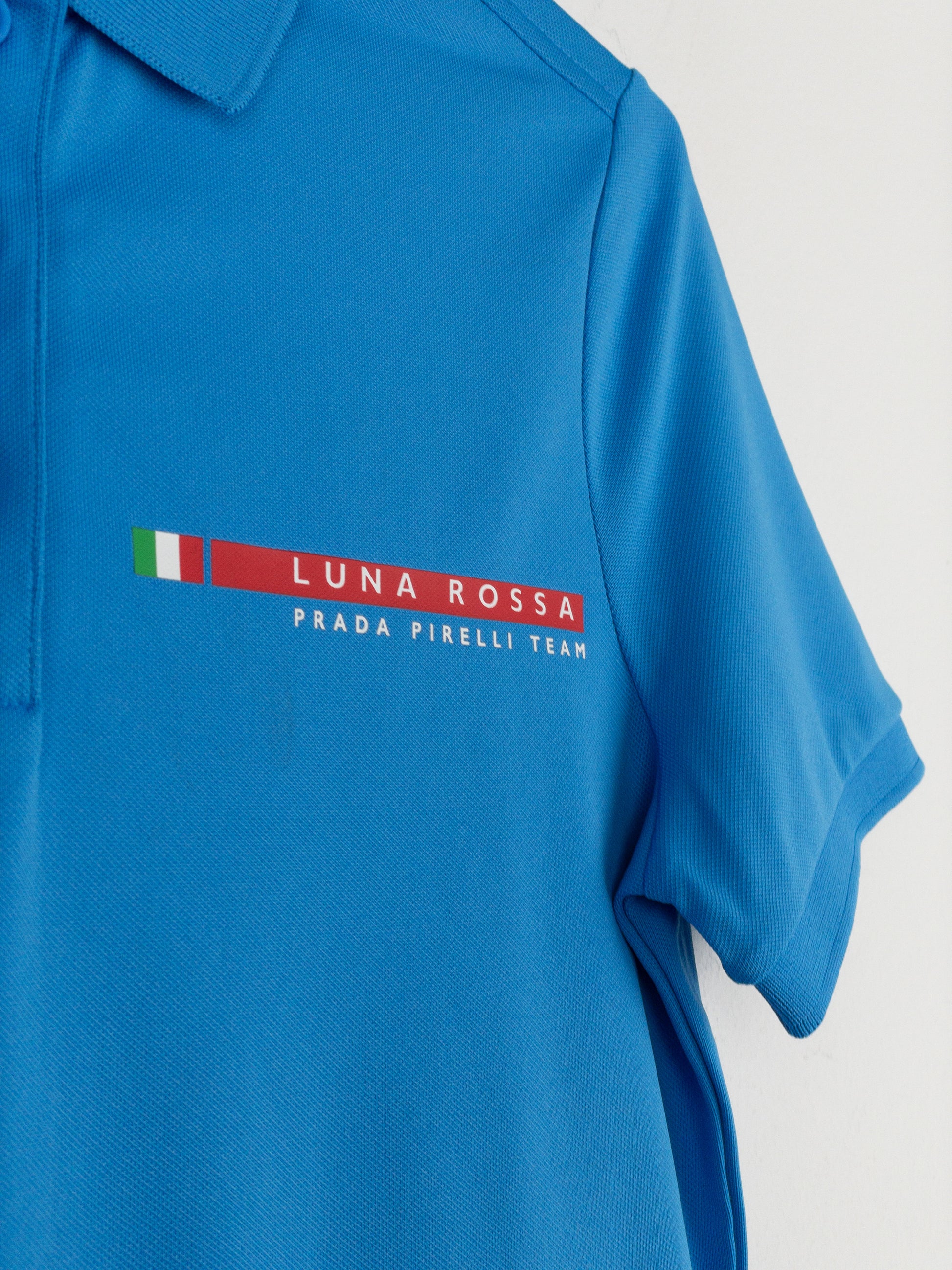 Blue polo shirt with the signature Luna Rossa sponsor prints on the chest, from the 2019 American Cup sailing race.