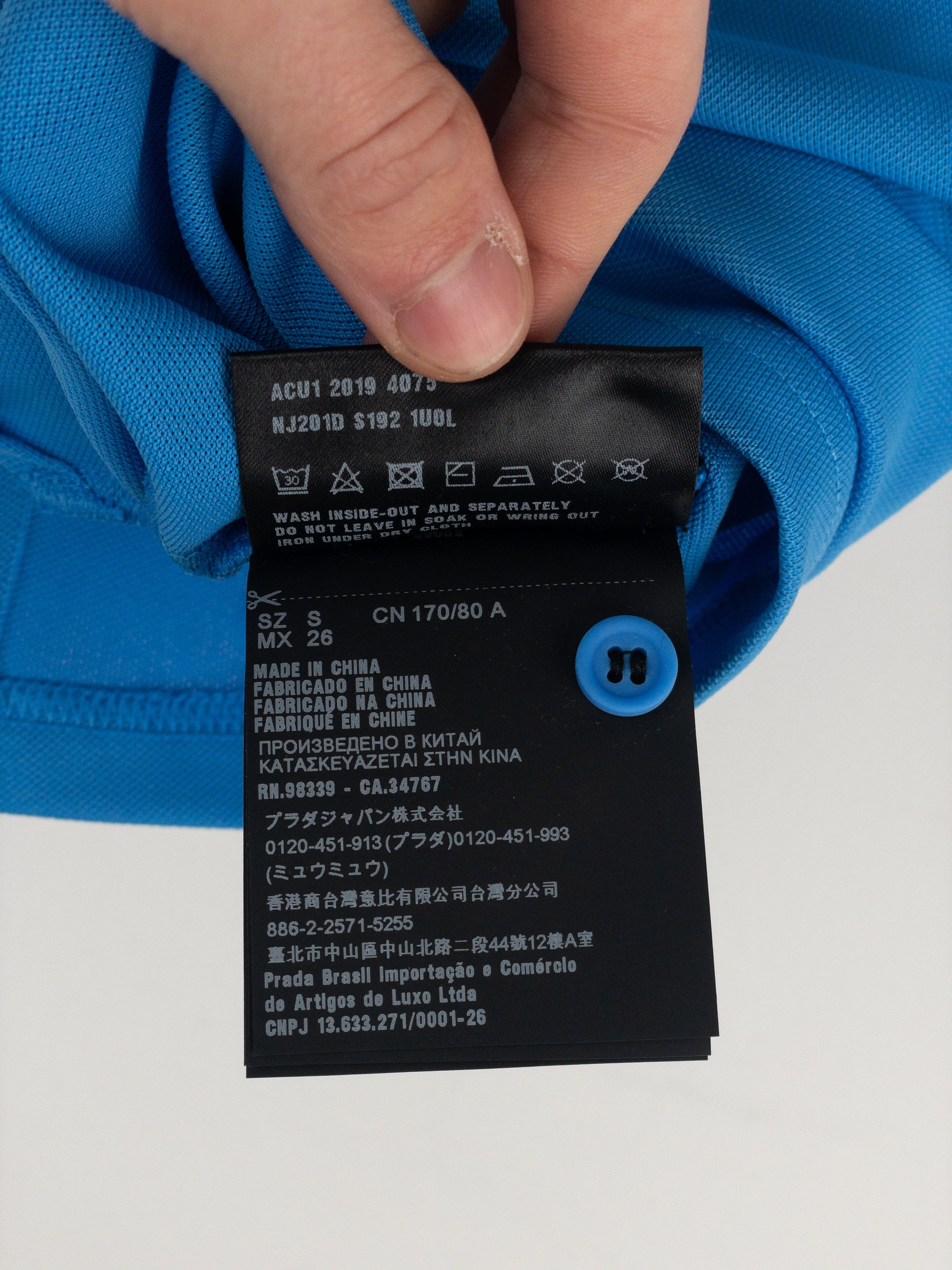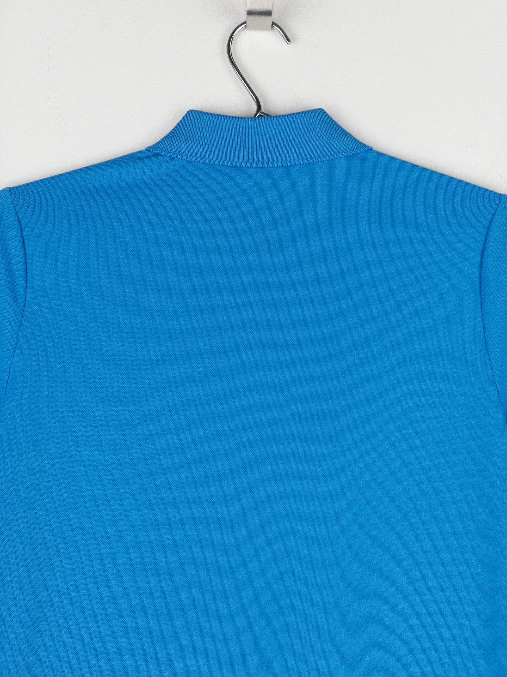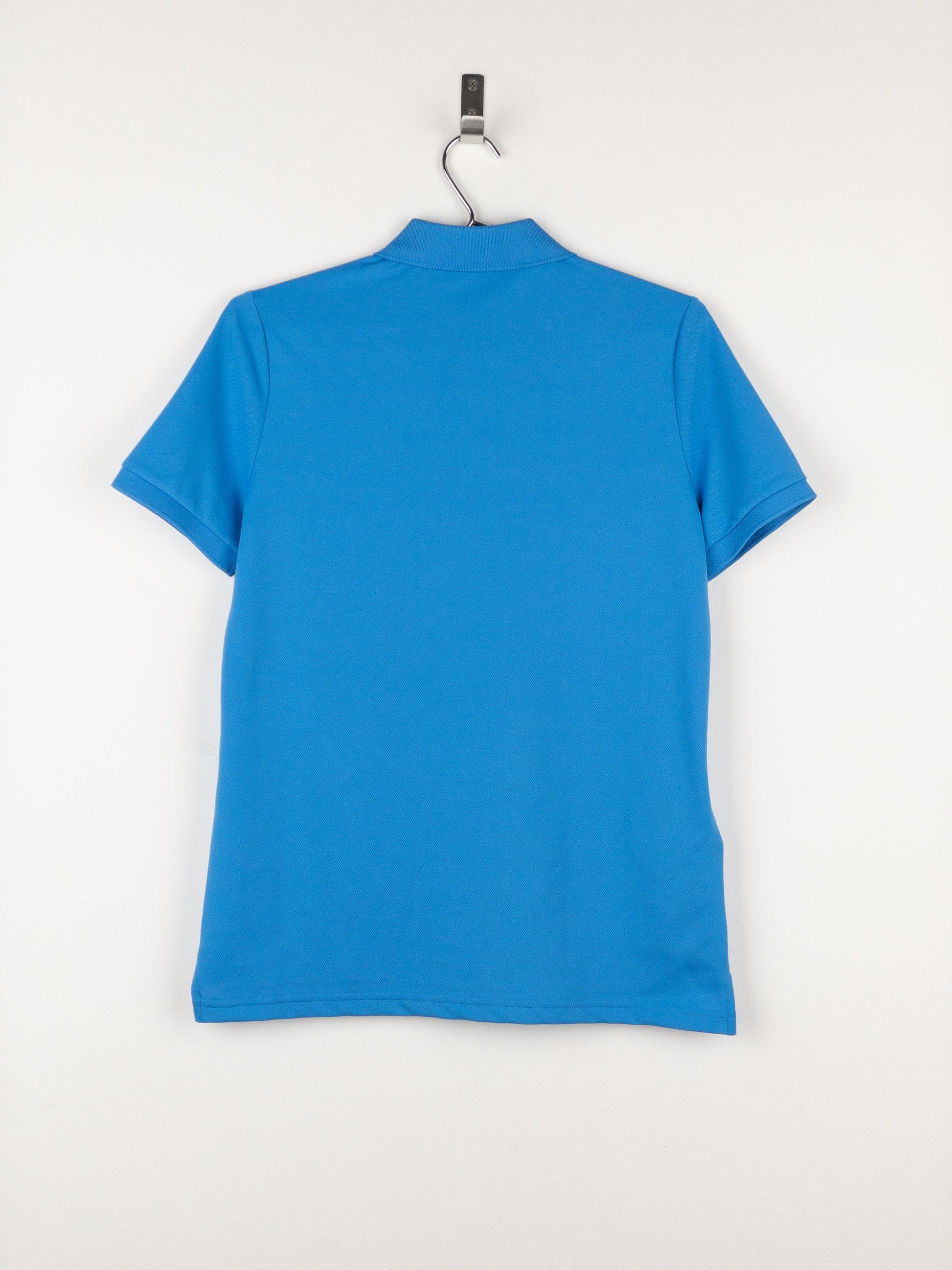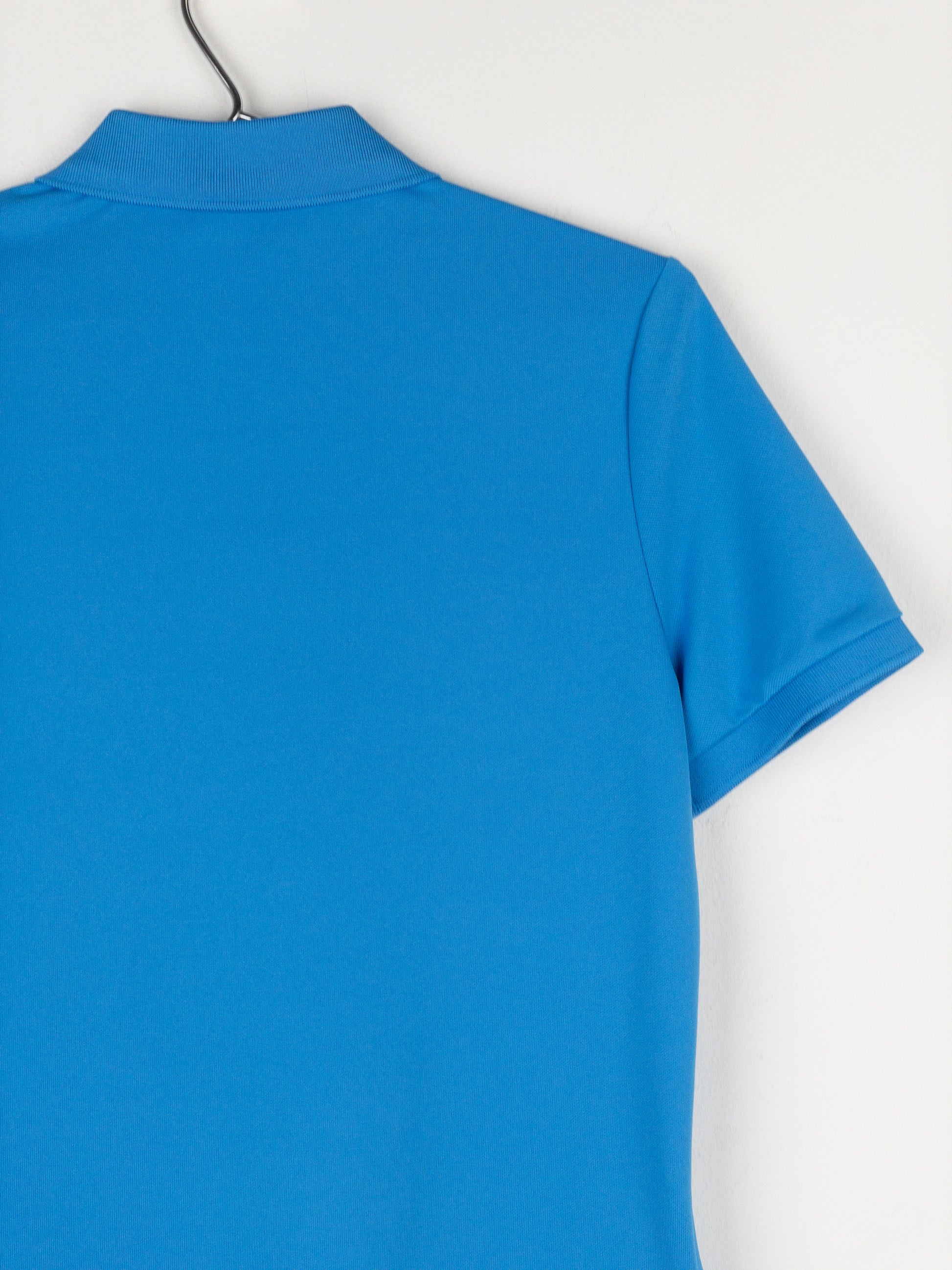 Blue polo shirt with the signature Luna Rossa sponsor prints on the chest, from the 2019 American Cup sailing race.