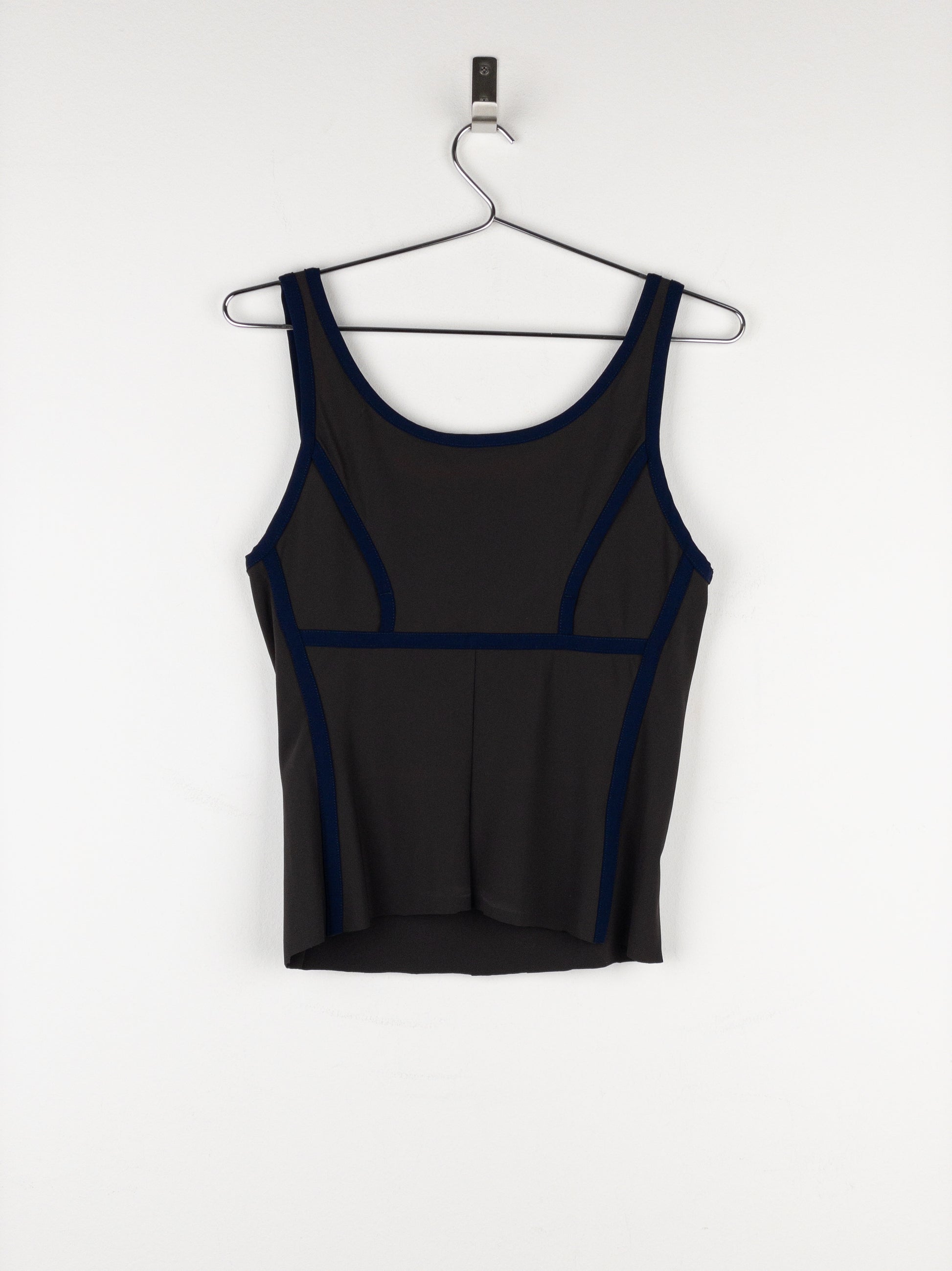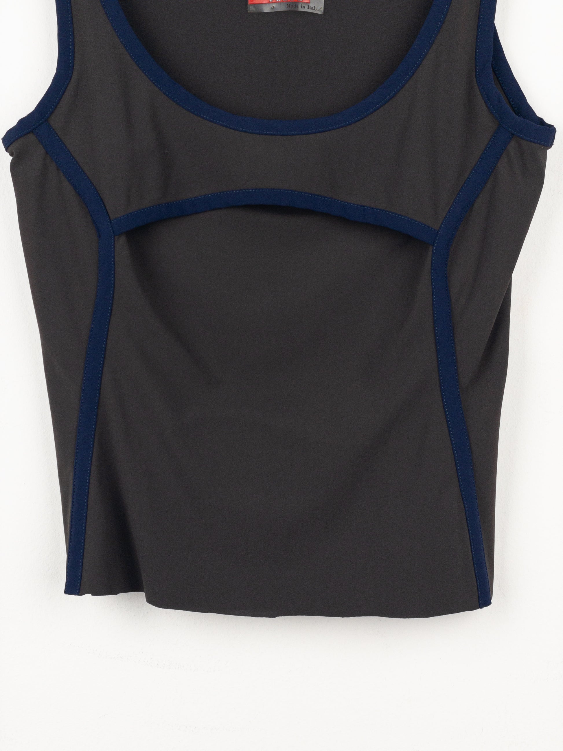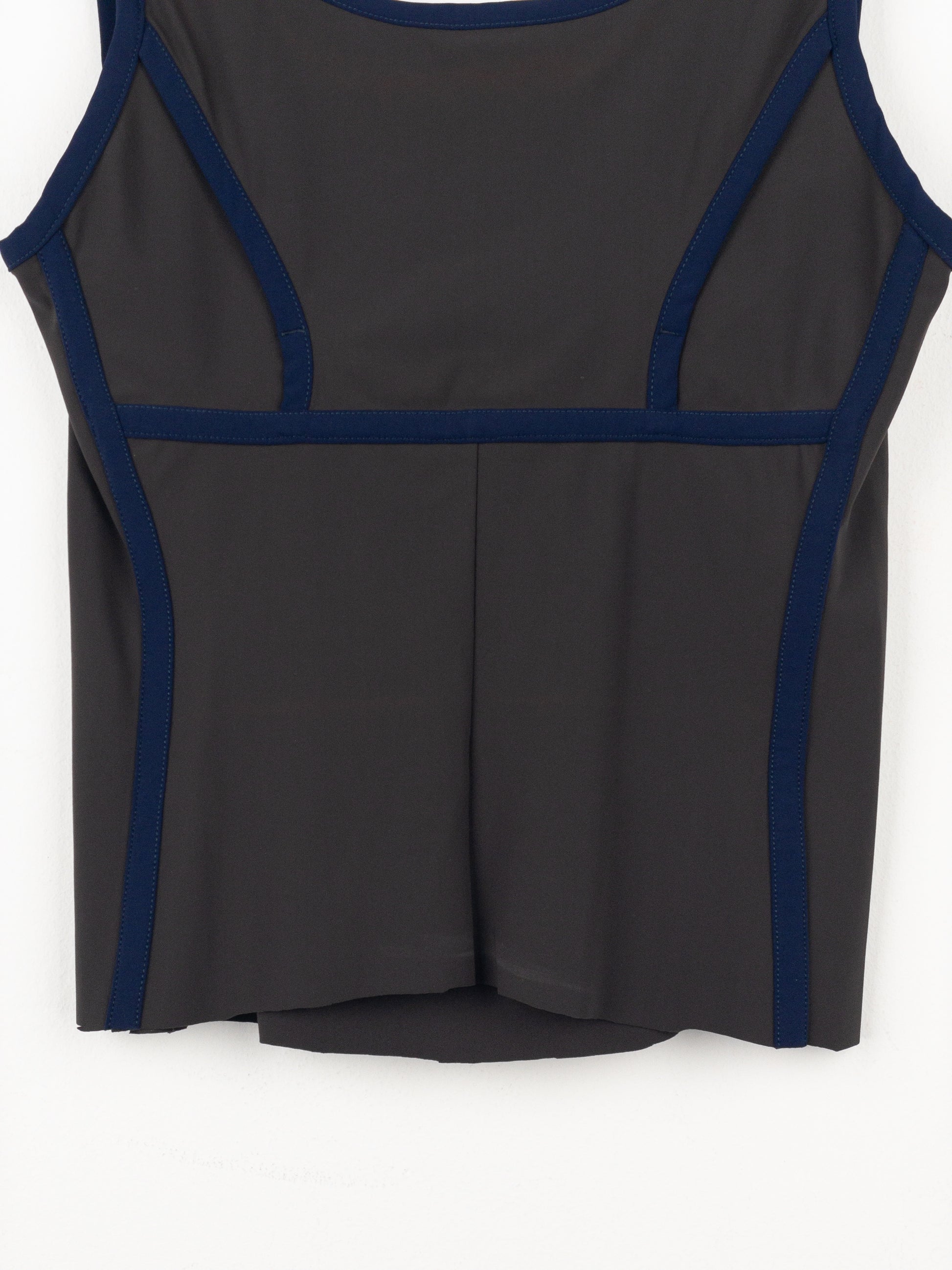 Dark brown tank top with navy piping, made, made up of layered stretchable panels allowing for more flexibility and support, reminiscent of sports garments, from the spring-summer 1999 collection.